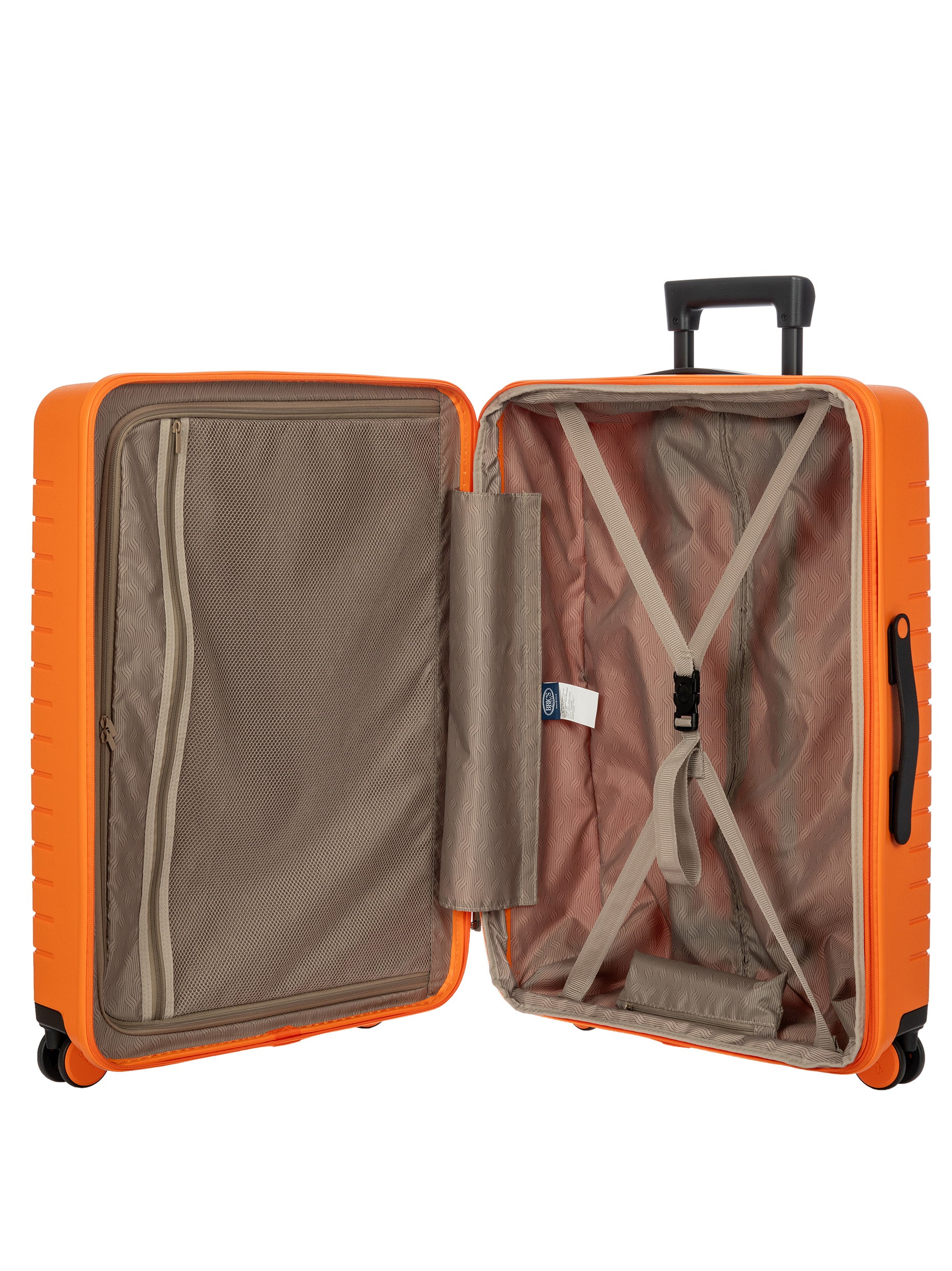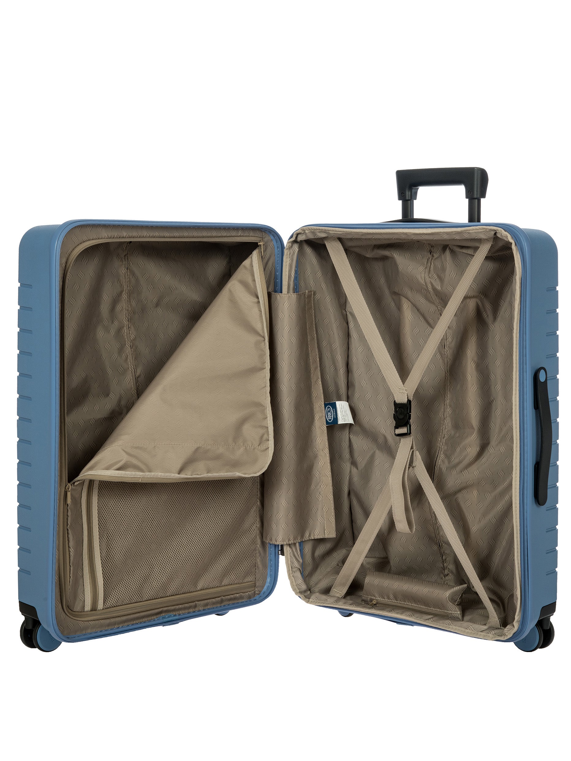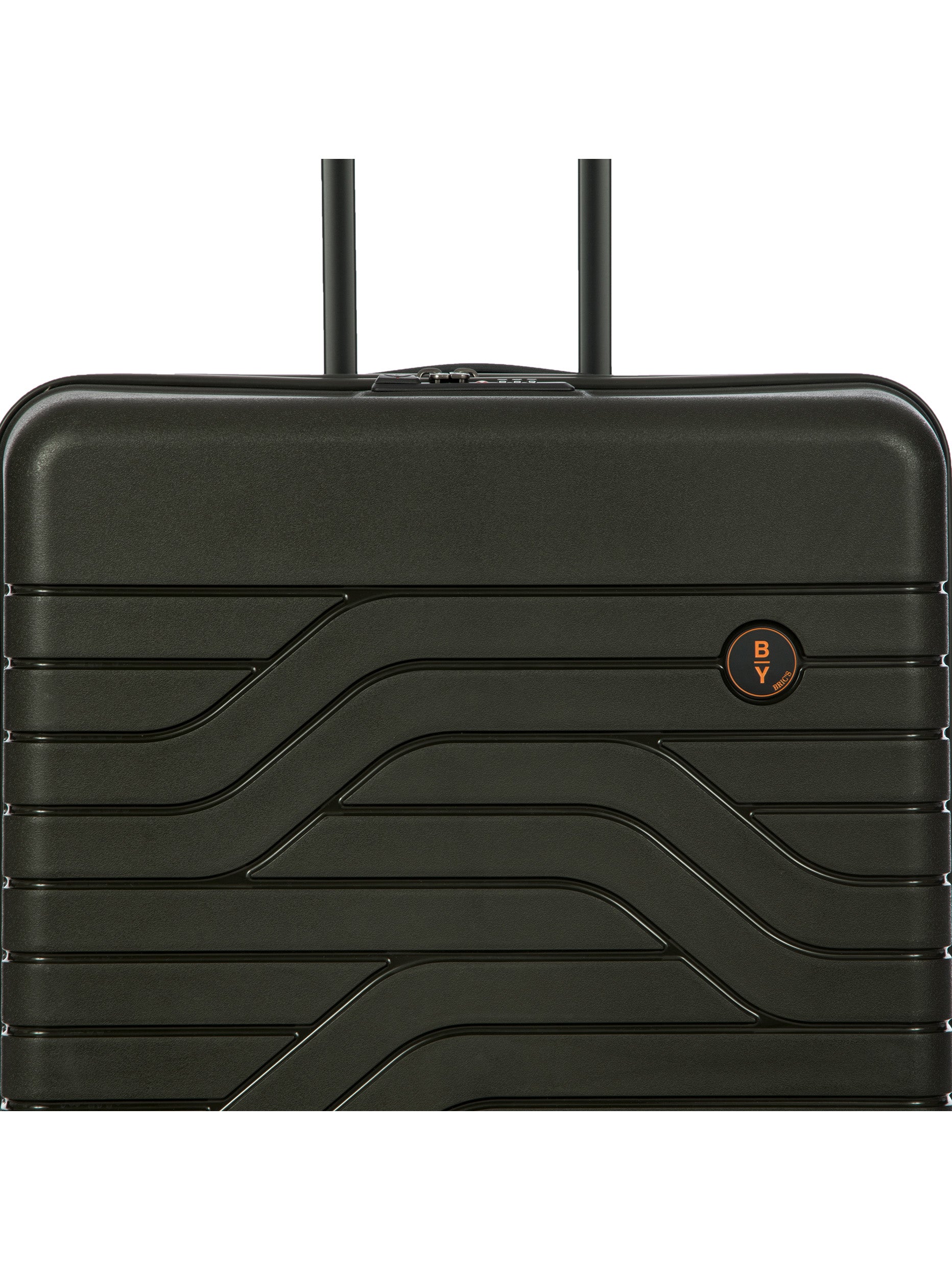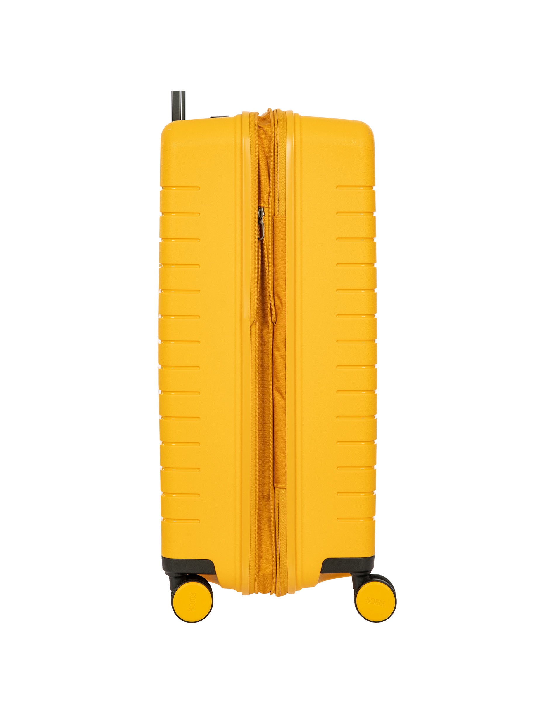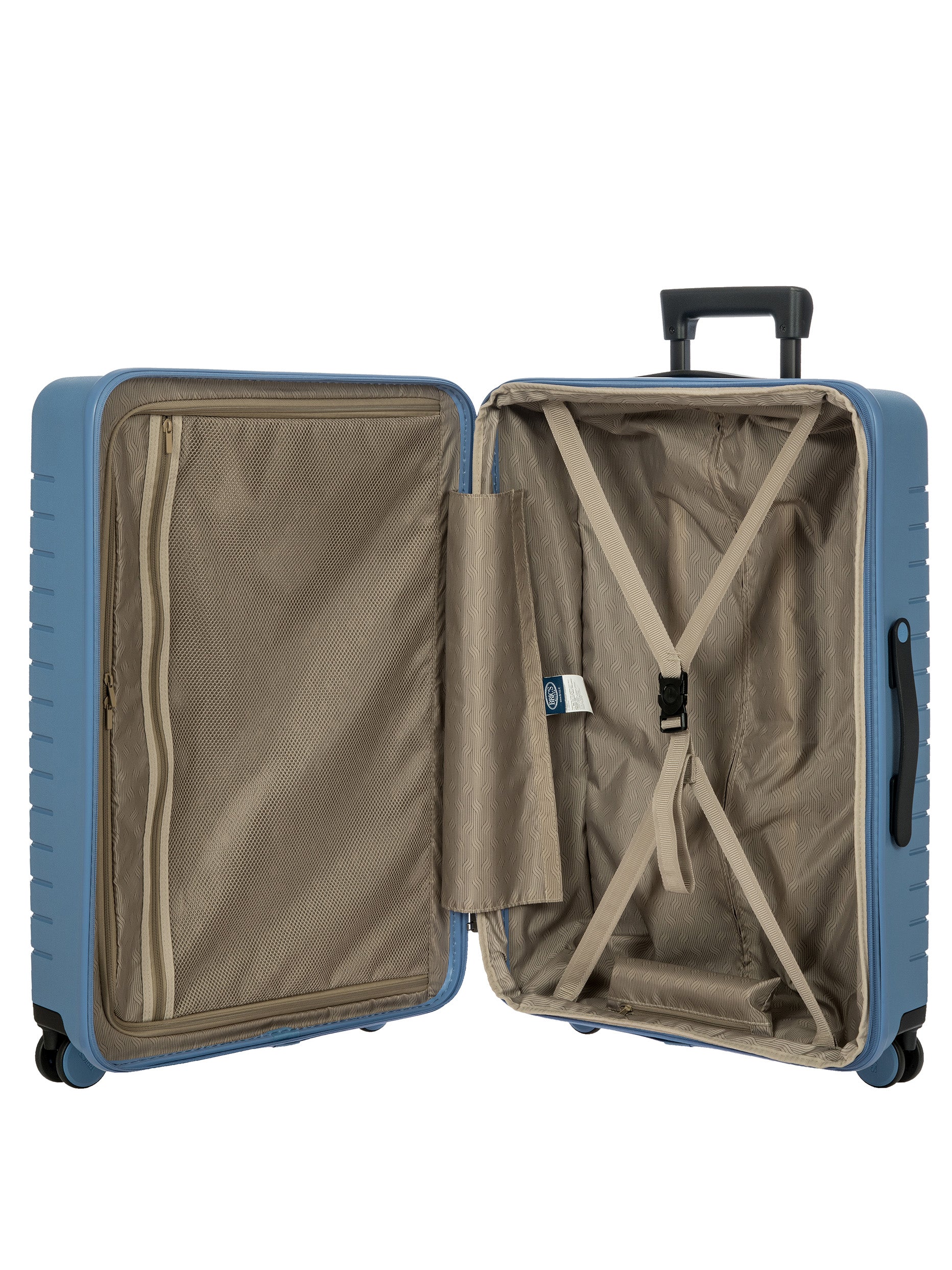 Erweiterbarer Hartschalen-Trolley in L Größe der Kollektion Ulisse B|Y. Die Außenschale im Urban Style und die versenkten Rollen machen den modernen Trolley zum perfekten Begleiter für jede Reise. AUẞEN: Schale aus Polypropylen für ein Maximum an Leichtigkeit, Flexibilität und Festigkeit. Das TSA-Schloss am Reißverschluss ist in die Schale integriert. Mit einem Reißverschluss lässt sich die Tiefe des Trolleys um 4 cm erweitern. GRIFF: bequemer und praktischer Ziehgriff mit Aluminiumrohren, per Drucktaste in drei Stufen einstellbar. Der obere und der seitliche Griff sind flach und ergonomisch. INNEN: innen gefüttert, zwei Fächer: Futter mit Reißverschluss und flacher Netztasche auf der einen Seite, Bänder mit Schnalle auf der anderen. Die separate Tasche mit Reißverschluss enthält einen abnehmbaren und waschbaren Beutel. ROLLEN: vier versenkte Doppelrollen zur Platzoptimierung, mit Bric's-Logo. Sie ermöglichen eine einfache und durch die Gummierung absolut geräuscharme 360°-Drehung. DETAILS: Das äußere Design zeichnet sich durch ein glänzendes Flachrelief im Urban Style aus, das mit der matten Farbe der Schale kontrastiert. Logodetails B|Y an den Tragegriffen, farblich abgestimmt auf die Schalenfarbe.