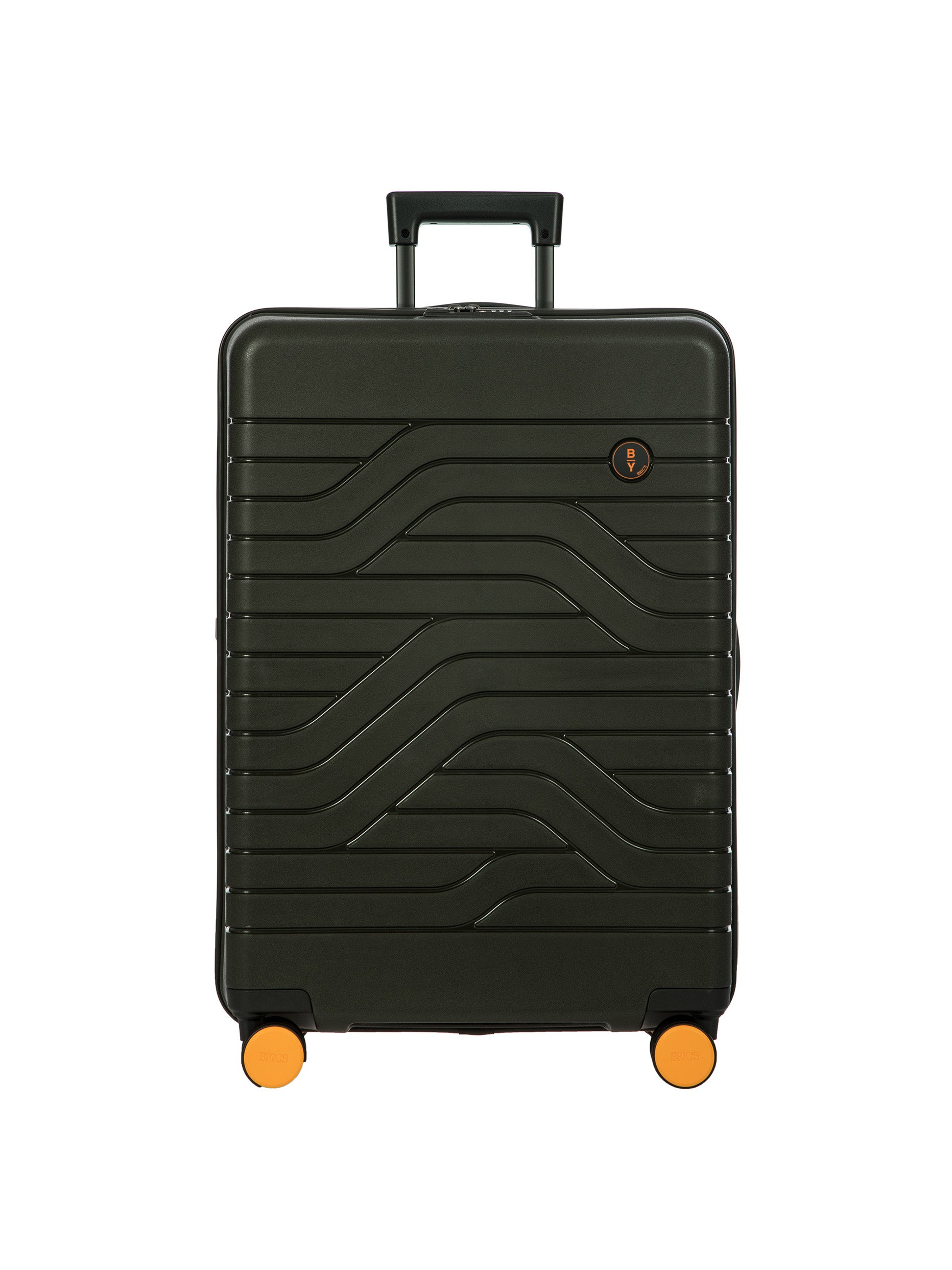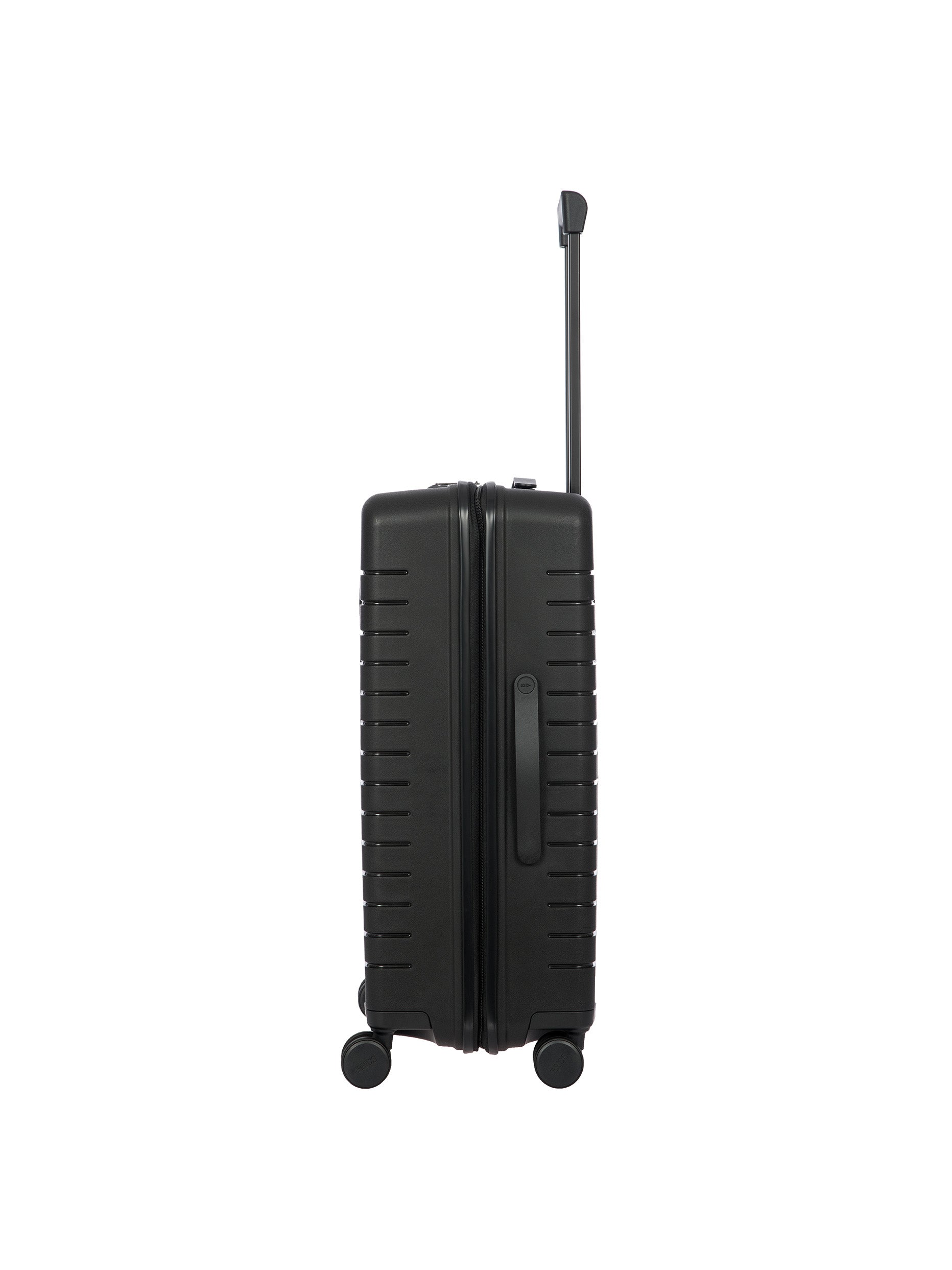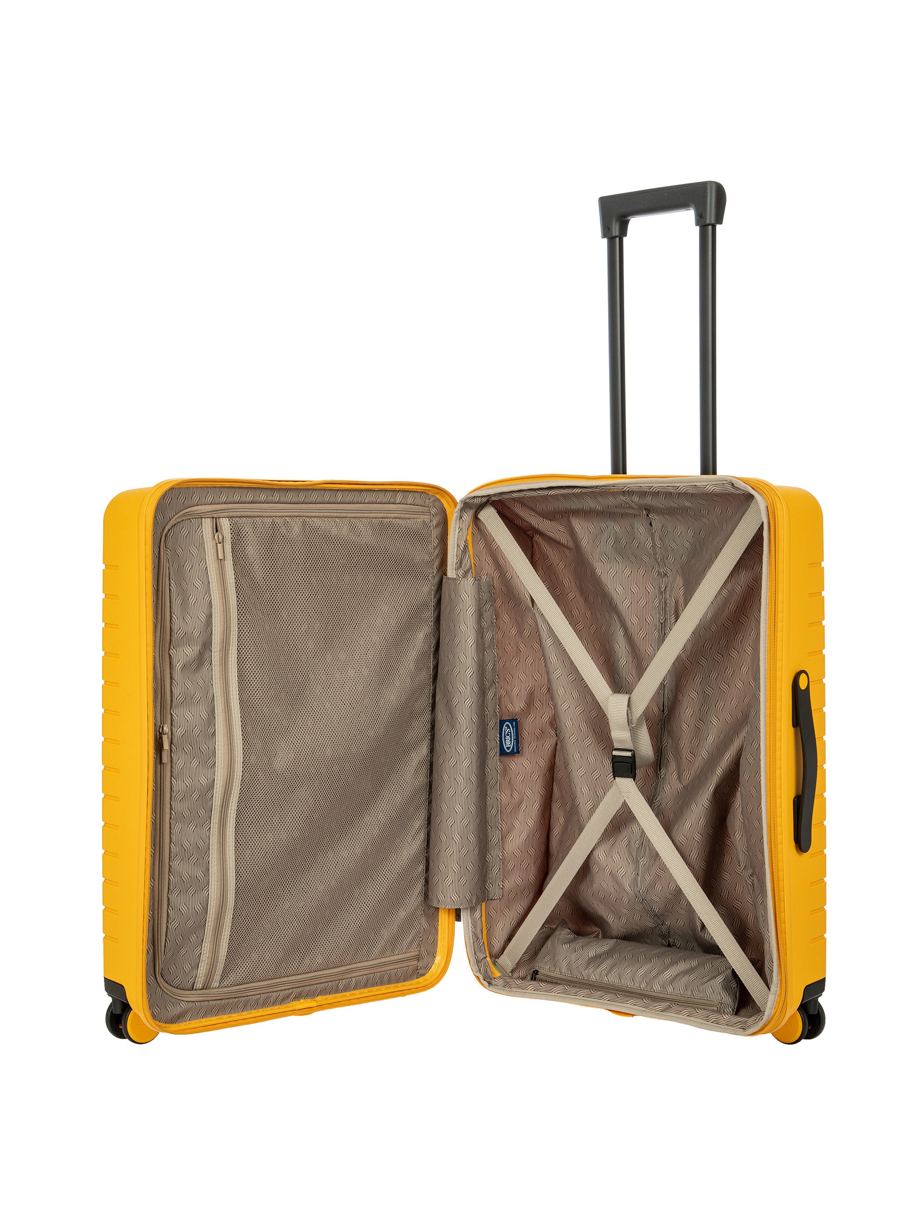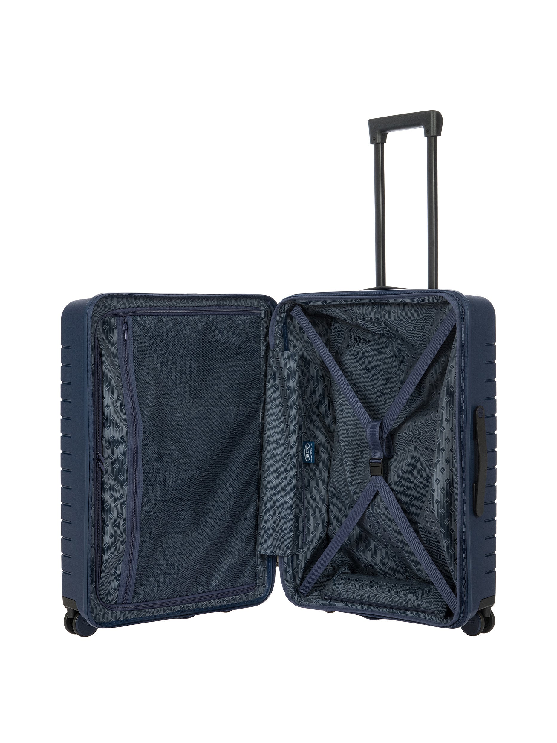 Erweiterbarer Hartschalen-Trolley in L Größe der Kollektion Ulisse B|Y. Die Außenschale im Urban Style und die versenkten Rollen machen den modernen Trolley zum perfekten Begleiter für jede Reise. AUẞEN: Schale aus Polypropylen für ein Maximum an Leichtigkeit, Flexibilität und Festigkeit. Das TSA-Schloss am Reißverschluss ist in die Schale integriert. Mit einem Reißverschluss lässt sich die Tiefe des Trolleys um 4 cm erweitern. GRIFF: bequemer und praktischer Ziehgriff mit Aluminiumrohren, per Drucktaste in drei Stufen einstellbar. Der obere und der seitliche Griff sind flach und ergonomisch. INNEN: innen gefüttert, zwei Fächer: Futter mit Reißverschluss und flacher Netztasche auf der einen Seite, Bänder mit Schnalle auf der anderen. Die separate Tasche mit Reißverschluss enthält einen abnehmbaren und waschbaren Beutel. ROLLEN: vier versenkte Doppelrollen zur Platzoptimierung, mit Bric's-Logo. Sie ermöglichen eine einfache und durch die Gummierung absolut geräuscharme 360°-Drehung. DETAILS: Das äußere Design zeichnet sich durch ein glänzendes Flachrelief im Urban Style aus, das mit der matten Farbe der Schale kontrastiert. Logodetails B|Y an den Tragegriffen, farblich abgestimmt auf die Schalenfarbe.