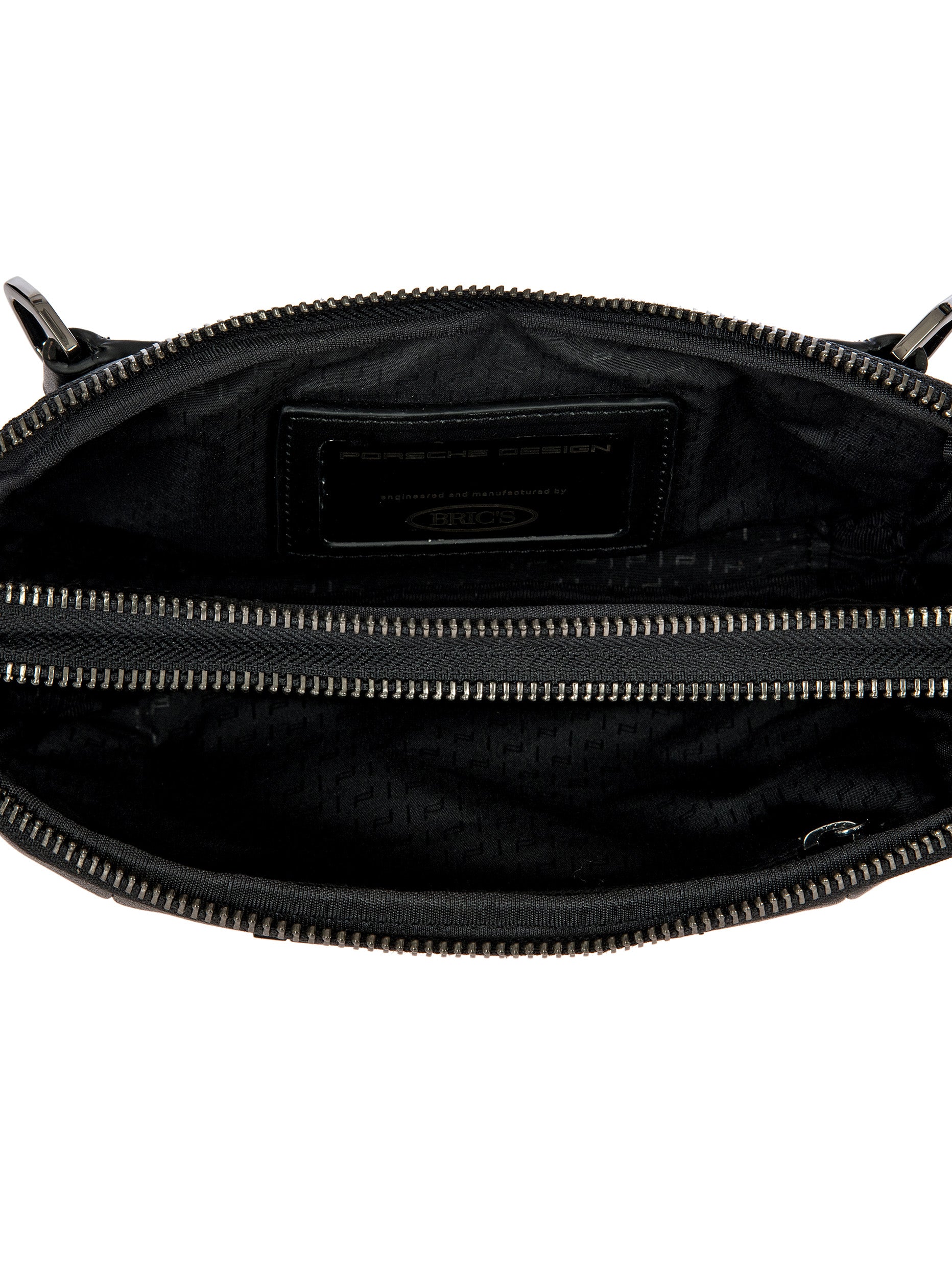 Porsche Design technical nylon fabric with PVC backing, with genuine calf leather and metal details. Lining: polyester fabric with heat printed Porsche Design icon logo on black color.. Clean delicately the stained area with a so and dry cloth. In case of greasy or persistent stain, use a small quantity of gentle degreaser. Do not use benzene or alcohol based products. Avoid ironing.