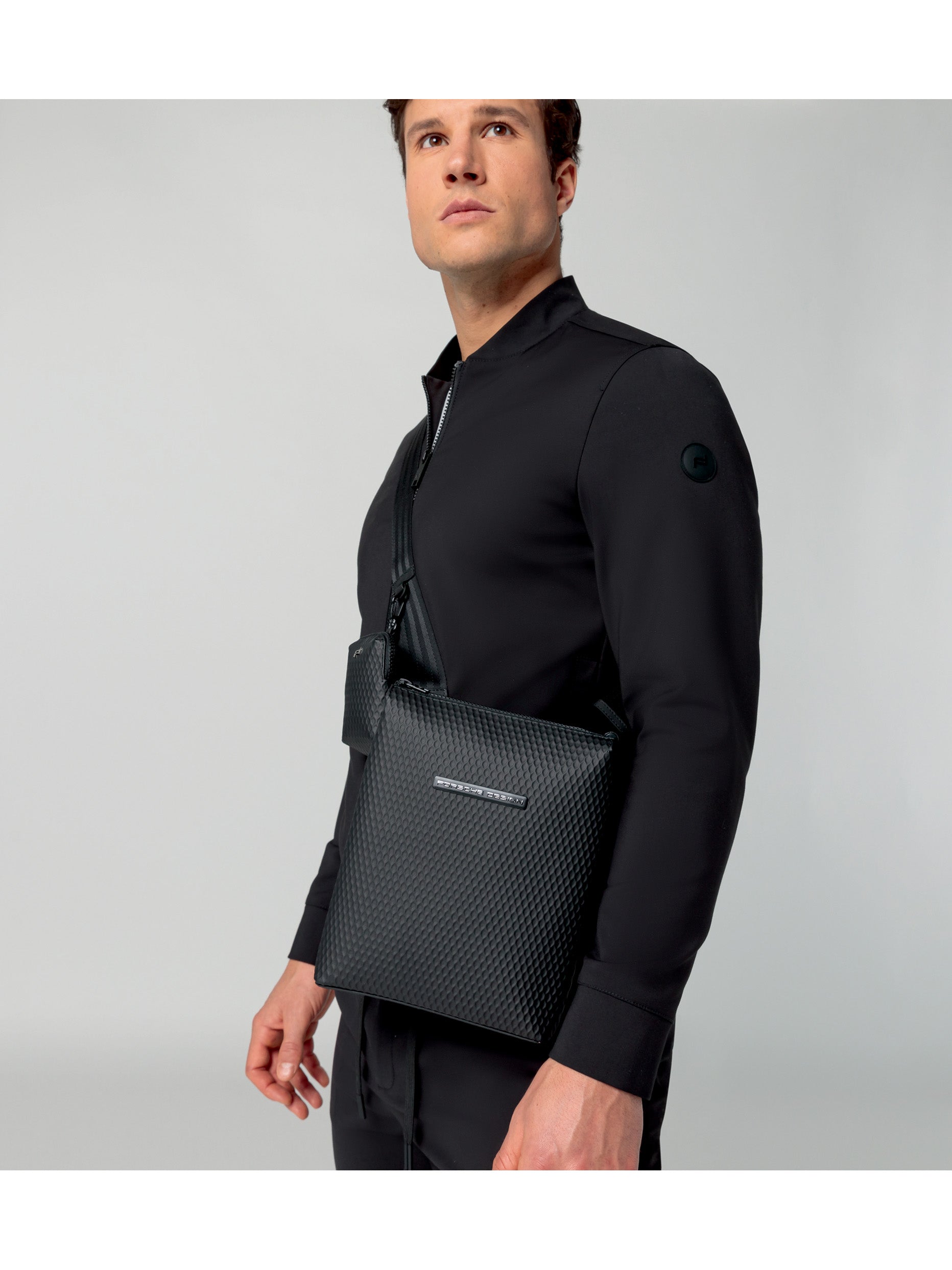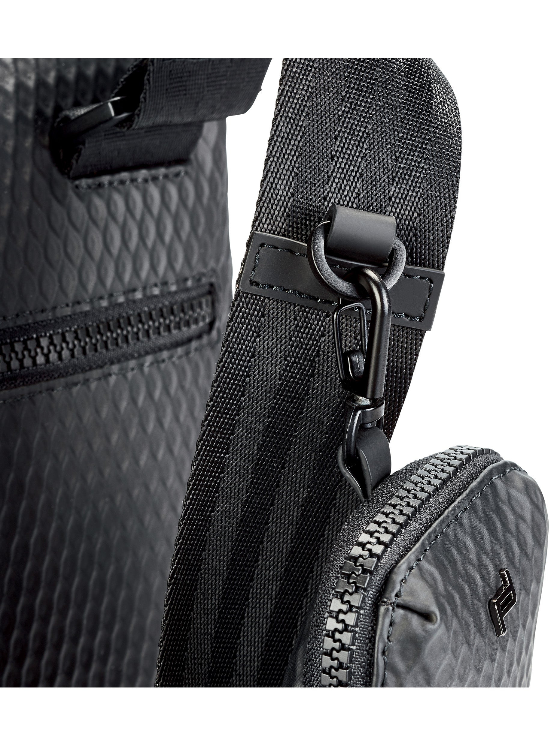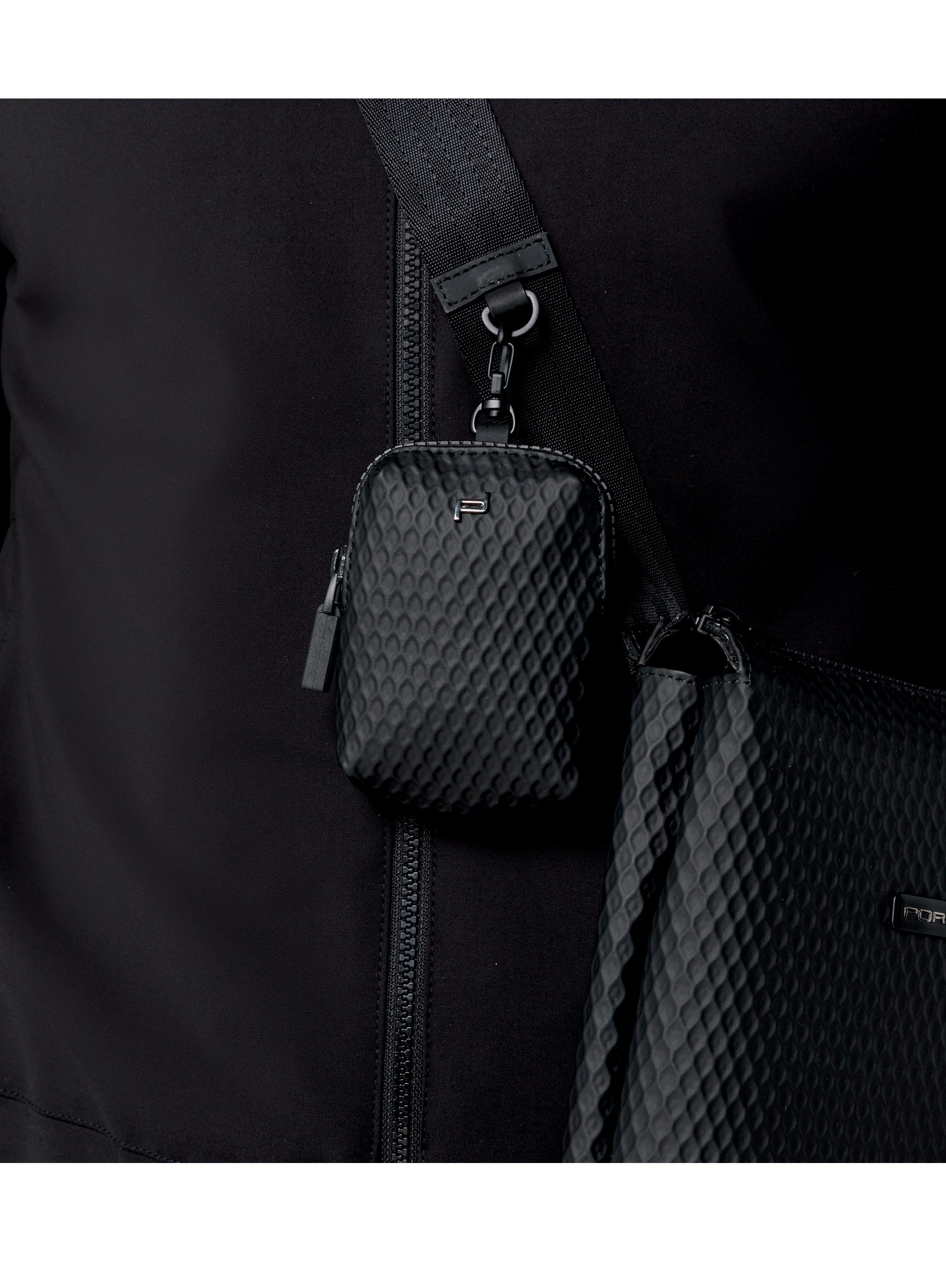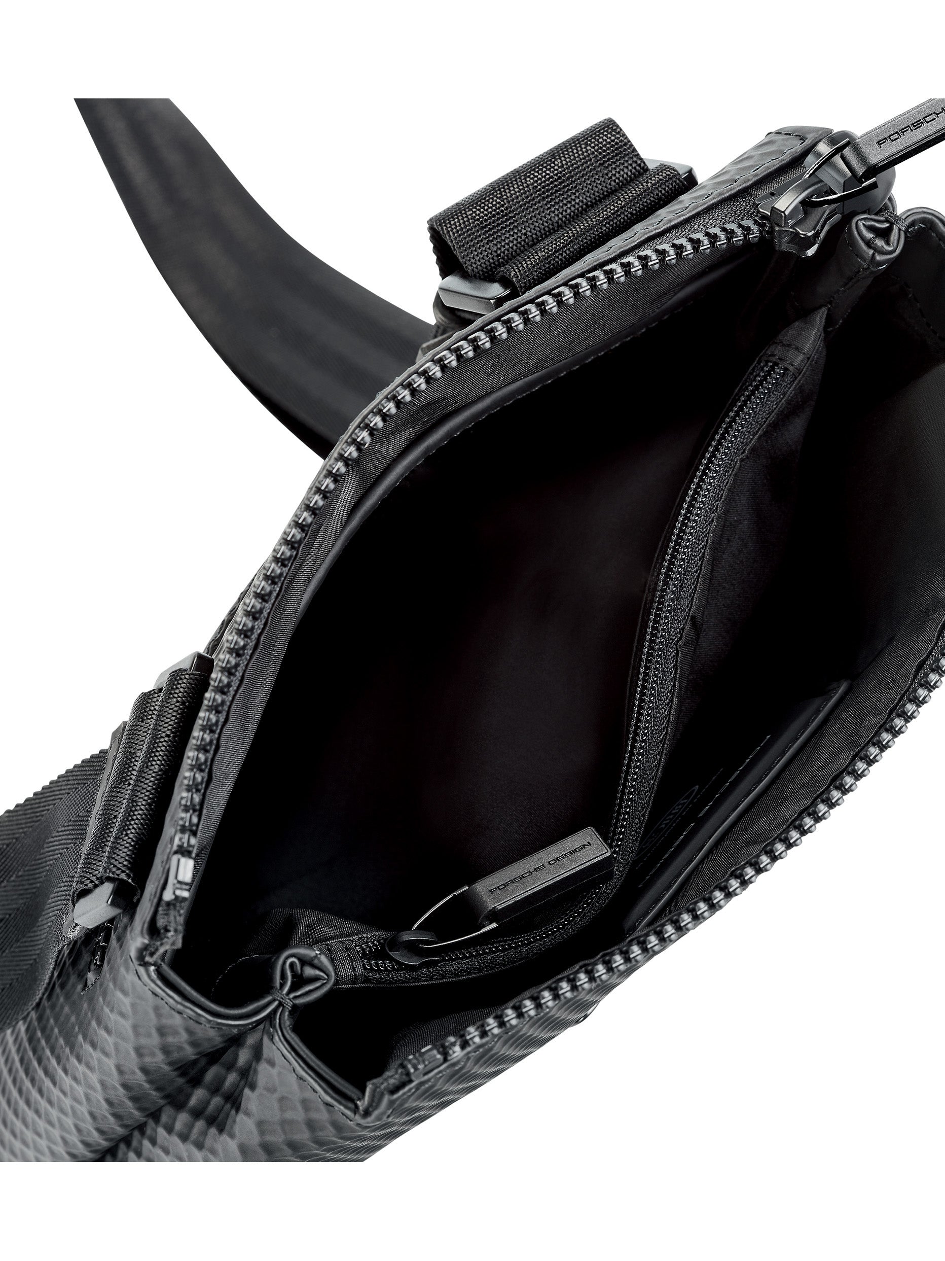 With its minimalist, stylish fully Black design and the high-quality honeycomb material, the Studio series makes a clear statement. The small shoulder bag is perfect for everyday life. Its easily accessible main compartment with separate zipped compartment and a small, padded slide-in compartment offer plenty of space. There is also a separate small pouch that can be attached to a ring on the shoulder strap in no time at all – ideal for storing smaller valuables such as AirPods. The shoulder bag is closed using a particularly smooth-running, eye-catching Porsche Design zip. The front is adorned with the Porsche Design emblem. The adjustable shoulder strap means that the bag can also be carried very comfortably.