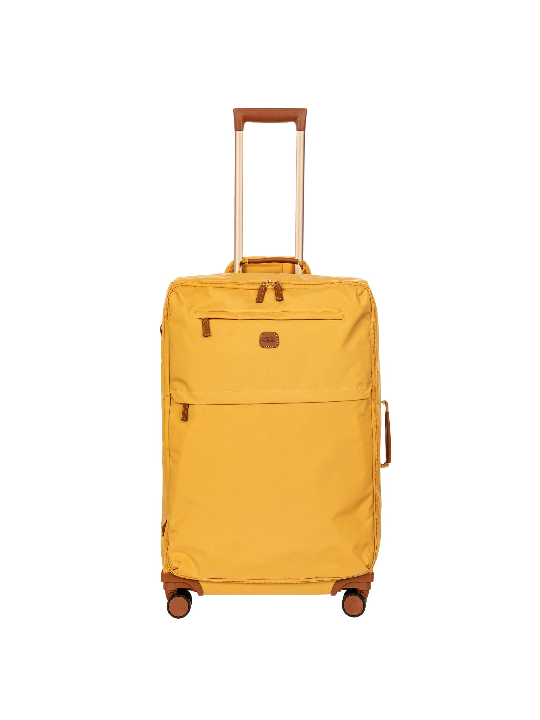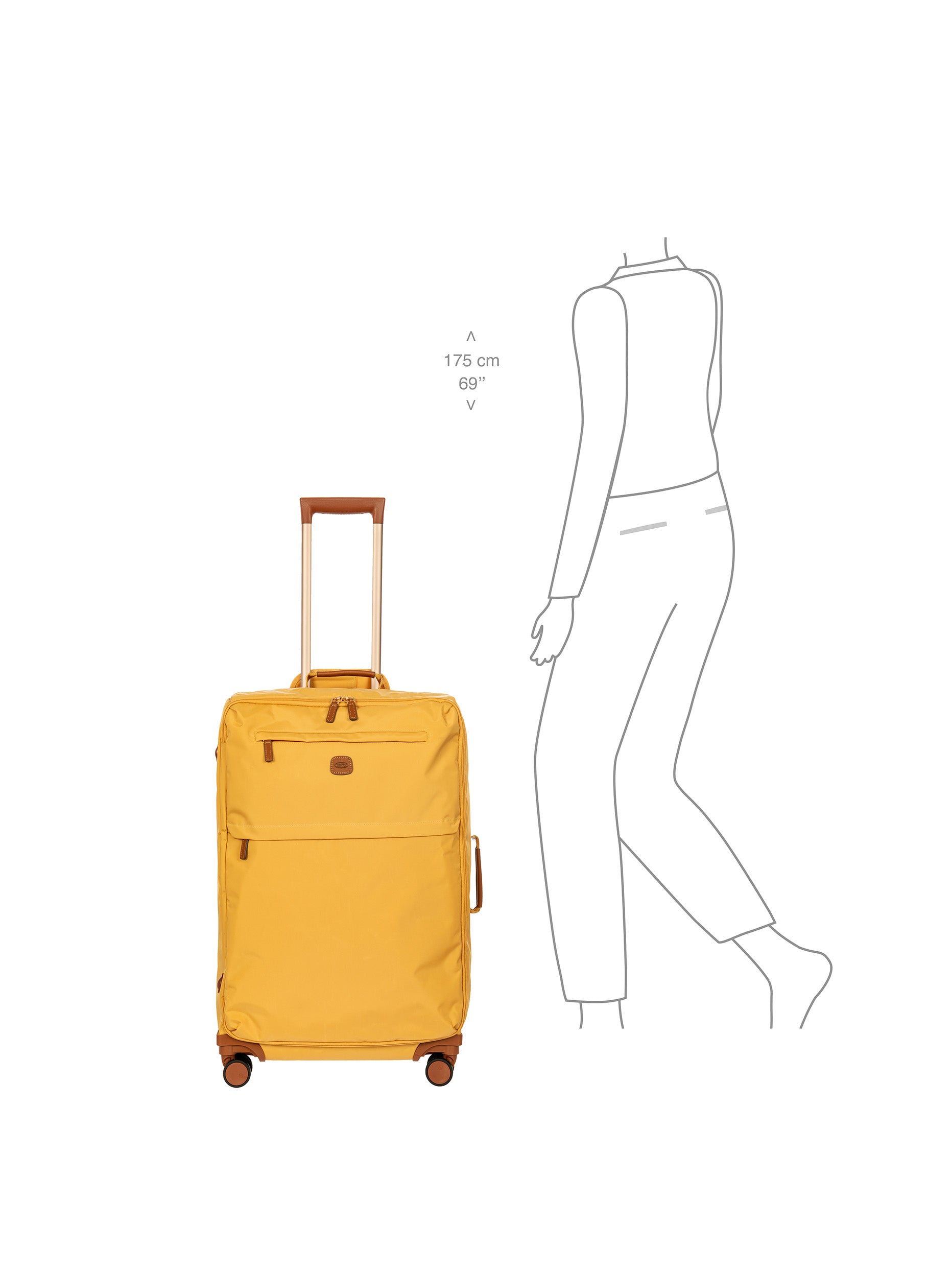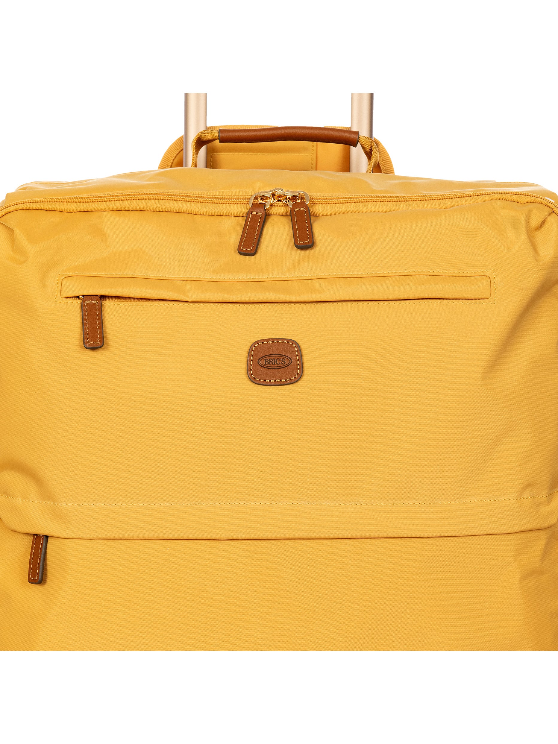 Part of the X-Collection, this mid-size (71 cm) trolley suitcase is made of durable recycled fabric, with a rigid, lightweight structure. The main compartment is opened by a double-slide zip. Two front zip pockets, inner pockets and compression straps ensure optimised organisation. The silent 360° spinner wheels guarantee smooth motion in every direction, and are recessed to maximise the packing capacity of the suitcase. The padded carry handles, the robust, sturdy aluminium tubes and the ergonomic retractable handle ensure comfort. It comes with an integrated ID tag carrier and rings for closure with a luggage lock (sold separately). Bric’s distinguished real leather trim and logo details enrich the suitcase.