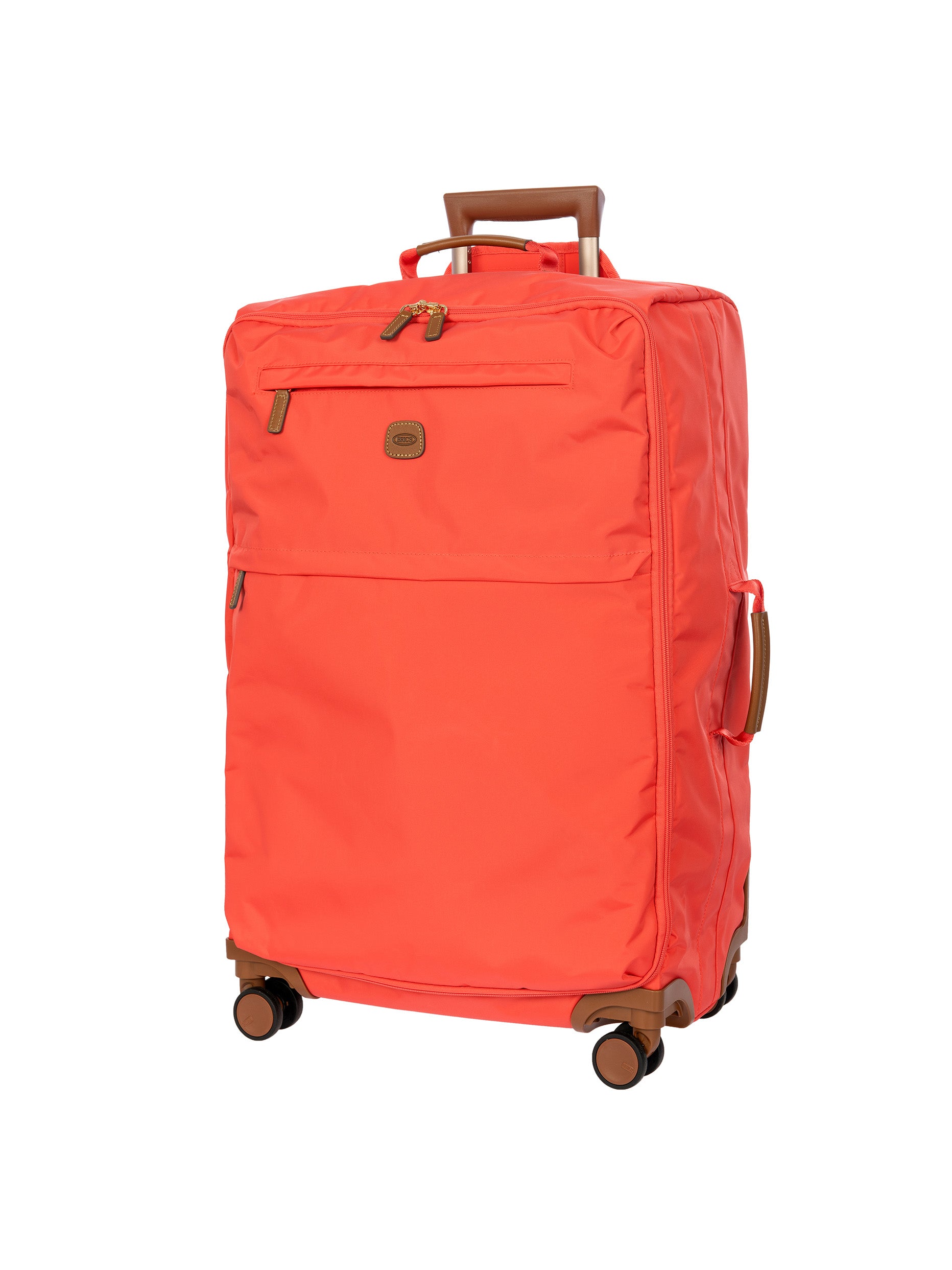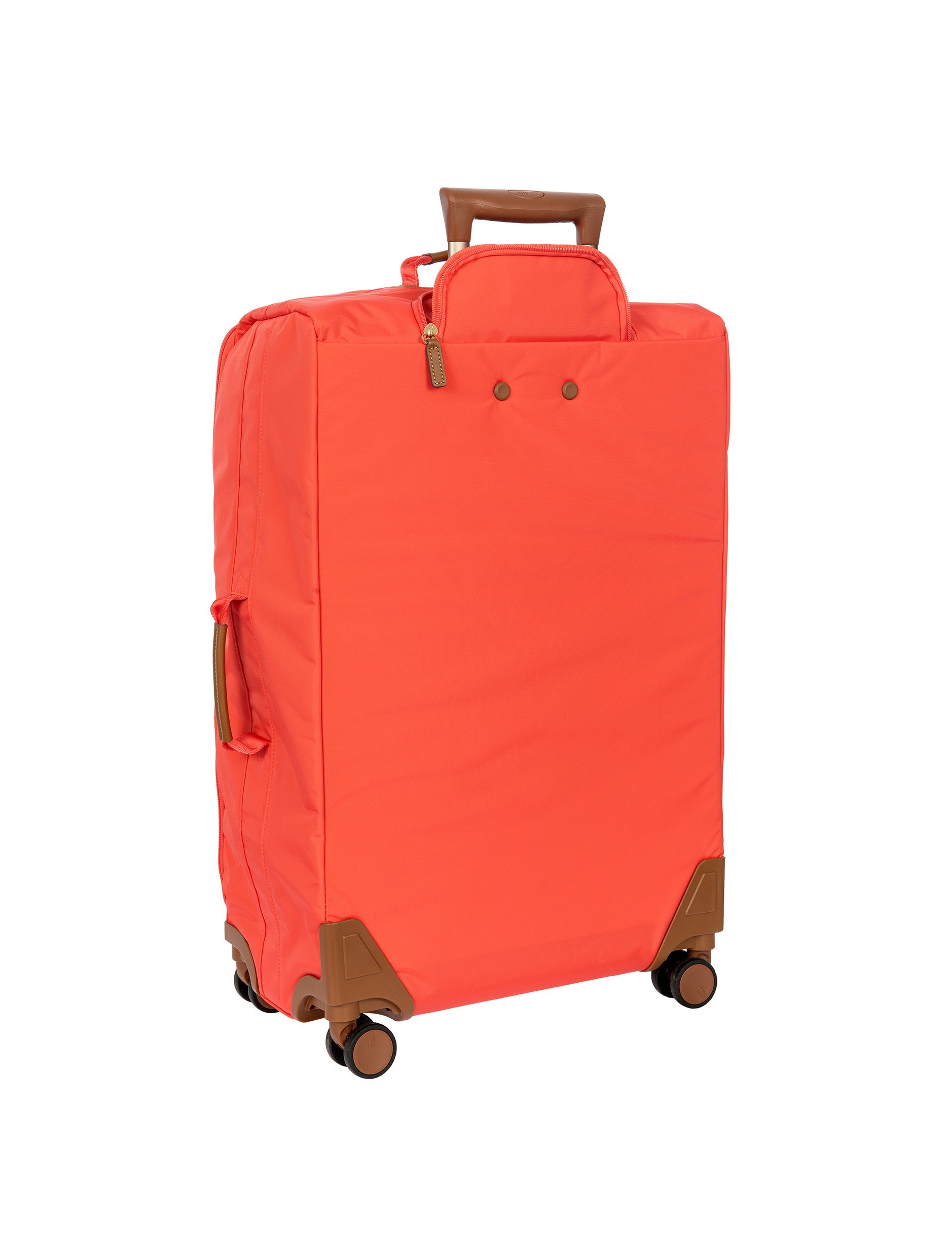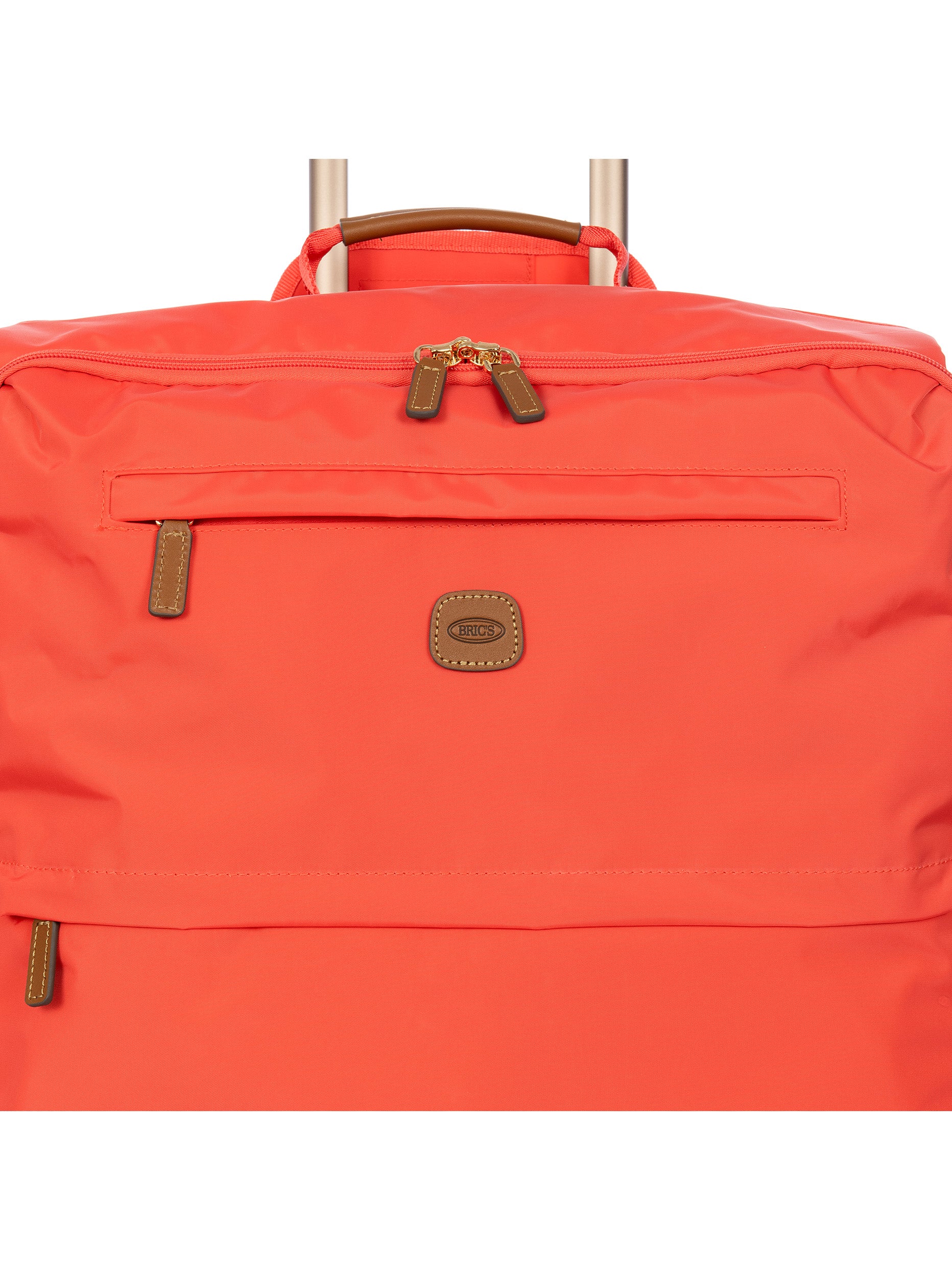Part of the X-Collection, this mid-size (71 cm) trolley suitcase is made of durable recycled fabric, with a rigid, lightweight structure. The main compartment is opened by a double-slide zip. Two front zip pockets, inner pockets and compression straps ensure optimised organisation. The silent 360° spinner wheels guarantee smooth motion in every direction, and are recessed to maximise the packing capacity of the suitcase. The padded carry handles, the robust, sturdy aluminium tubes and the ergonomic retractable handle ensure comfort. It comes with an integrated ID tag carrier and rings for closure with a luggage lock (sold separately). Bric’s distinguished real leather trim and logo details enrich the suitcase.