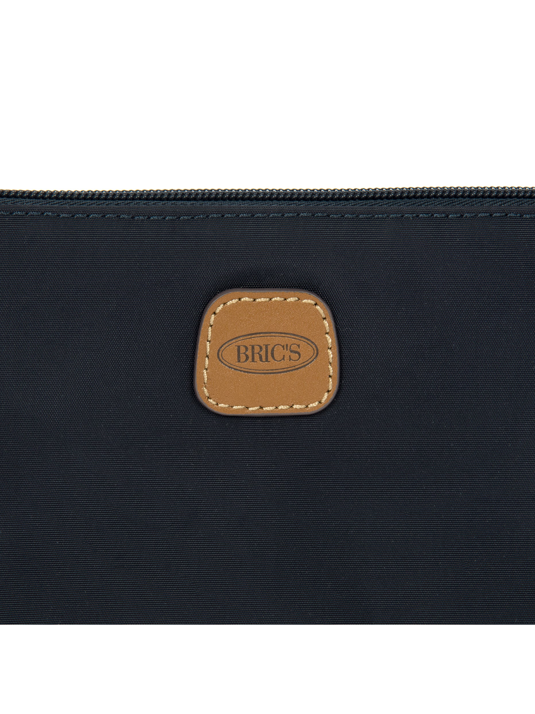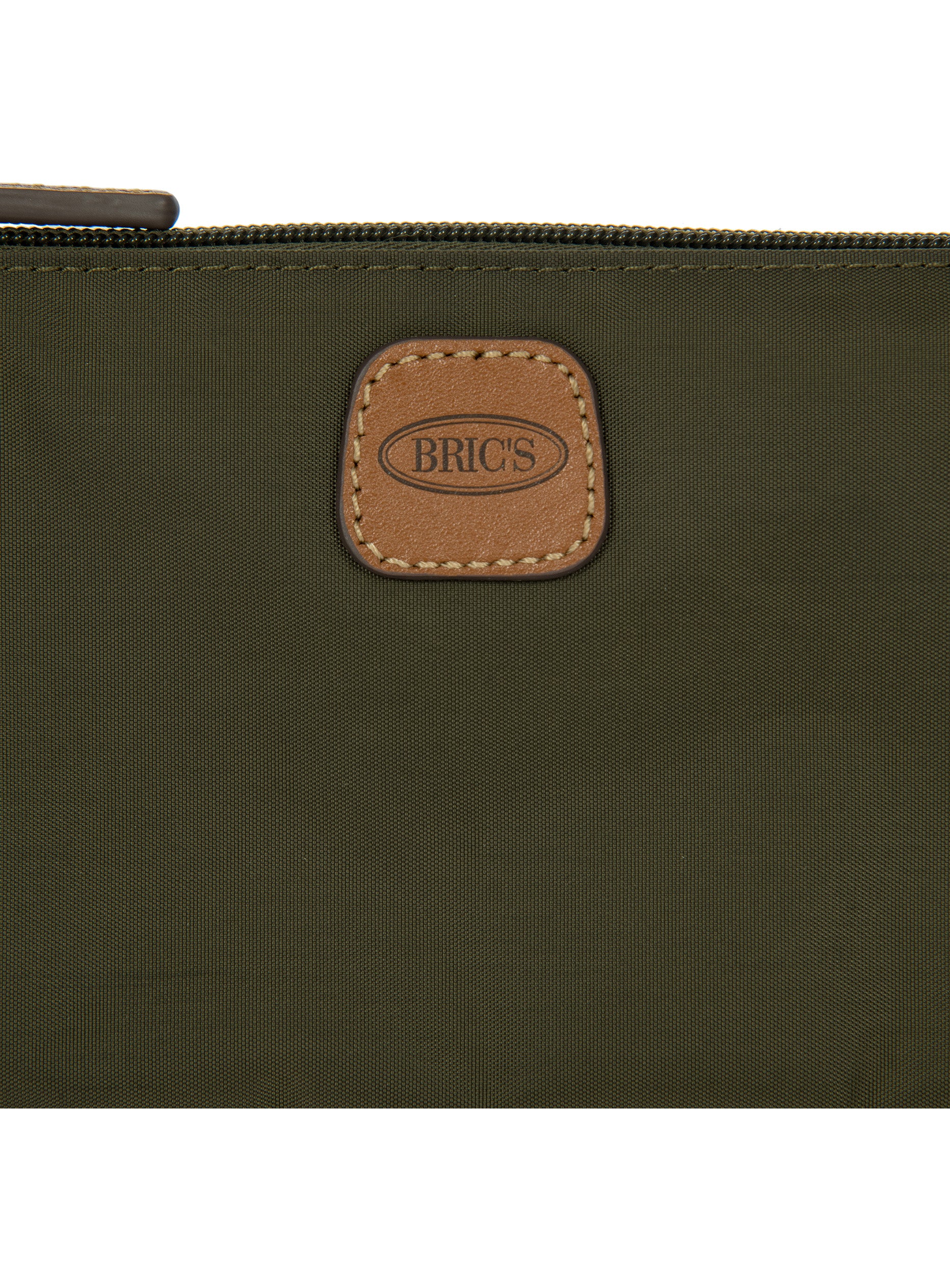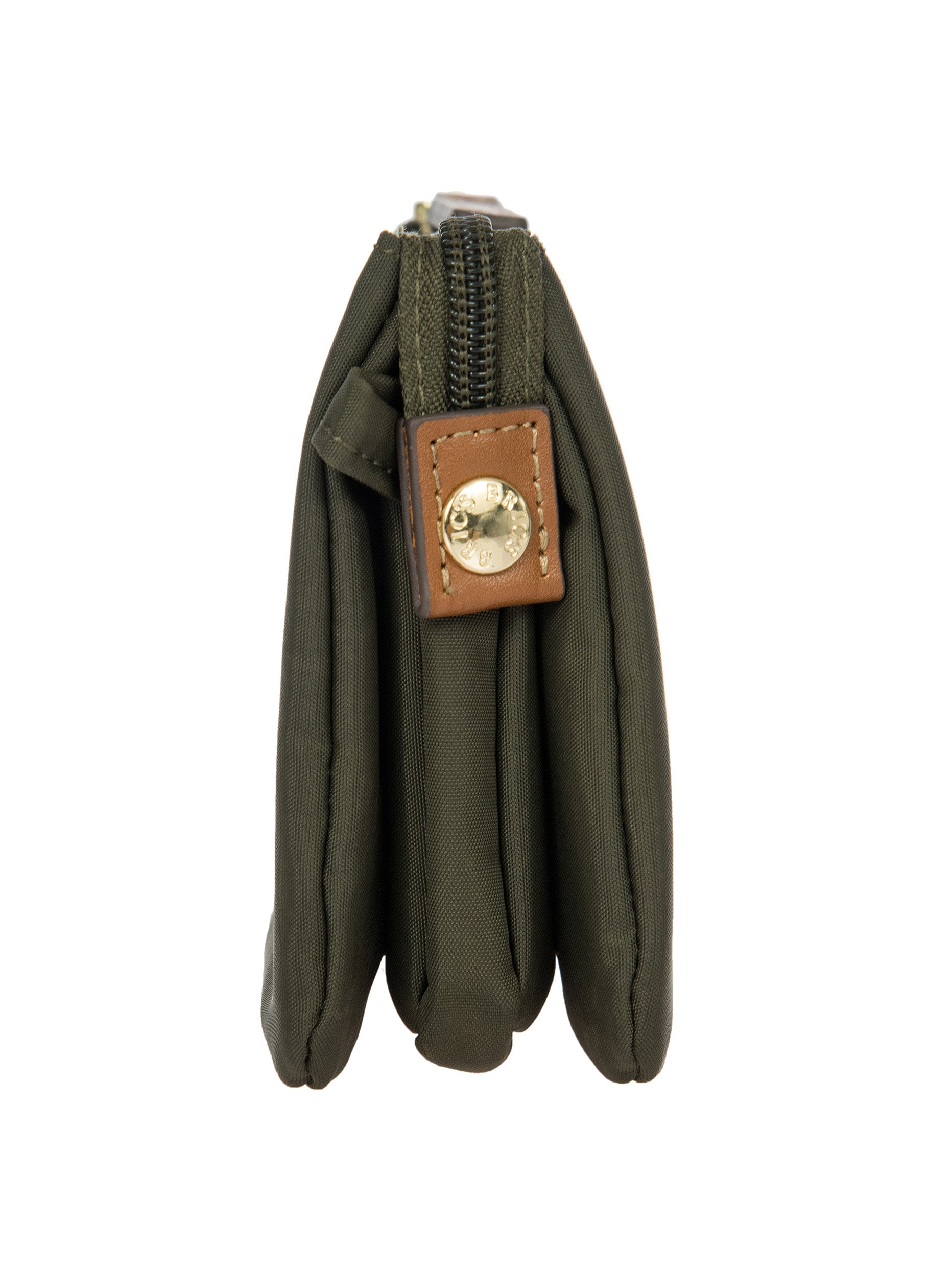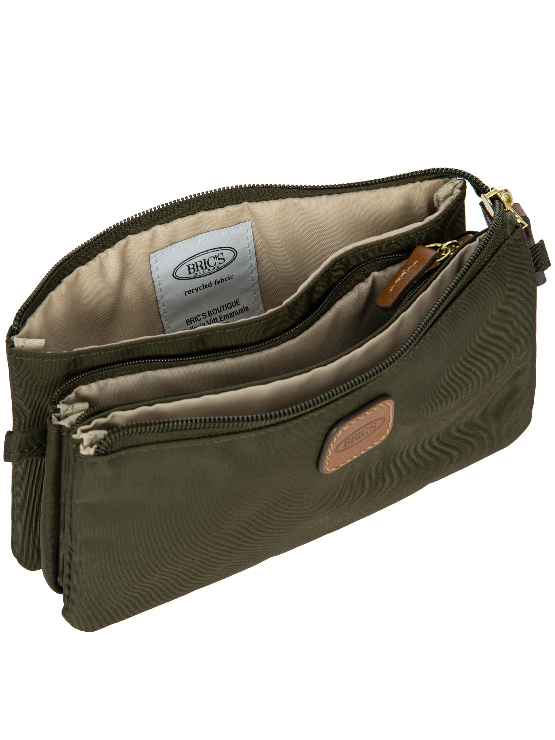 Part of our X-Collection, the 3-pocket clutch bag is made of a soft, robust and water-resistant recycled fabric. It is supplied with a removable thin shoulder strap, attached with gold-coloured snap hooks, to turn it into an over-the-shoulder bag. This lightweight and functional handbag is divided into three zipped compartments - perfect for travel or to keep all your belongings organized. Embellished by Bric's signature genuine leather details.