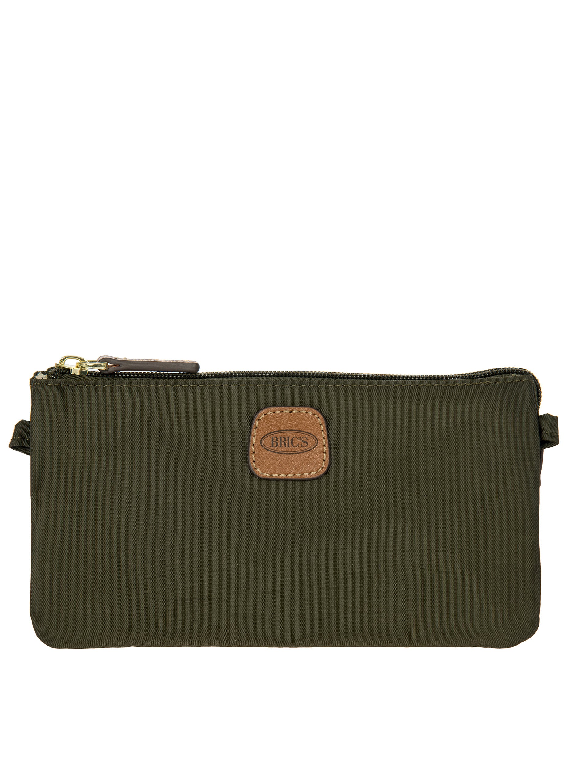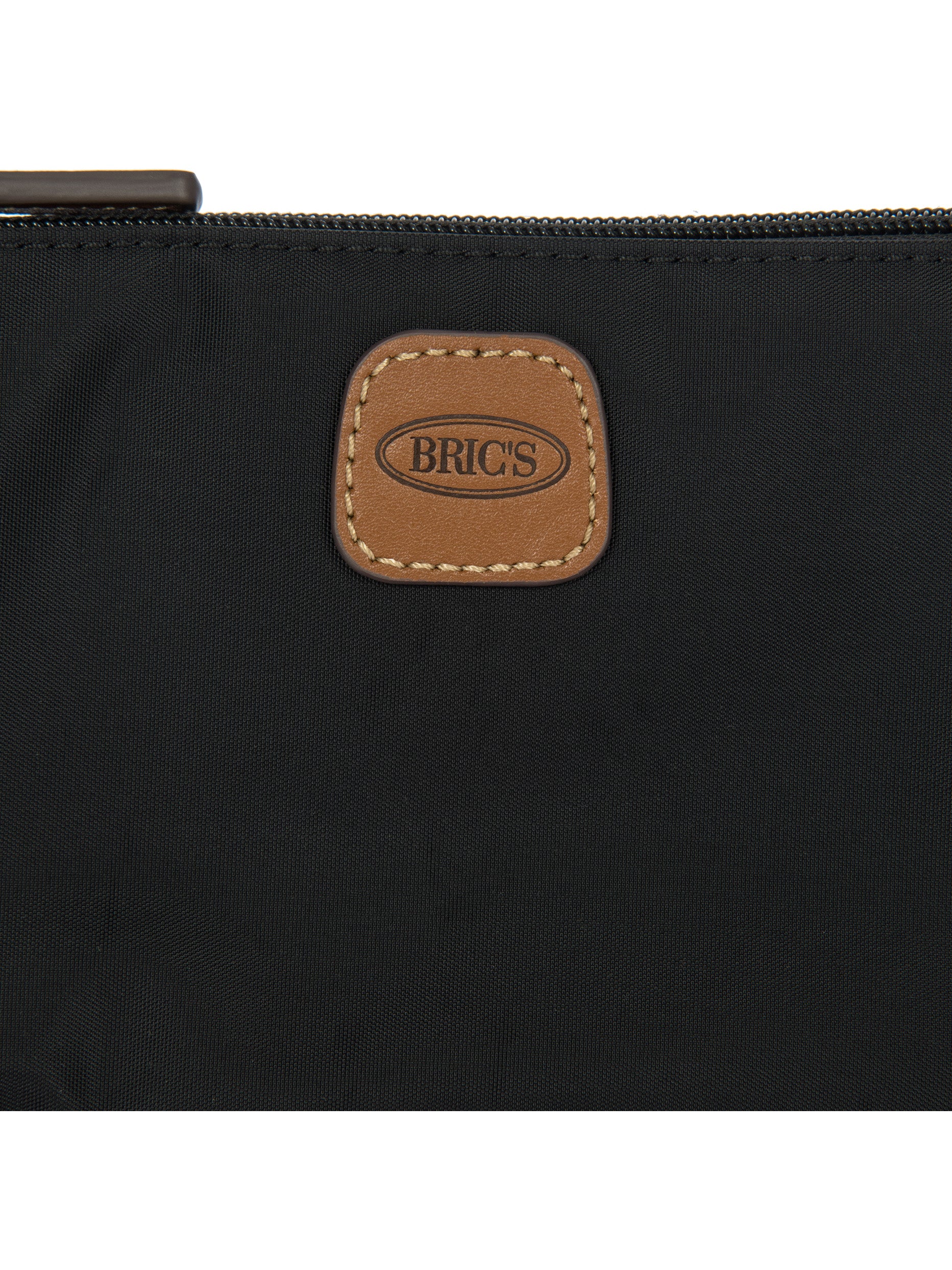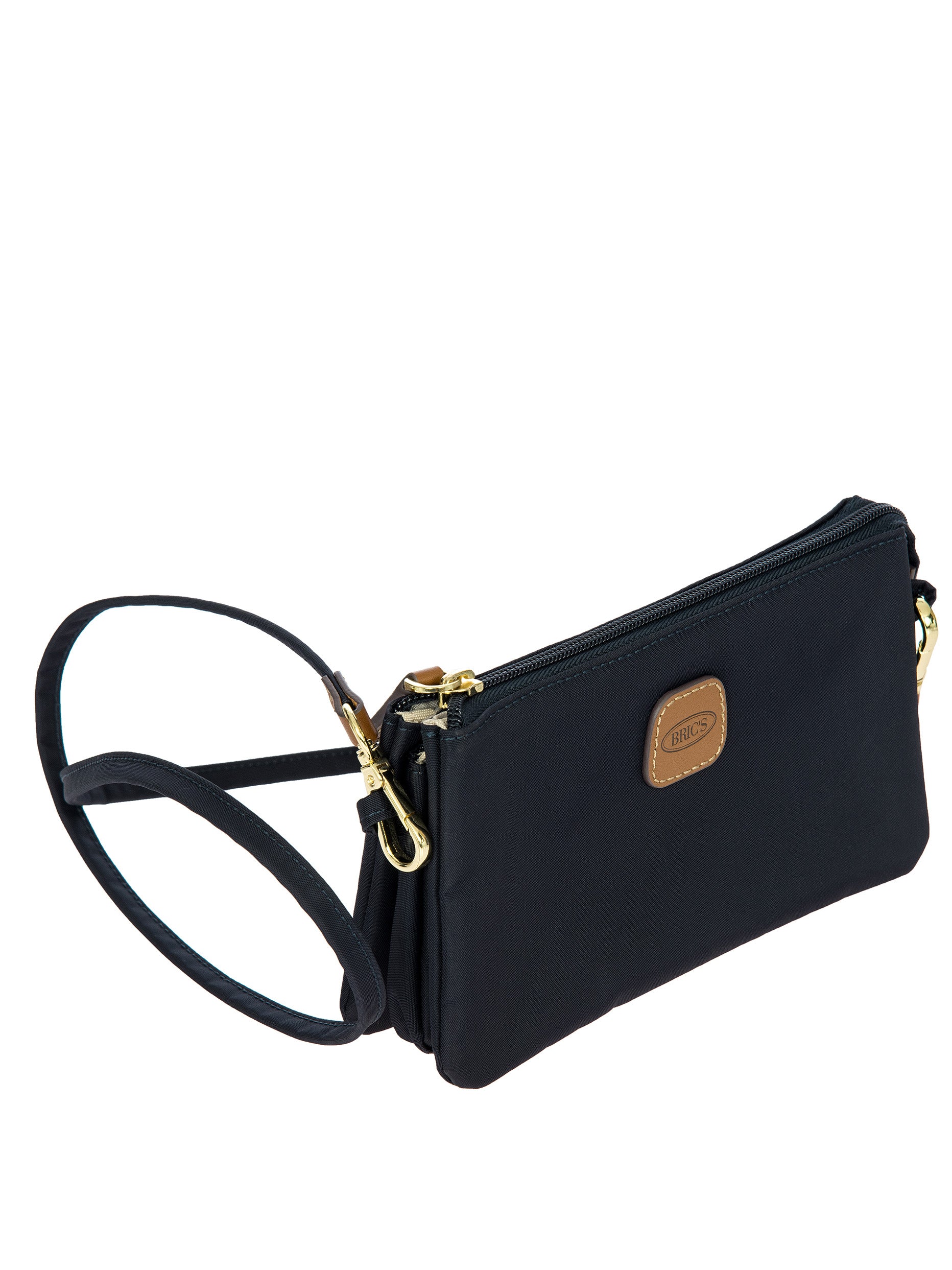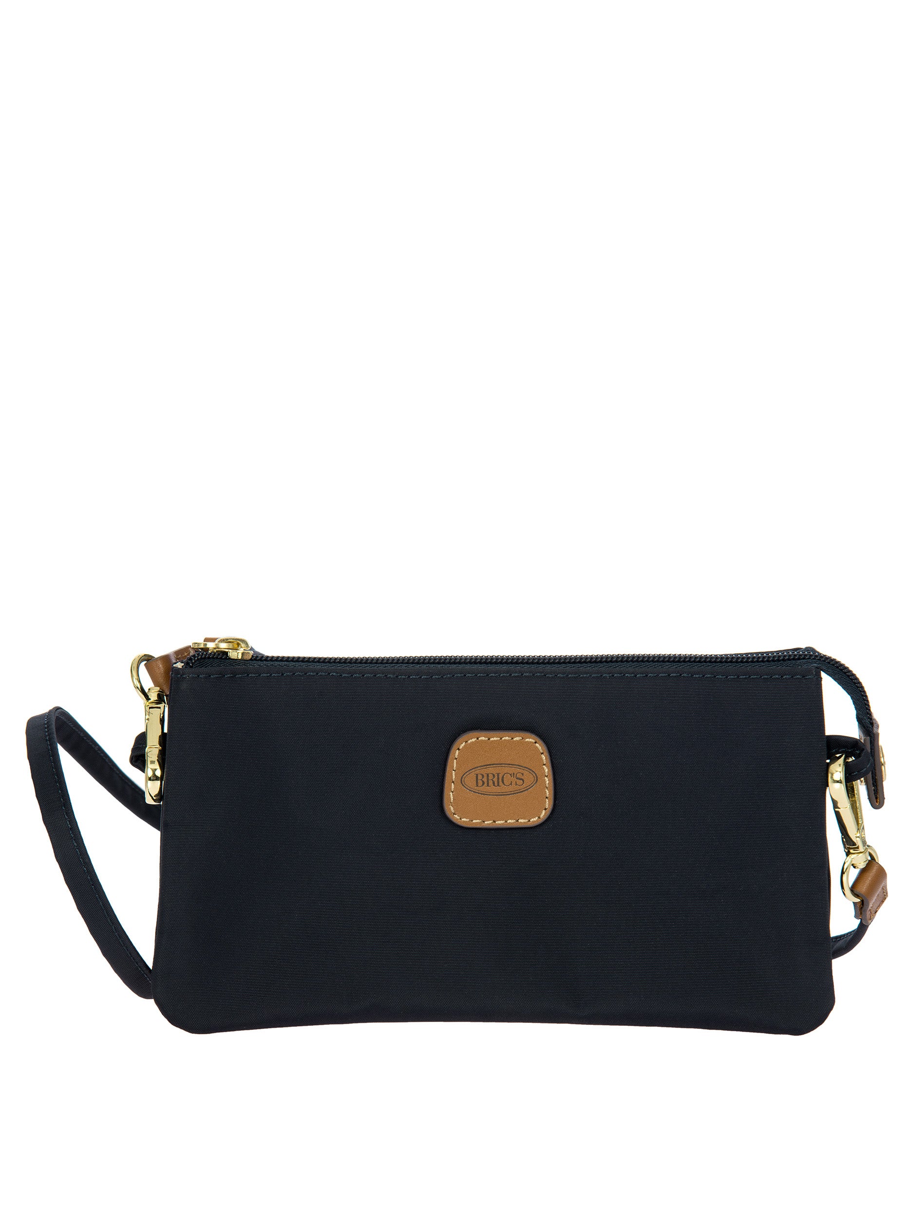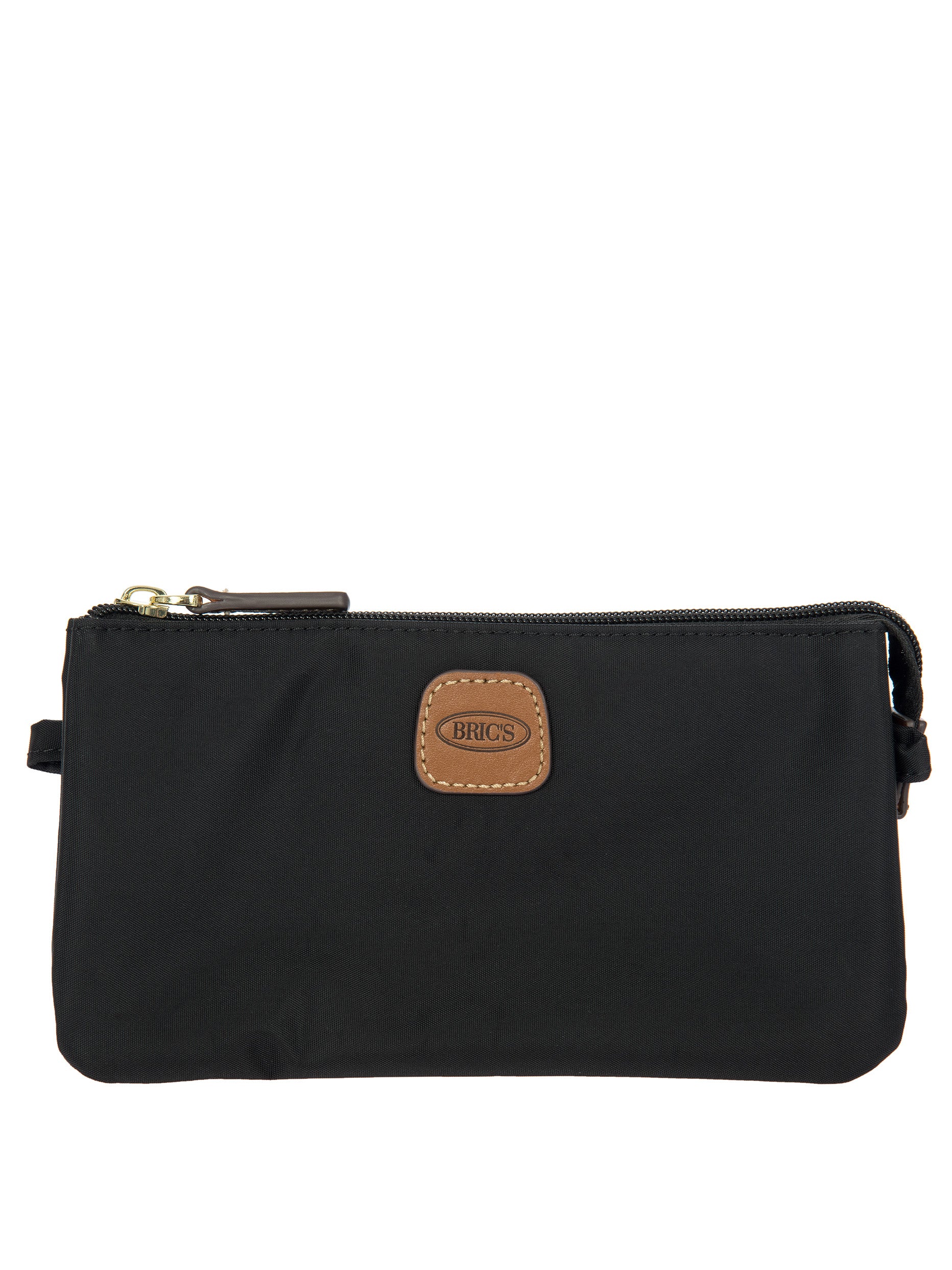 Part of our X-Collection, the 3-pocket clutch bag is made of a soft, robust and water-resistant recycled fabric. It is supplied with a removable thin shoulder strap, attached with gold-coloured snap hooks, to turn it into an over-the-shoulder bag. This lightweight and functional handbag is divided into three zipped compartments - perfect for travel or to keep all your belongings organized. Embellished by Bric's signature genuine leather details.