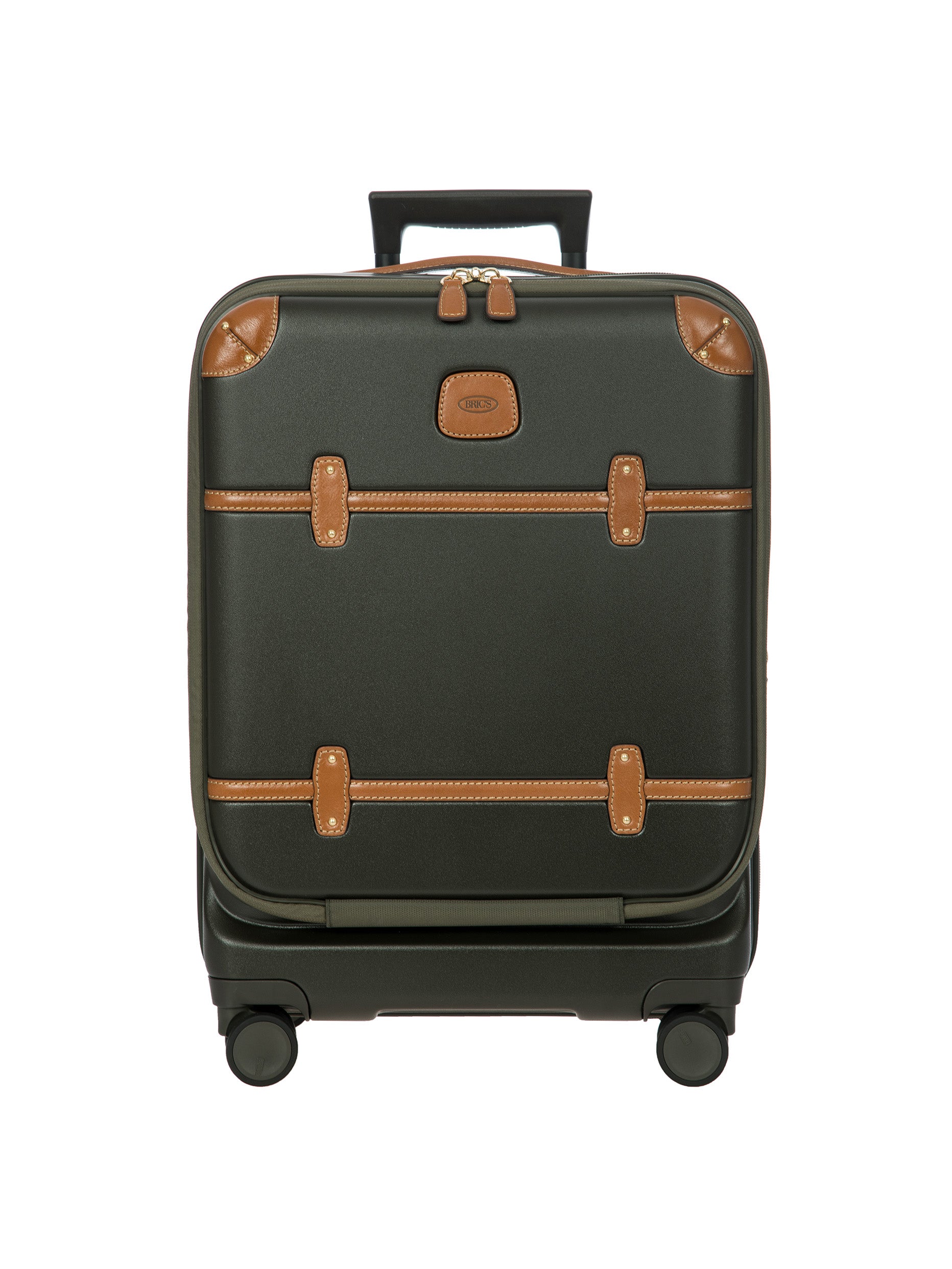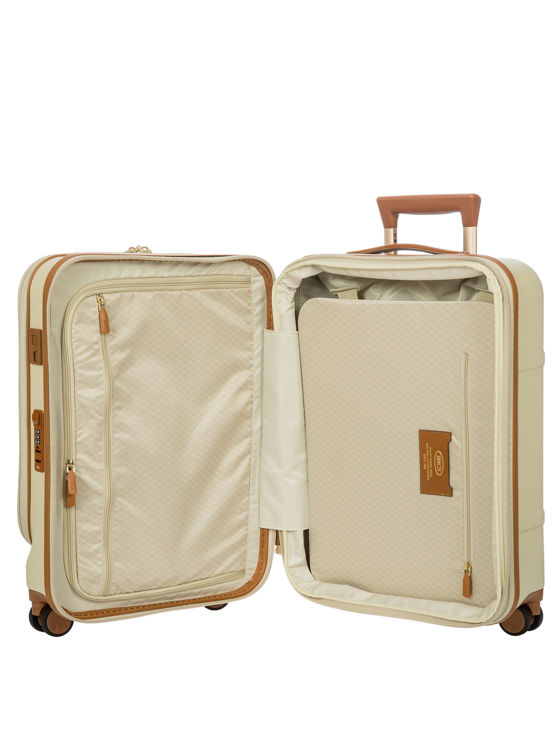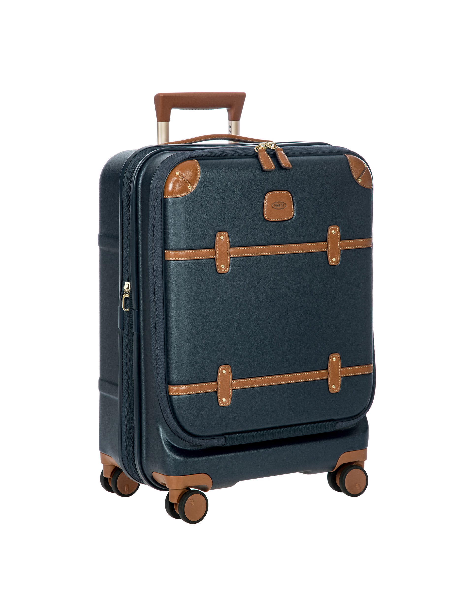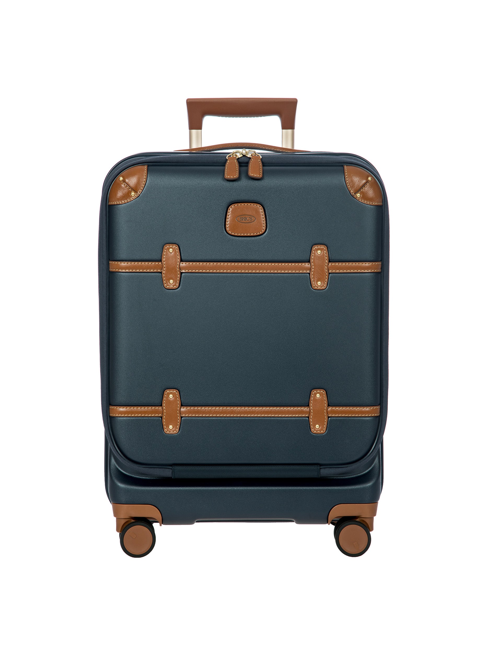 The Bellagio Collection is characterised by unmistakable design, our most iconic yet. With a front pocket, this cabin-size trolley is made of recycled polycarbonate, a lightweight, flexible material which is ultra durable and impact-resistant. The front pocket provides quick and easy access to the protected computer/tablet sleeve, complete with a USB port for a battery pack. The USB adapter is protected on the outside by a rain-blocking cover. The suitcase’s closure features a TSA lock and an ultra-secure zip: this anti-tampering system ensures an optimised degree of protection from attempted theft. The inside is complete with a compression system, divided into two compartments to ensure the effective organisation of all your items. Moreover, the expandable zip closure makes it possible to increase its capacity. The lining is easily removed thanks to a special zip: that way, if needed, it can be washed separately. To ensure comfort and ease of use, the retractable handle is made up of robust, sturdy aluminium tubes with intermediate stop positions so that its height can be adjusted as needed, and an ergonomic grip. The four double wheels move quietly and rotate a full 360° for guaranteed manoeuvrability, equipped with ball bearings that create a smooth ride. Moreover, the wheels are recessed in the shell, thereby increasing the capacity of the trolley. Bric’s distinctive real leather accents trim the outside of the Bellagio trolley, complemented by refined logo details. The leather address tag carrier is an essential finishing touch.