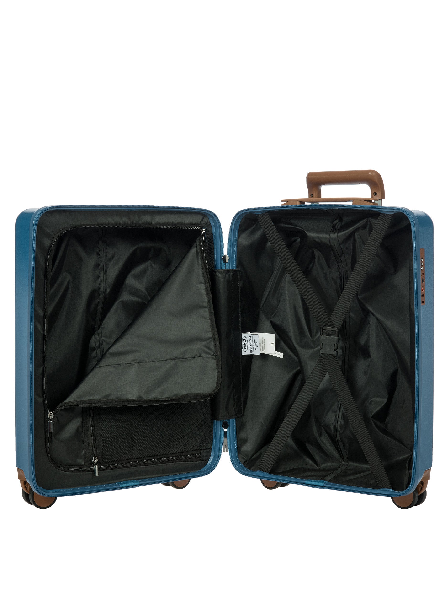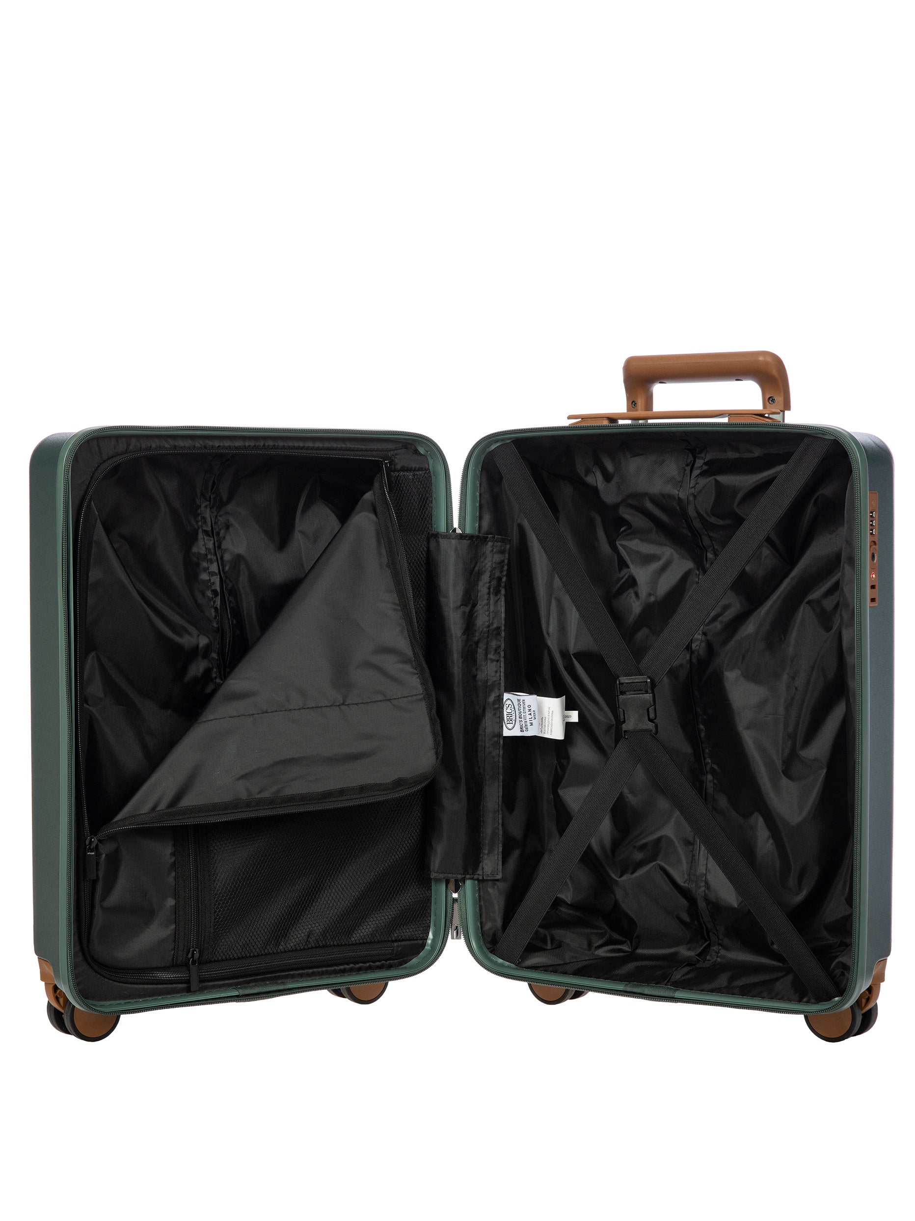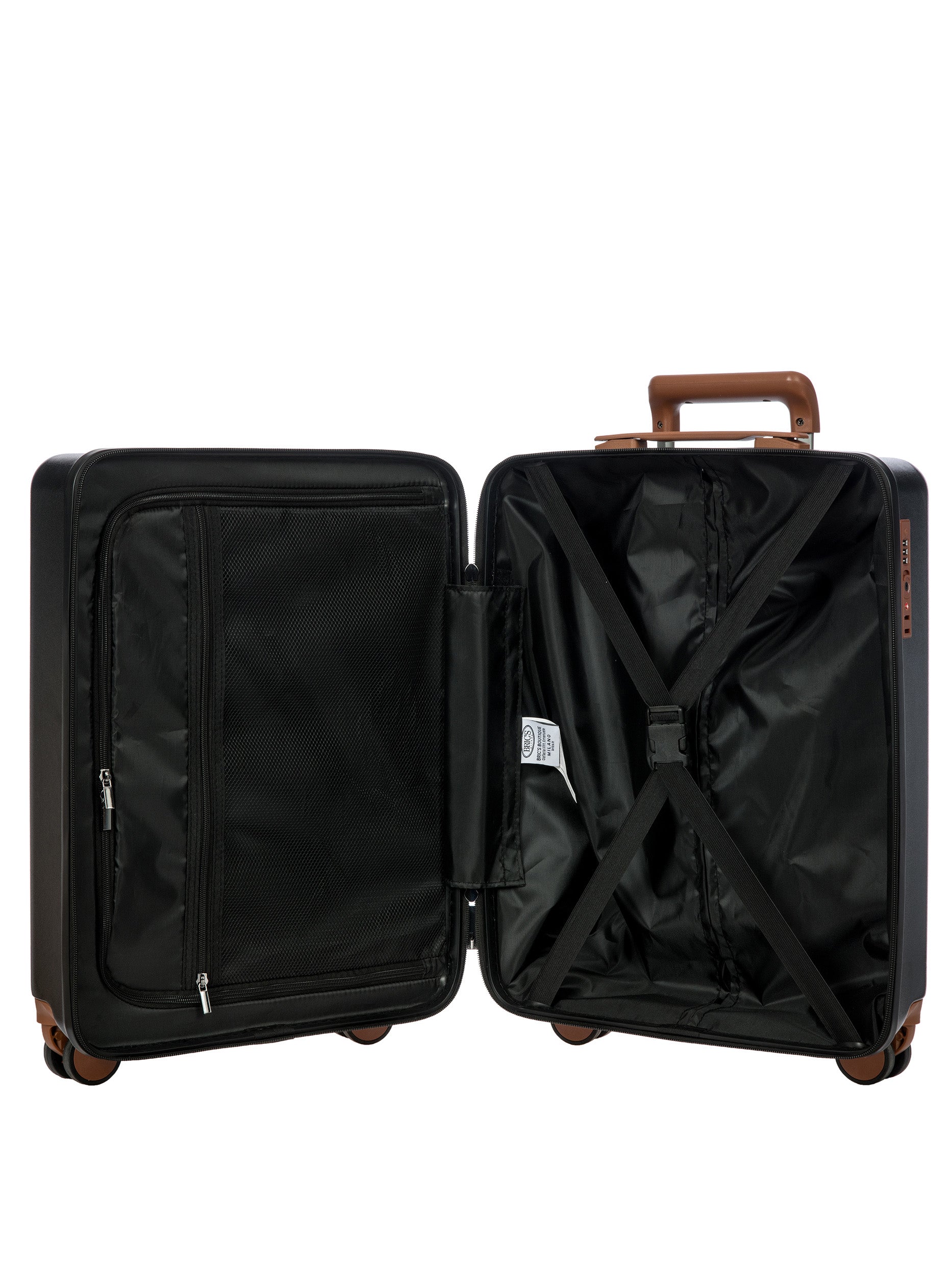 The Ferrara Collection cabin trolley is made of polycarbonate, a lightweight and durable material. The opening has a double-slider zipper, embellished with a tone-on-tone finish. The TSA padlock is integrated. The four wheels are silent and swivel to ensure smooth 360° movement. They are also recessed to maximise trolley capacity. Internally, the trolley has a zippered pocket and is divided into two separate compartments to help organise your belongings. Finished with a fabric lining. For ease of use, the towing system consists of strong and stable, multi-stop aluminium tubes with ergonomic grip. The trolley is embellished with Bric's refined logo.