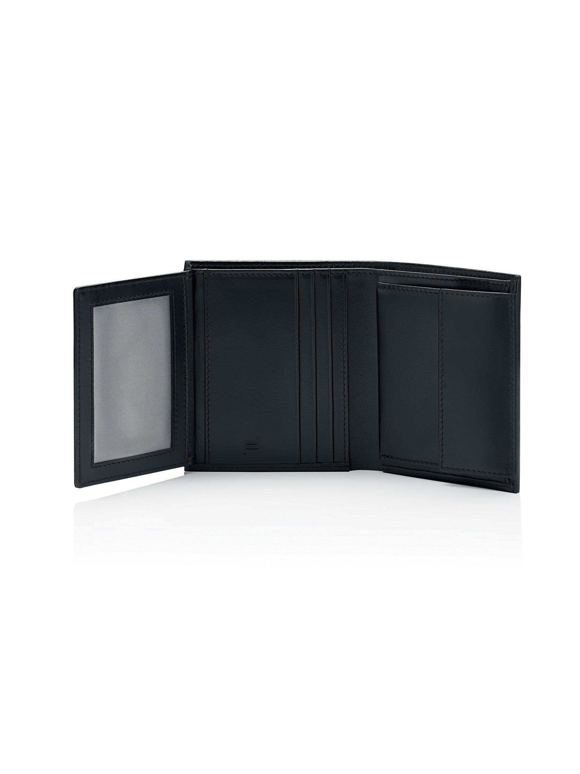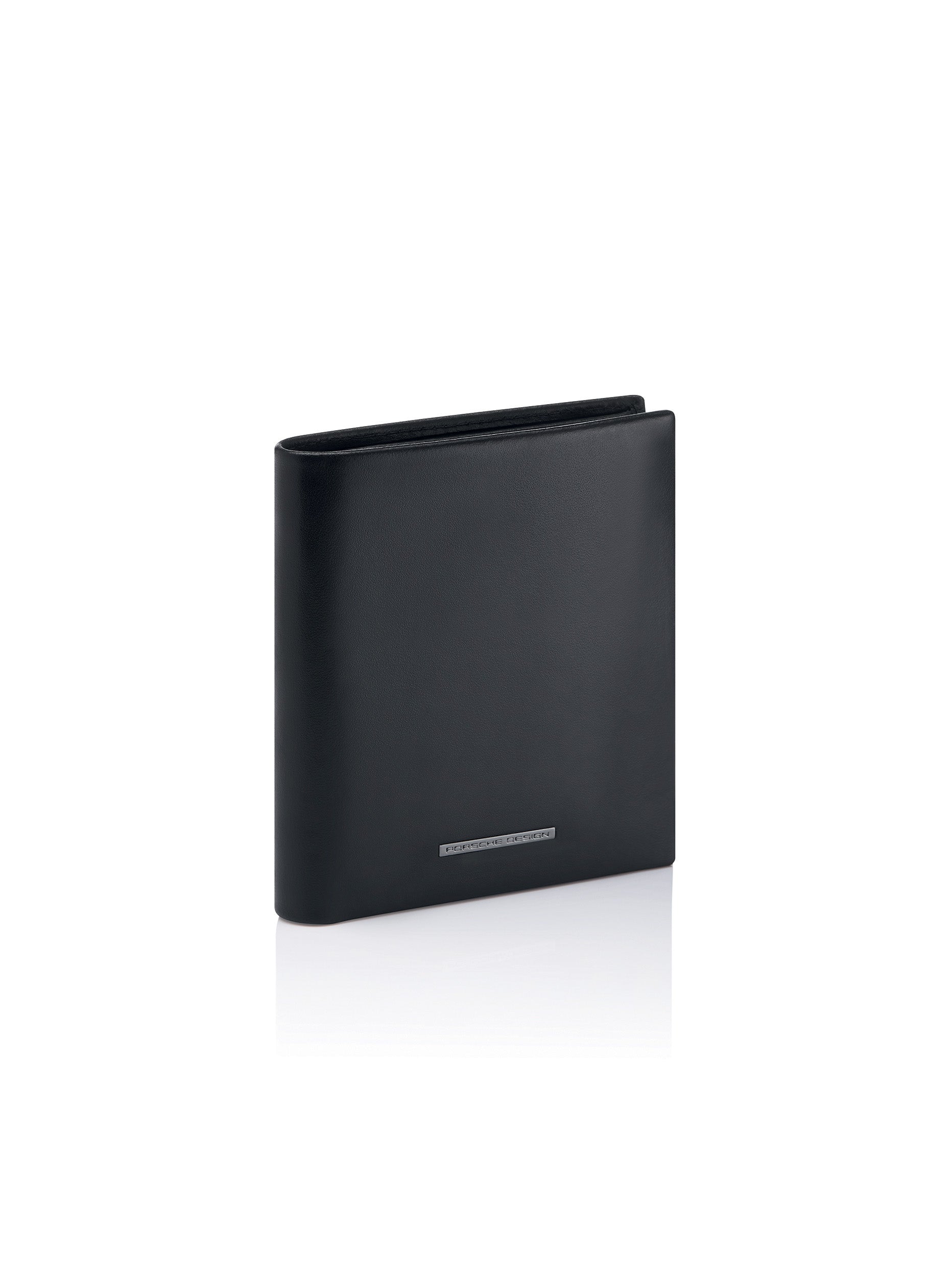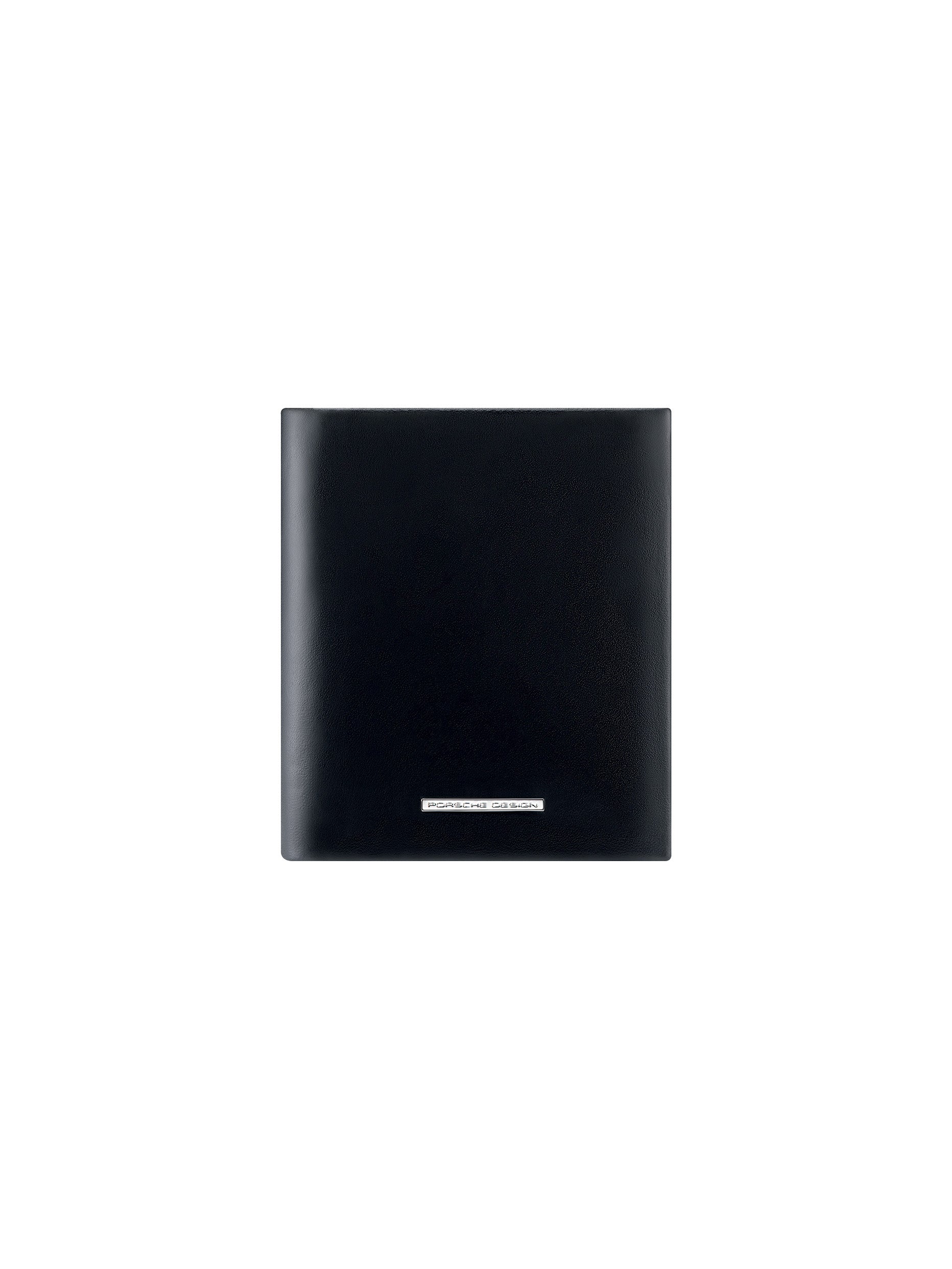 The elegant fusion of aesthetics and functionality: the Porsche Design Classic collection. High-quality, shiny smooth leather in black, seamlessly created exteriors and the characteristic metal Porsche Design logo plate give the Porsche Design Classic Wallet 6 a timeless and minimalistic style. The high-quality interior with signature design details is in line with the smart design: the vertical trifold wallet amazes through a spacious, functional interior design. The vertically expandable wallet offers space for all important cards and receipts with six credit card slots, a coin compartment with snap fastener, a compartment for bills, a mesh compartment for IDs and a larger pocket for items such as business cards.