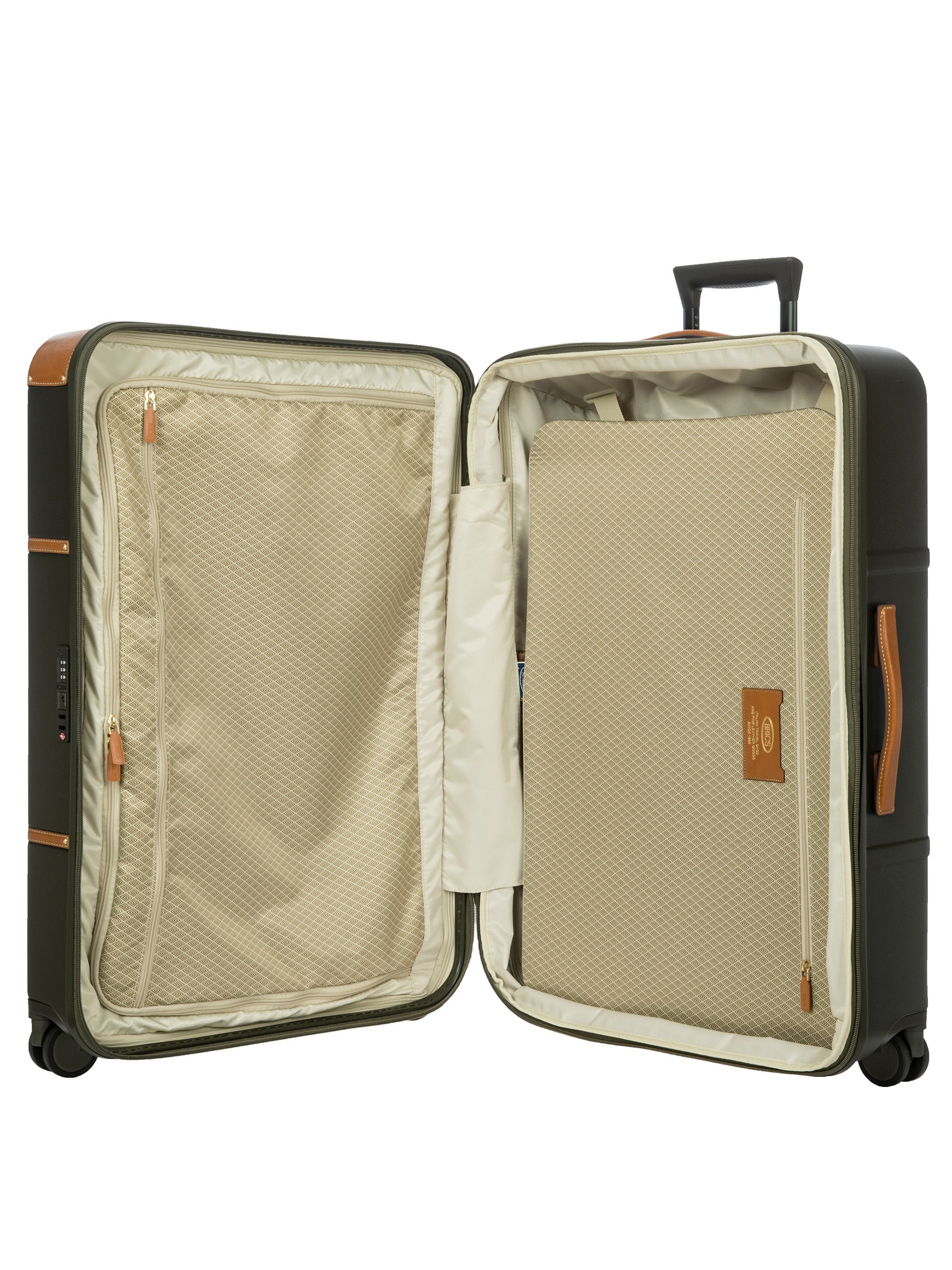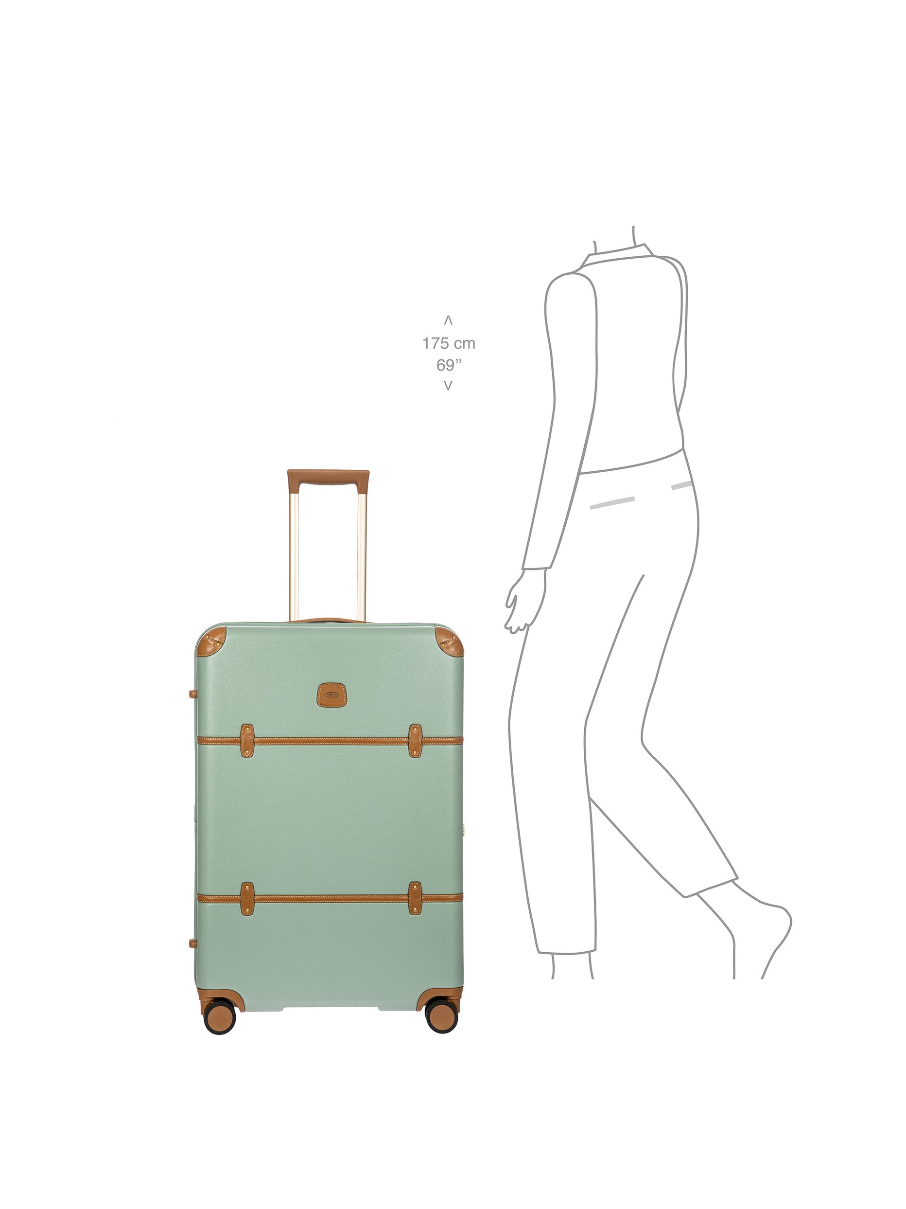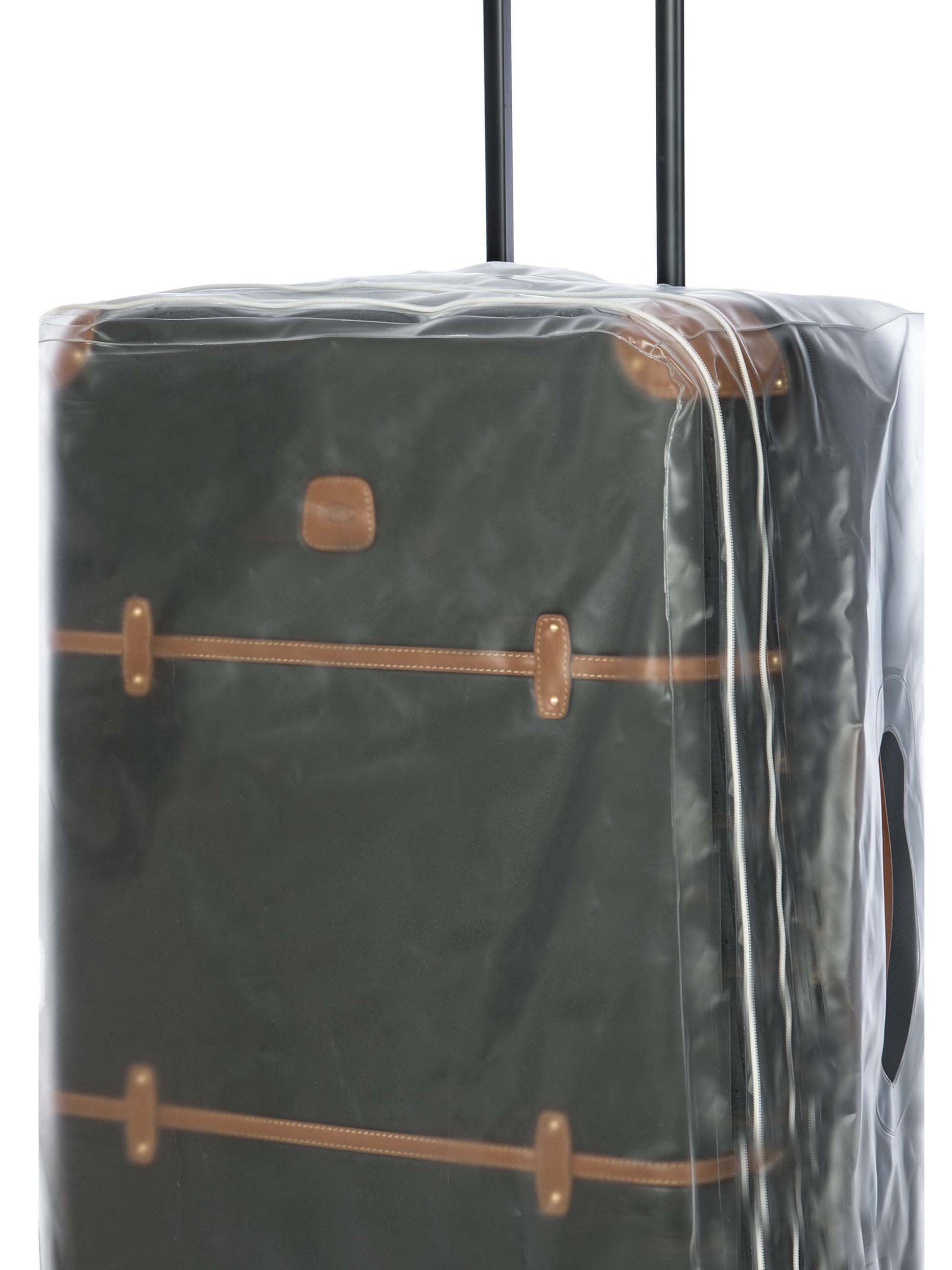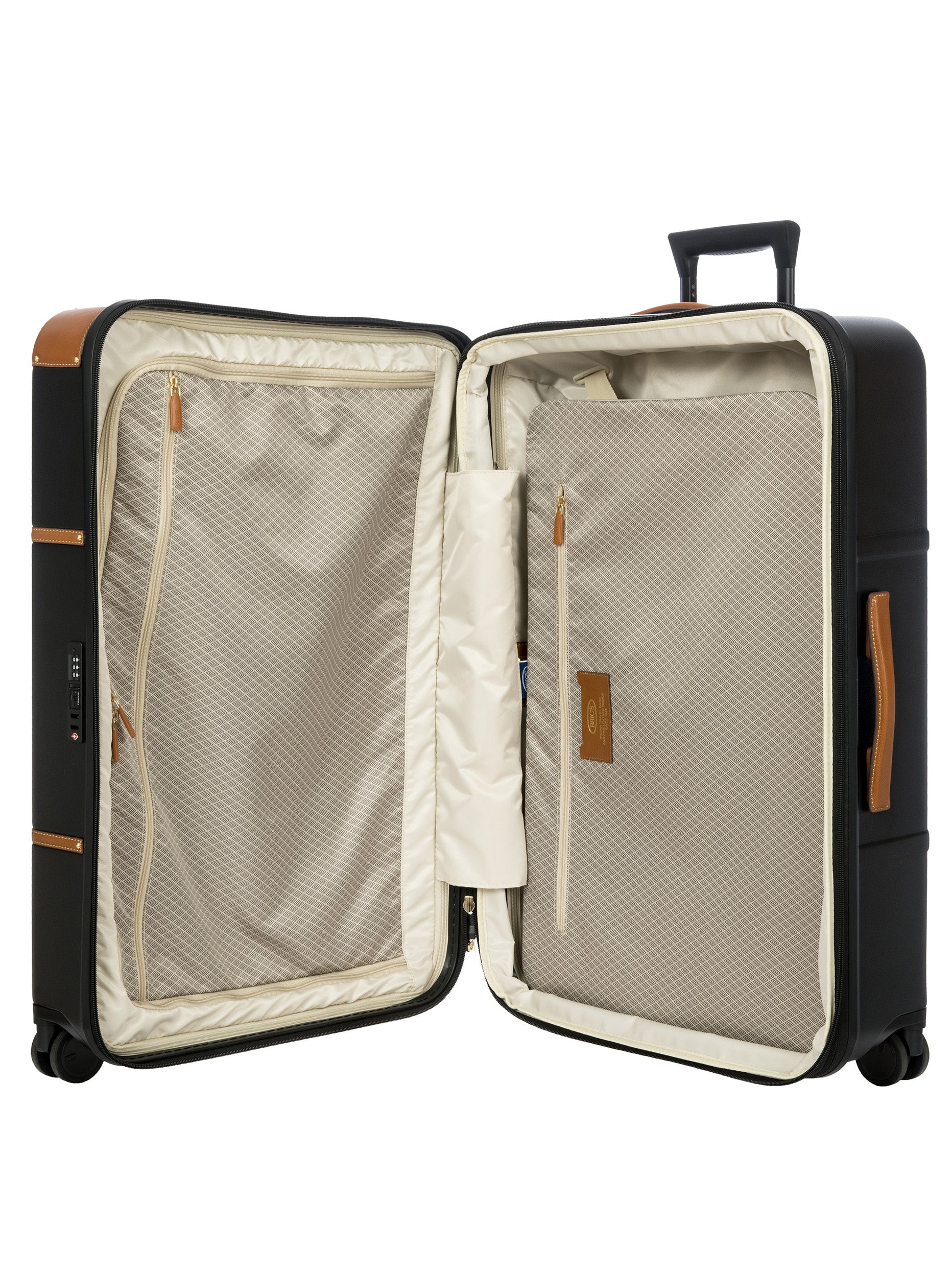 The Bellagio Collection is characterised by unmistakable design, our most iconic yet. This large trolley is made of recycled polycarbonate, a lightweight, flexible material which is ultra durable and impact-resistant. The closure comes with a TSA lock and an ultra-secure zip: this anti-tampering system ensures an optimised level of protection from attempted theft. The inside is complete with a compression system, divided into two compartments to ensure the effective organisation of all your items. Moreover, the expandable zip closure makes it possible to increase its capacity. The lining is easily removed thanks to a special zip: that way, if needed, it can be washed separately. To ensure comfort and ease of use, the retractable handle is made up of robust, sturdy aluminium tubes with intermediate stop positions so that its height can be adjusted as needed, and an ergonomic grip. The four double wheels move quietly and rotate a full 360° for guaranteed manoeuvrability, equipped with ball bearings that create a smooth ride. Moreover, the wheels are recessed in the shell, thereby increasing the capacity of the trolley. Bric’s distinctive real leather accents trim the outside of the Bellagio trolley, complemented by refined logo details. The leather address tag carrier is an essential finishing touch. To better organize the suitcase, the hanger set and the garment bag in fabric can be purchased separately. Transparent cover included.