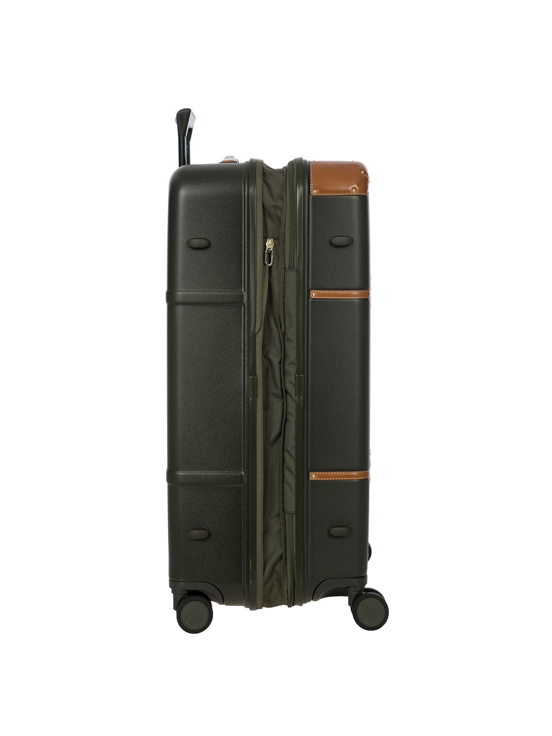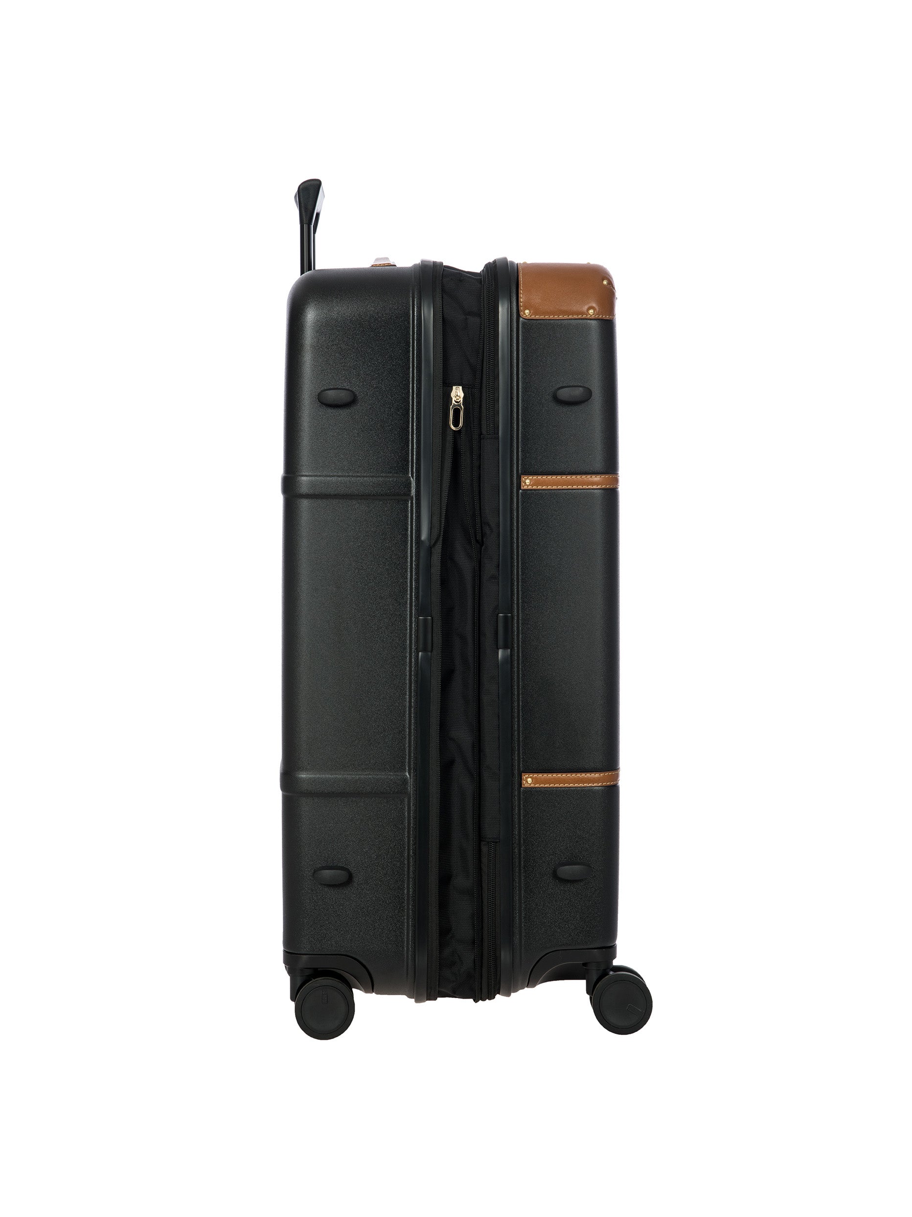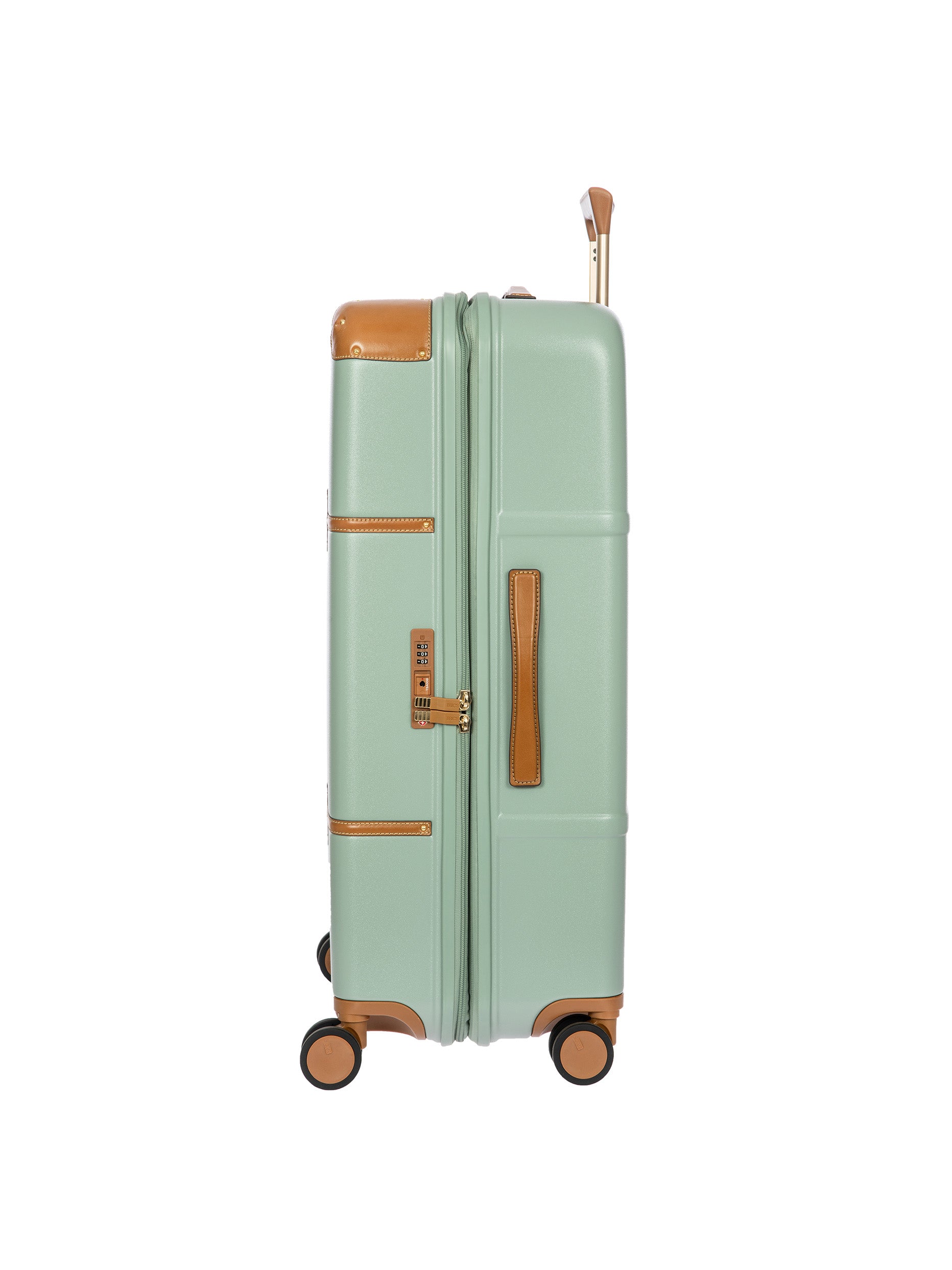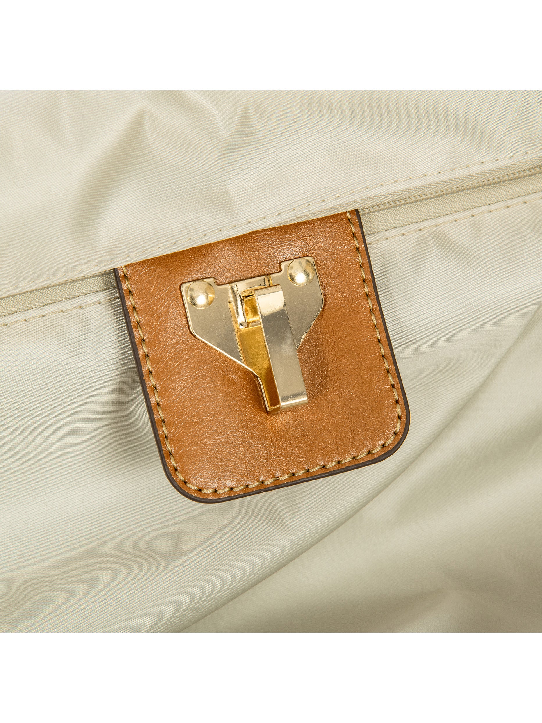 The Bellagio Collection is characterised by unmistakable design, our most iconic yet. This large trolley is made of recycled polycarbonate, a lightweight, flexible material which is ultra durable and impact-resistant. The closure comes with a TSA lock and an ultra-secure zip: this anti-tampering system ensures an optimised level of protection from attempted theft. The inside is complete with a compression system, divided into two compartments to ensure the effective organisation of all your items. Moreover, the expandable zip closure makes it possible to increase its capacity. The lining is easily removed thanks to a special zip: that way, if needed, it can be washed separately. To ensure comfort and ease of use, the retractable handle is made up of robust, sturdy aluminium tubes with intermediate stop positions so that its height can be adjusted as needed, and an ergonomic grip. The four double wheels move quietly and rotate a full 360° for guaranteed manoeuvrability, equipped with ball bearings that create a smooth ride. Moreover, the wheels are recessed in the shell, thereby increasing the capacity of the trolley. Bric’s distinctive real leather accents trim the outside of the Bellagio trolley, complemented by refined logo details. The leather address tag carrier is an essential finishing touch. To better organize the suitcase, the hanger set and the garment bag in fabric can be purchased separately. Transparent cover included.