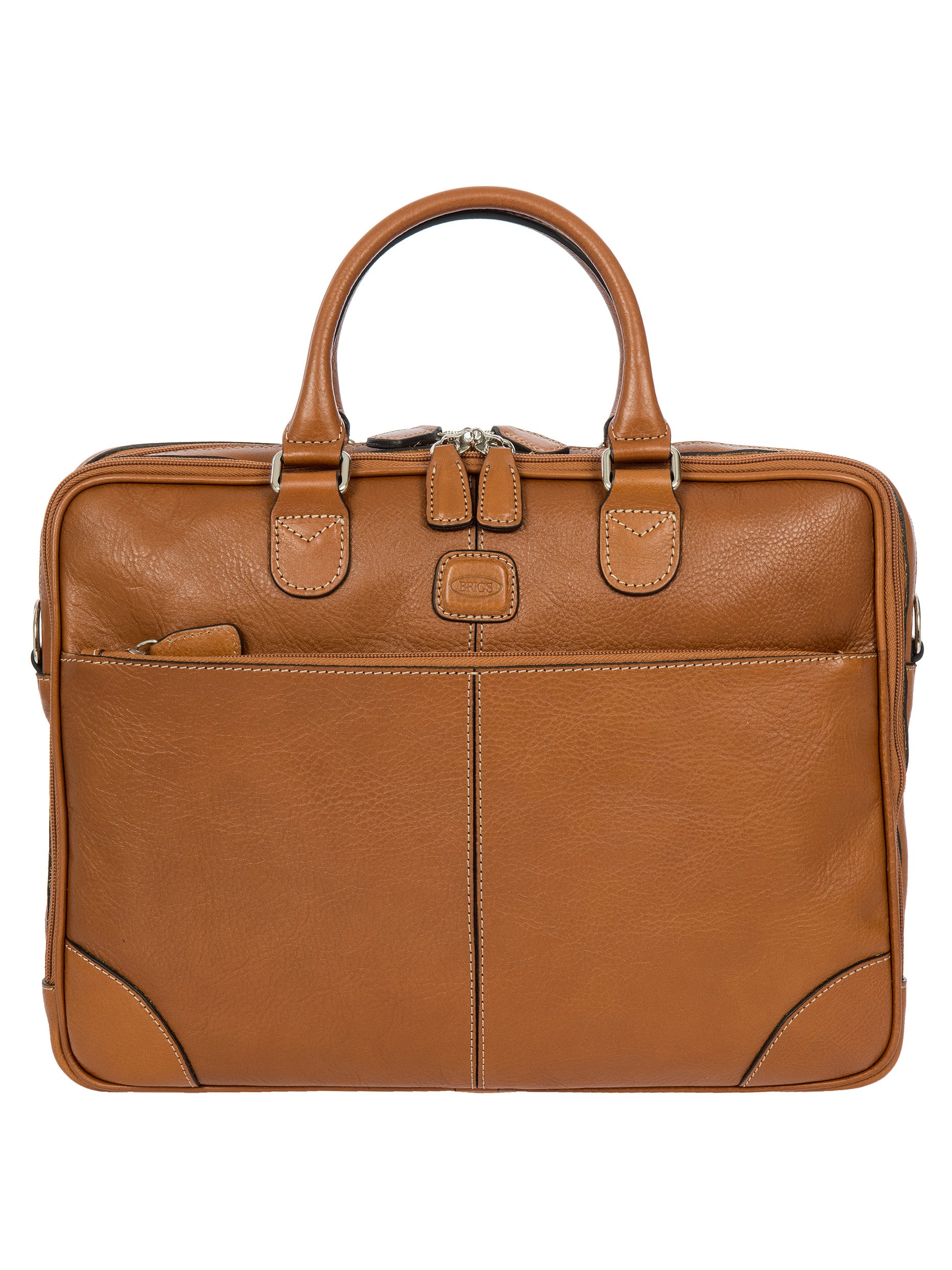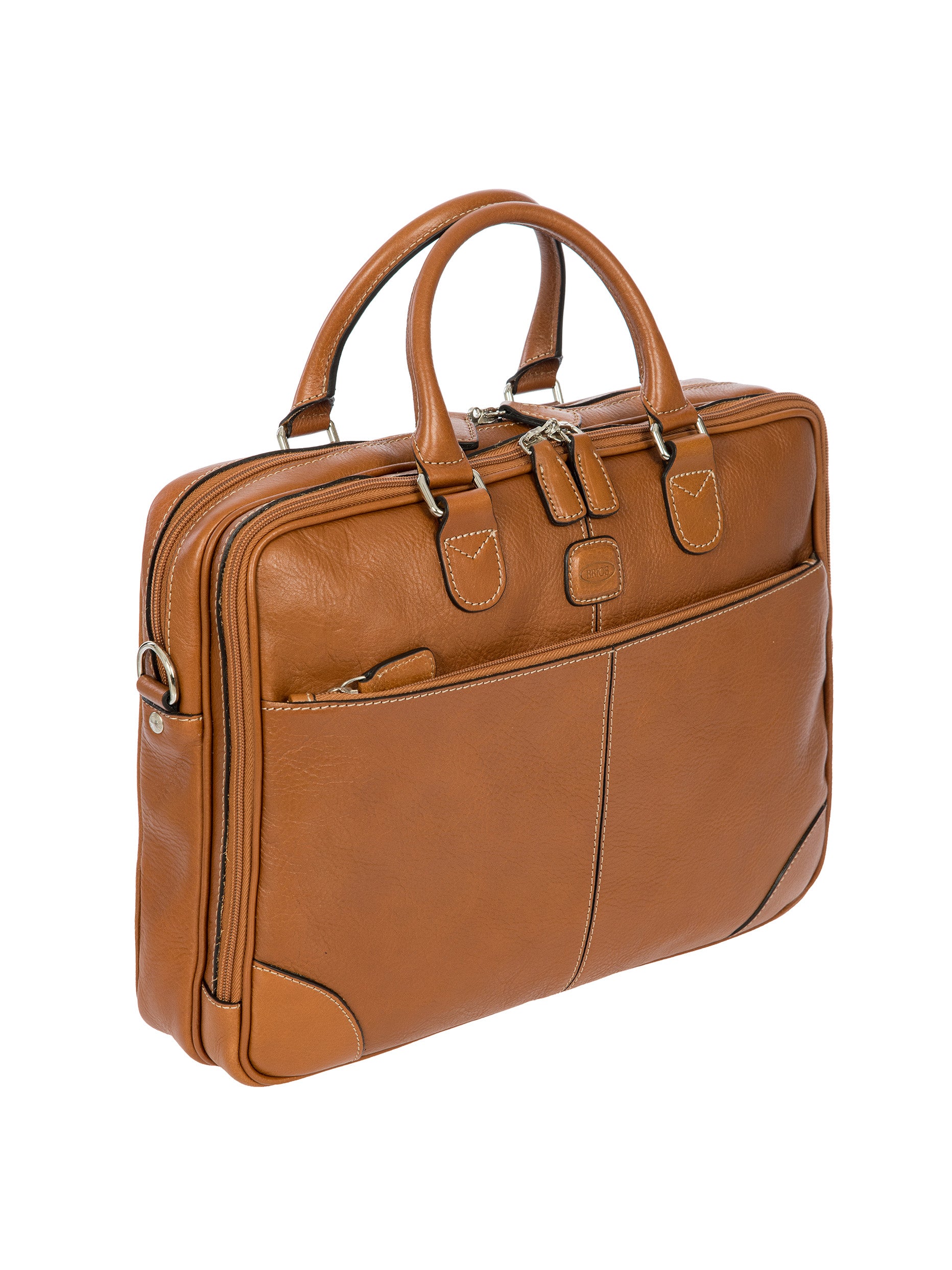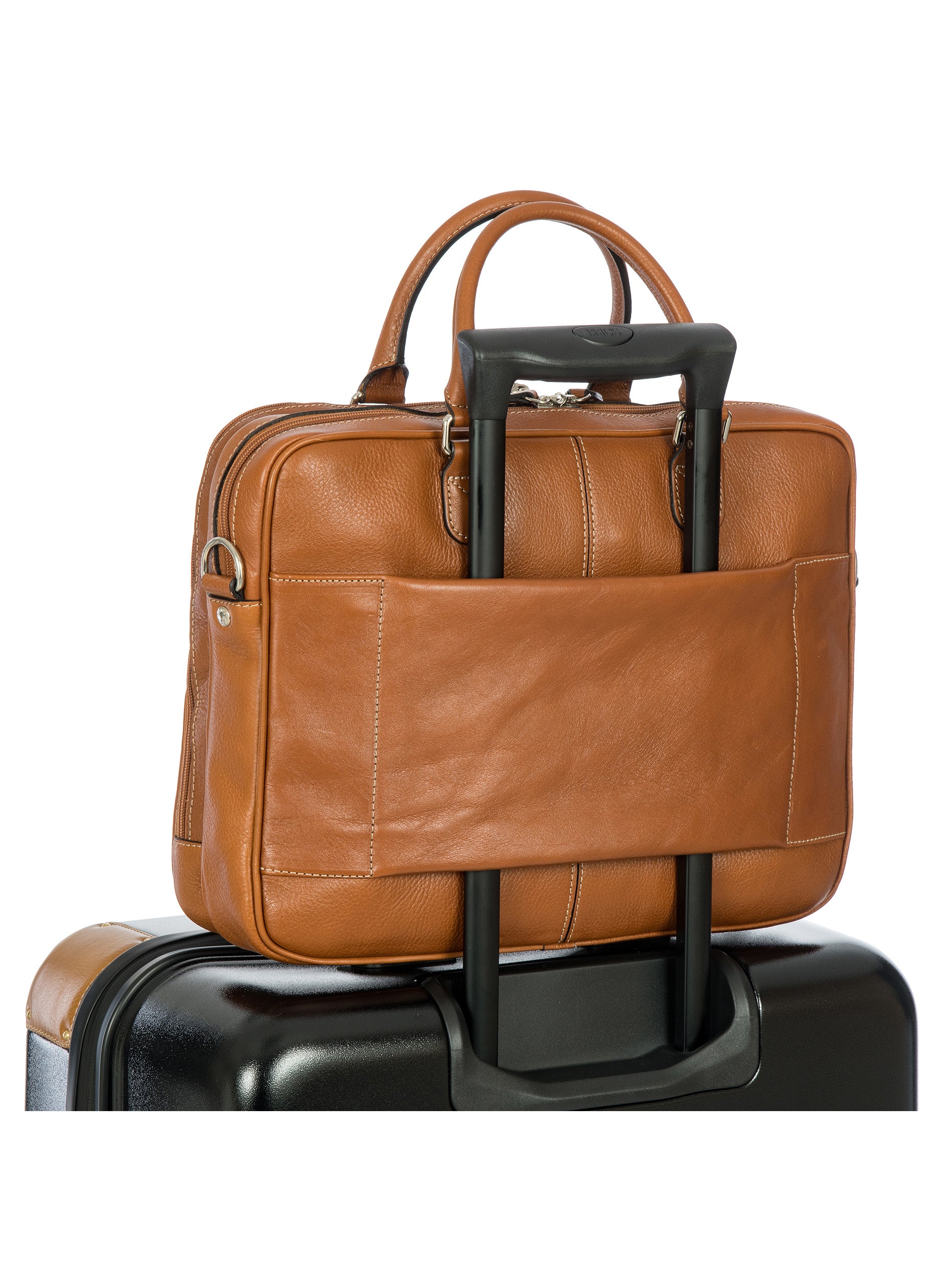 Life Pelle collection briefcase made entirely in fine, vegetable tanned Tuscan leather EXTERIOR: two zipped compartments and two handles, a strap on the back with a zipped pocket that can be used to attach the laptop briefcase to the trolley handle, making it easy to carry. INTERIOR: compartment equipped with two small pockets that are useful for storing a phone or cables, two business card holders and two pen holders; compartment with a large zipped pocket and two large padded pockets with a Velcro fastening for holding a laptop or tablet. Bric's logo customisation on the lining.