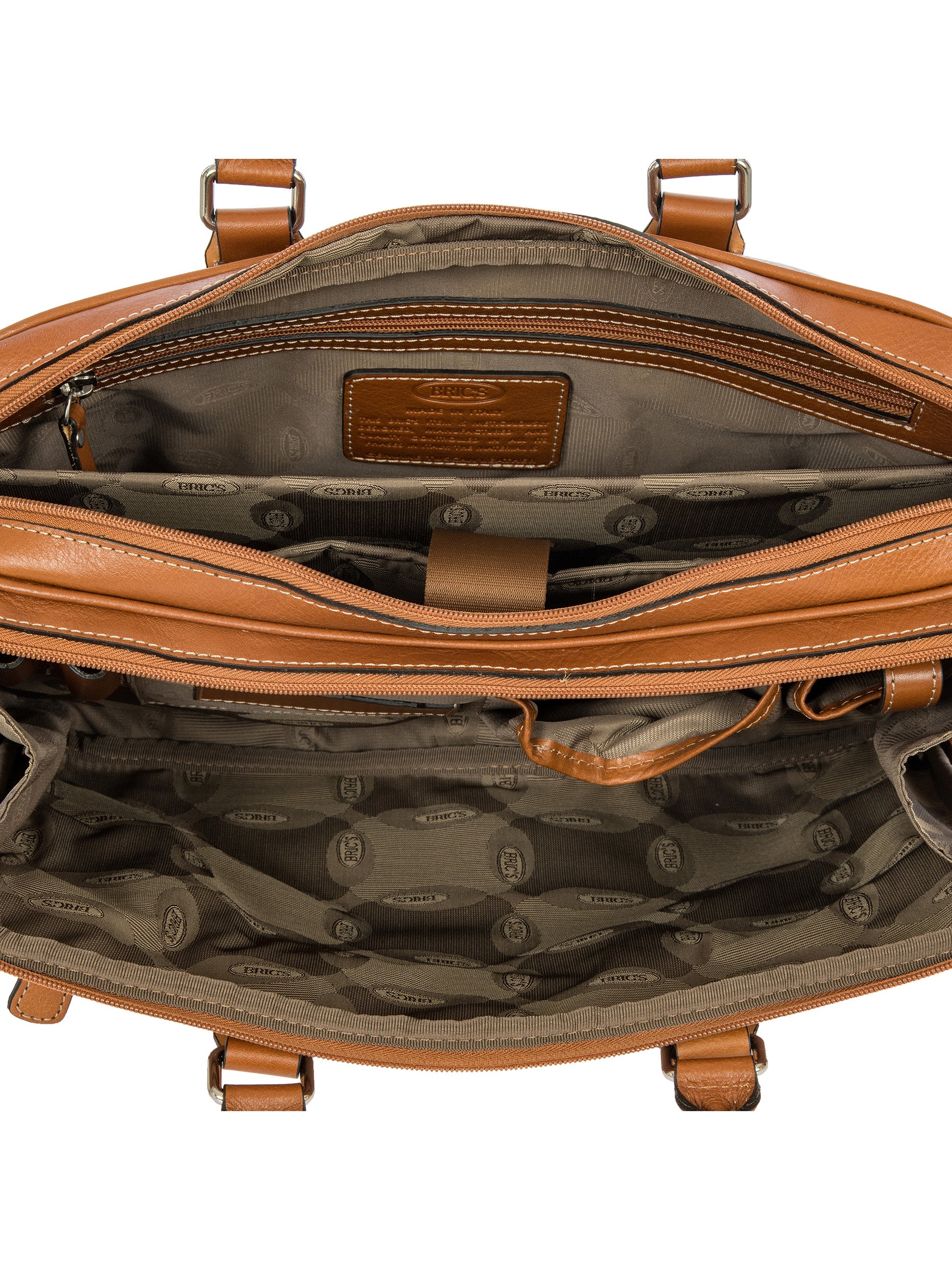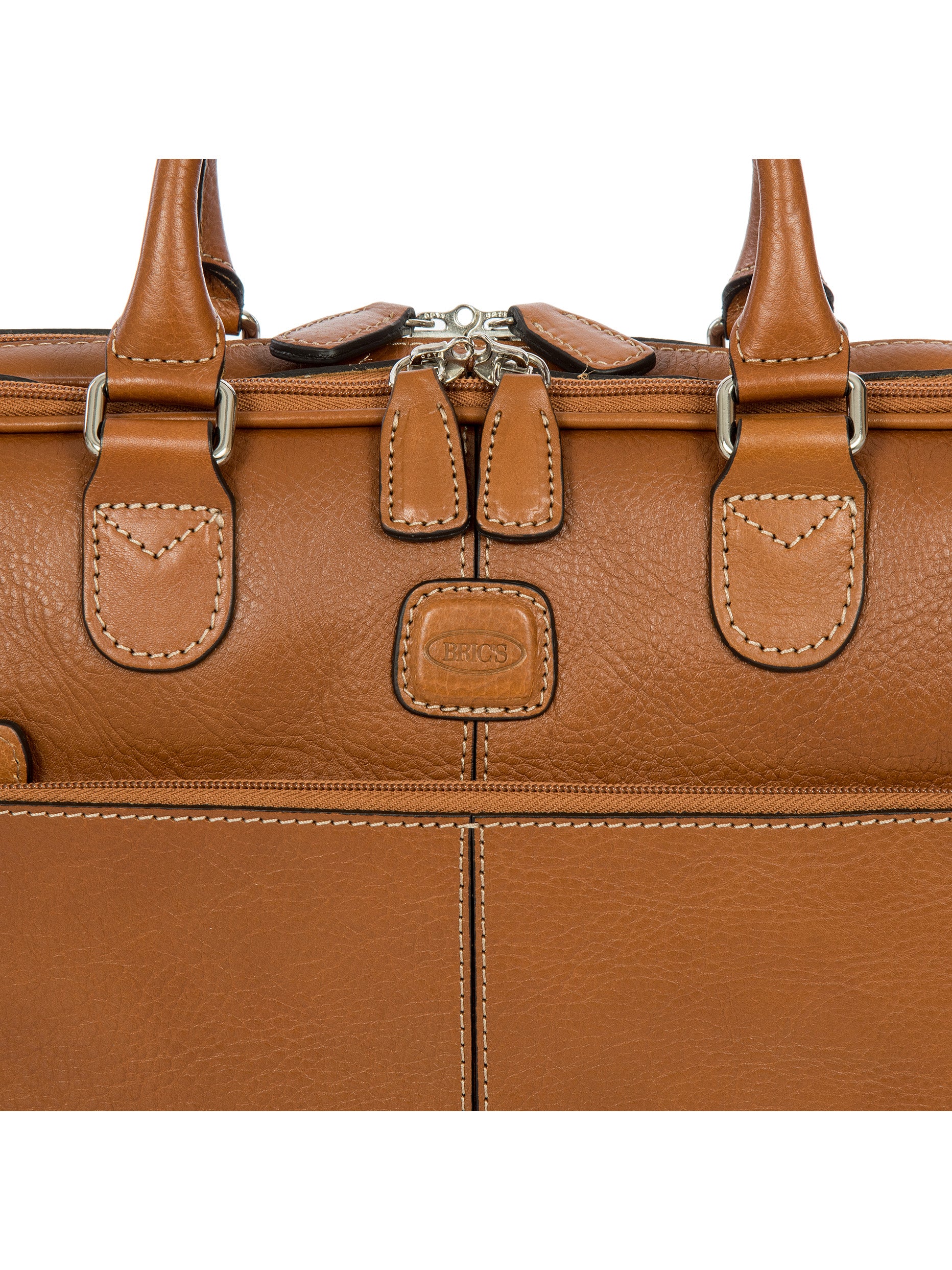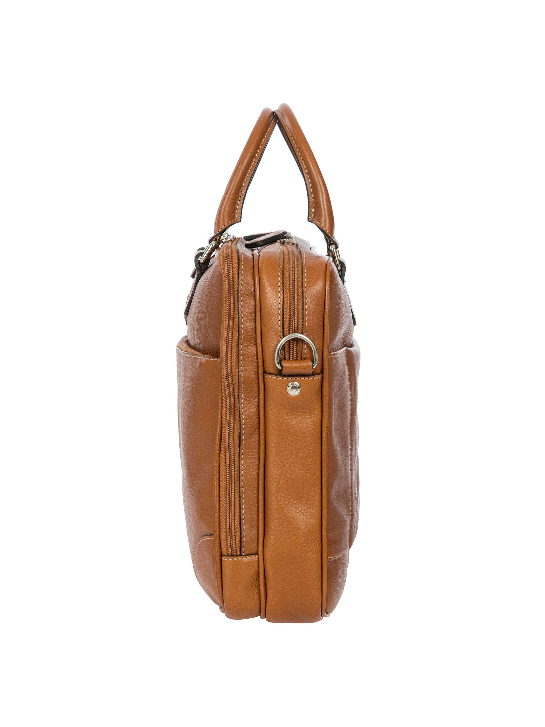 Life Pelle collection briefcase made entirely in fine, vegetable tanned Tuscan leather EXTERIOR: two zipped compartments and two handles, a strap on the back with a zipped pocket that can be used to attach the laptop briefcase to the trolley handle, making it easy to carry. INTERIOR: compartment equipped with two small pockets that are useful for storing a phone or cables, two business card holders and two pen holders; compartment with a large zipped pocket and two large padded pockets with a Velcro fastening for holding a laptop or tablet. Bric's logo customisation on the lining.
