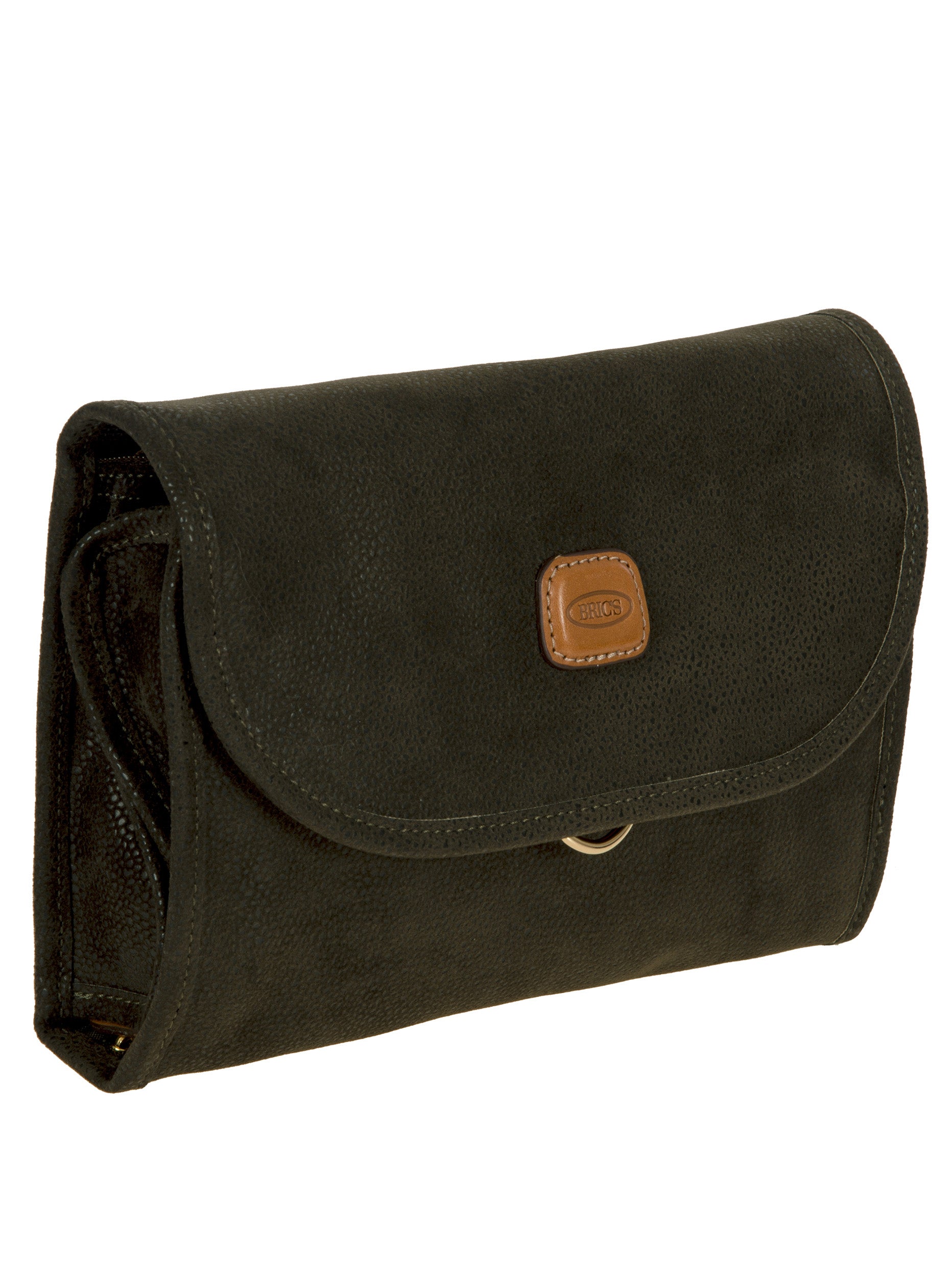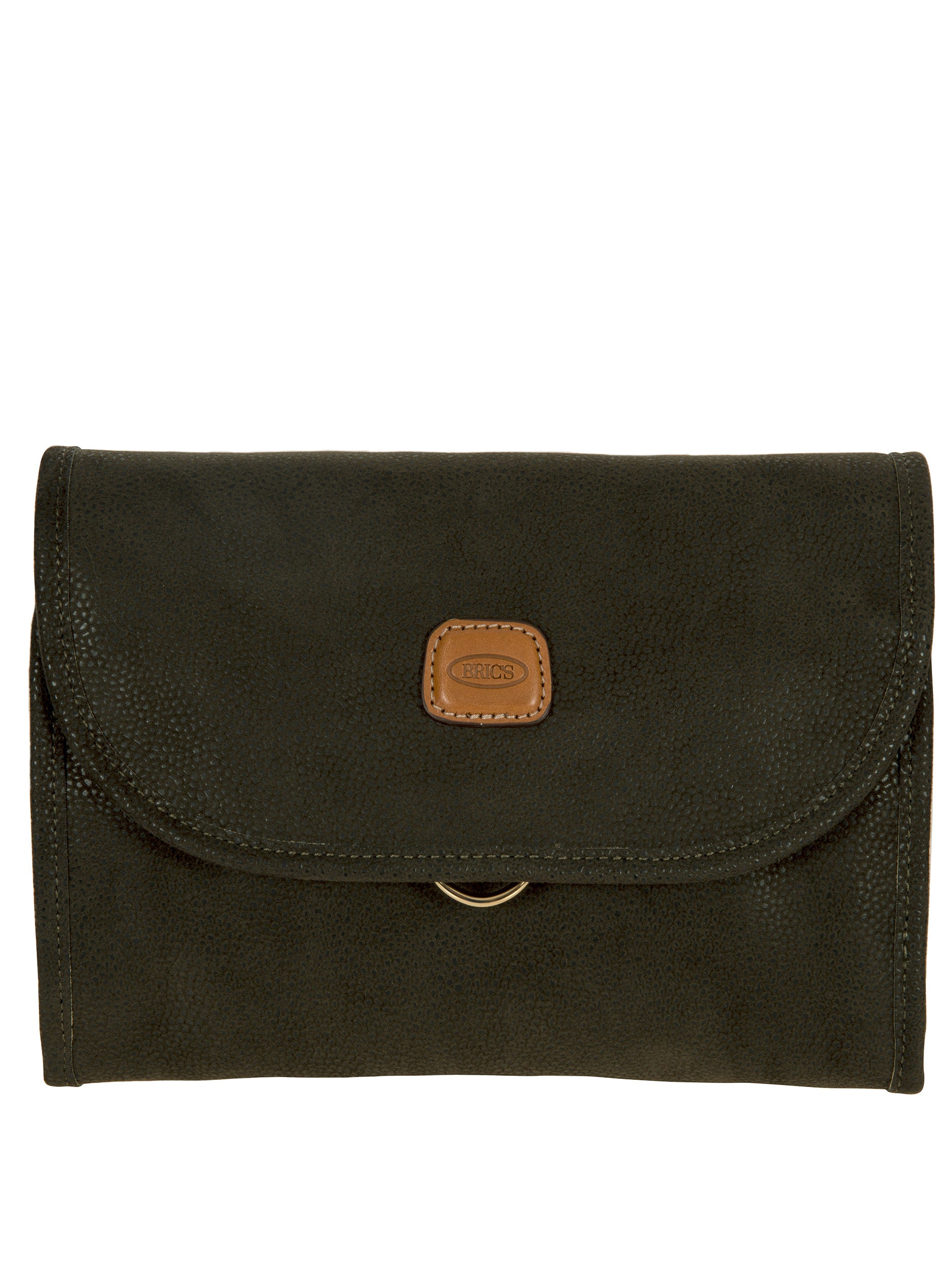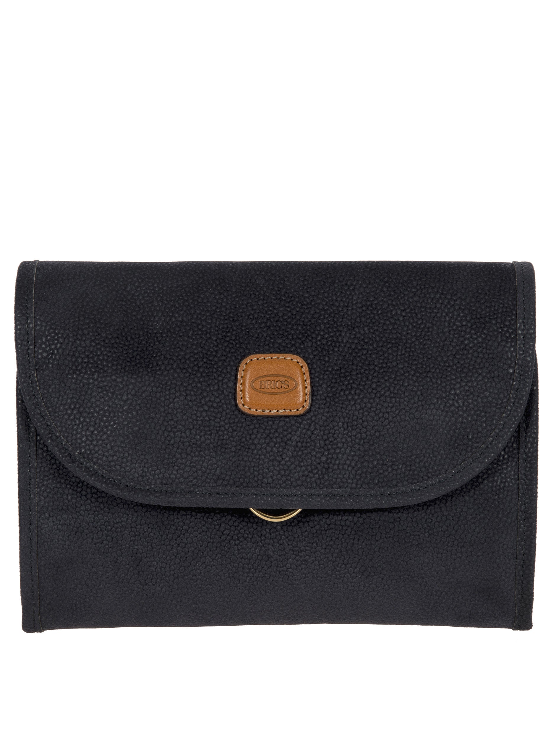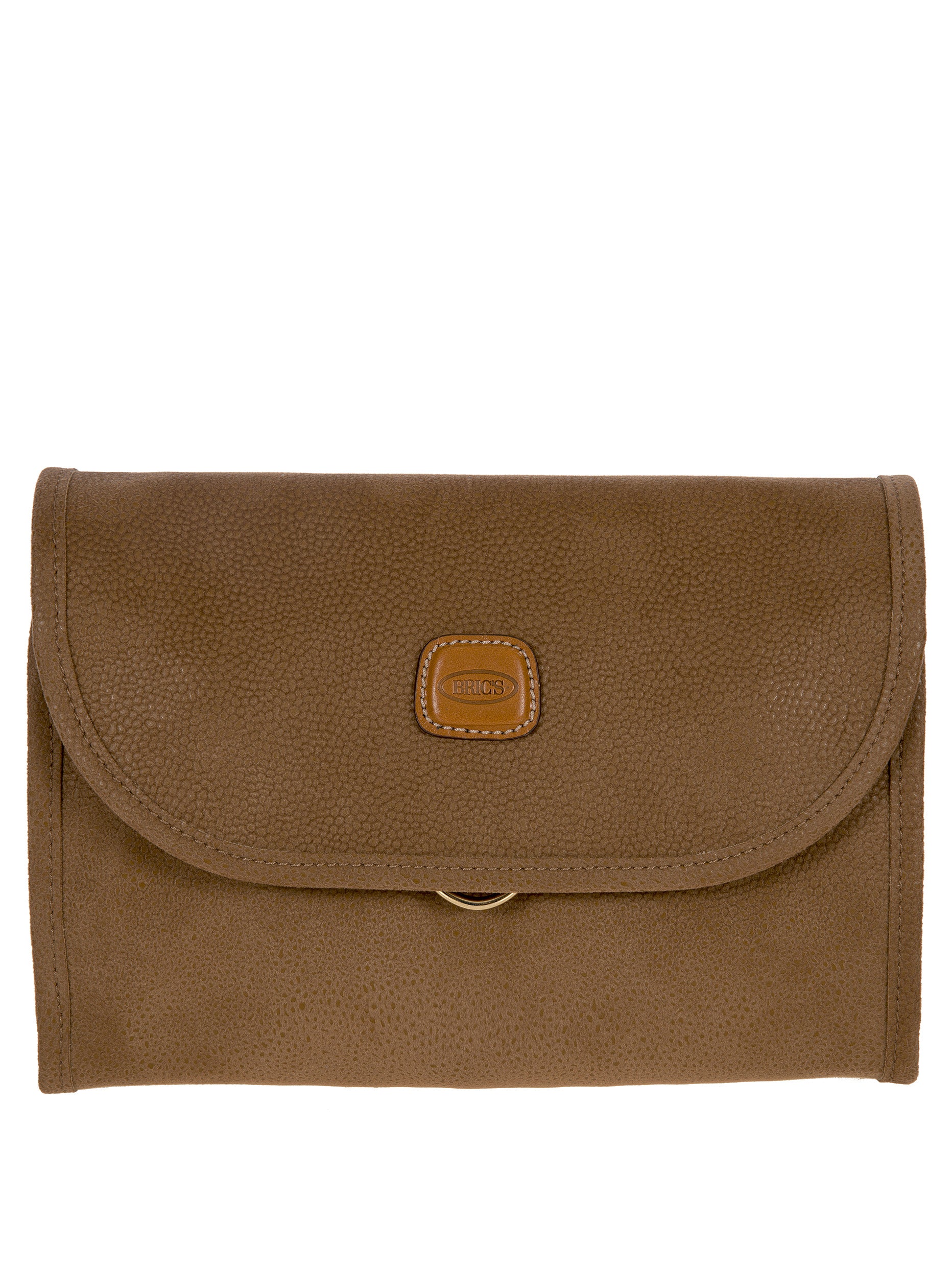 Tri-fold necessaire from Bric's LIFE collection made in durable synthetic material that is a pleasure to touch, thanks to its suede effect surface. It also comes with vegetable tanned Tuscan leather finishes. Complete with every comfort, this overnight case fuses style with practicality and boasts a wrap opening and a hanging hook. EXTERIOR: two magnetic button closures and leather finishes. INTERIOR: two zipped pockets and two transparent open compartments at the top. The practical hook allows it to be hung.
