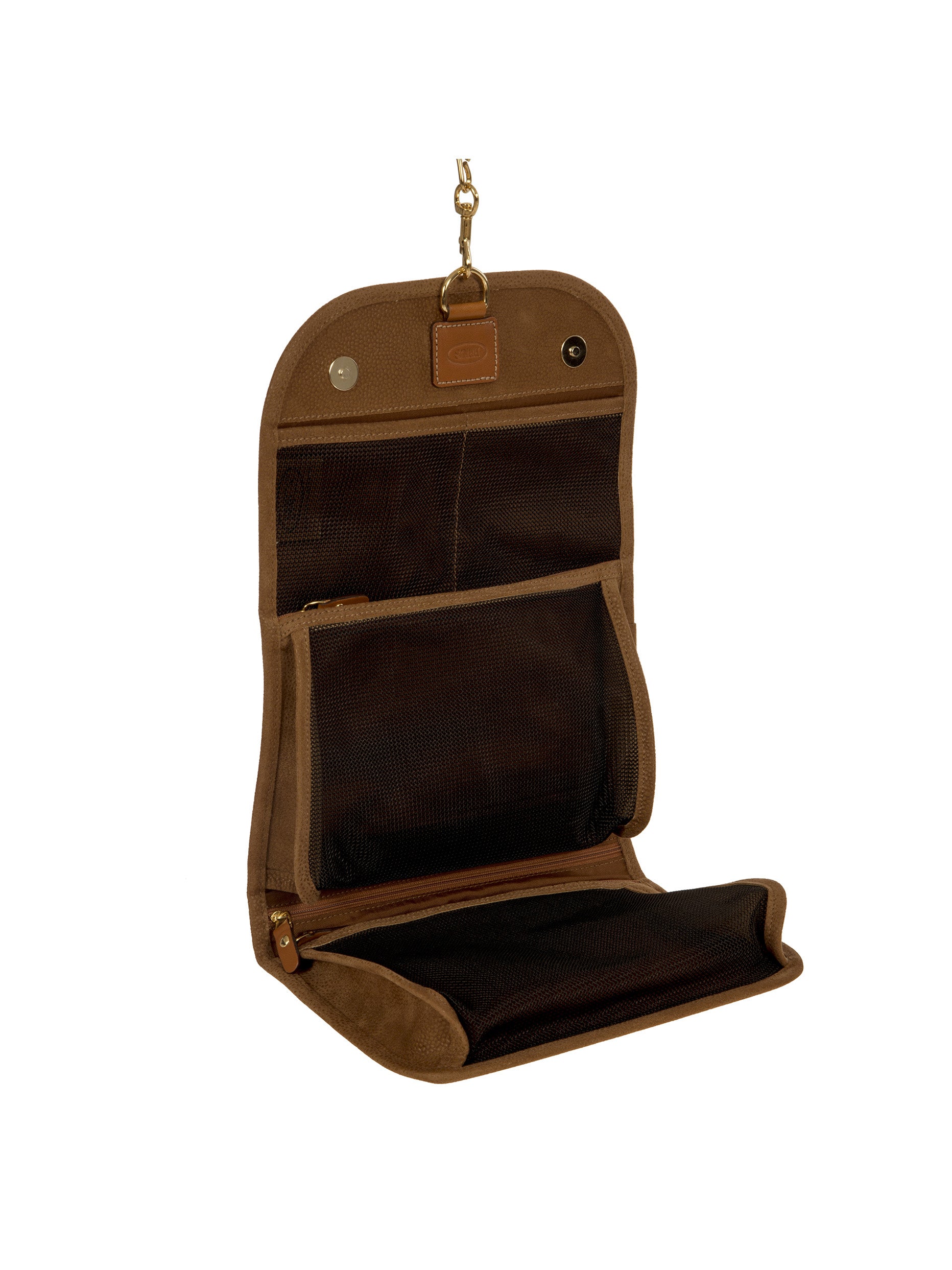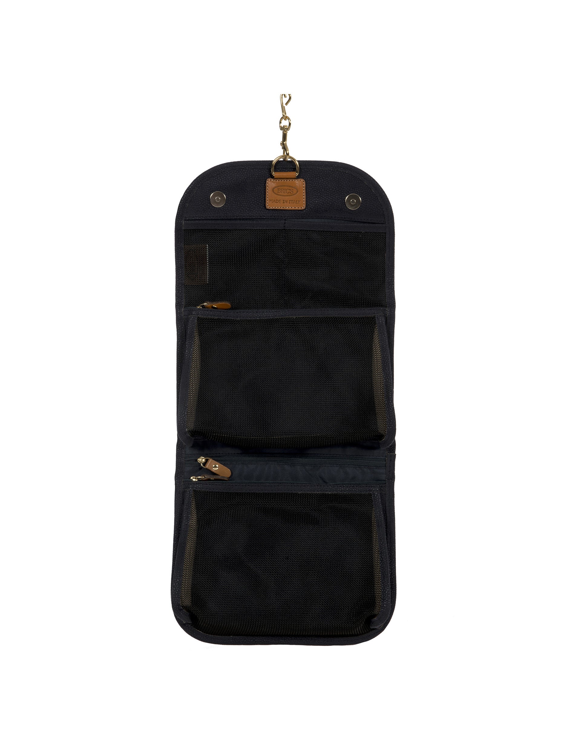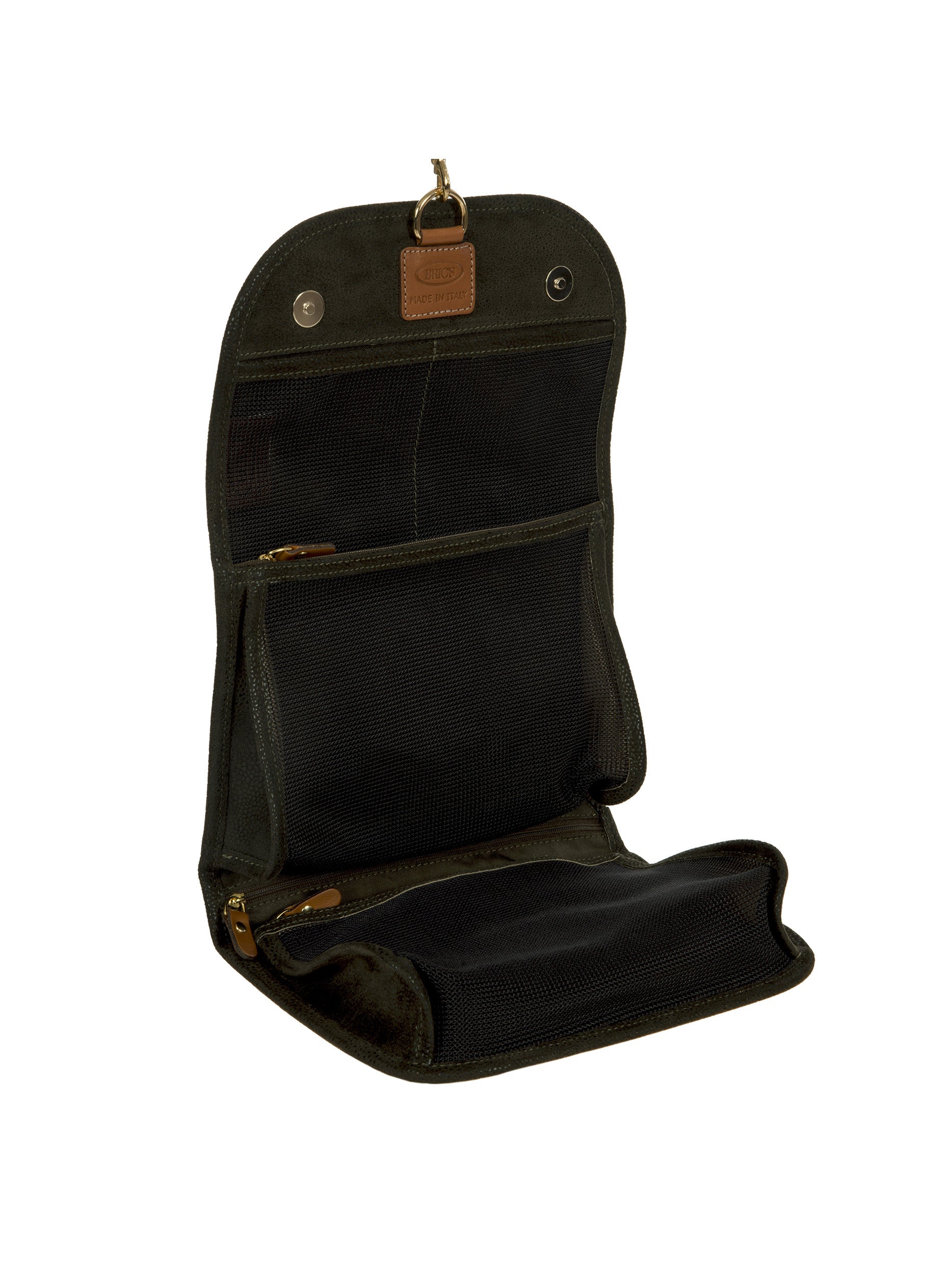 Tri-fold necessaire from Bric's LIFE collection made in durable synthetic material that is a pleasure to touch, thanks to its suede effect surface. It also comes with vegetable tanned Tuscan leather finishes. Complete with every comfort, this overnight case fuses style with practicality and boasts a wrap opening and a hanging hook. EXTERIOR: two magnetic button closures and leather finishes. INTERIOR: two zipped pockets and two transparent open compartments at the top. The practical hook allows it to be hung.