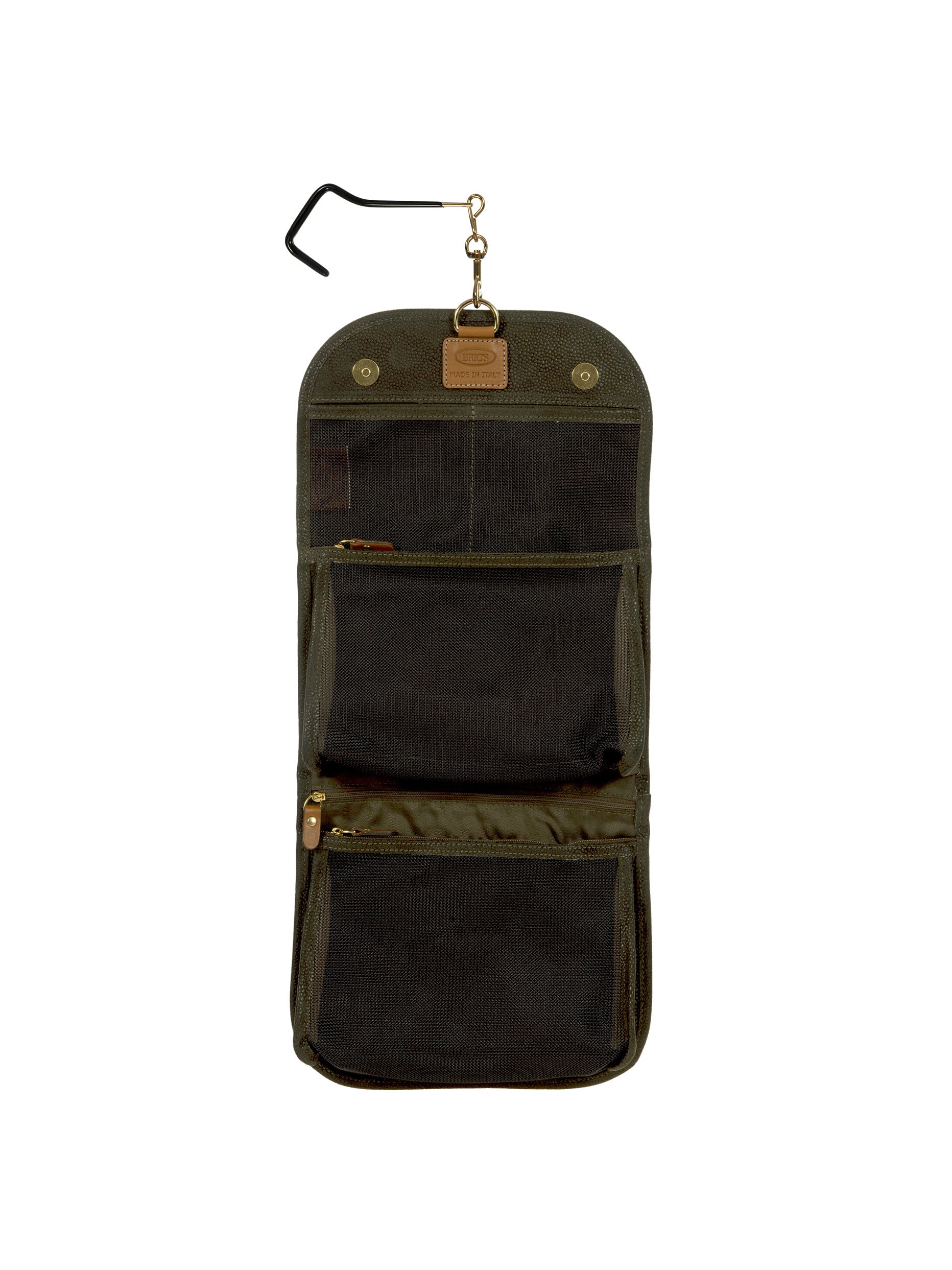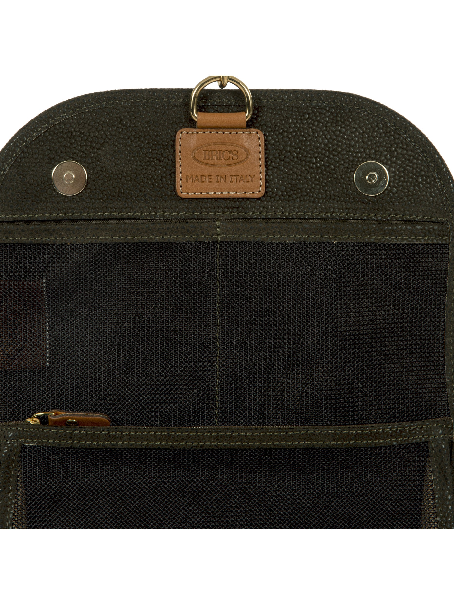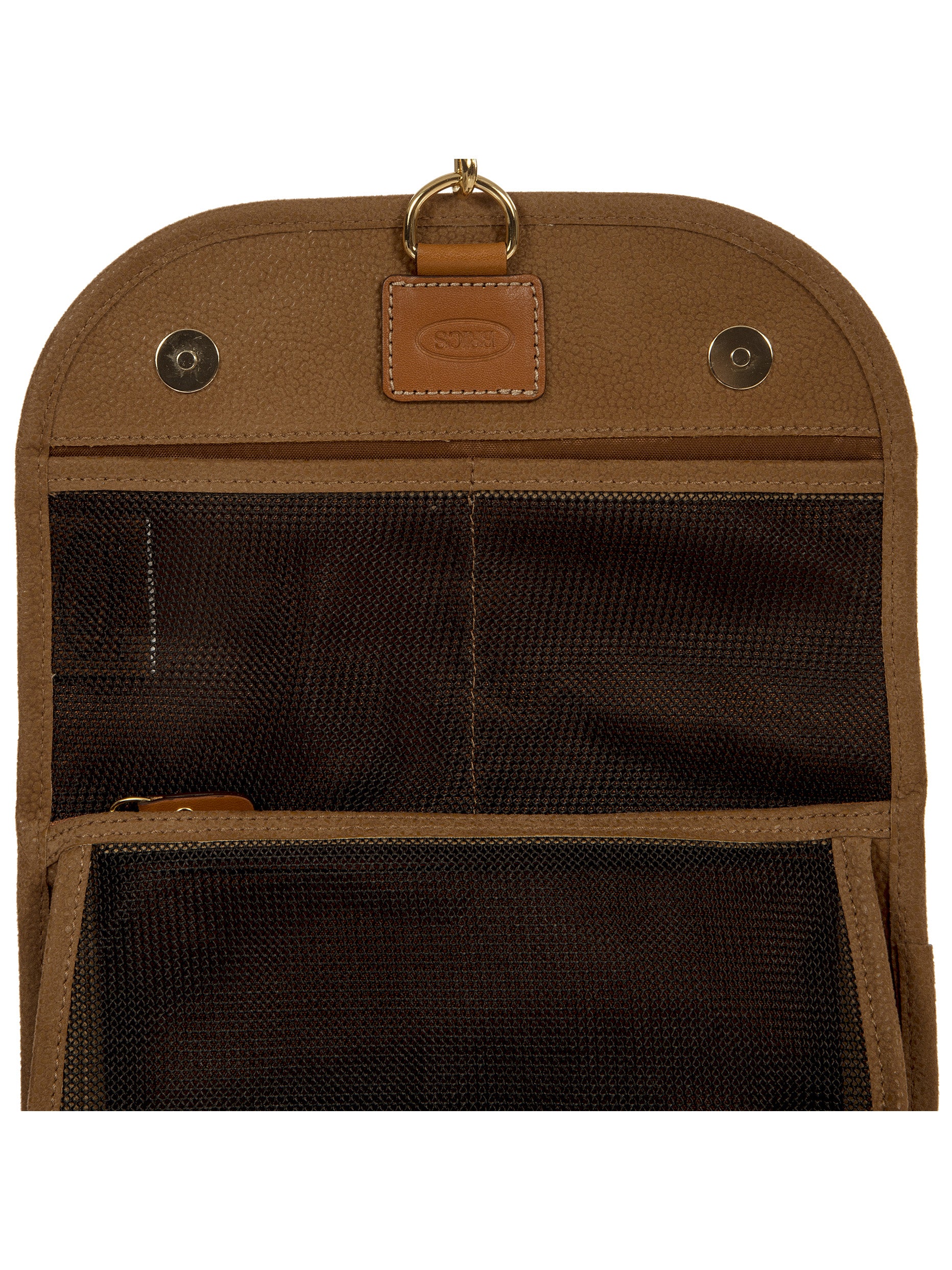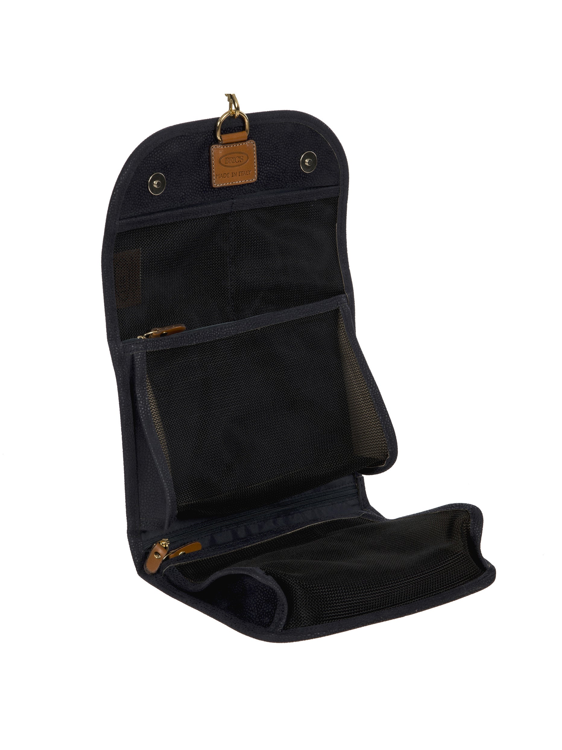 Tri-fold necessaire from Bric's LIFE collection made in durable synthetic material that is a pleasure to touch, thanks to its suede effect surface. It also comes with vegetable tanned Tuscan leather finishes. Complete with every comfort, this overnight case fuses style with practicality and boasts a wrap opening and a hanging hook. EXTERIOR: two magnetic button closures and leather finishes. INTERIOR: two zipped pockets and two transparent open compartments at the top. The practical hook allows it to be hung.