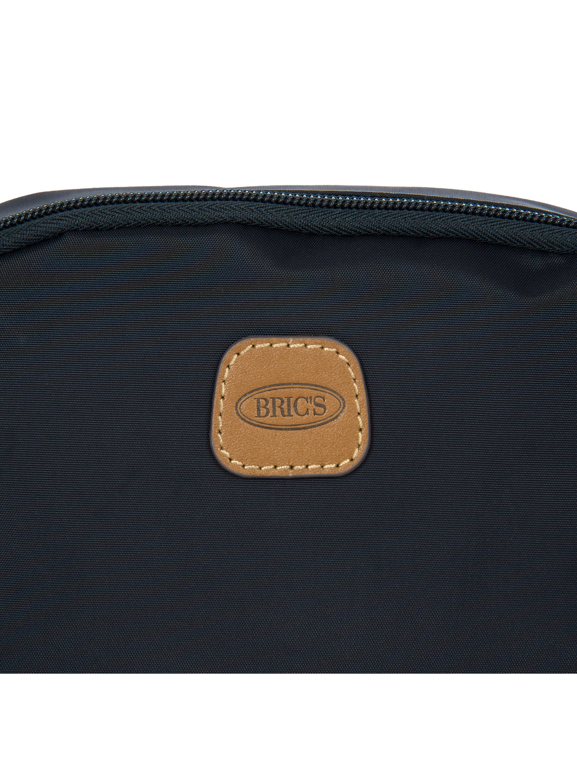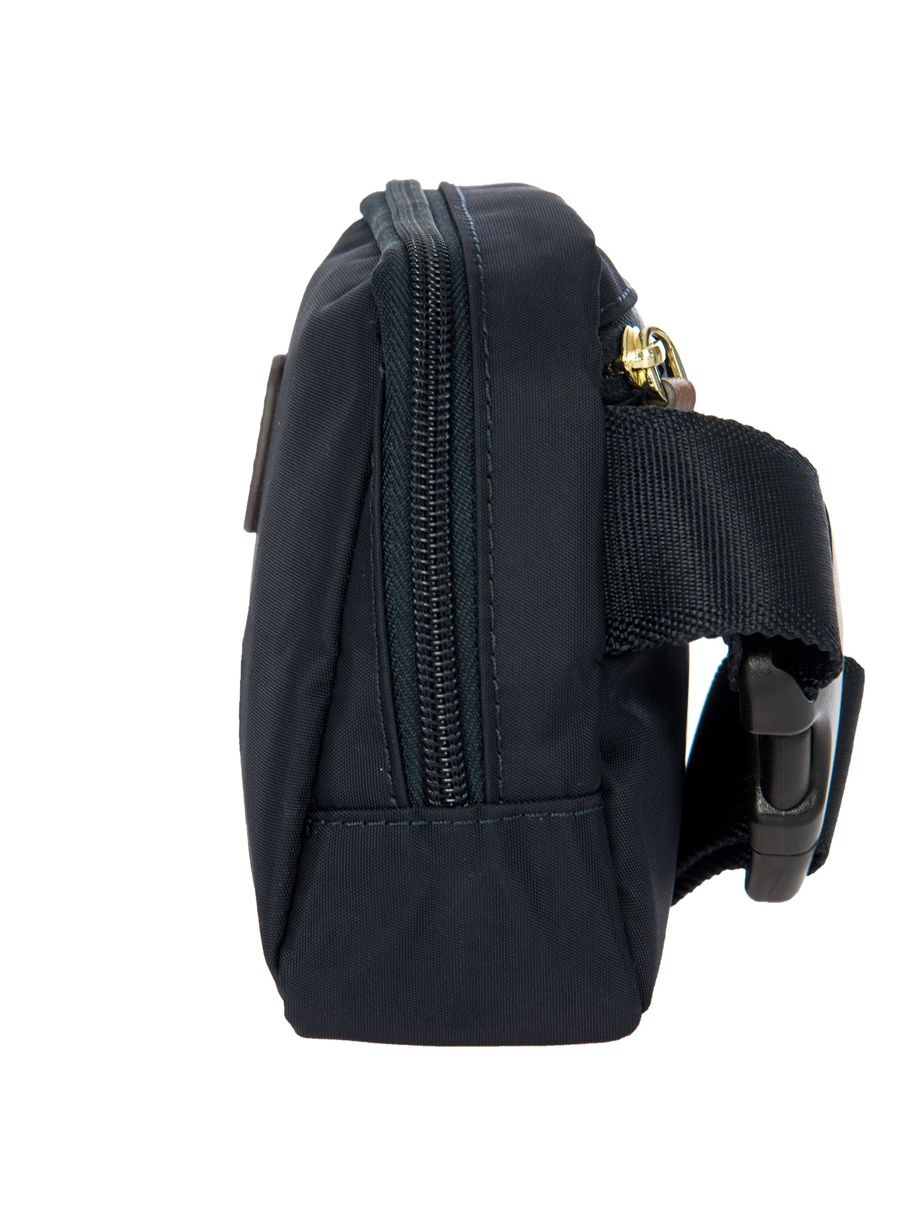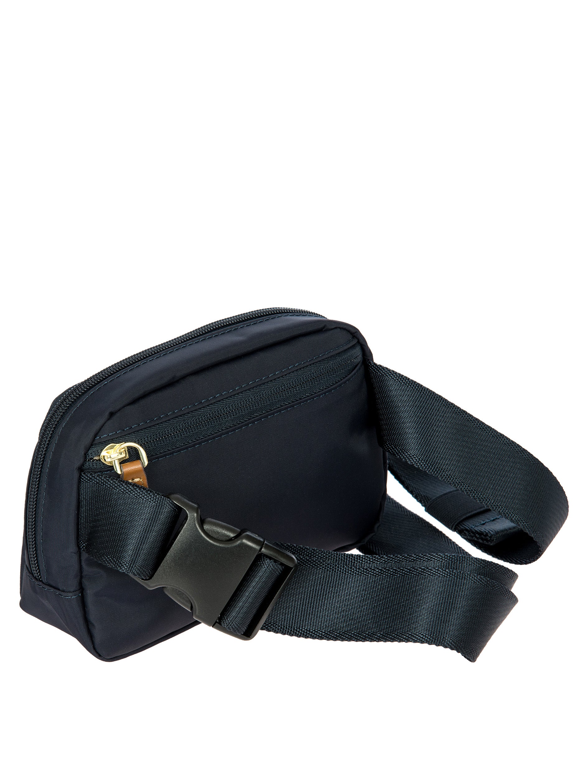 The X-Collection waist bag is made of soft recycled fabric that is water-resistant and robust. The belt buckle is positioned close to the bag for enhanced security and handling. Thanks to the length-adjustable belt, it can be worn over the shoulder or around the waist. After you set the perfect fastening length, tuck away the excess belt in the elastic band. The main compartment is roomy and closed by a zip, while the small zipped pocket on the back is ideal for smaller items. Embellished with genuine leather details, a hallmark of Bric's.