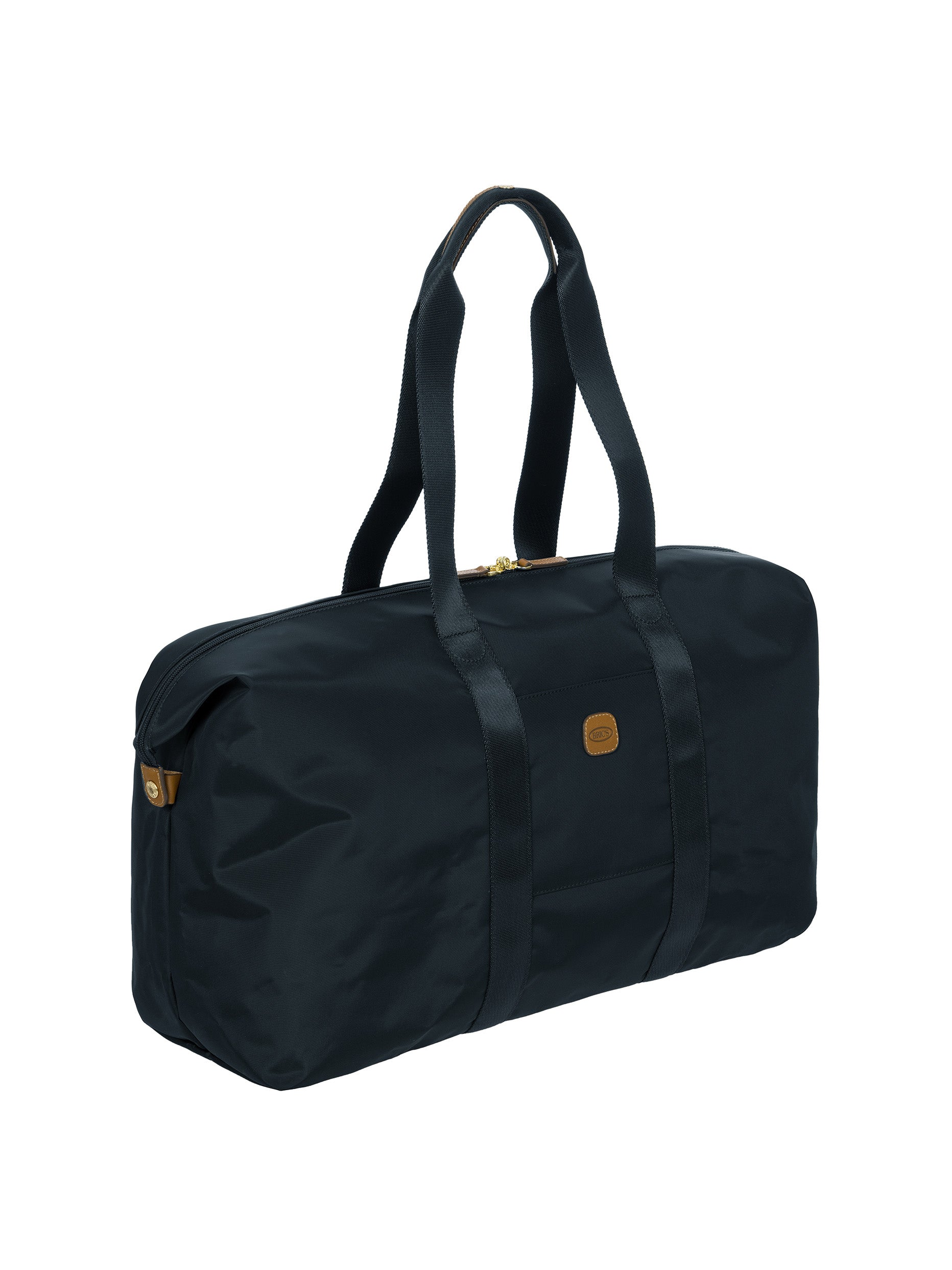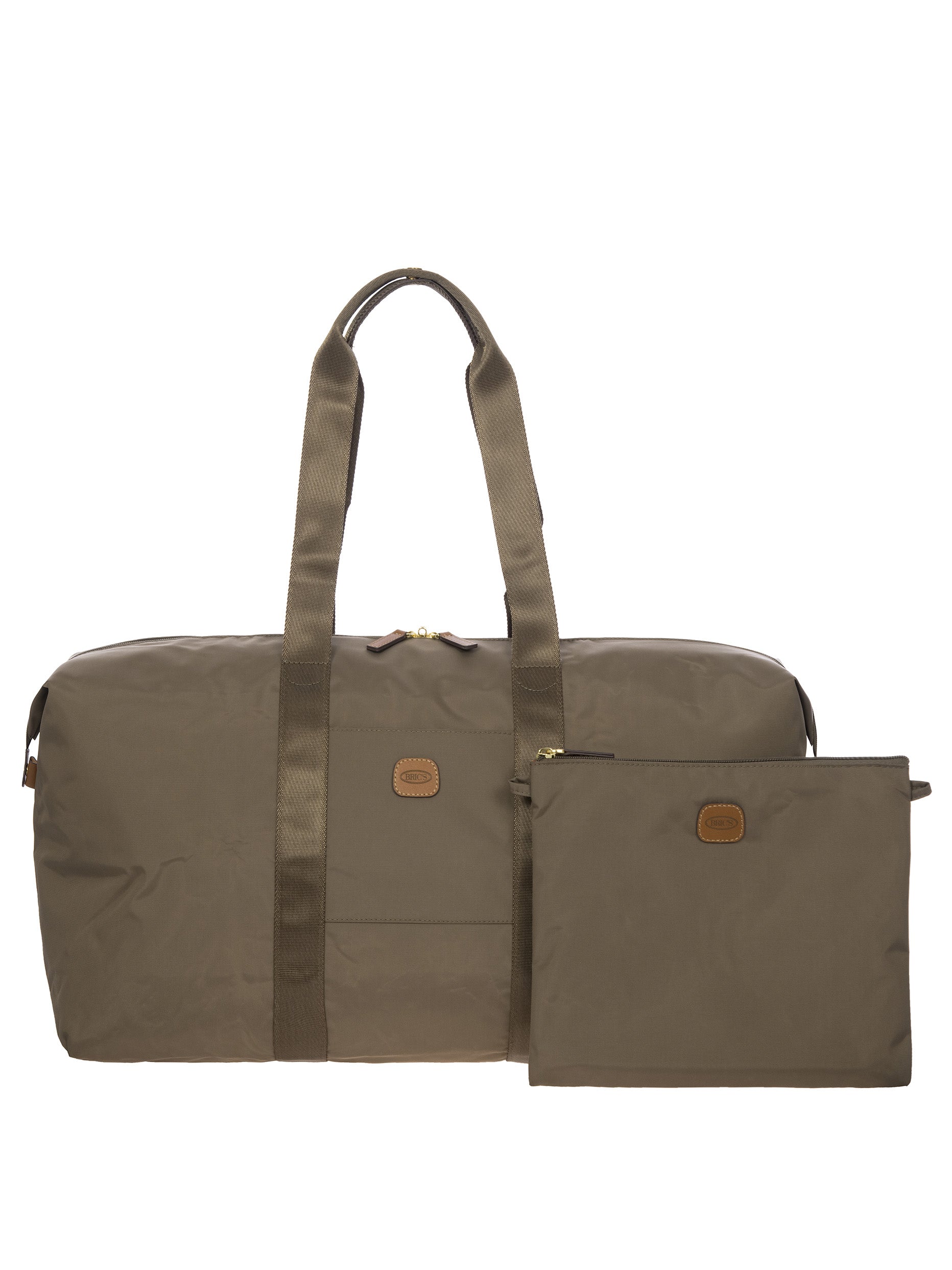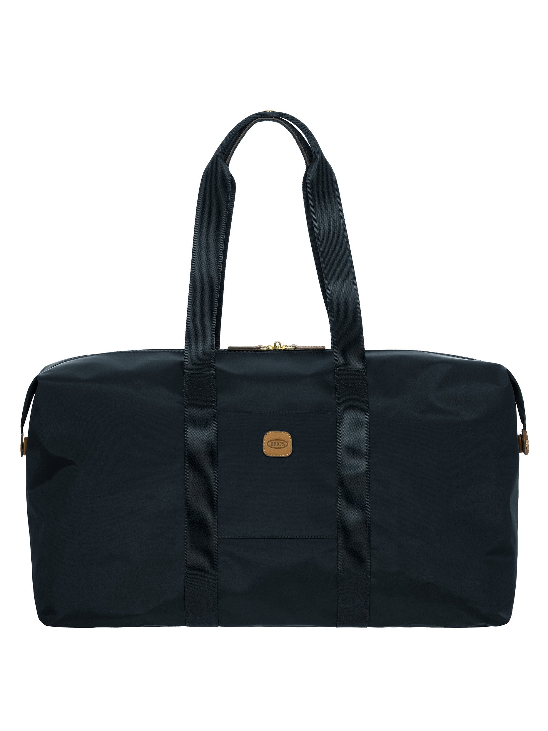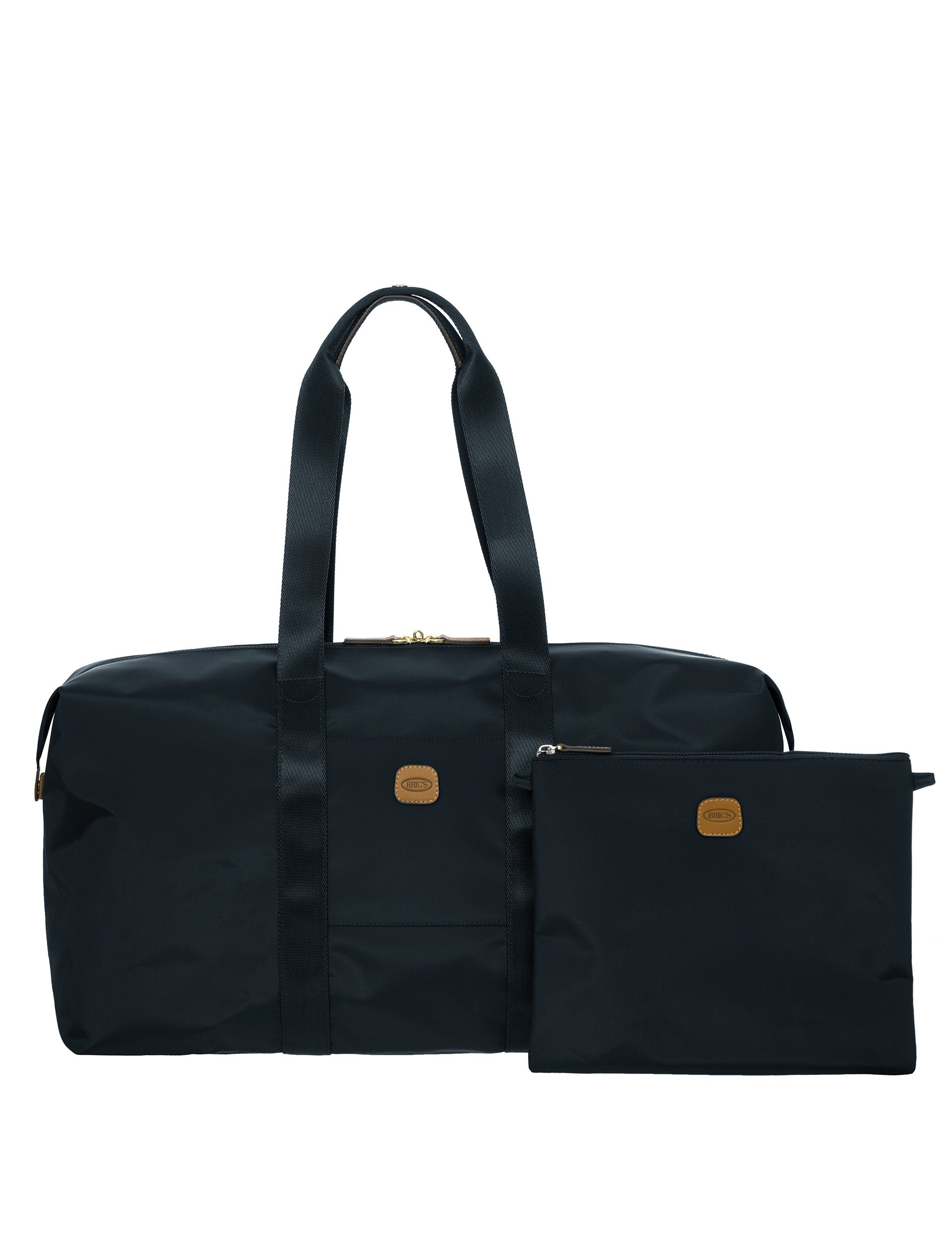 The large 2-in-1 foldable holdall from the X-Collection is made of soft, lightweight and durable recycled fabric, water-resistant. The detachable internal zipped pocket can be used as practical make-up bag or mini bag thanks to the included shoulder strap; the entire holdall can also be folded up and stored inside. This holdall can be carried by hand or on the shoulder using the handles. There is a strap on the back to attach it to a suitcase handle. Its spacious design makes it particularly practical. The main compartment is equipped with a zip with two sliders. Embellished with genuine leather details, one of Bric's signature design elements.