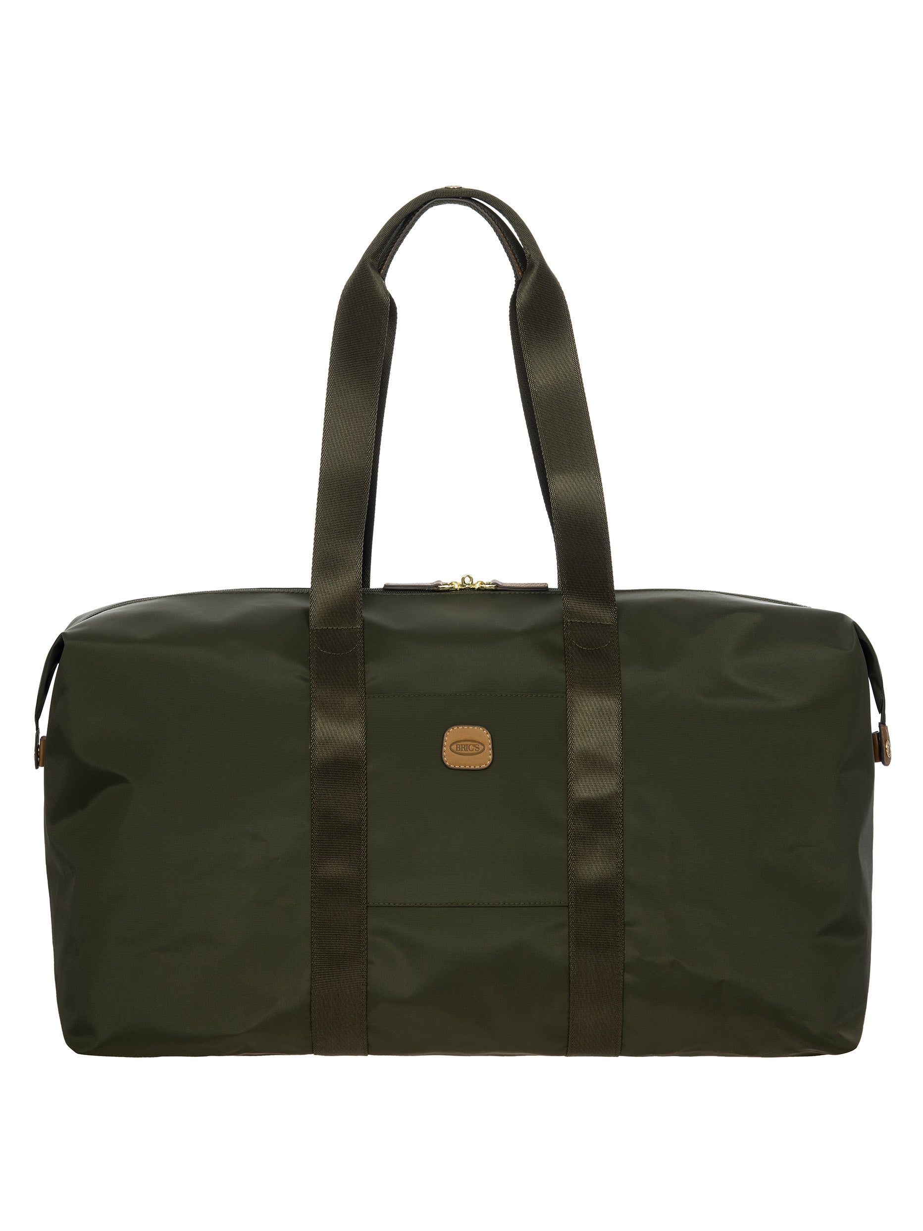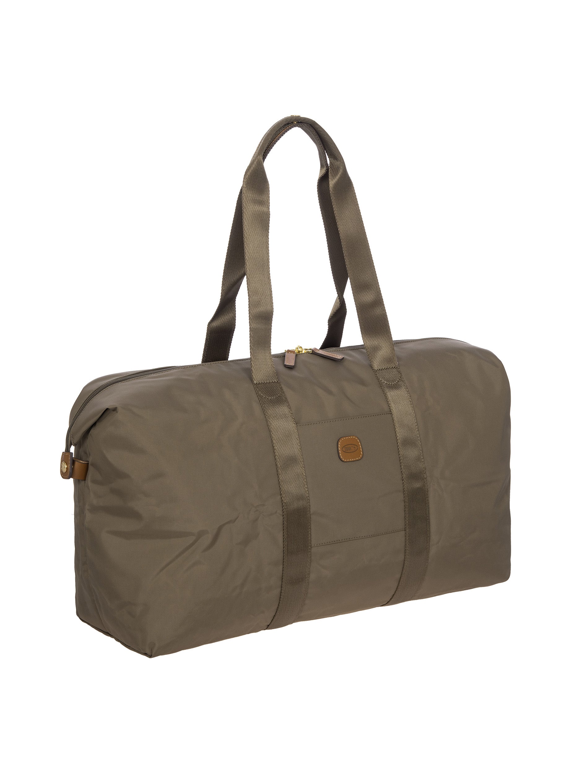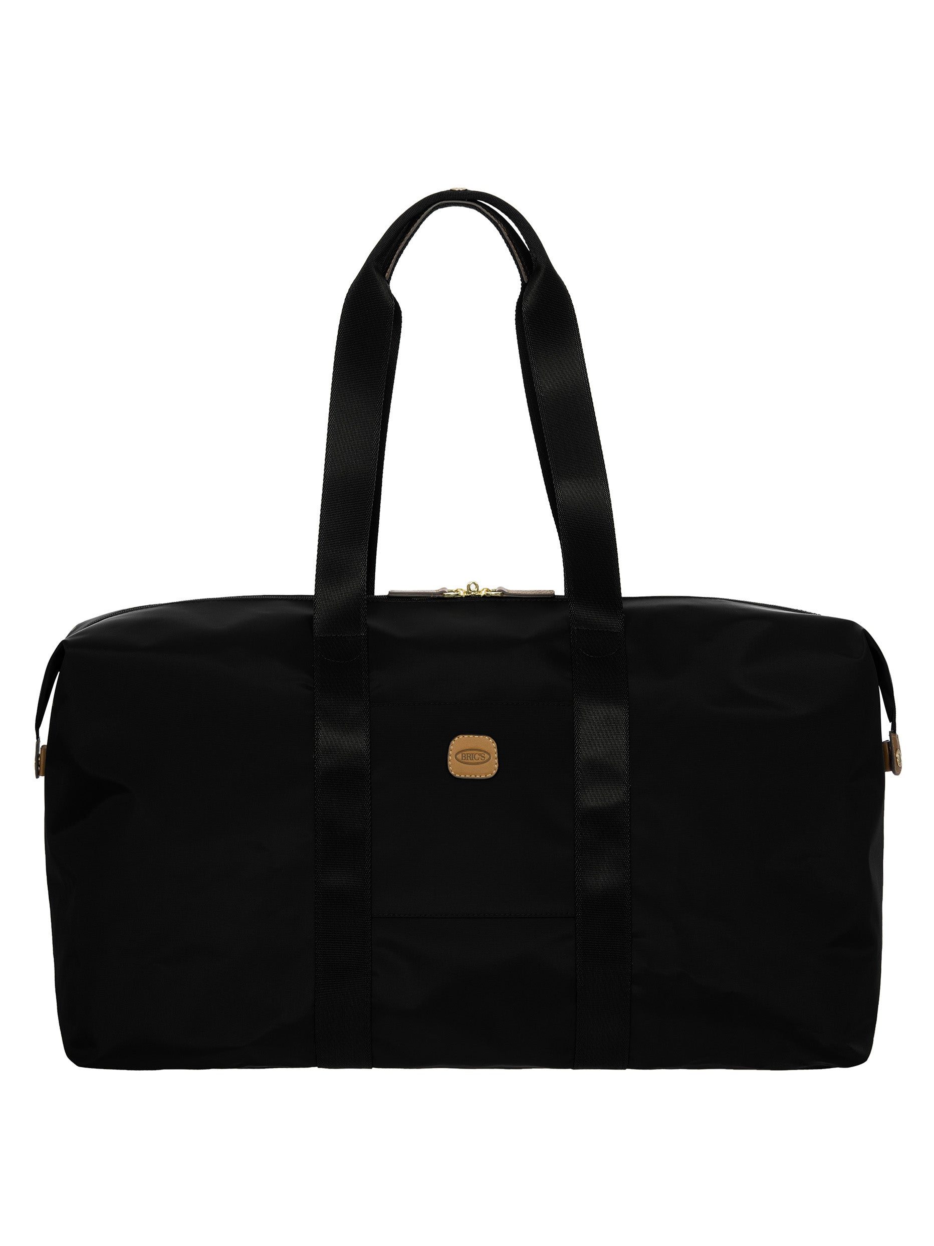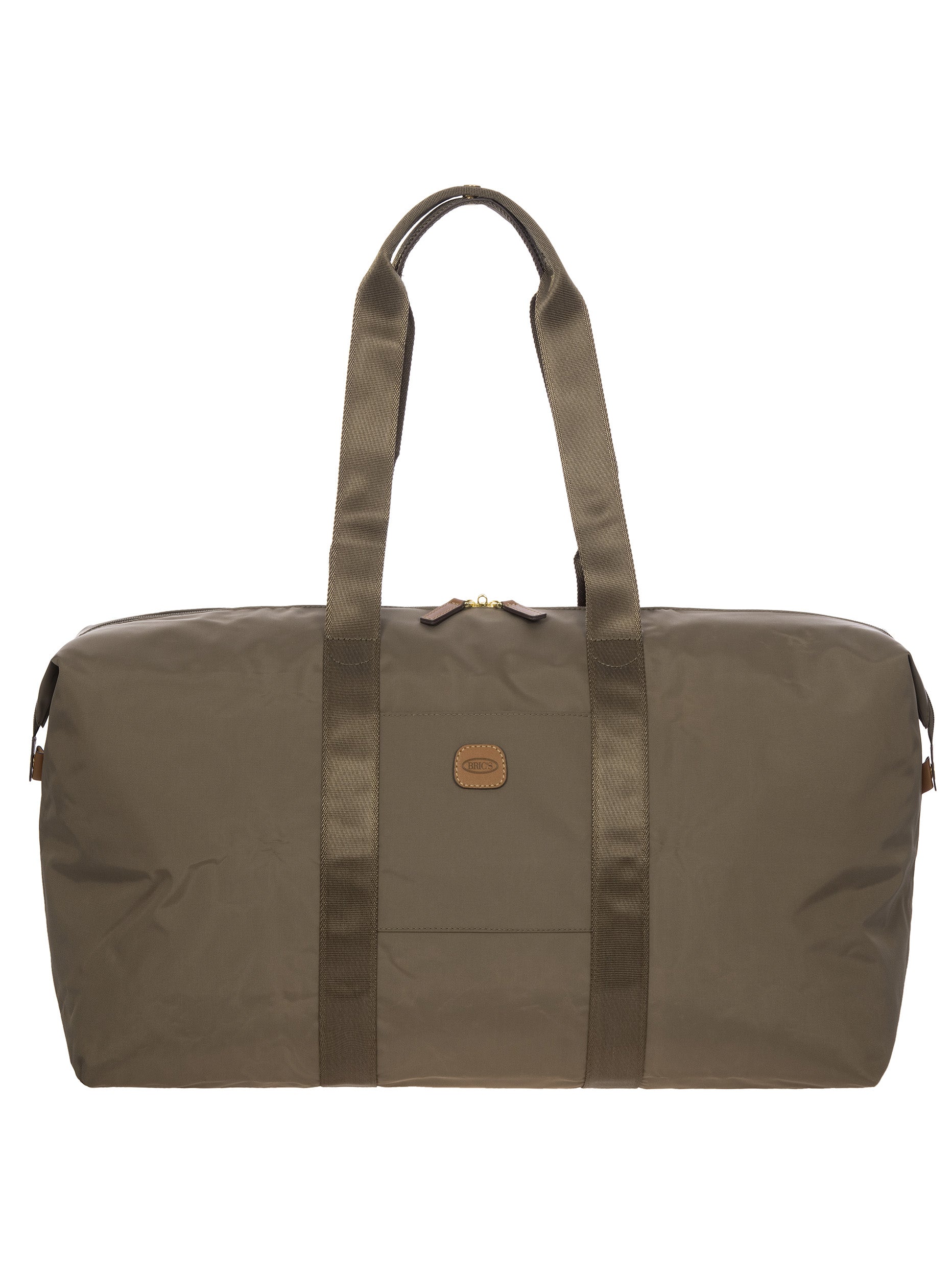 The large 2-in-1 foldable holdall from the X-Collection is made of soft, lightweight and durable recycled fabric, water-resistant. The detachable internal zipped pocket can be used as practical make-up bag or mini bag thanks to the included shoulder strap; the entire holdall can also be folded up and stored inside. This holdall can be carried by hand or on the shoulder using the handles. There is a strap on the back to attach it to a suitcase handle. Its spacious design makes it particularly practical. The main compartment is equipped with a zip with two sliders. Embellished with genuine leather details, one of Bric's signature design elements.