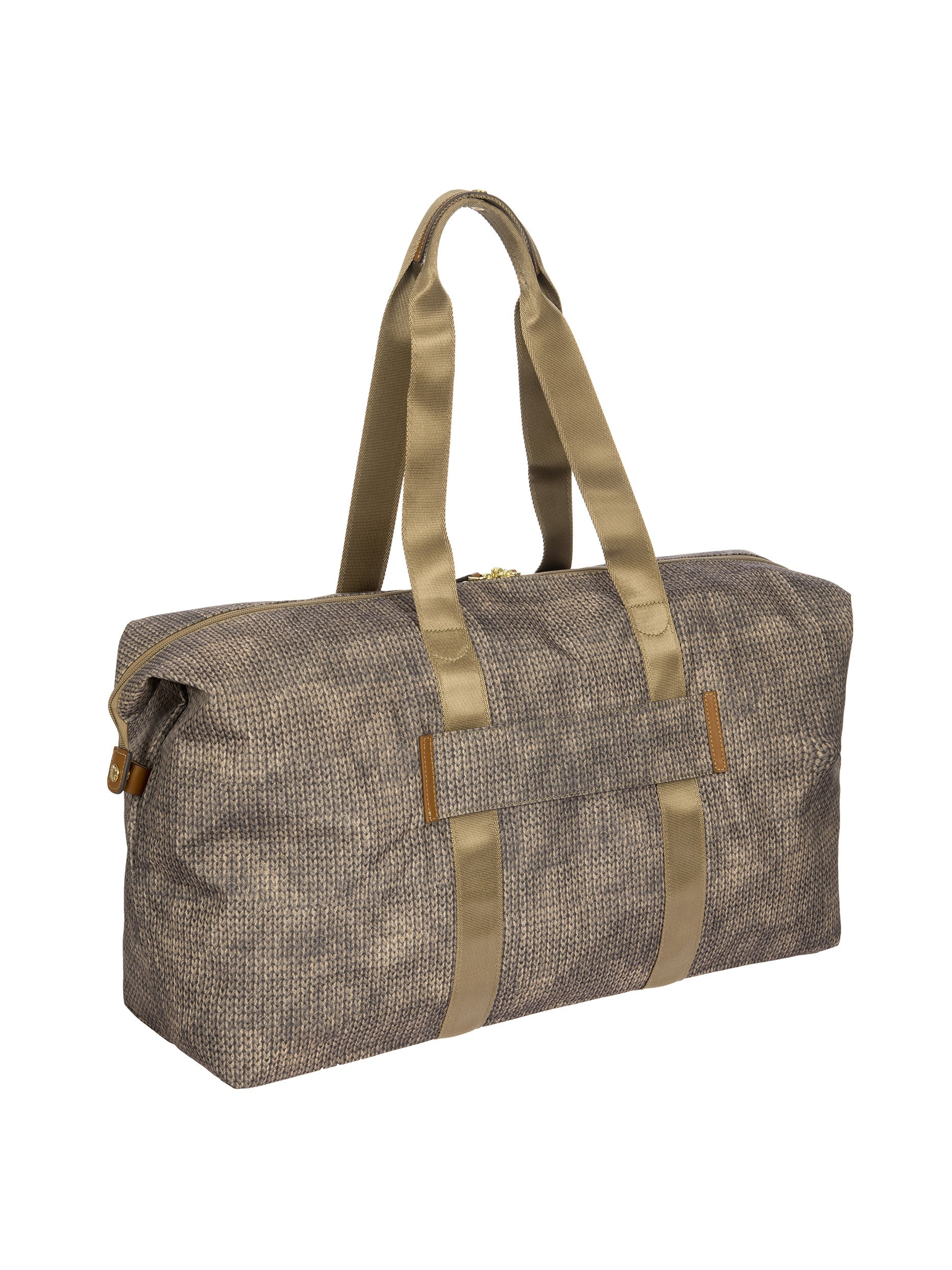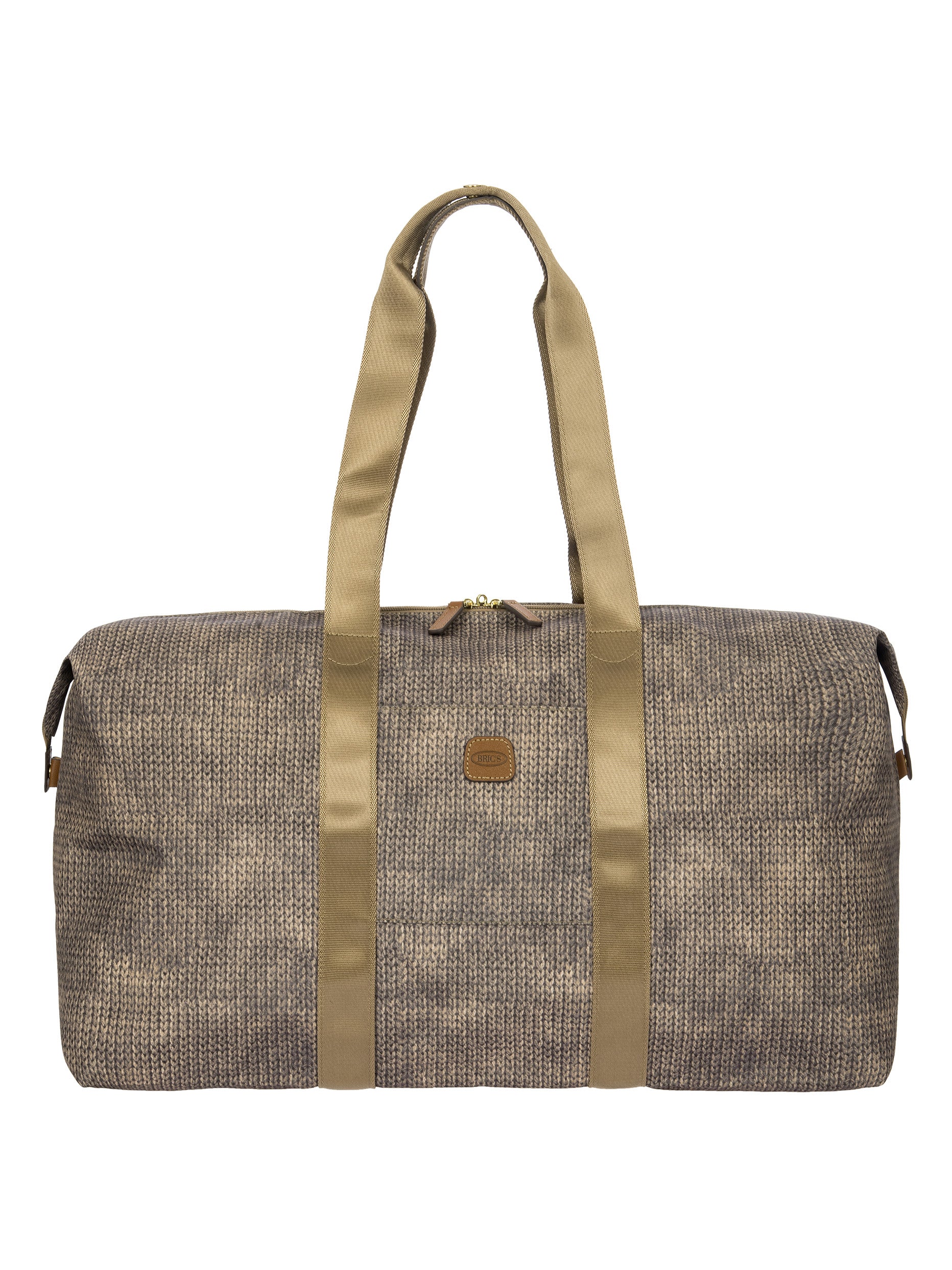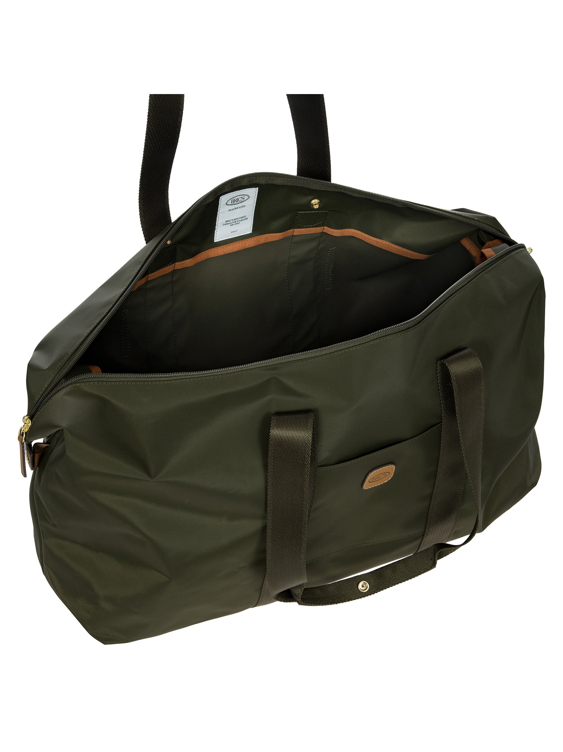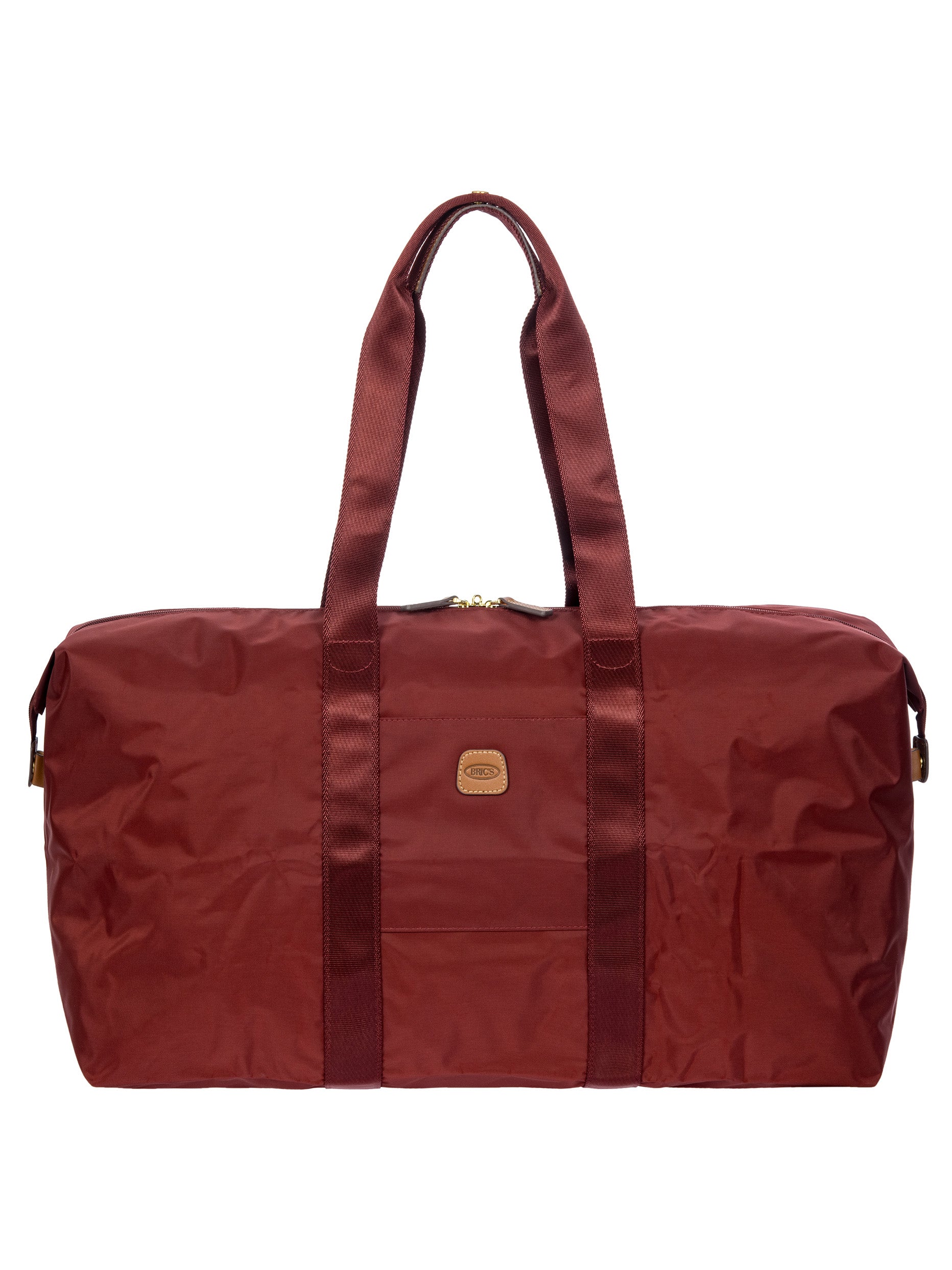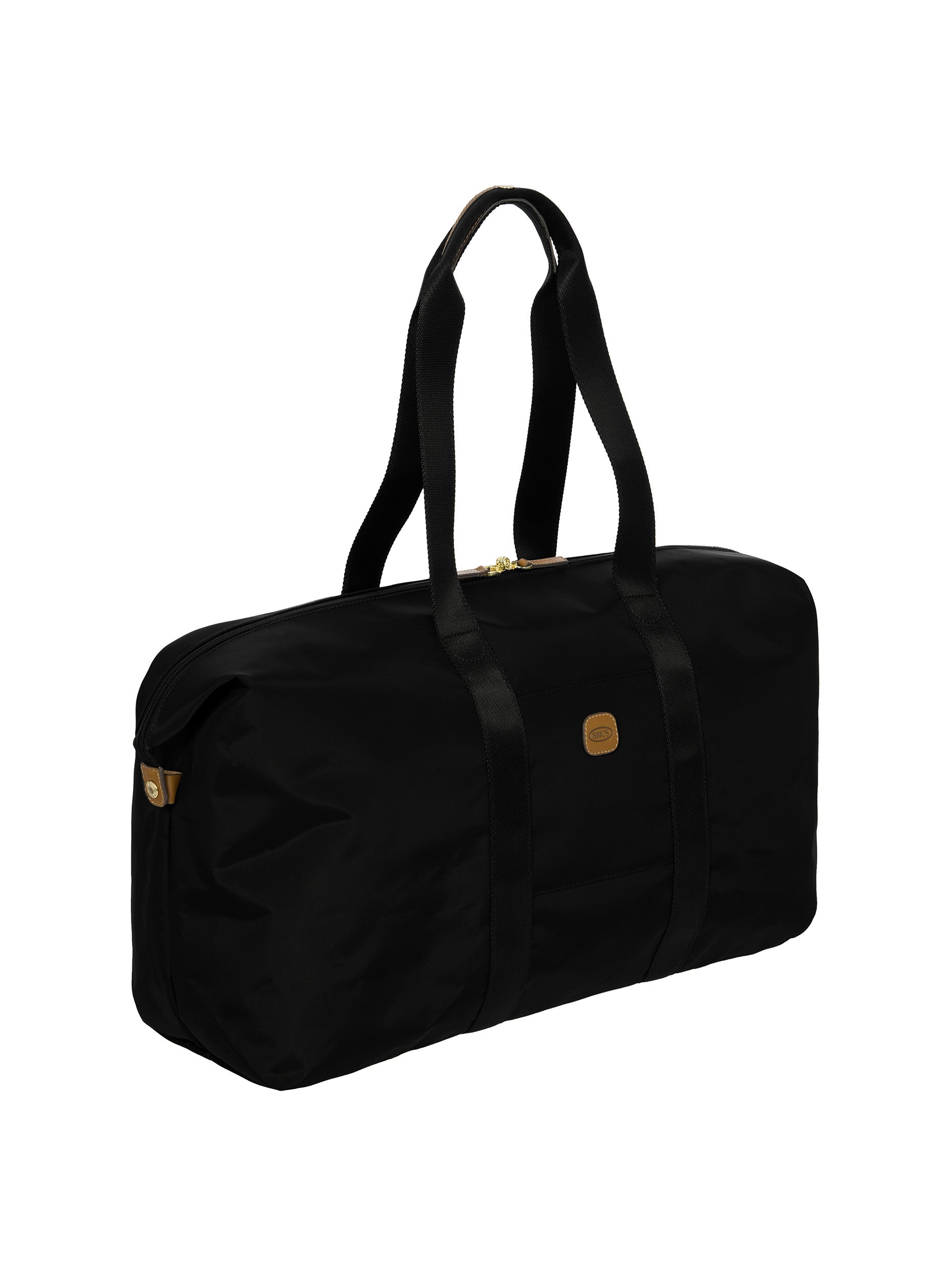 The large 2-in-1 foldable holdall from the X-Collection is made of soft, lightweight and durable recycled fabric, water-resistant. The detachable internal zipped pocket can be used as practical make-up bag or mini bag thanks to the included shoulder strap; the entire holdall can also be folded up and stored inside. This holdall can be carried by hand or on the shoulder using the handles. There is a strap on the back to attach it to a suitcase handle. Its spacious design makes it particularly practical. The main compartment is equipped with a zip with two sliders. Embellished with genuine leather details, one of Bric's signature design elements.
