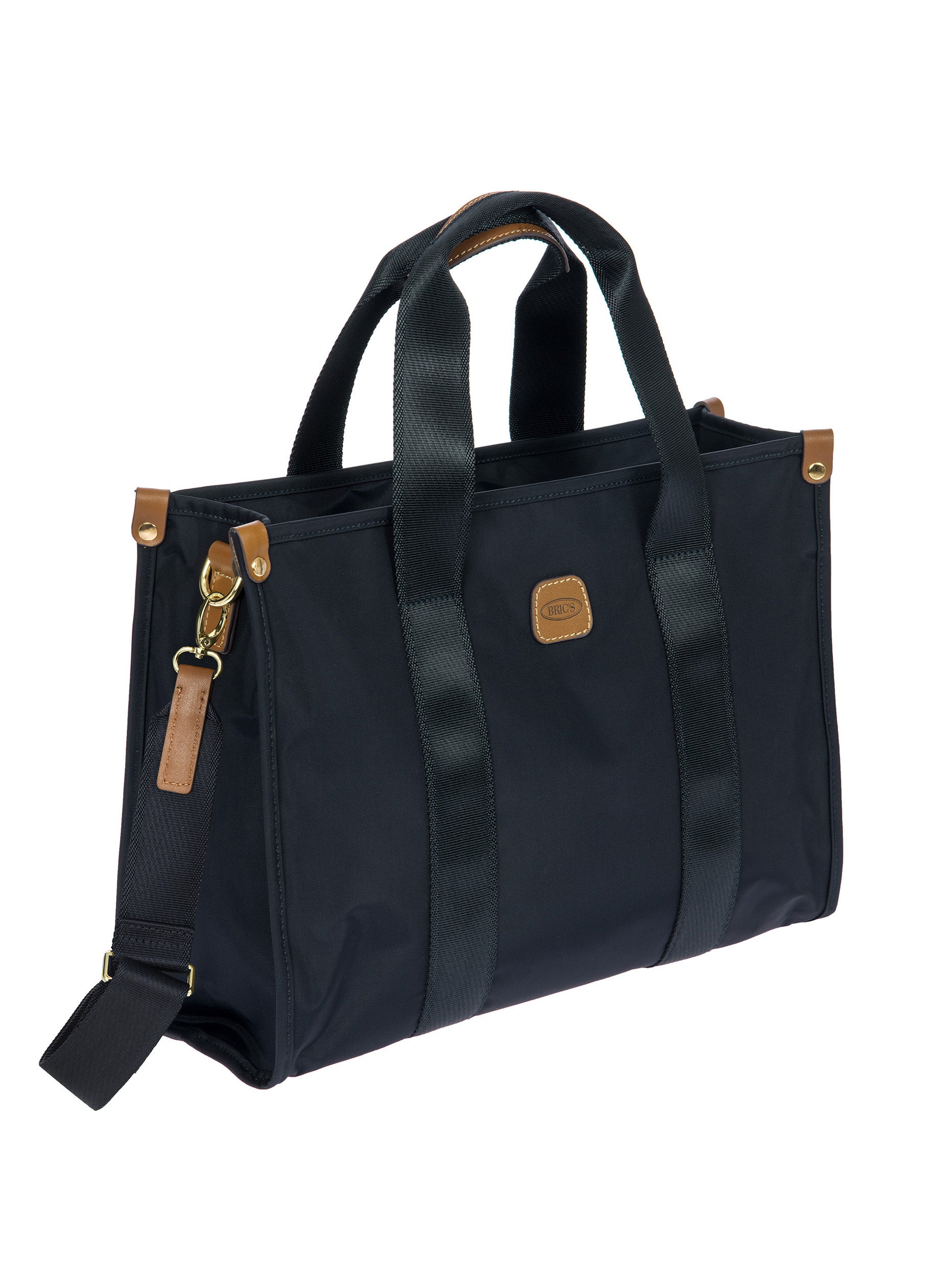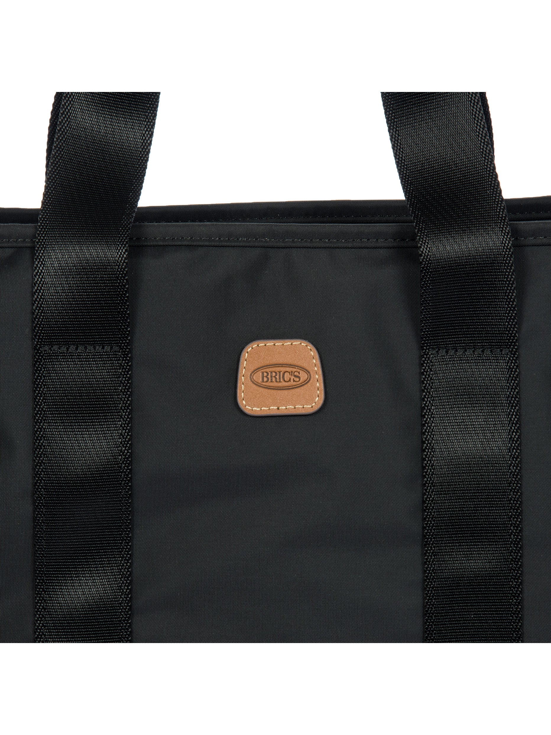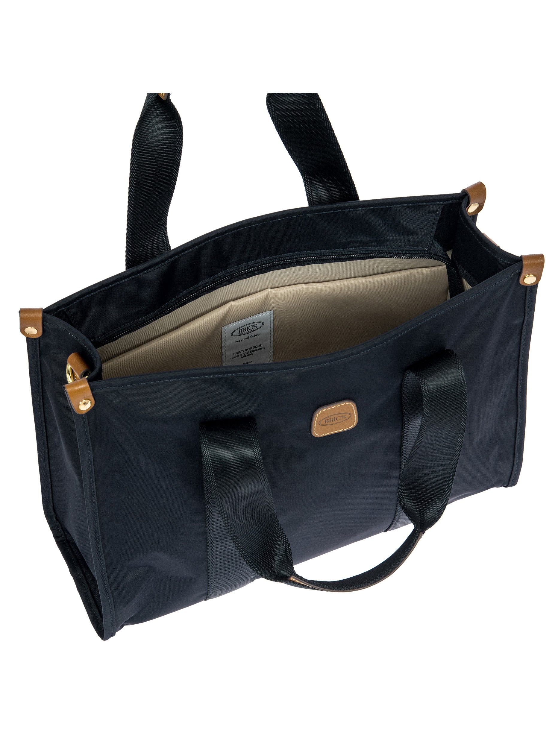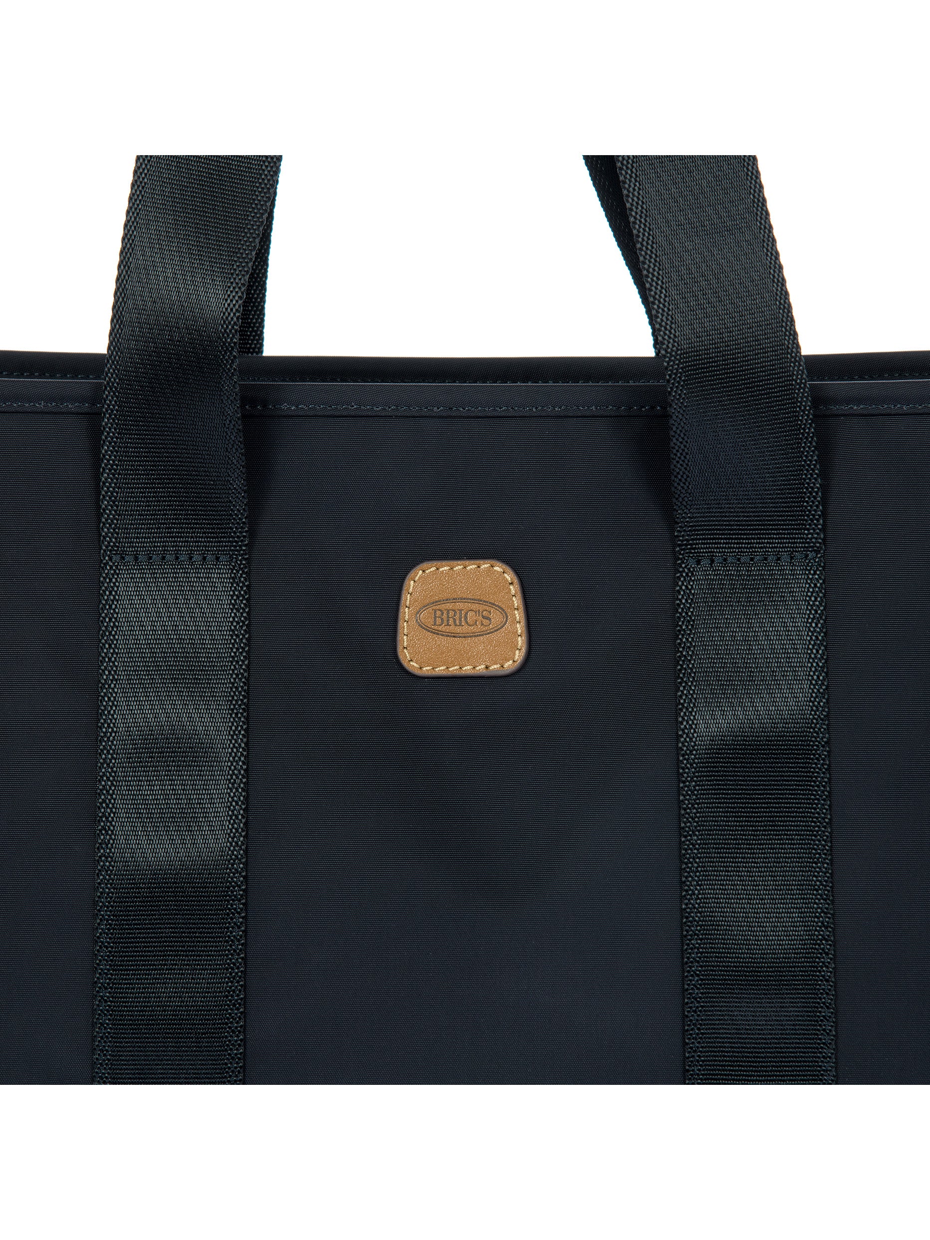 The X-Collection Opera Bag combines volume and essential lines, and is made of a water-proof, recycled fabric. Reinforced bottom, padded tablet pocket, double handle and removable shoulder strap for this functionally elegant bag. Safe zipped fastening. This functional 24/7 bag is embellished by ribbons and genuine leather details - Bric's hallmark.