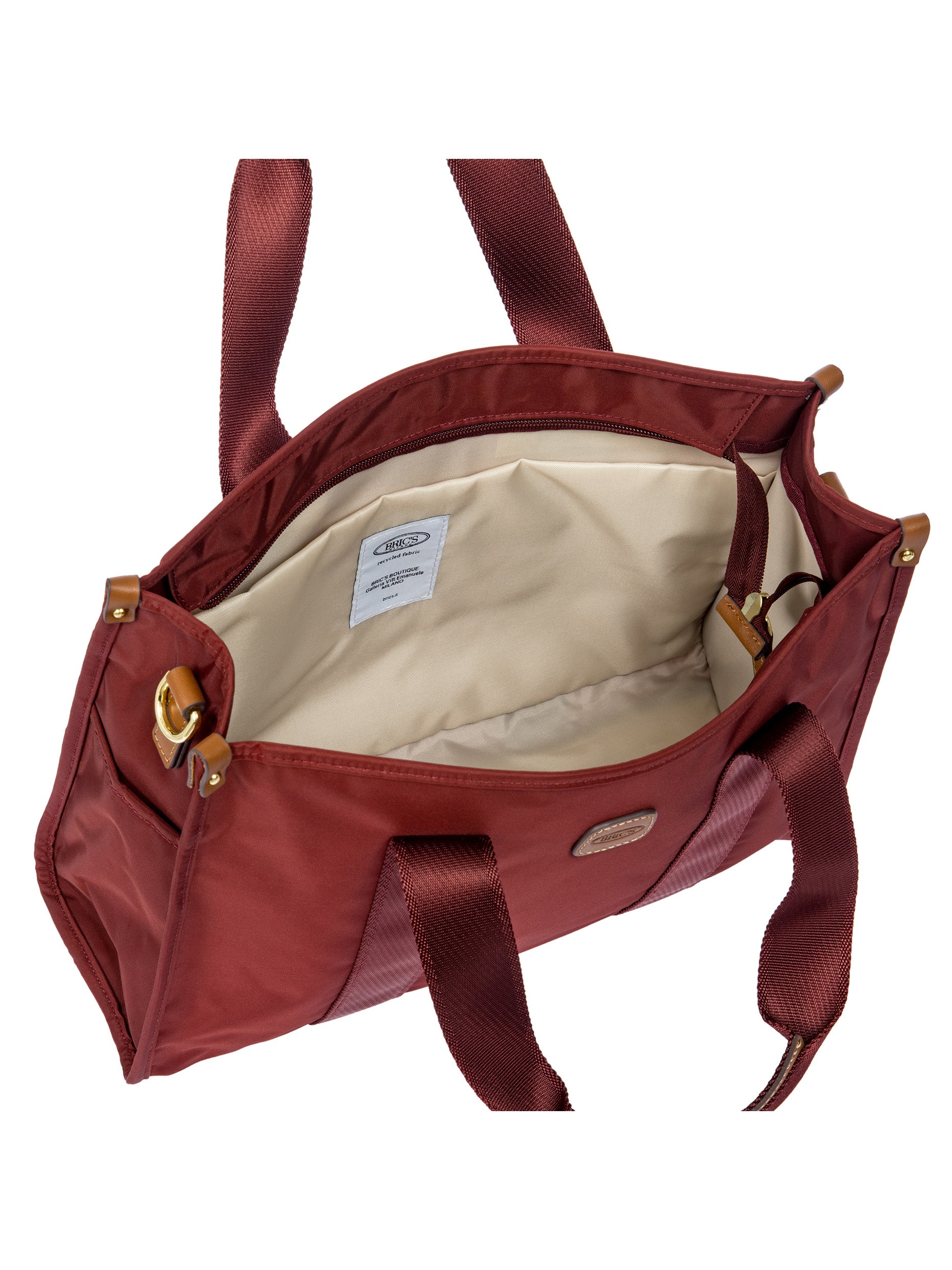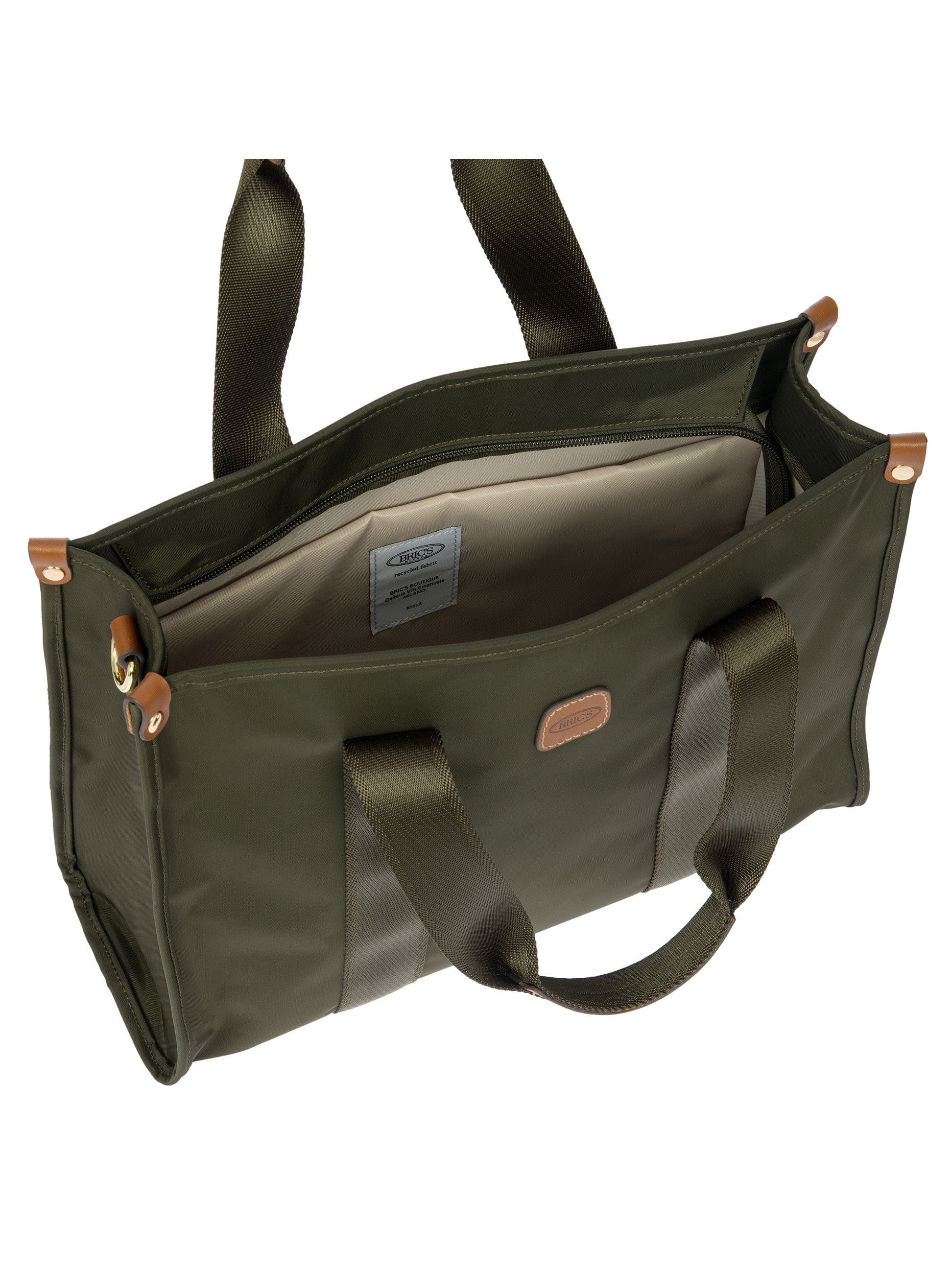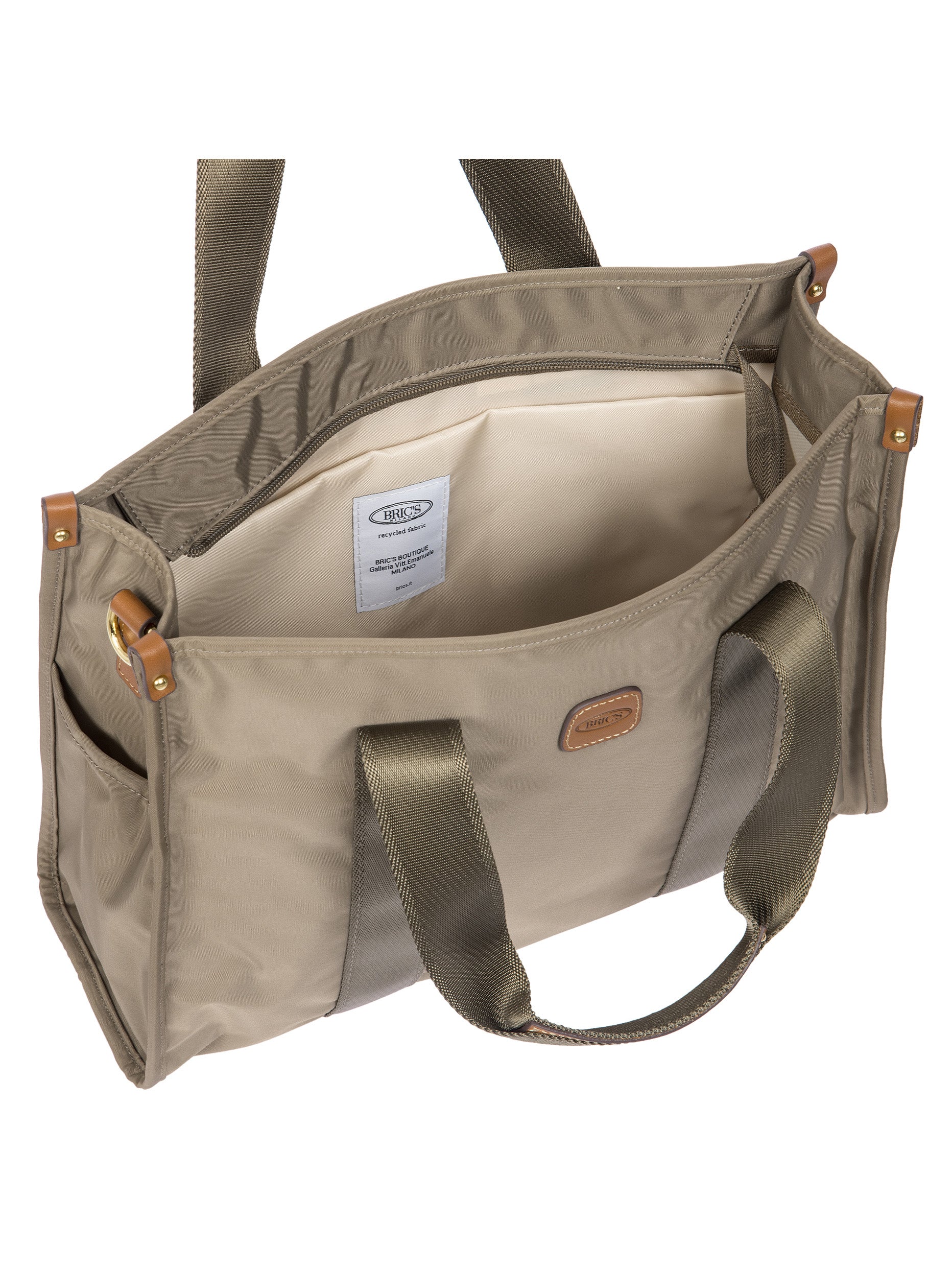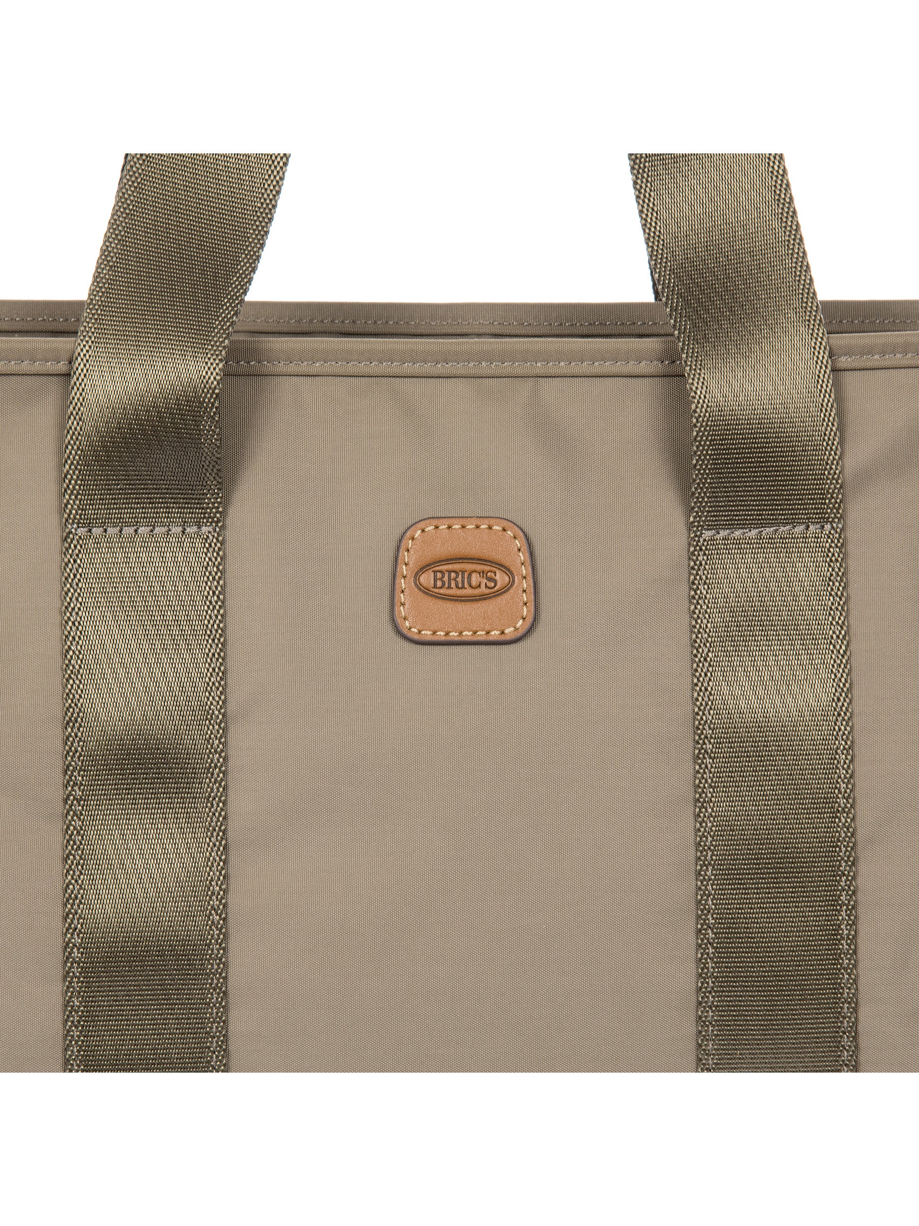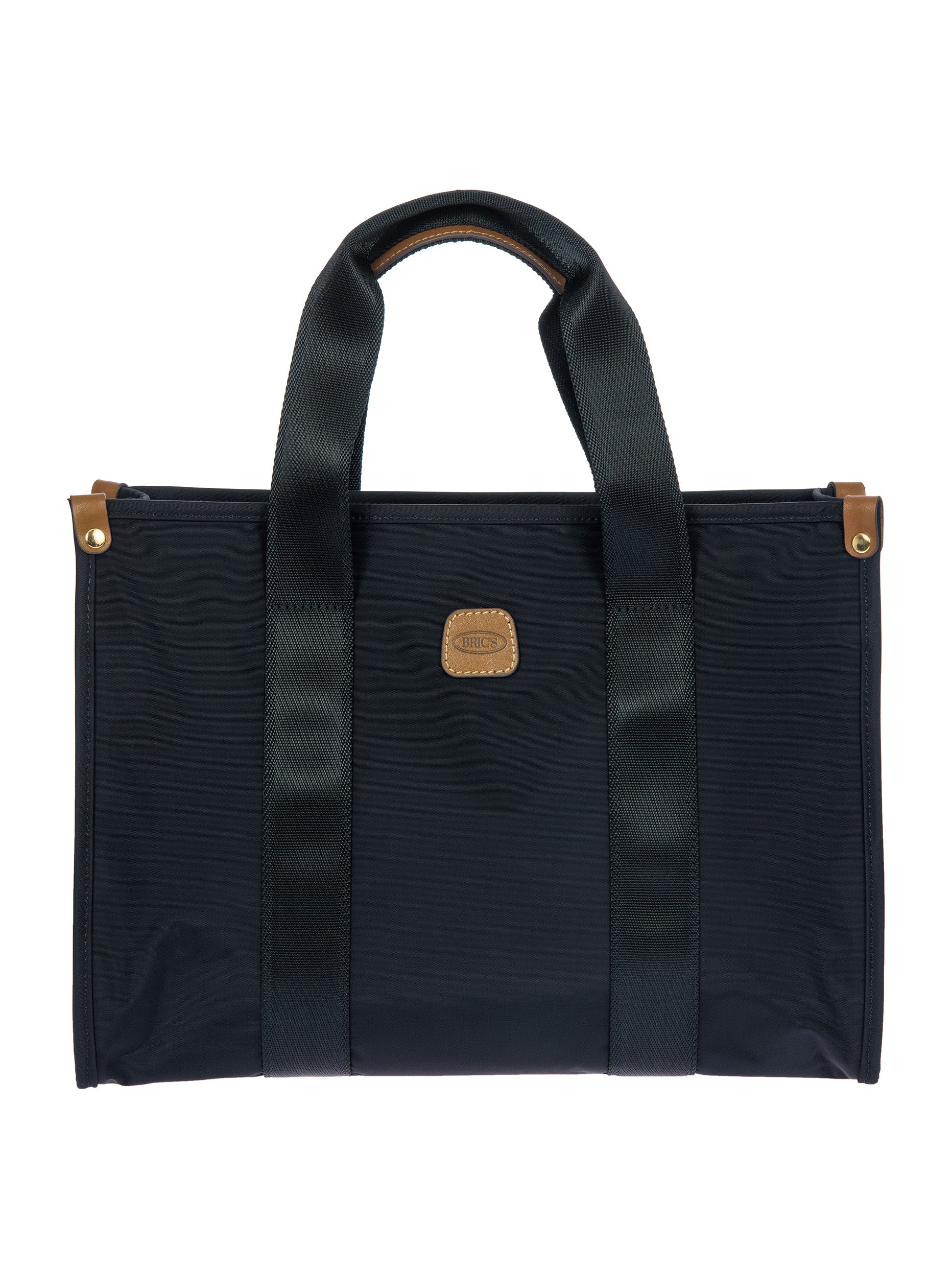 The X-Collection Opera Bag combines volume and essential lines, and is made of a water-proof, recycled fabric. Reinforced bottom, padded tablet pocket, double handle and removable shoulder strap for this functionally elegant bag. Safe zipped fastening. This functional 24/7 bag is embellished by ribbons and genuine leather details - Bric's hallmark.
