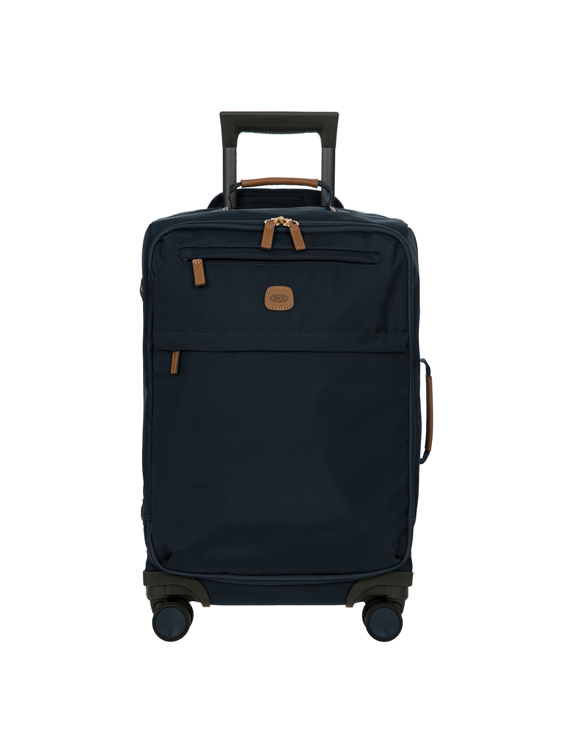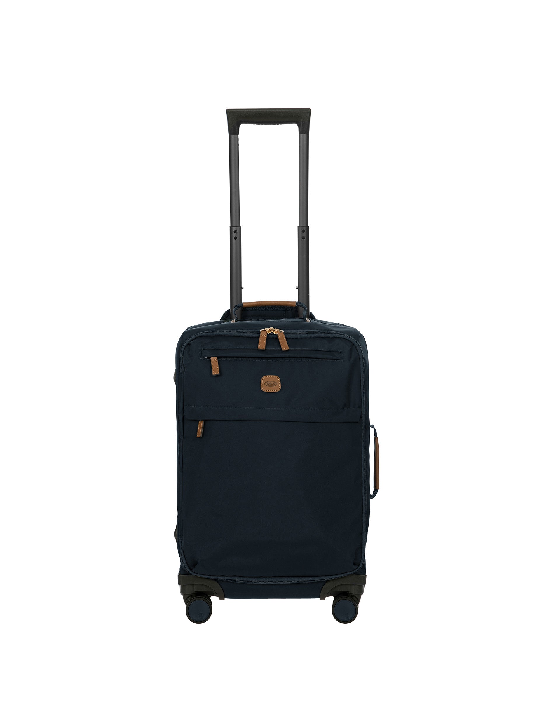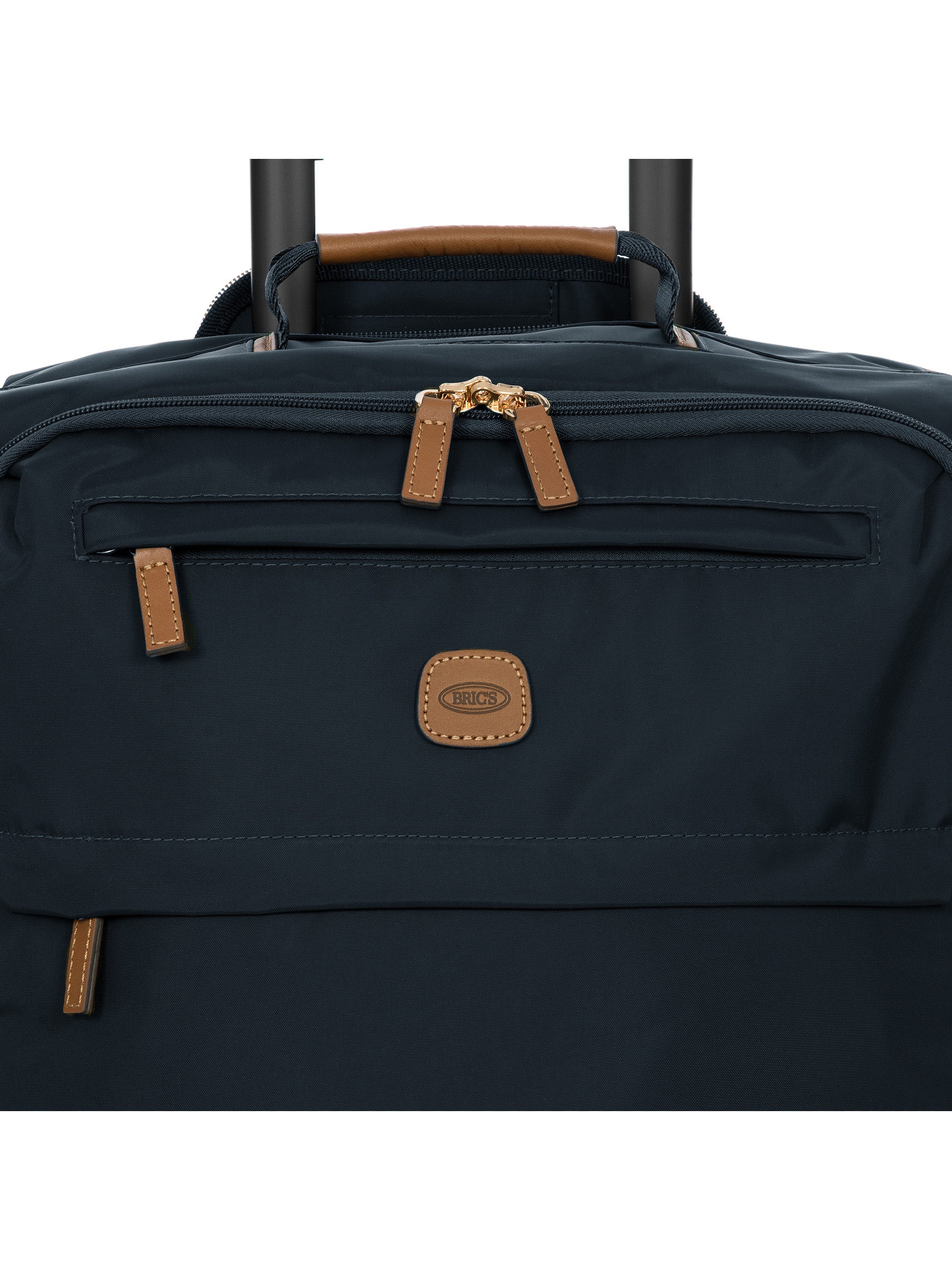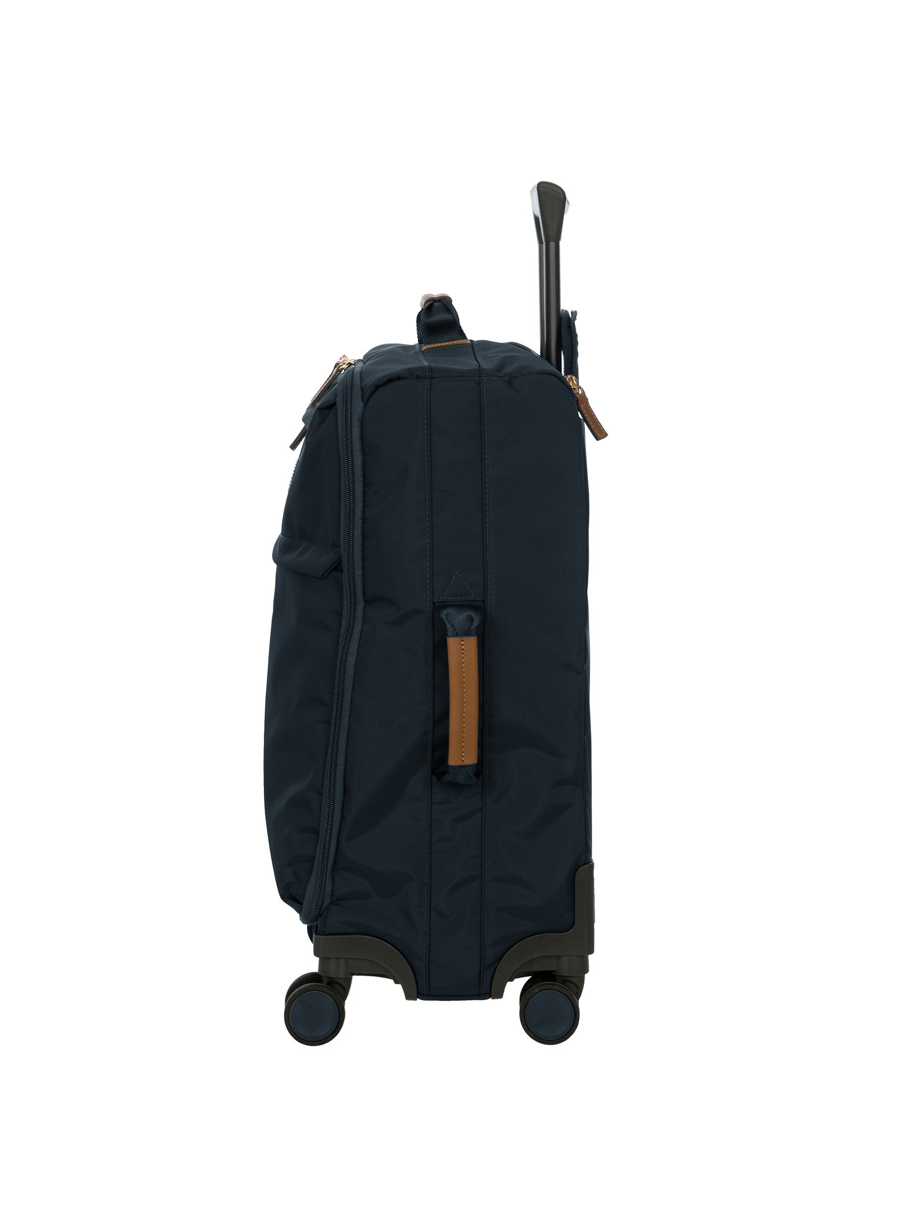 The 55 cm carry-on Trolley from the X-Collection is made of durable recycled fabric, water-resistant, with a rigid and lightweight internal structure. The main compartment is equipped with a zip with two sliders. It also includes two zipped front pockets, interior pockets and straps to help you organise your belongings. The wheels swivel to ensure smooth 360° movement, and are recessed to maximise the internal capacity of the trolley bag. Complete with an address tag and rings for a padlock (sold separately). The trolley bag features a padded handle on the top, four double silent wheels with bearings, sturdy and stable aluminium tubes, and an ergonomic handle for complete comfort. Finished with genuine leather details, one of Bric's signature design elements, and the brand's logo.