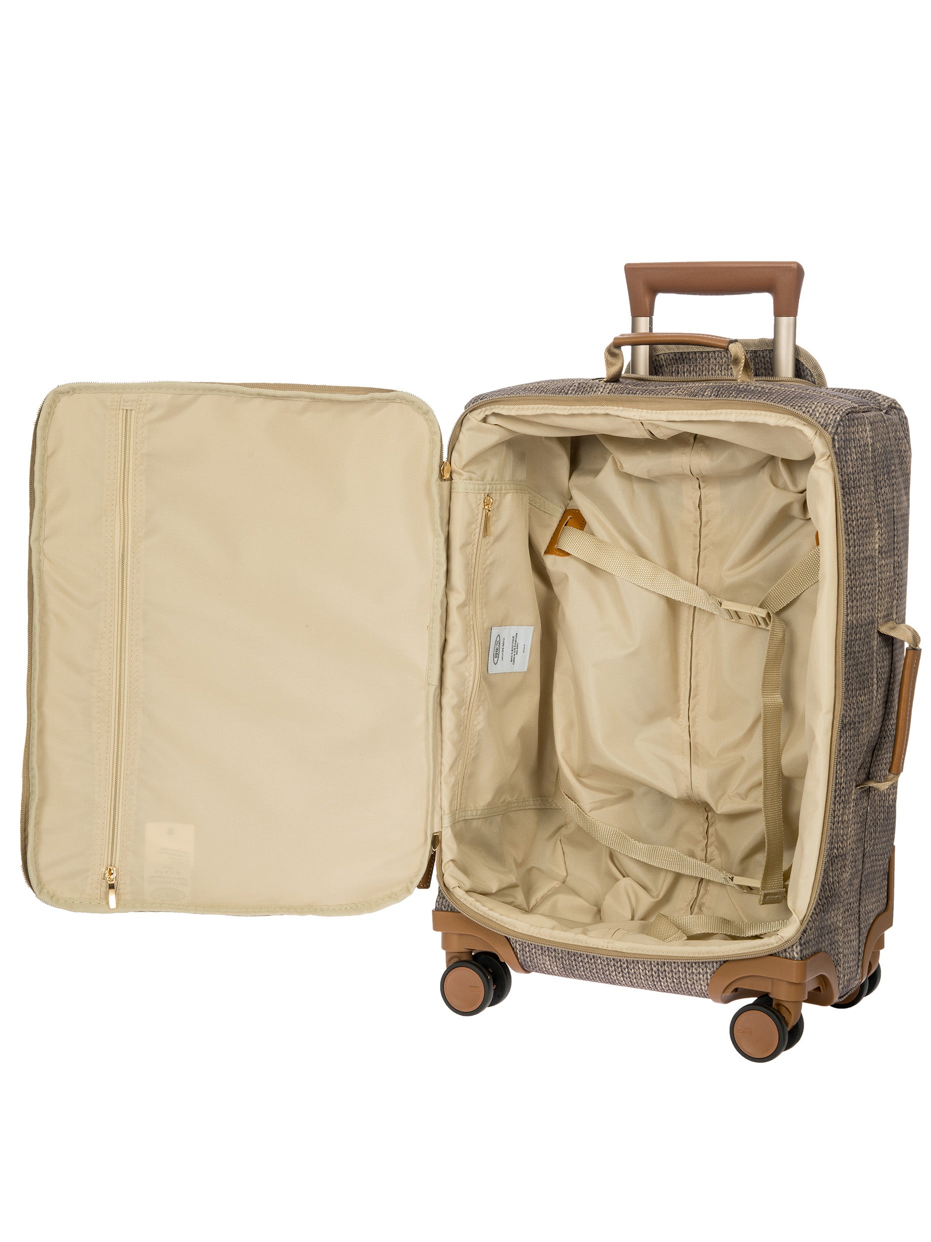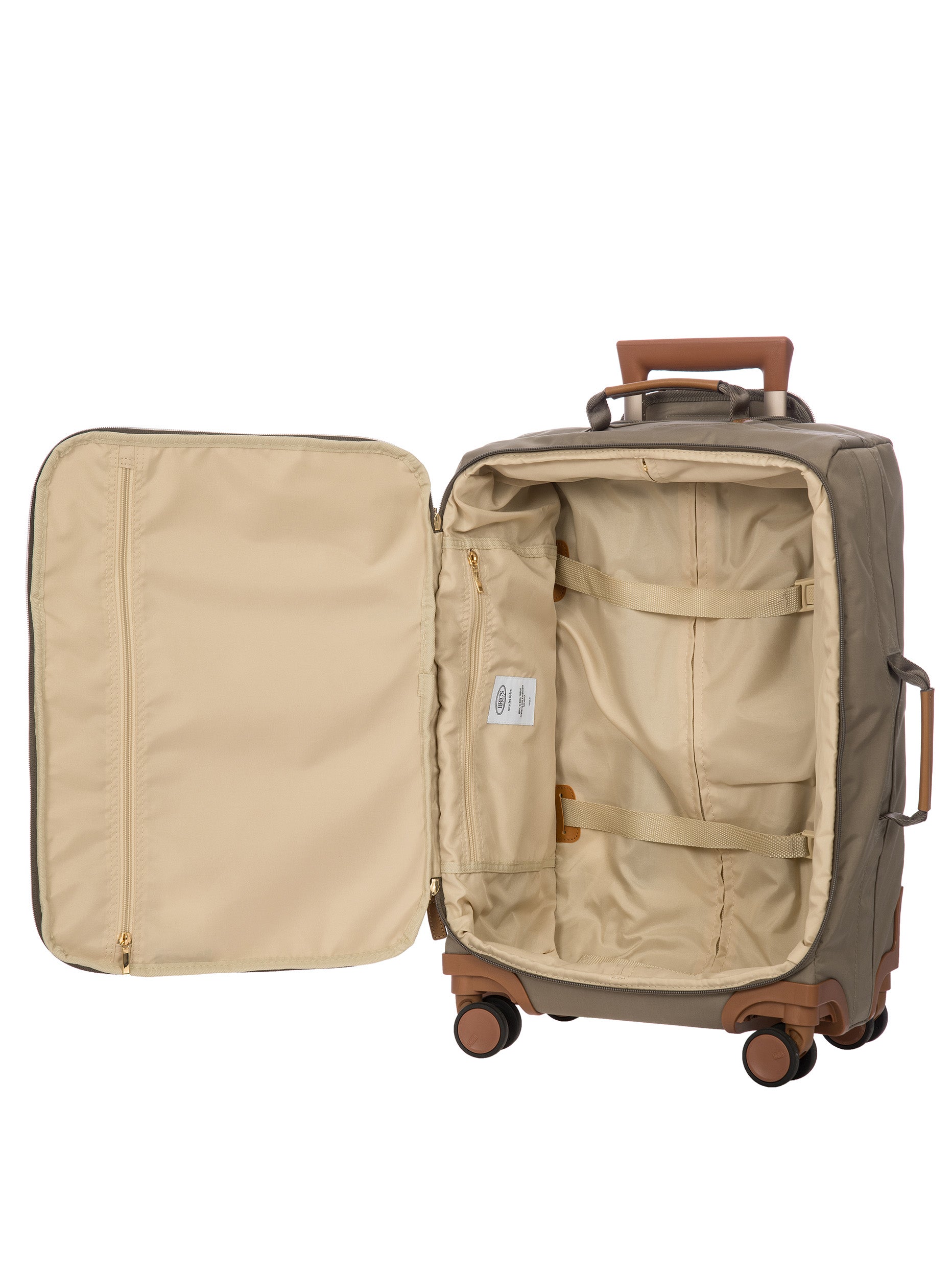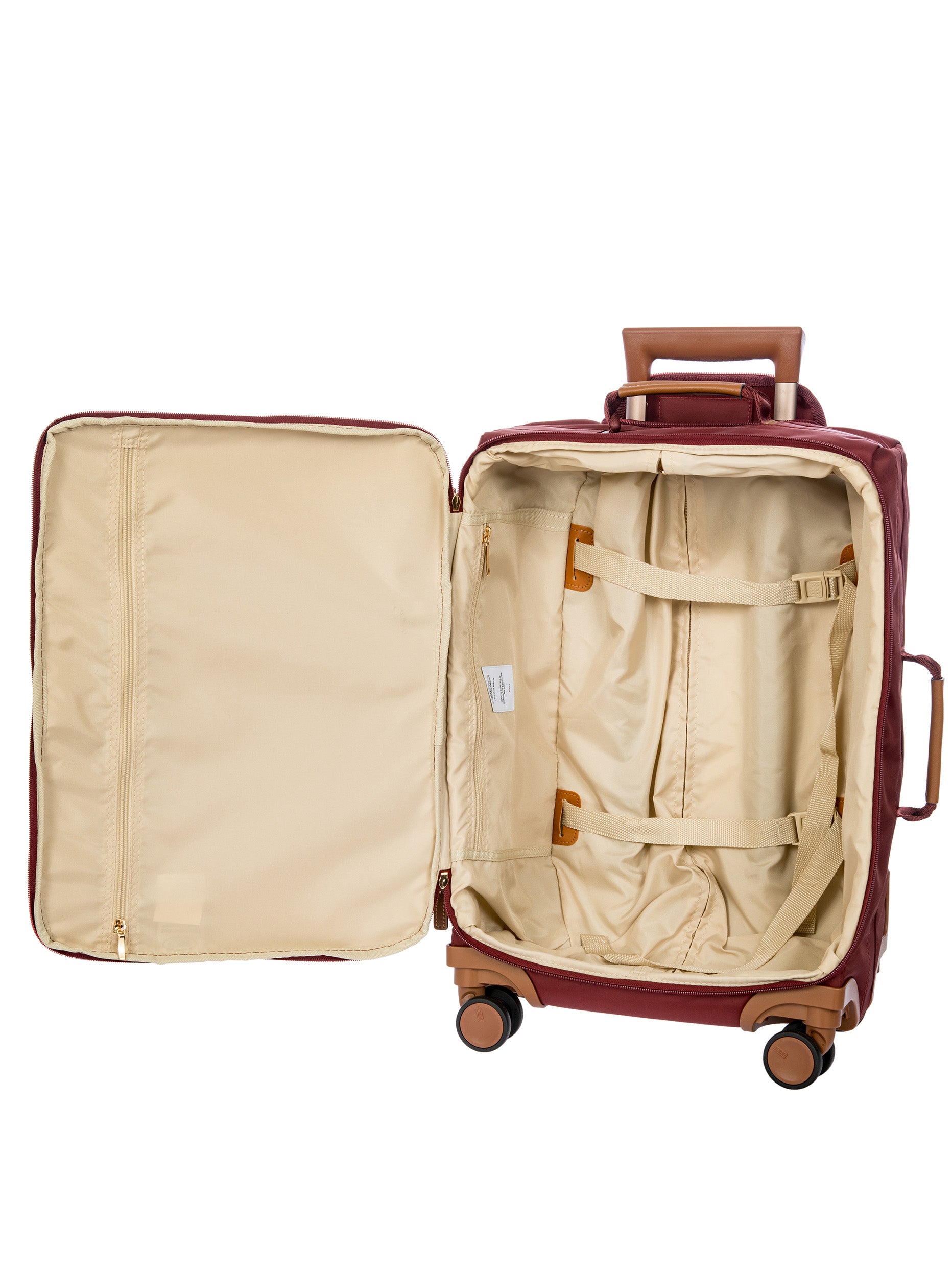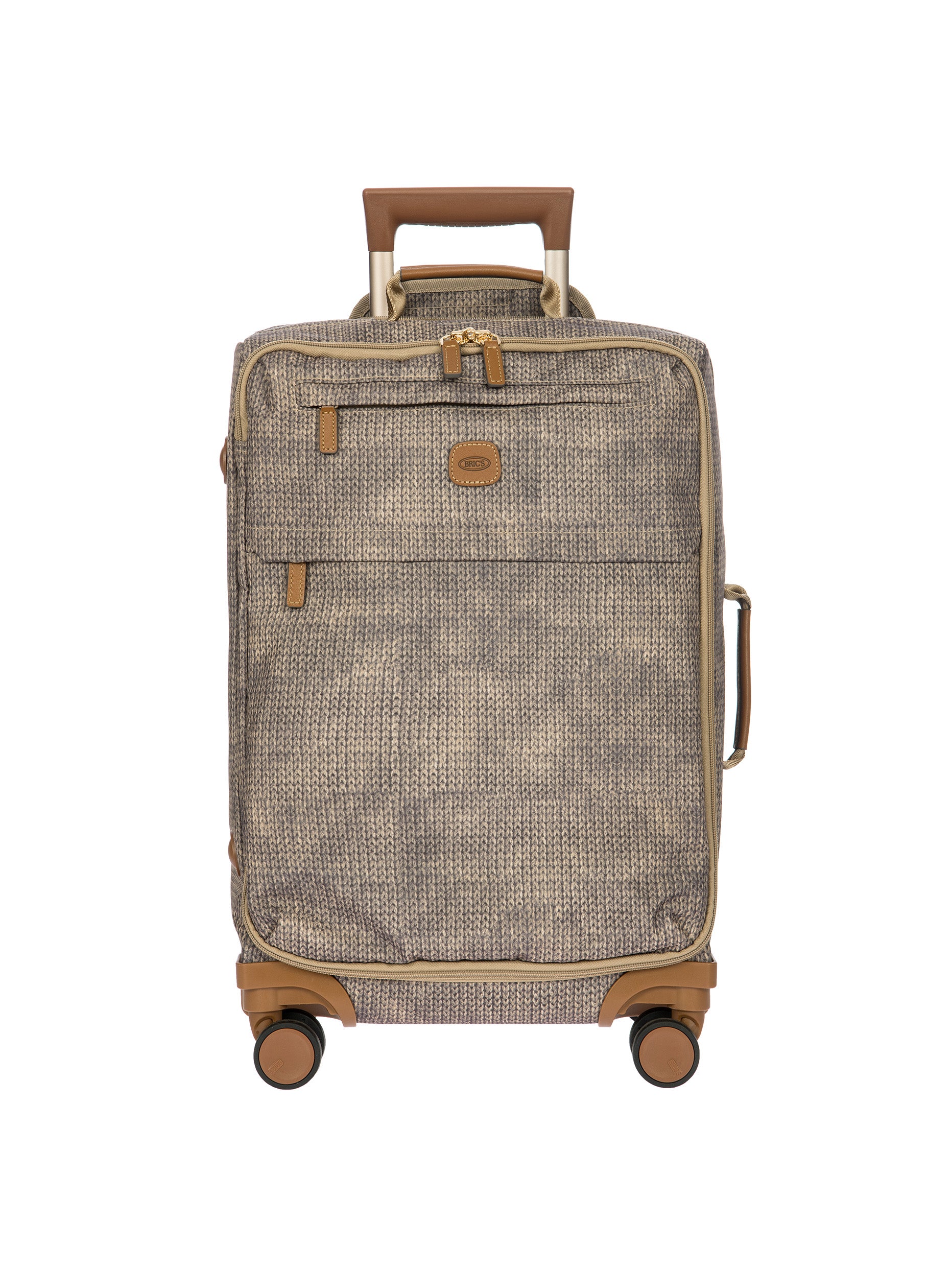 The 55 cm carry-on Trolley from the X-Collection is made of durable recycled fabric, water-resistant, with a rigid and lightweight internal structure. The main compartment is equipped with a zip with two sliders. It also includes two zipped front pockets, interior pockets and straps to help you organise your belongings. The wheels swivel to ensure smooth 360° movement, and are recessed to maximise the internal capacity of the trolley bag. Complete with an address tag and rings for a padlock (sold separately). The trolley bag features a padded handle on the top, four double silent wheels with bearings, sturdy and stable aluminium tubes, and an ergonomic handle for complete comfort. Finished with genuine leather details, one of Bric's signature design elements, and the brand's logo.