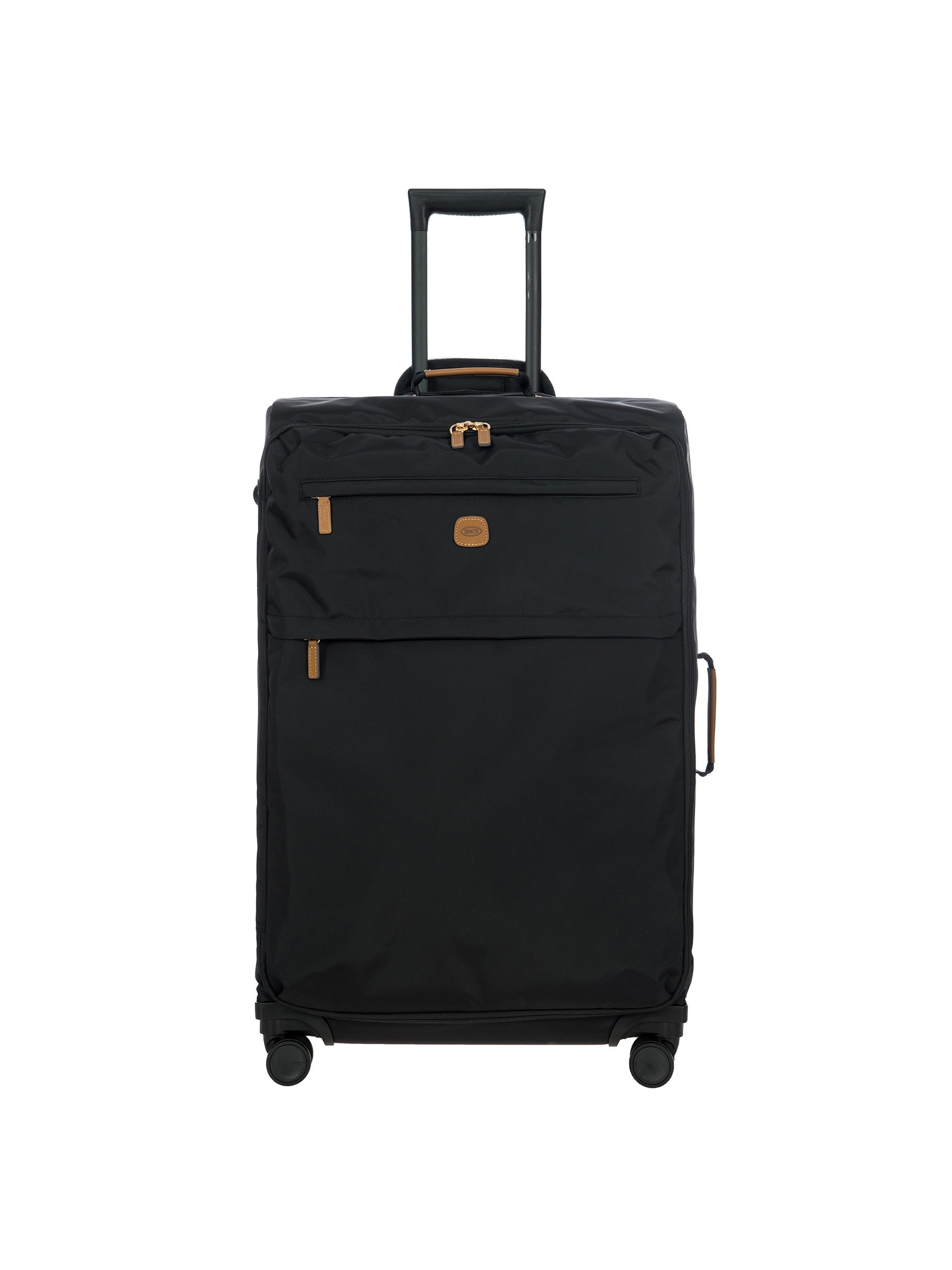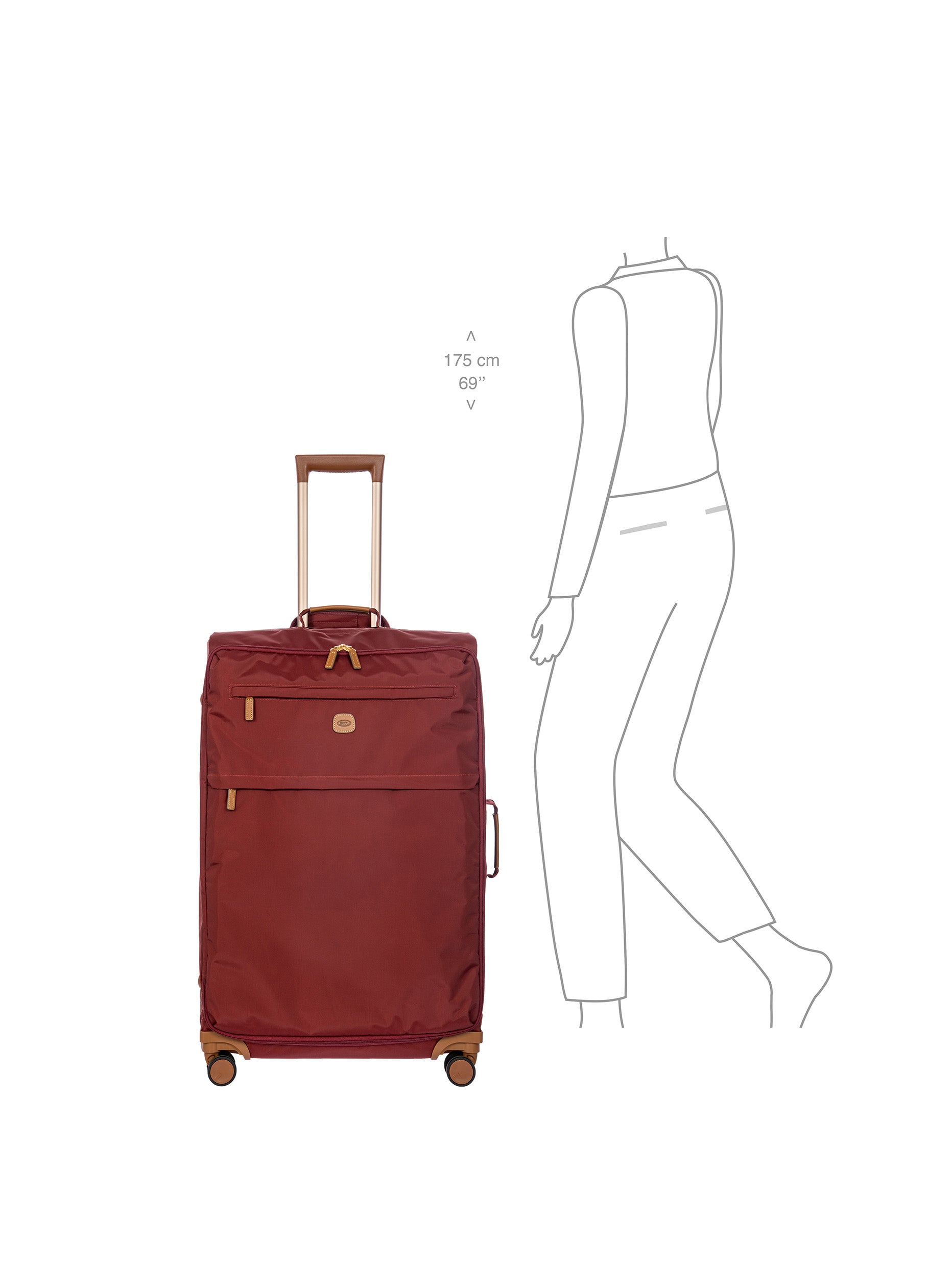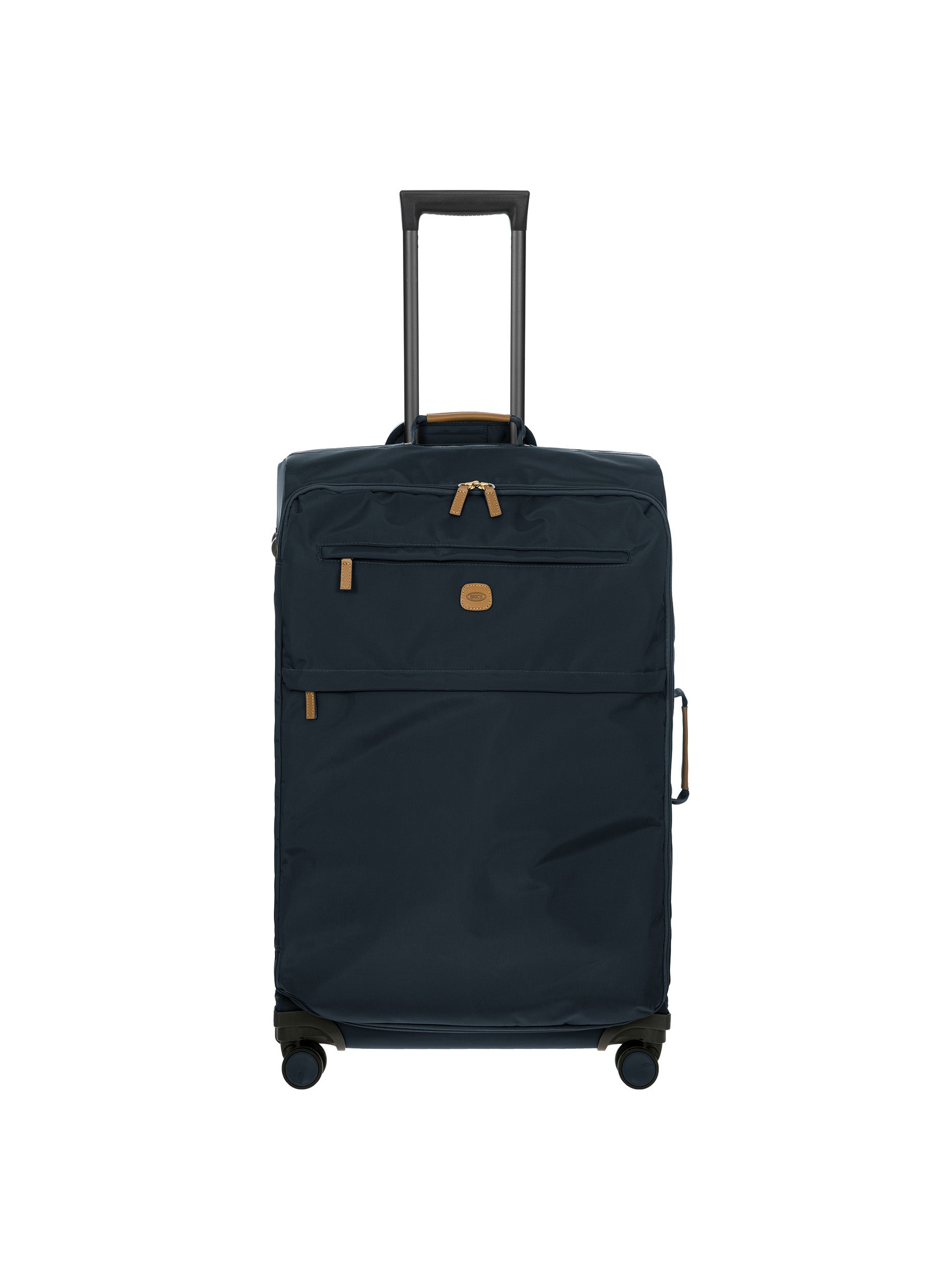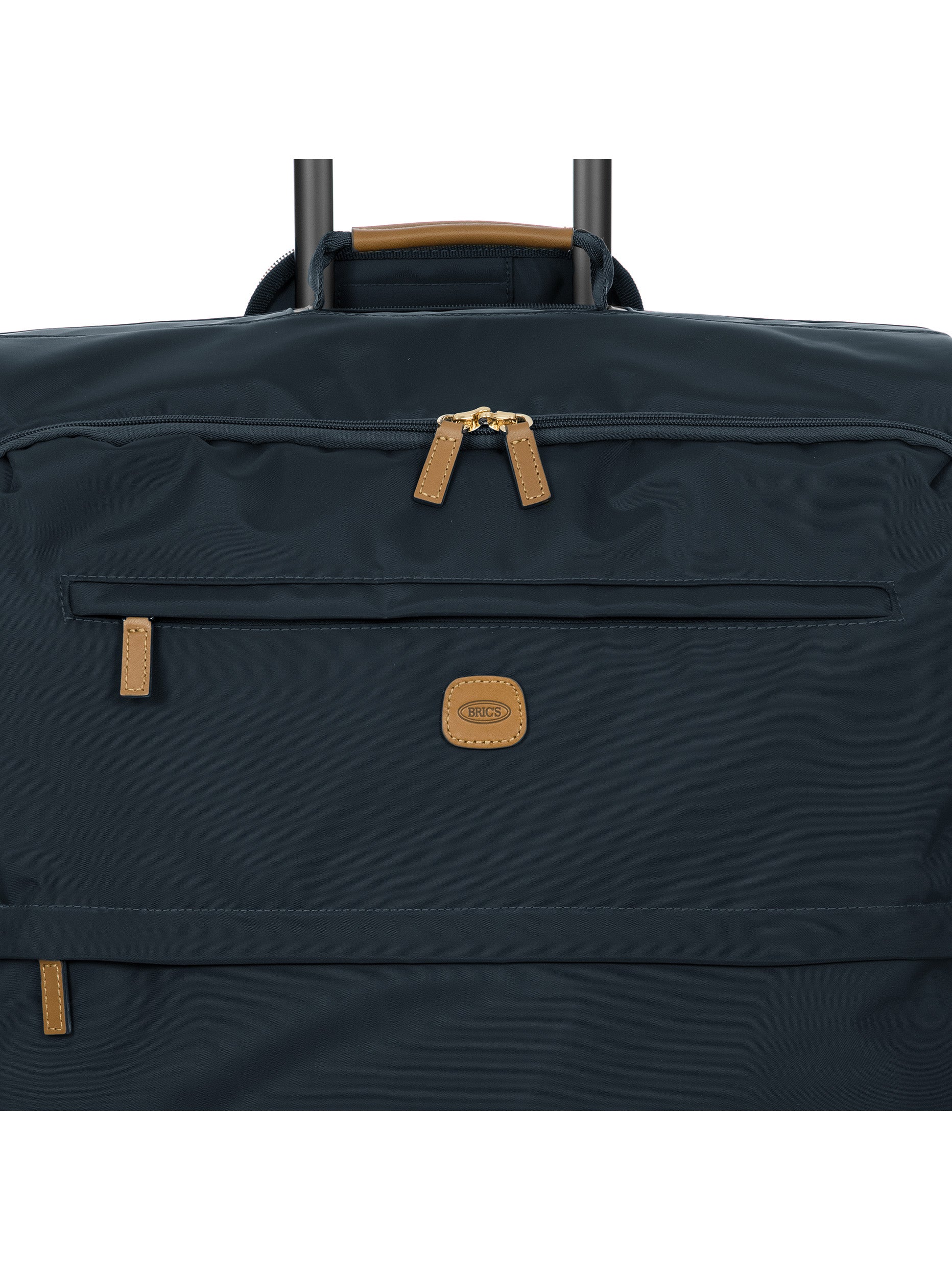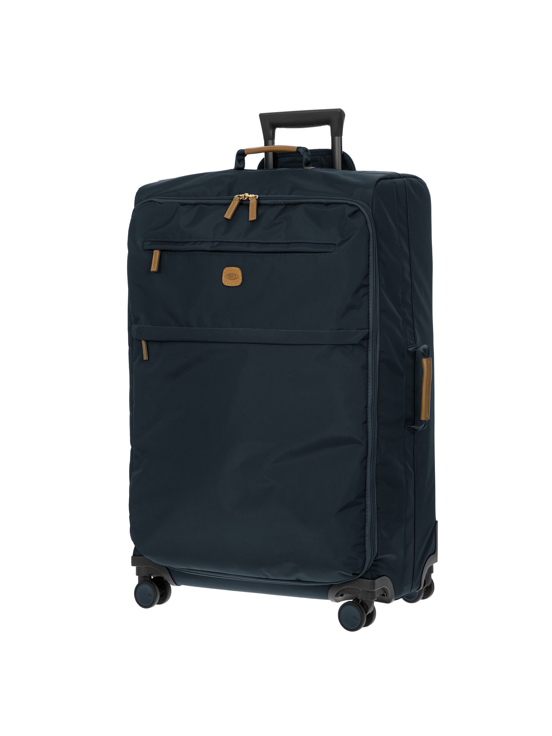 The 77 cm XL Trolley from the X-Collection is made of durable recycled fabric, water-resistant, with a rigid and lightweight internal structure. The main compartment is equipped with a zip with two sliders. It also includes two zipped front pockets, interior pockets and straps to help you organise your belongings. The wheels swivel to ensure smooth 360° movement, and are recessed to maximise the internal capacity of the trolley bag. Complete with an address tag and rings for a padlock (sold separately). The trolley bag features a padded handle on the top, four double silent wheels with bearings, sturdy and stable aluminium tubes, and an ergonomic handle for complete comfort. Finished with genuine leather details, one of Bric's signature design elements, and the brand's logo.