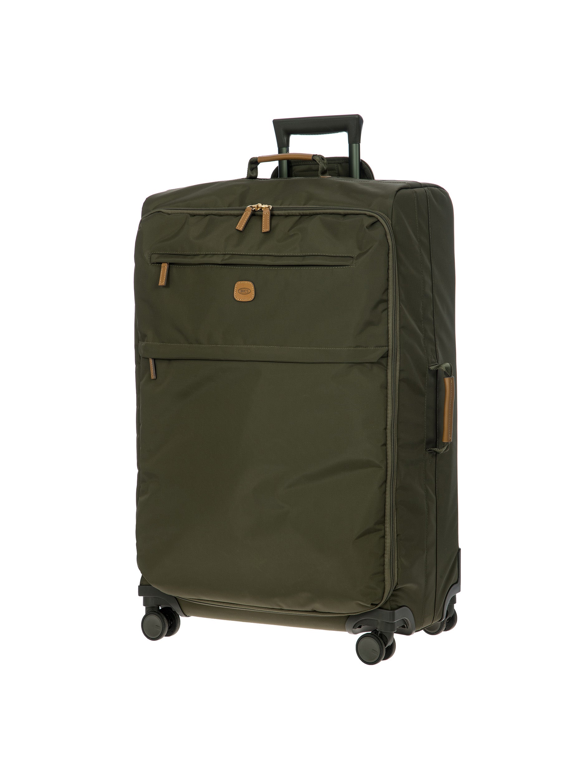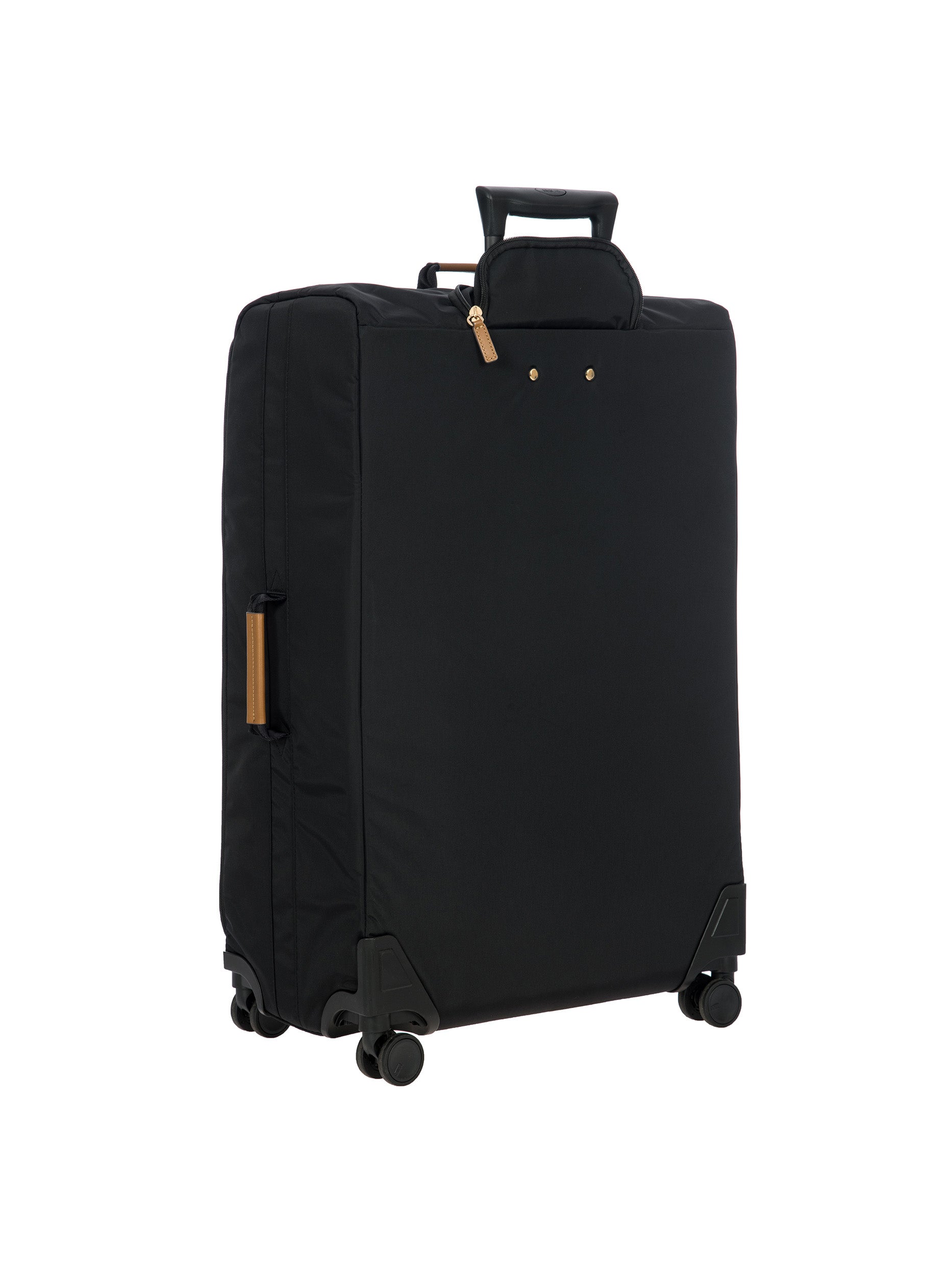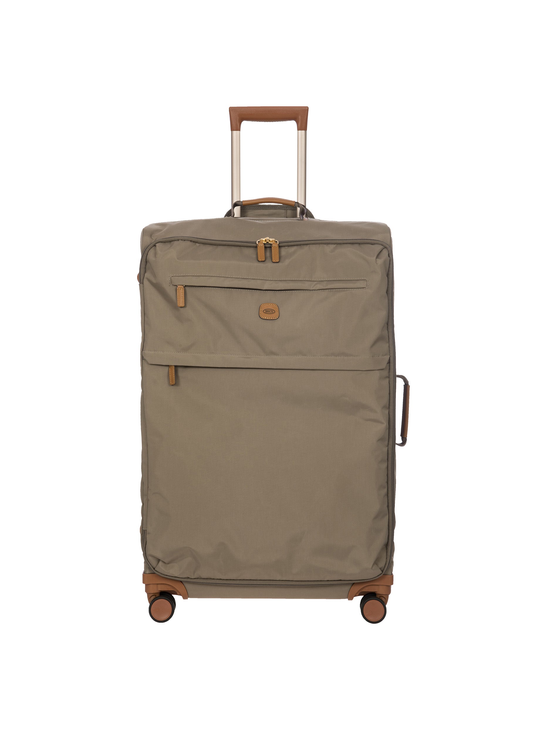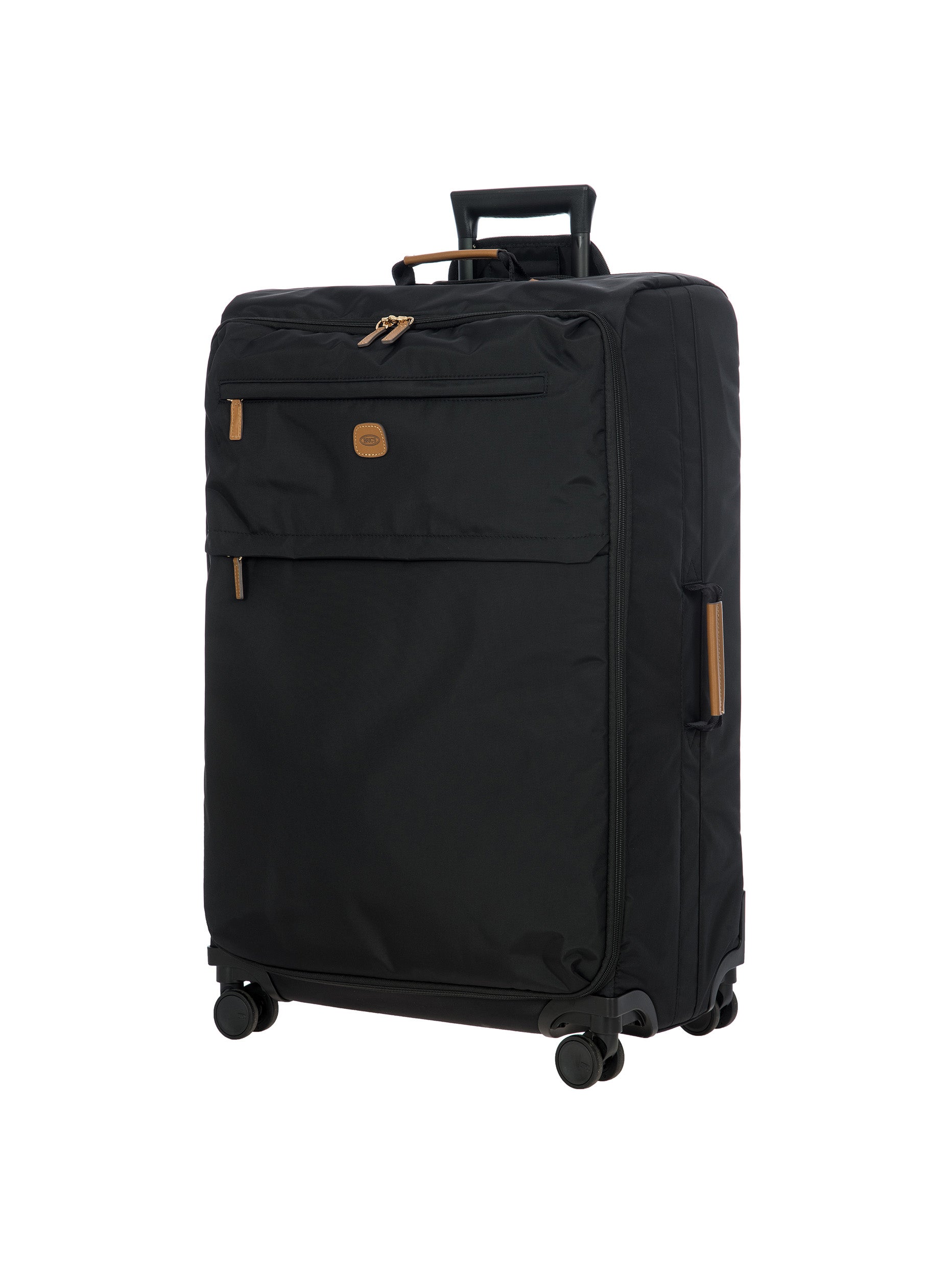 The 77 cm XL Trolley from the X-Collection is made of durable recycled fabric, water-resistant, with a rigid and lightweight internal structure. The main compartment is equipped with a zip with two sliders. It also includes two zipped front pockets, interior pockets and straps to help you organise your belongings. The wheels swivel to ensure smooth 360° movement, and are recessed to maximise the internal capacity of the trolley bag. Complete with an address tag and rings for a padlock (sold separately). The trolley bag features a padded handle on the top, four double silent wheels with bearings, sturdy and stable aluminium tubes, and an ergonomic handle for complete comfort. Finished with genuine leather details, one of Bric's signature design elements, and the brand's logo.