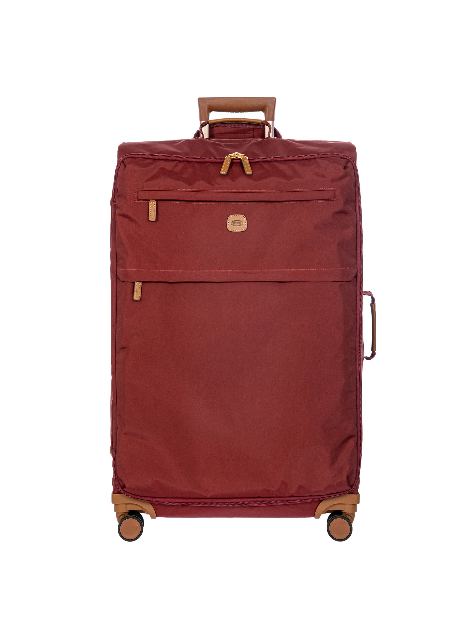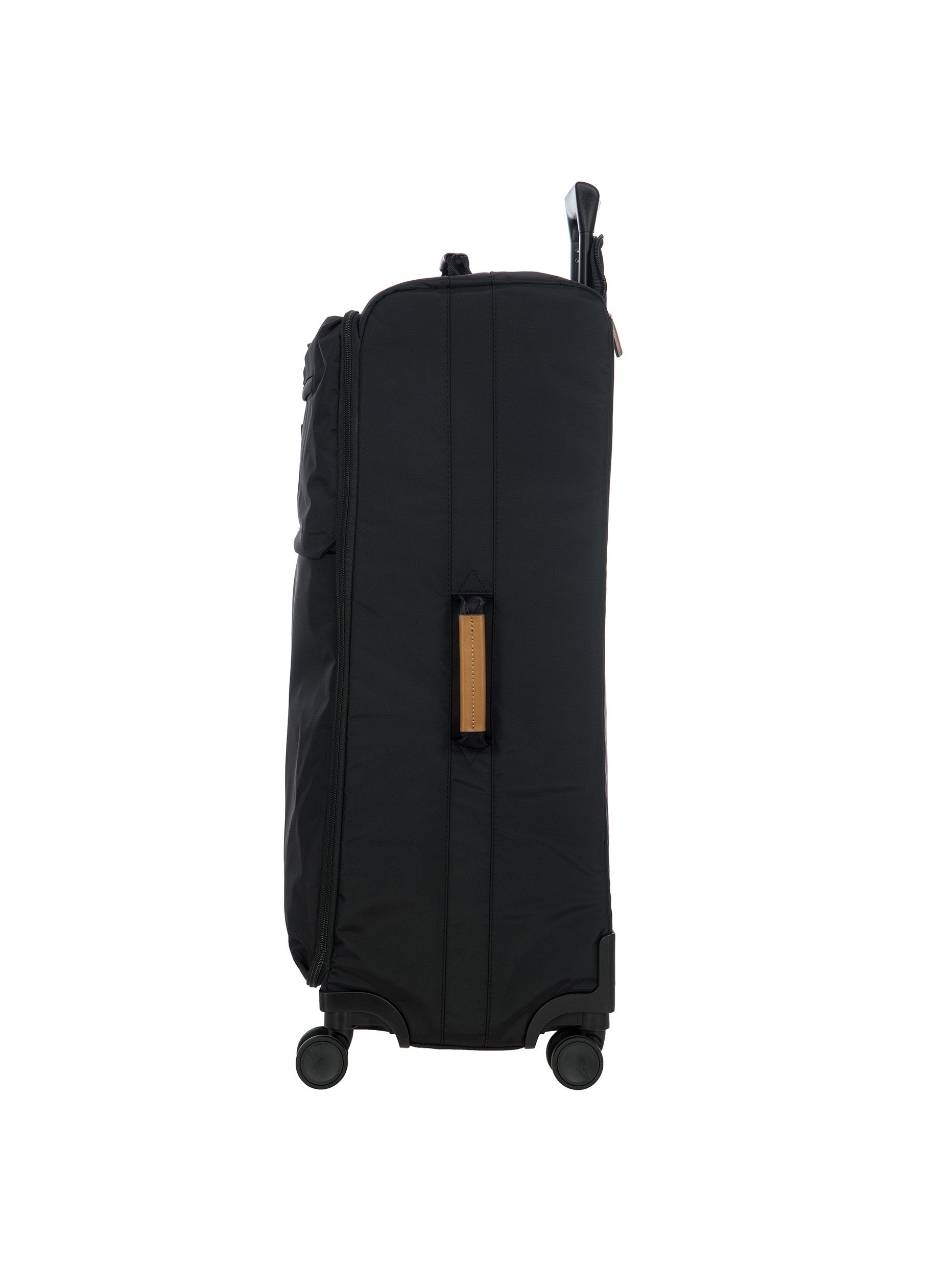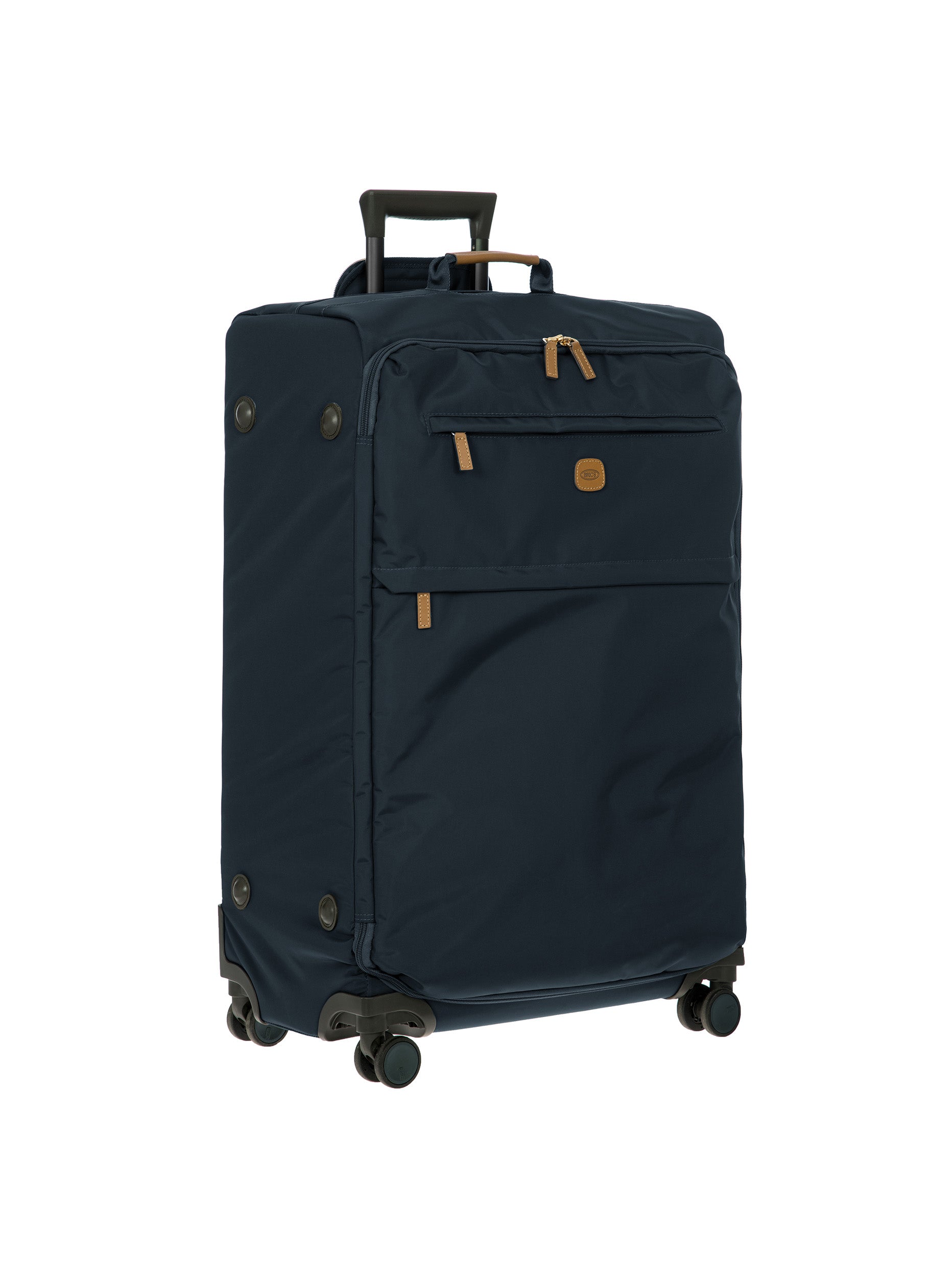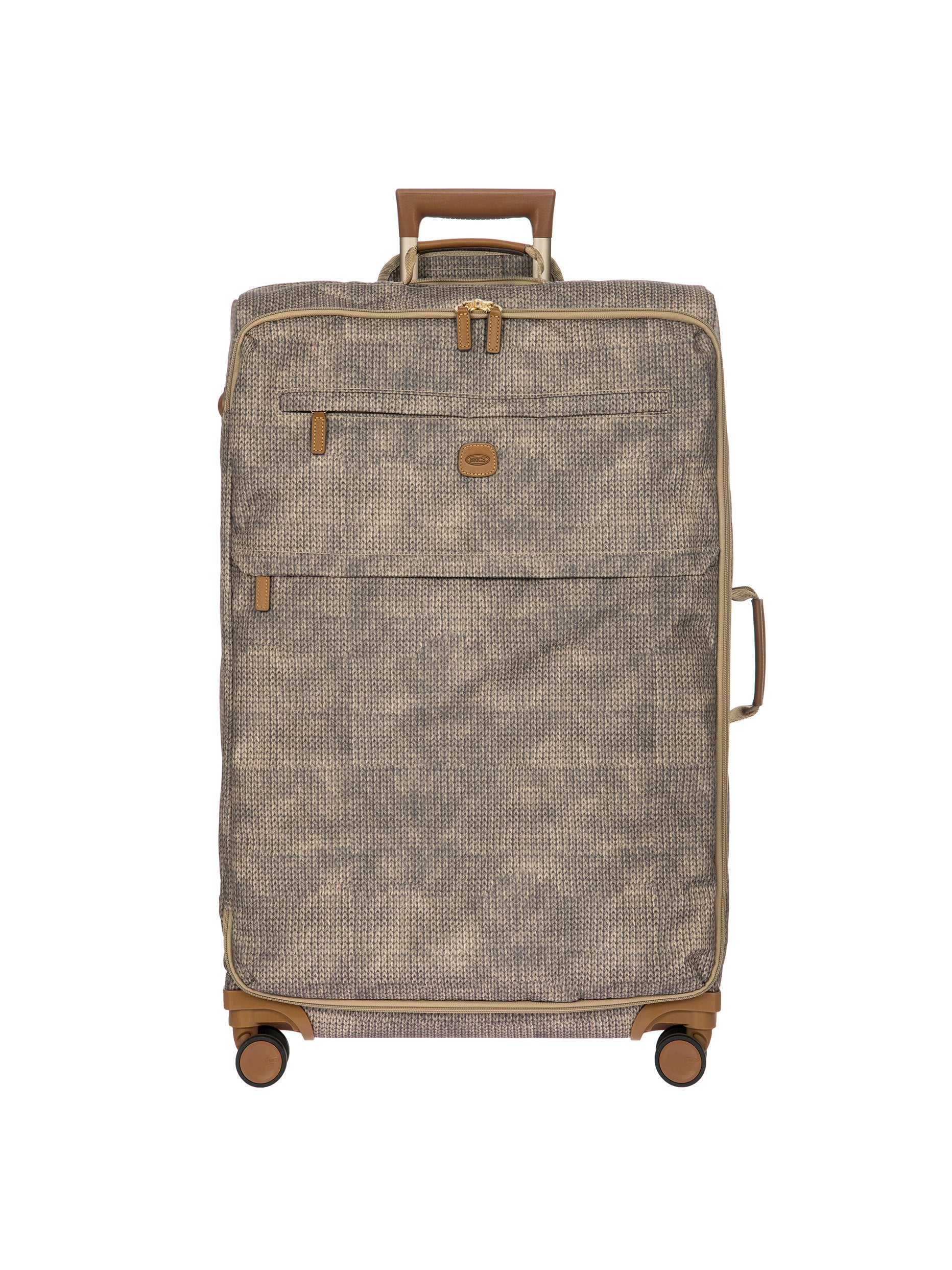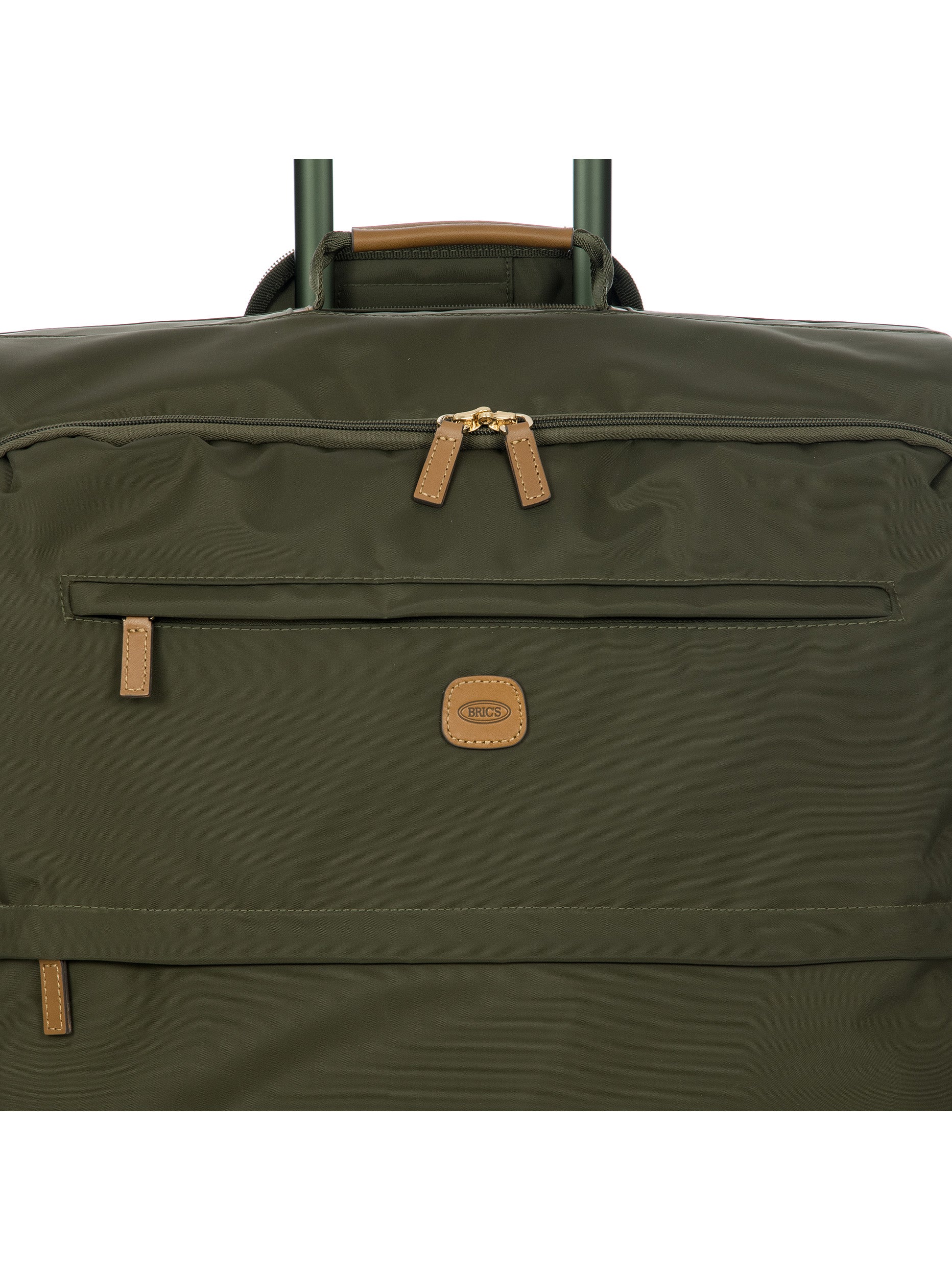 The 77 cm XL Trolley from the X-Collection is made of durable recycled fabric, water-resistant, with a rigid and lightweight internal structure. The main compartment is equipped with a zip with two sliders. It also includes two zipped front pockets, interior pockets and straps to help you organise your belongings. The wheels swivel to ensure smooth 360° movement, and are recessed to maximise the internal capacity of the trolley bag. Complete with an address tag and rings for a padlock (sold separately). The trolley bag features a padded handle on the top, four double silent wheels with bearings, sturdy and stable aluminium tubes, and an ergonomic handle for complete comfort. Finished with genuine leather details, one of Bric's signature design elements, and the brand's logo.