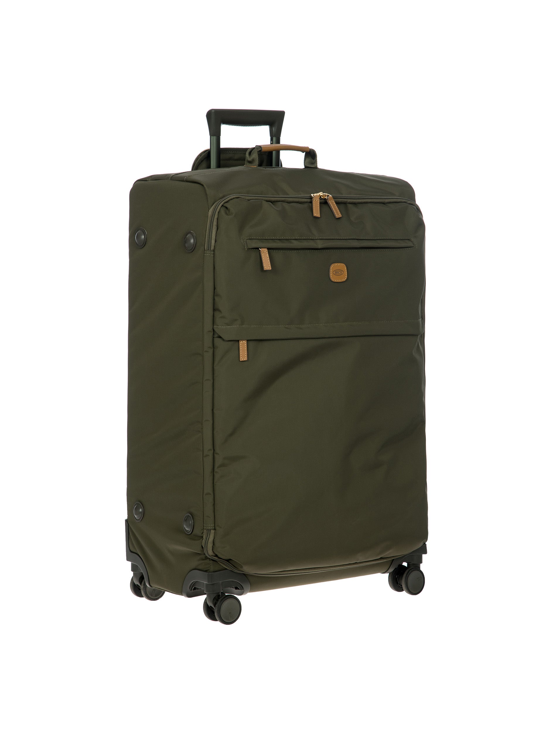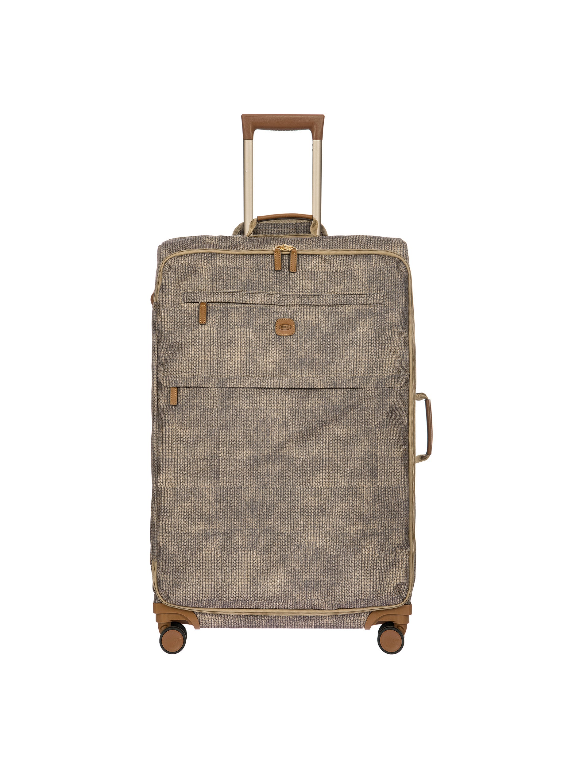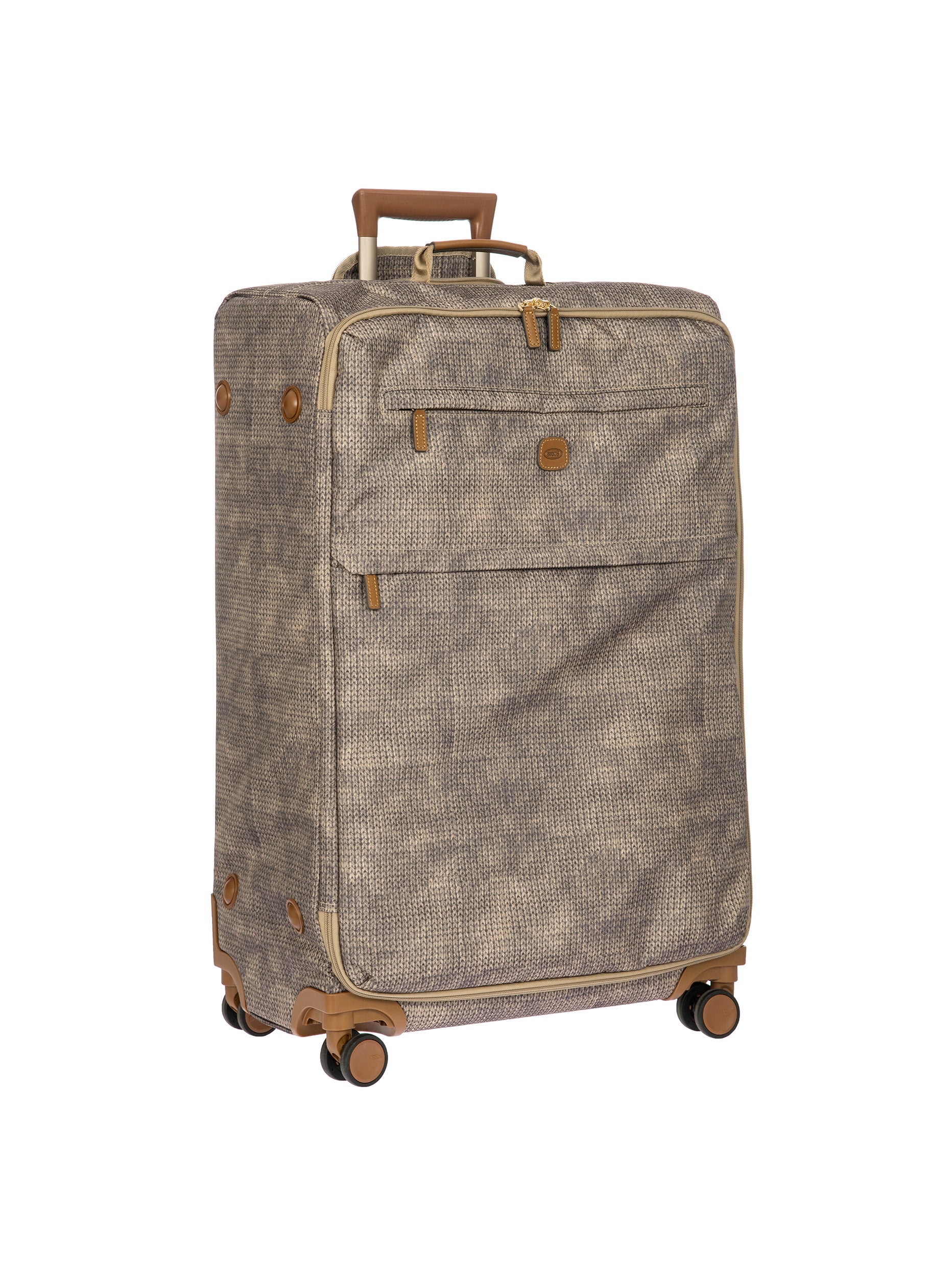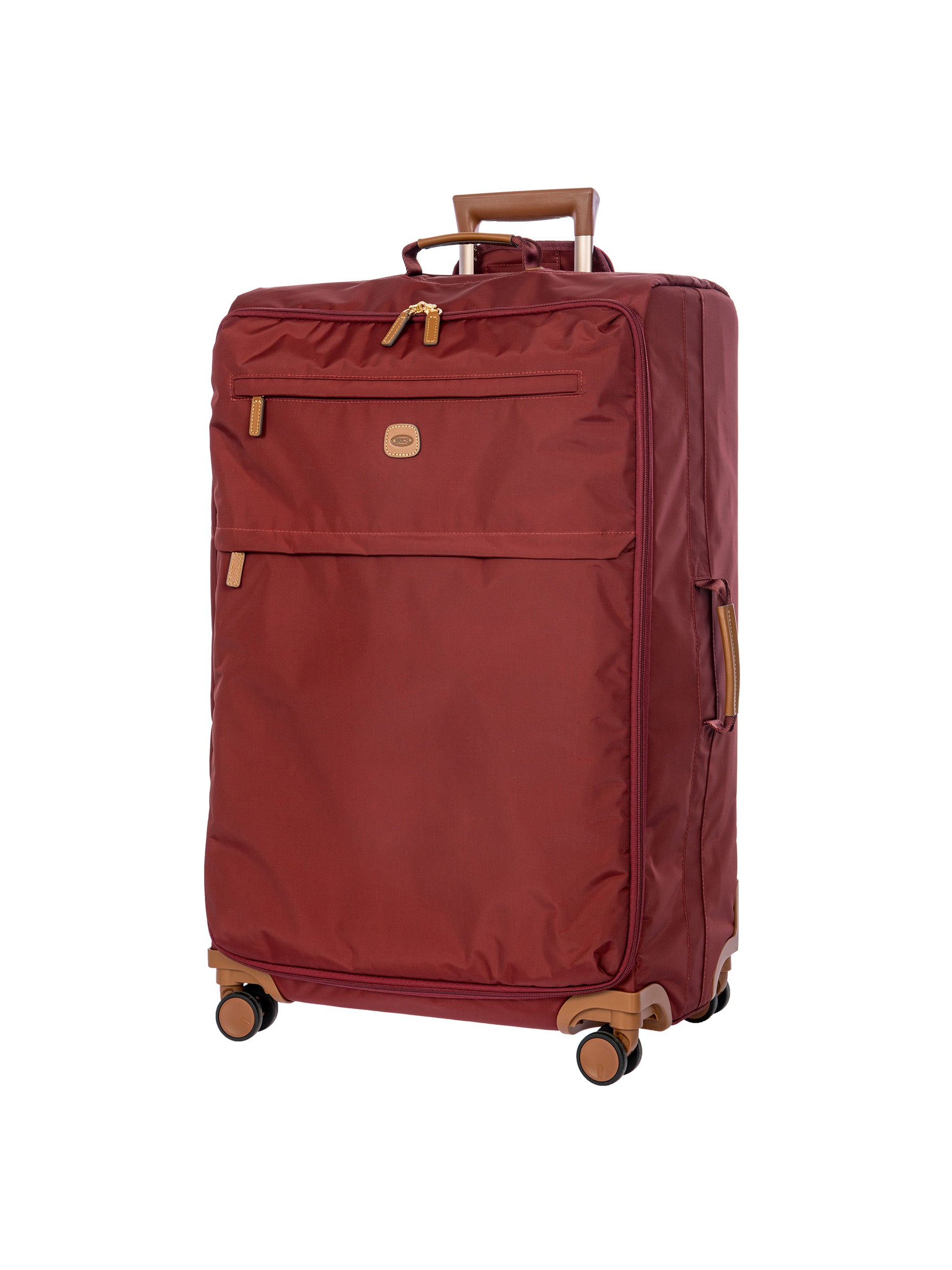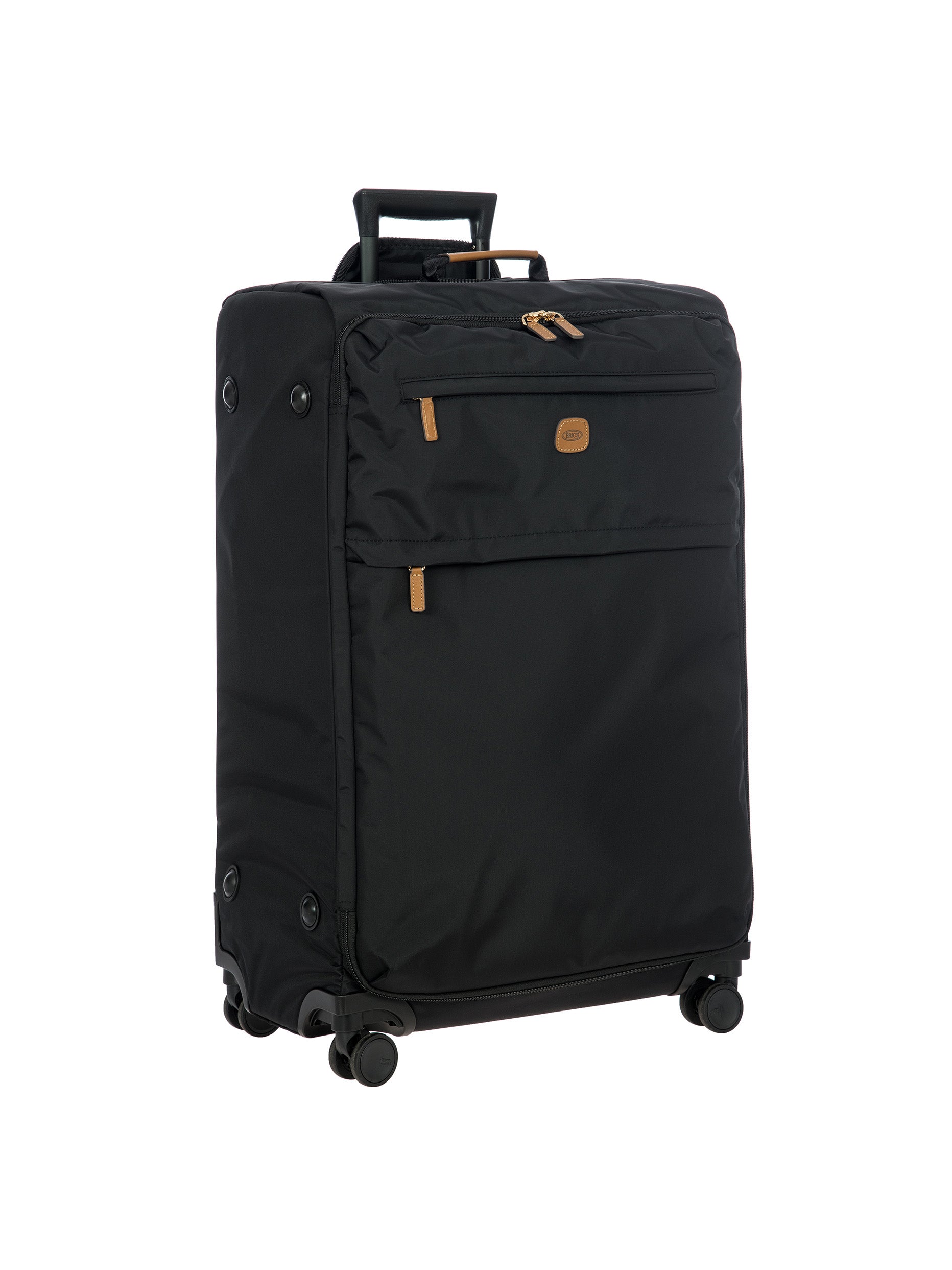 The 77 cm XL Trolley from the X-Collection is made of durable recycled fabric, water-resistant, with a rigid and lightweight internal structure. The main compartment is equipped with a zip with two sliders. It also includes two zipped front pockets, interior pockets and straps to help you organise your belongings. The wheels swivel to ensure smooth 360° movement, and are recessed to maximise the internal capacity of the trolley bag. Complete with an address tag and rings for a padlock (sold separately). The trolley bag features a padded handle on the top, four double silent wheels with bearings, sturdy and stable aluminium tubes, and an ergonomic handle for complete comfort. Finished with genuine leather details, one of Bric's signature design elements, and the brand's logo.