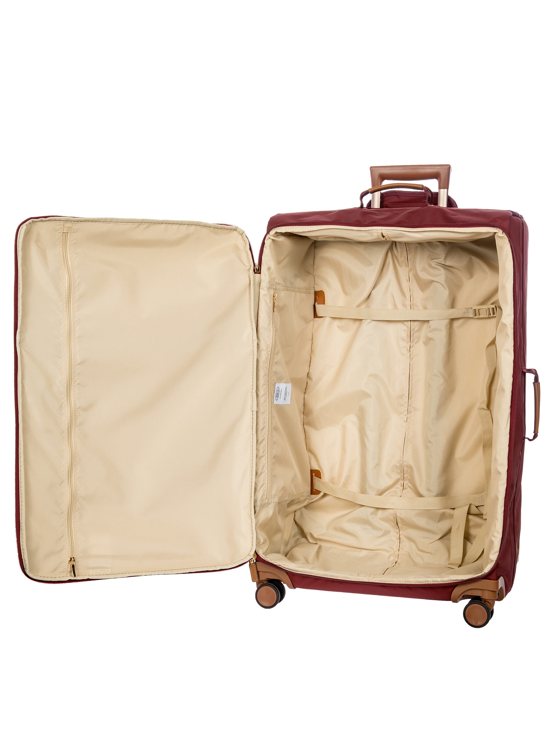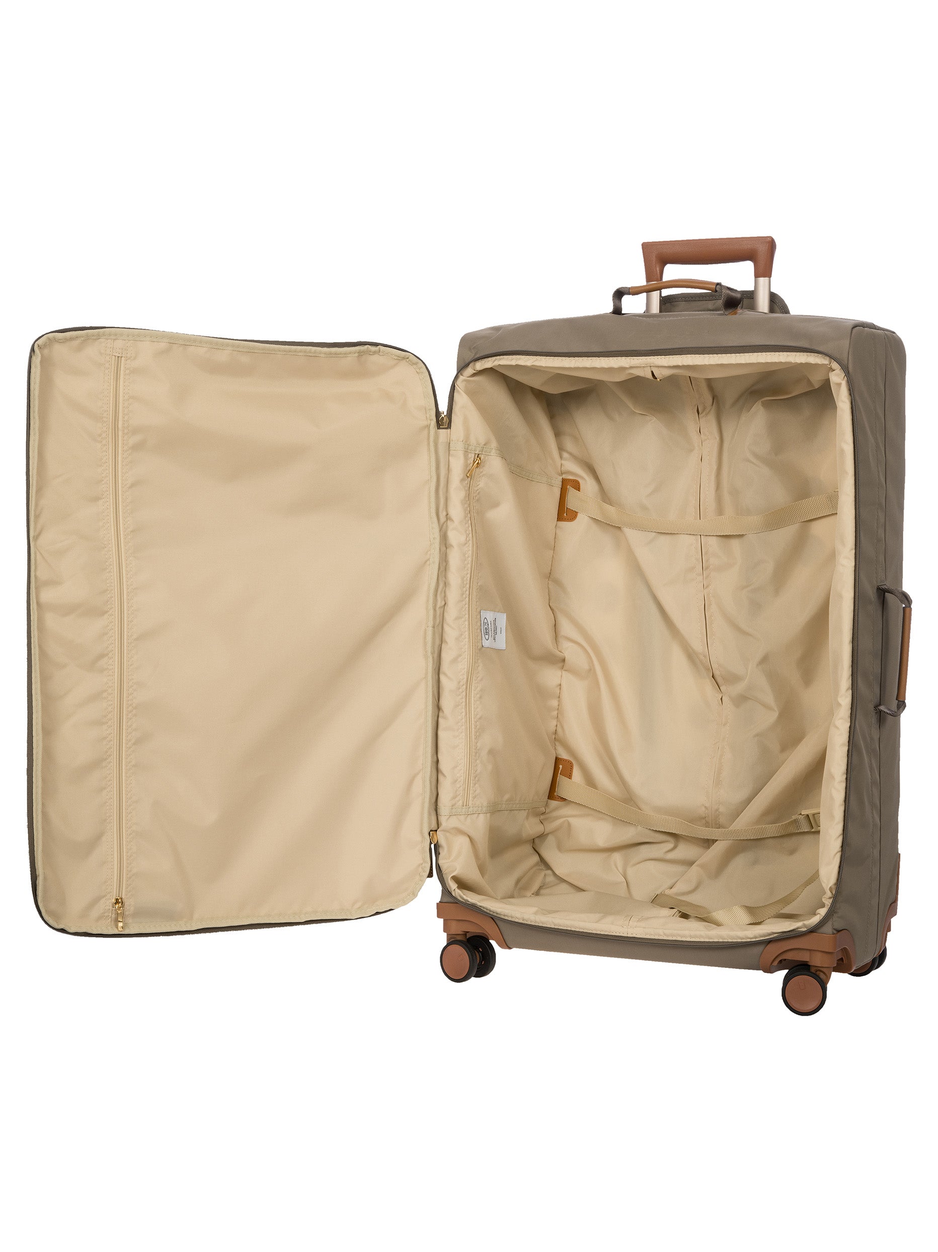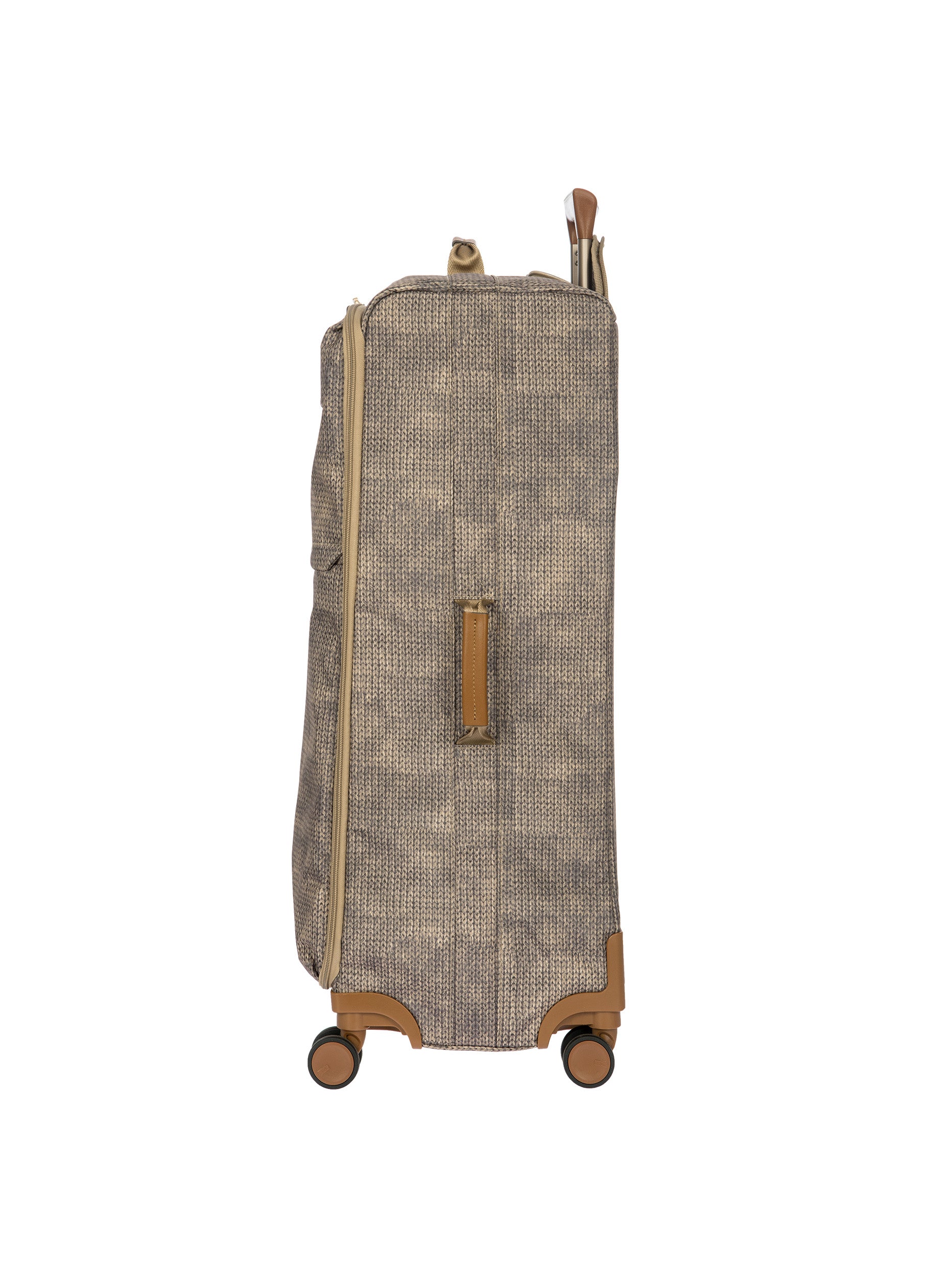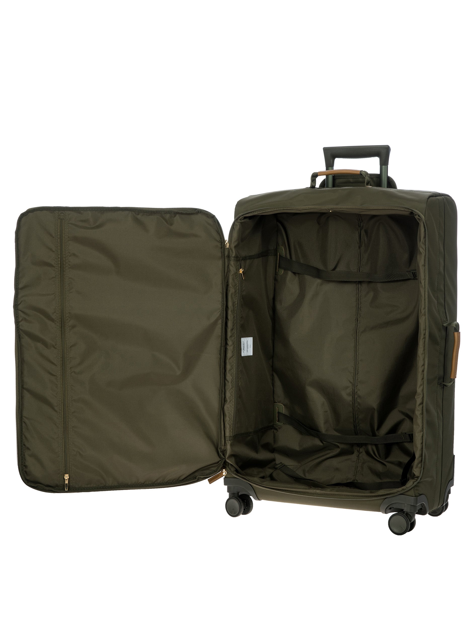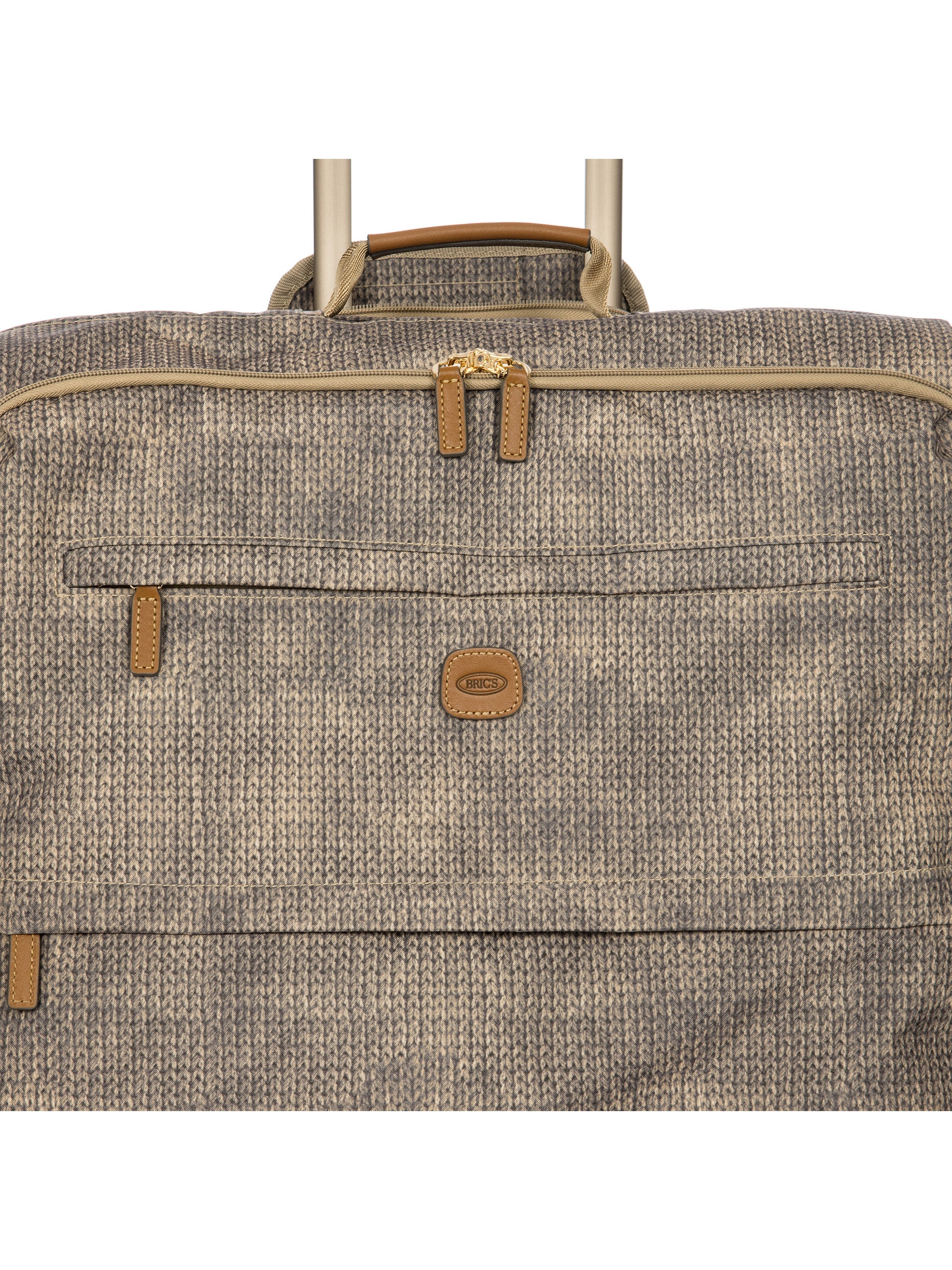 The 77 cm XL Trolley from the X-Collection is made of durable recycled fabric, water-resistant, with a rigid and lightweight internal structure. The main compartment is equipped with a zip with two sliders. It also includes two zipped front pockets, interior pockets and straps to help you organise your belongings. The wheels swivel to ensure smooth 360° movement, and are recessed to maximise the internal capacity of the trolley bag. Complete with an address tag and rings for a padlock (sold separately). The trolley bag features a padded handle on the top, four double silent wheels with bearings, sturdy and stable aluminium tubes, and an ergonomic handle for complete comfort. Finished with genuine leather details, one of Bric's signature design elements, and the brand's logo.