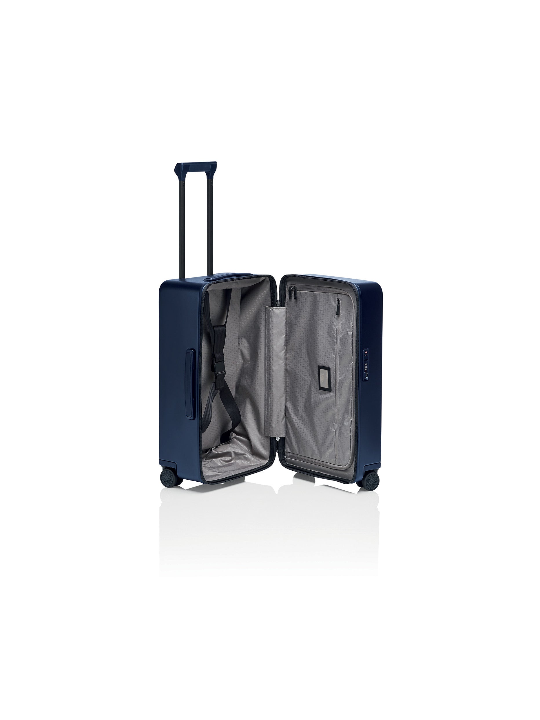 Ball bearing, smooth-rolling wheels in the style of Porsche Taycan rims and a multi-step telescopic, ergonomic handle provide for the perfect performance. Through the rounded edges of the handle, laptop cases and other bags can be easily attached and removed. The divided interior is lined with tear-resistant fabric in the PD-Icon design - and it is protected through an ultra-secure two-way zipper and a TSA lock.