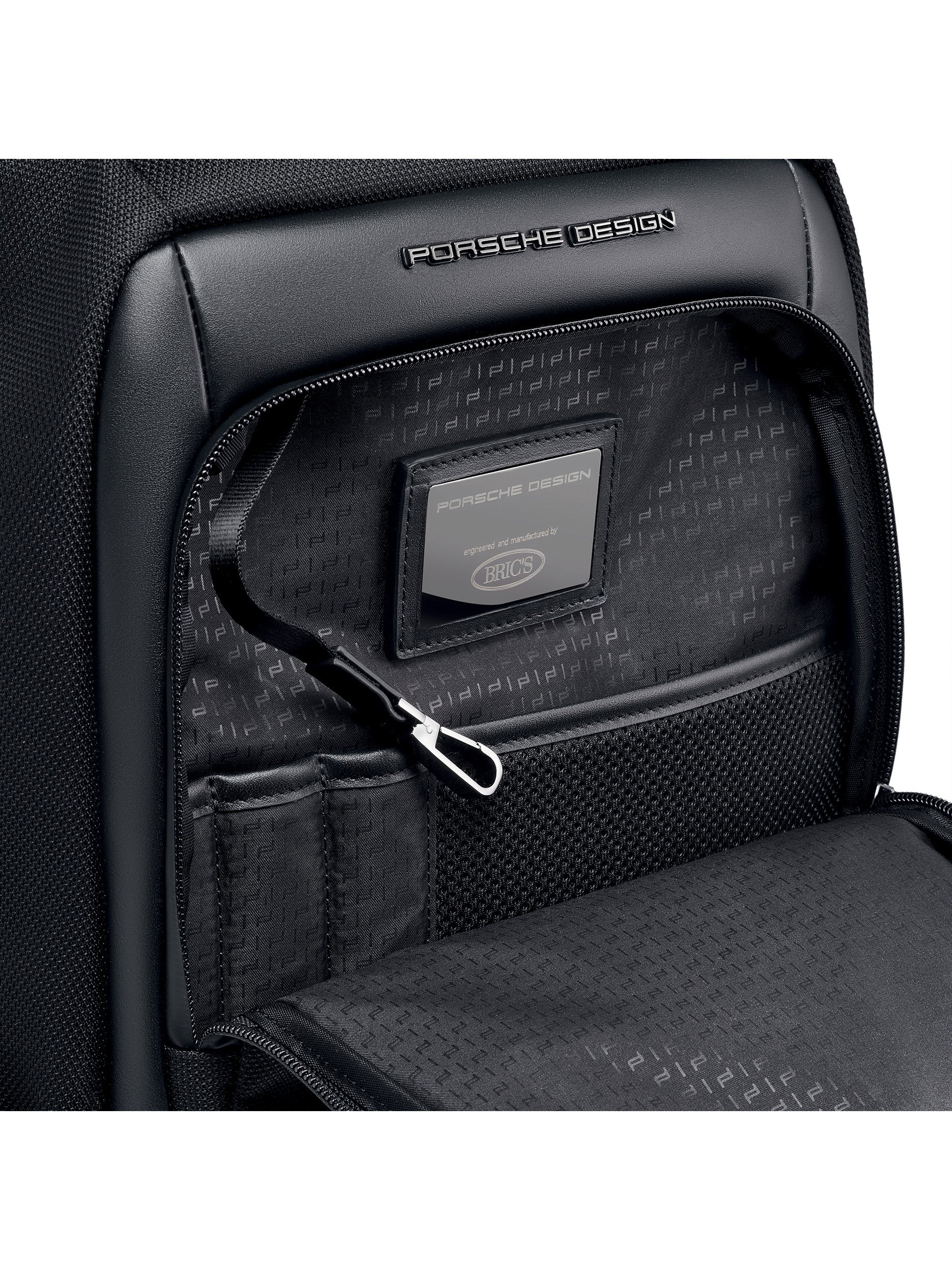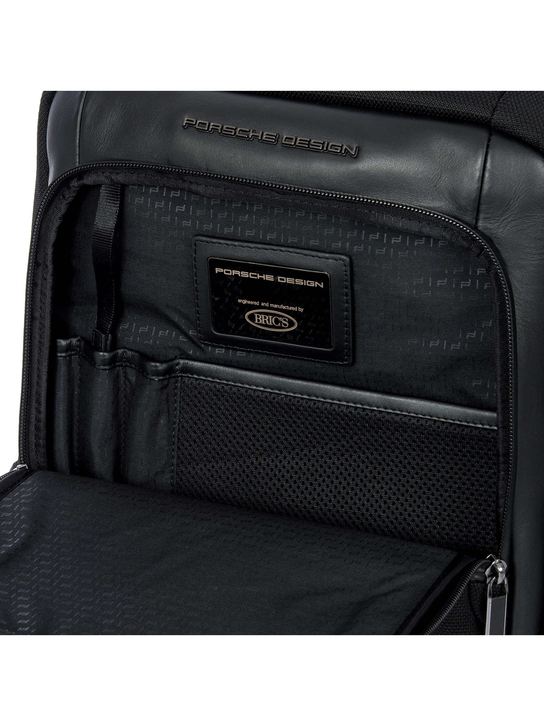 Porsche Design technical nylon fabric with PVC backing, with genuine calf leather and metal details. Lining: polyester fabric with heat printed Porsche Design icon logo on black color.. Clean delicately the stained area with a so and dry cloth. In case of greasy or persistent stain, use a small quantity of gentle degreaser. Do not use benzene or alcohol based products. Avoid ironing.