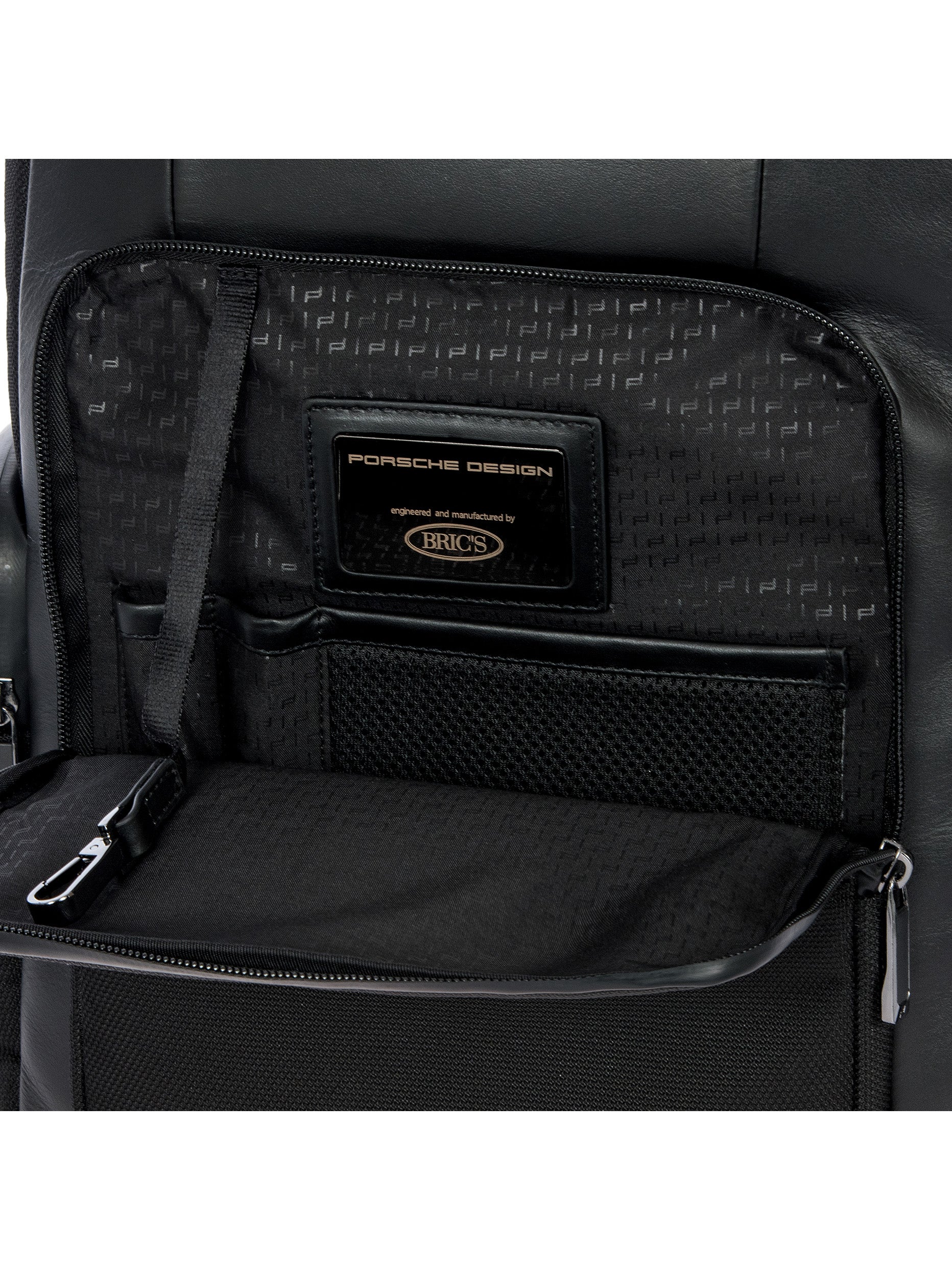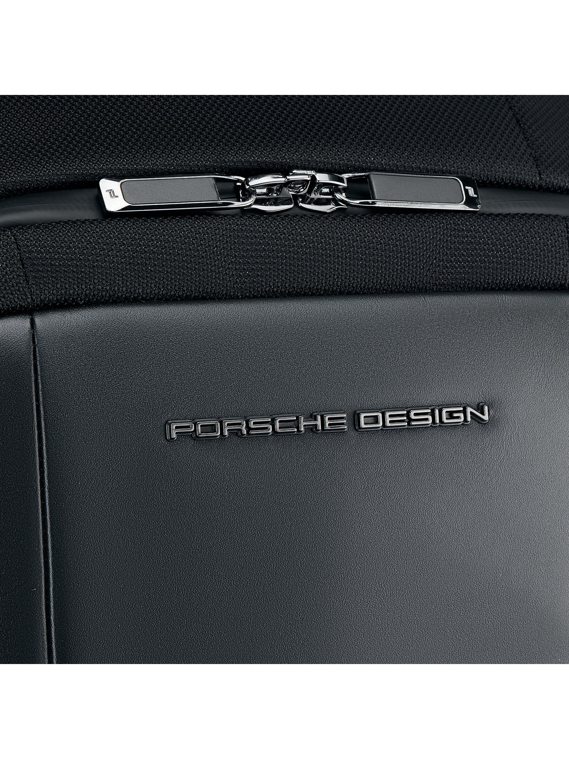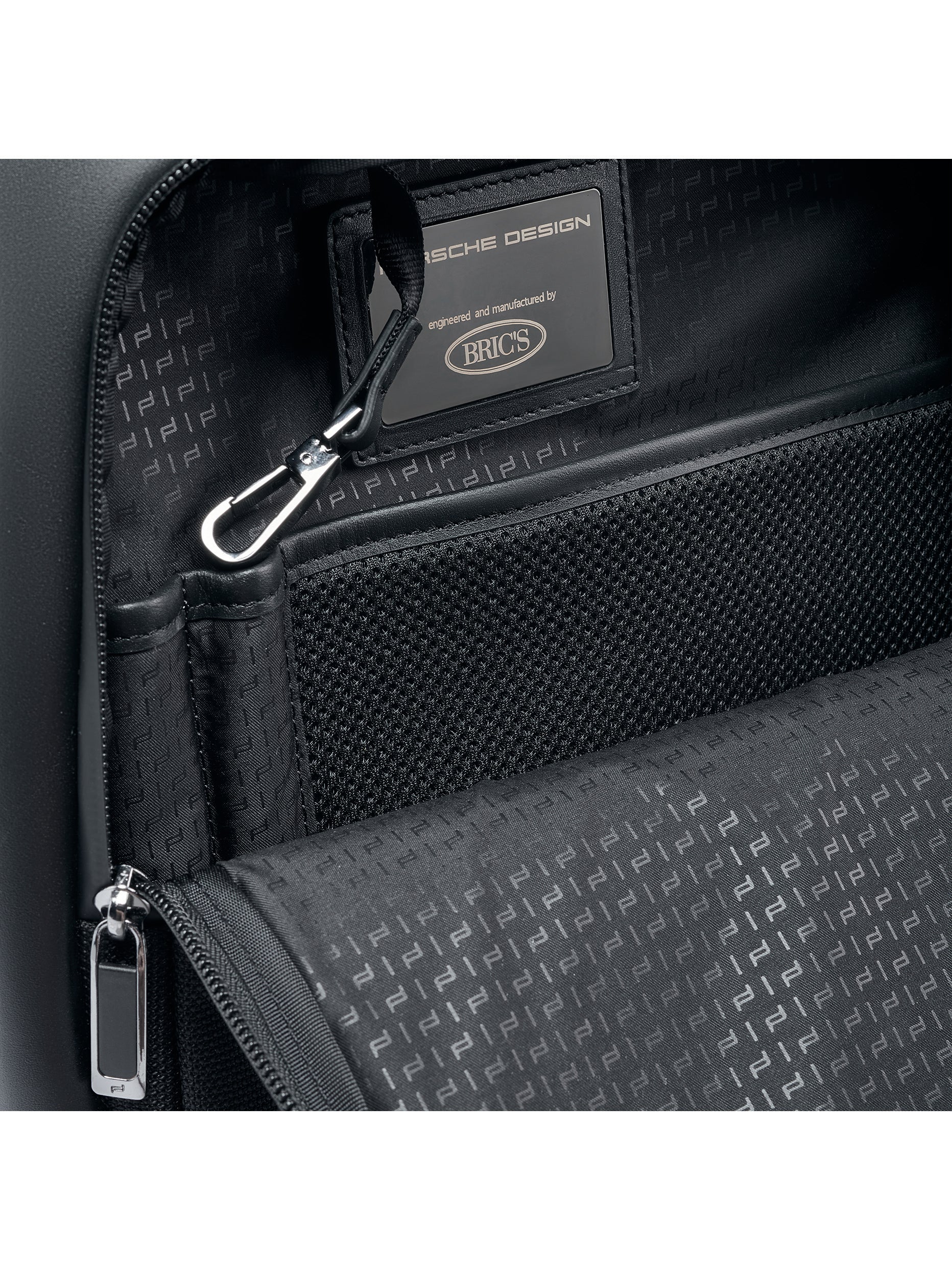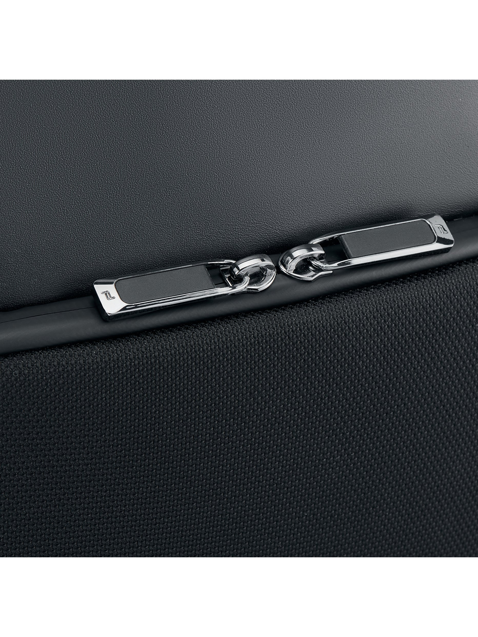 Porsche Design technical nylon fabric with PVC backing, with genuine calf leather and metal details. Lining: polyester fabric with heat printed Porsche Design icon logo on black color.. Clean delicately the stained area with a so and dry cloth. In case of greasy or persistent stain, use a small quantity of gentle degreaser. Do not use benzene or alcohol based products. Avoid ironing.