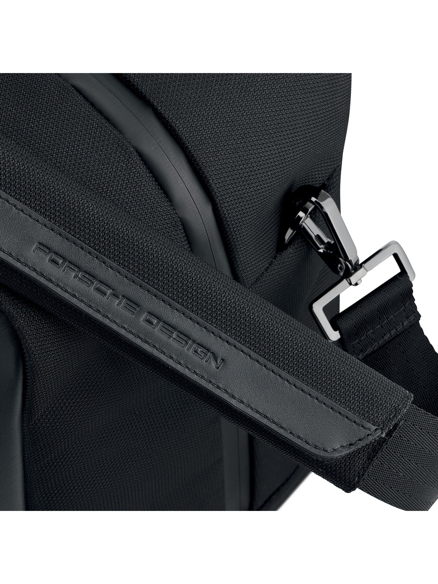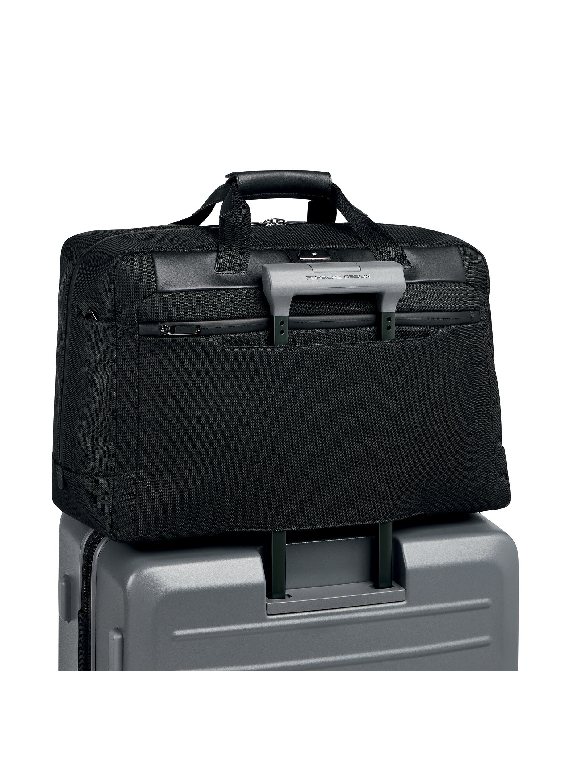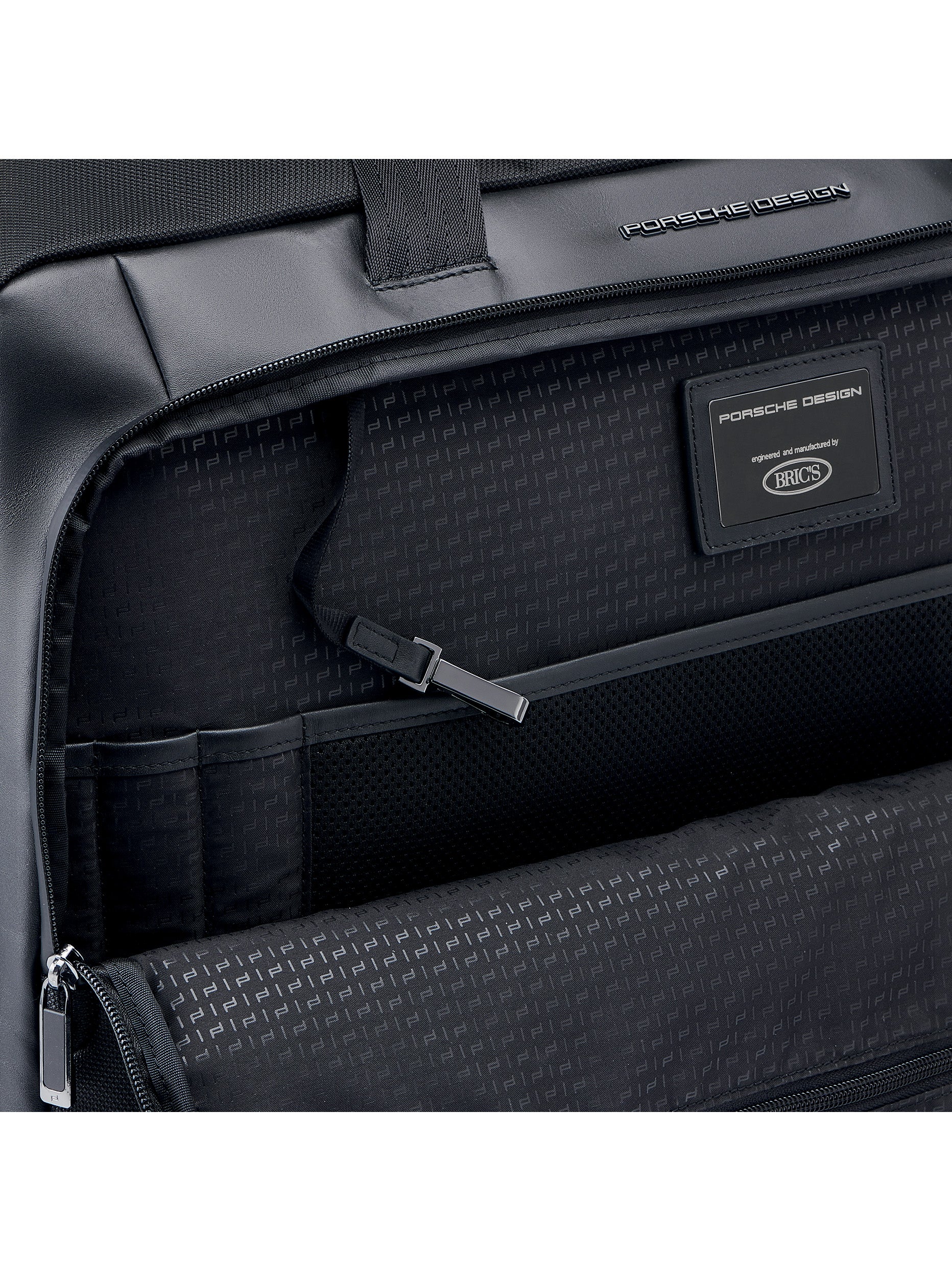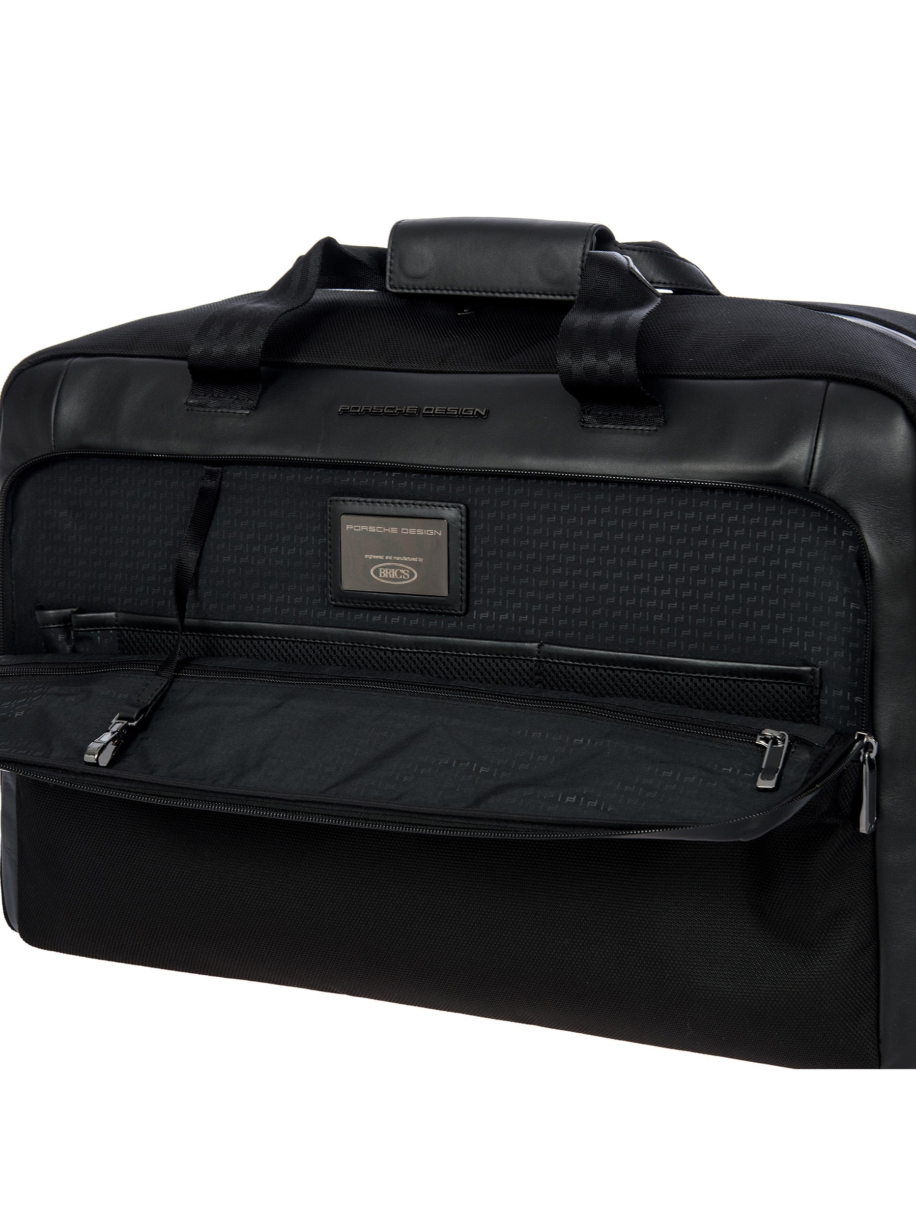 The Porsche Design Roadster Nylon collection convinces through intelligent functionality and an exclusive technical design. The combination of structured water-repellent nylon and significant smooth leather details makes the Porsche Design Nylon Weekender an optical highlight - and extremely durable. Just like all bags and backpacks from this series, the construction was exactly matched to the needs of modern, dynamic day-to-day business. The main compartment has additional zipper pockets inside.