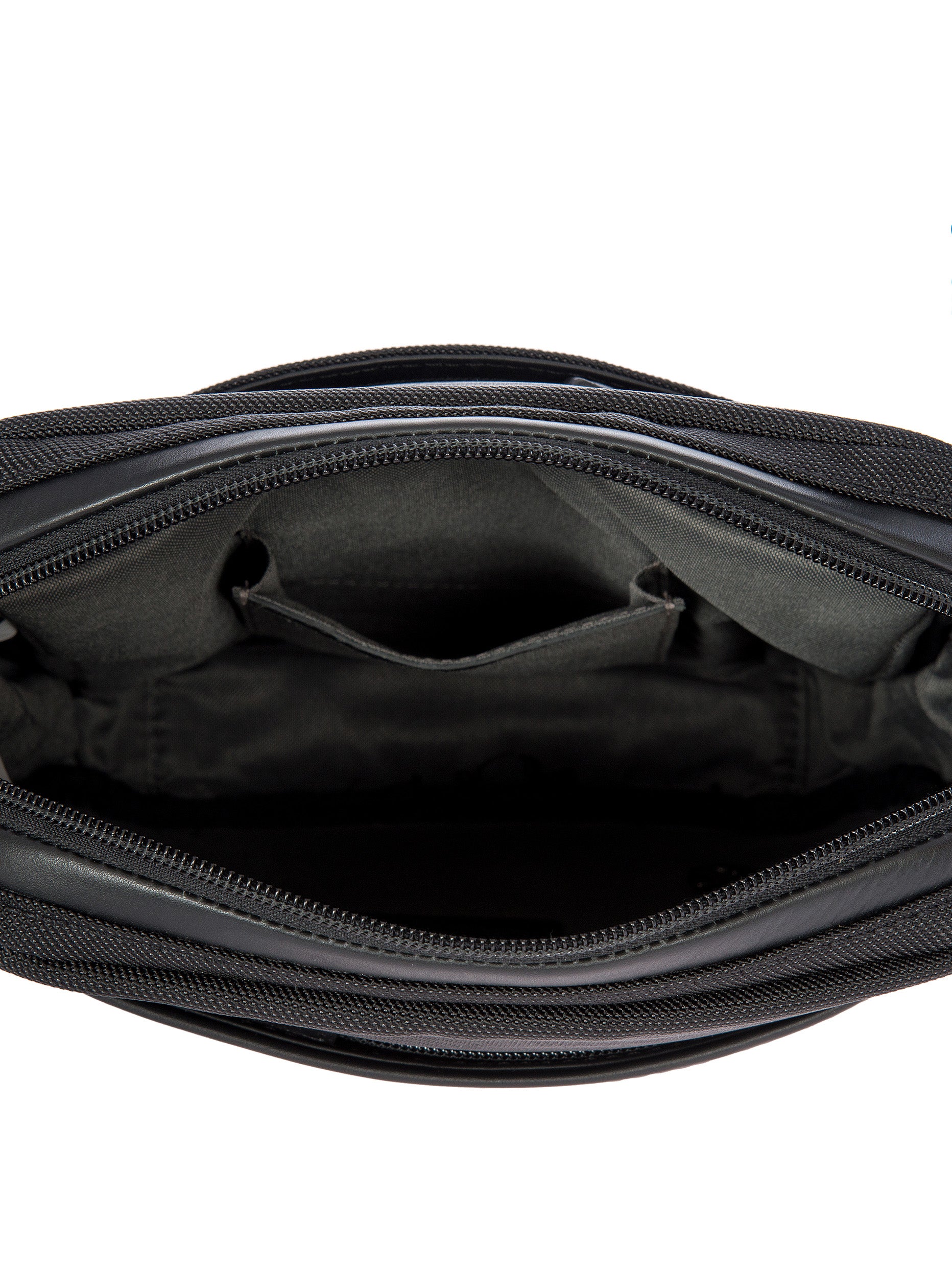 This shoulder bag with detachable strap from the Monza collection, made with leather and technical nylon fabric, is the perfect accessory for organising your everyday essentials. All the carefully organised storage spaces allow you to store your personal items in a very effective and efficient way.
