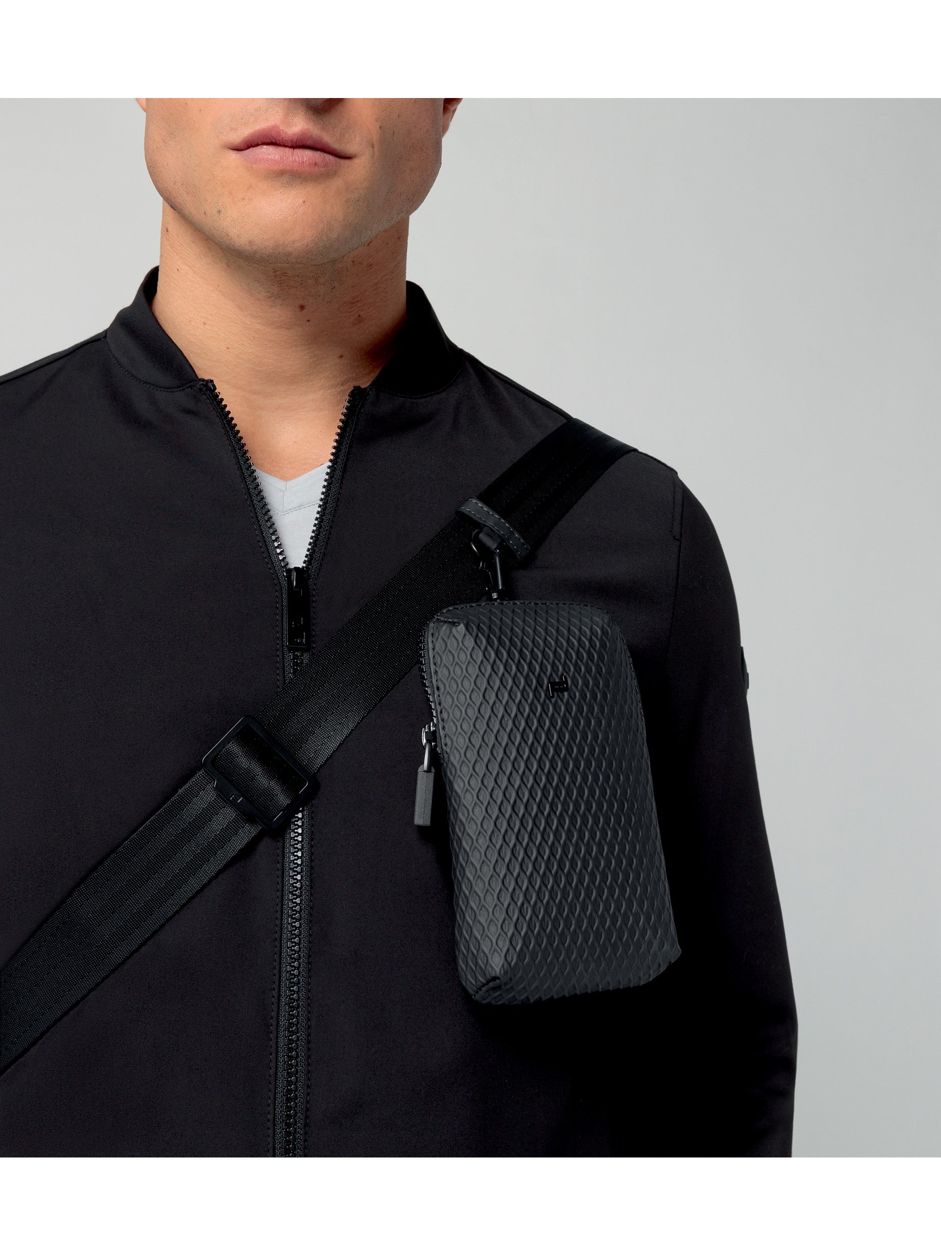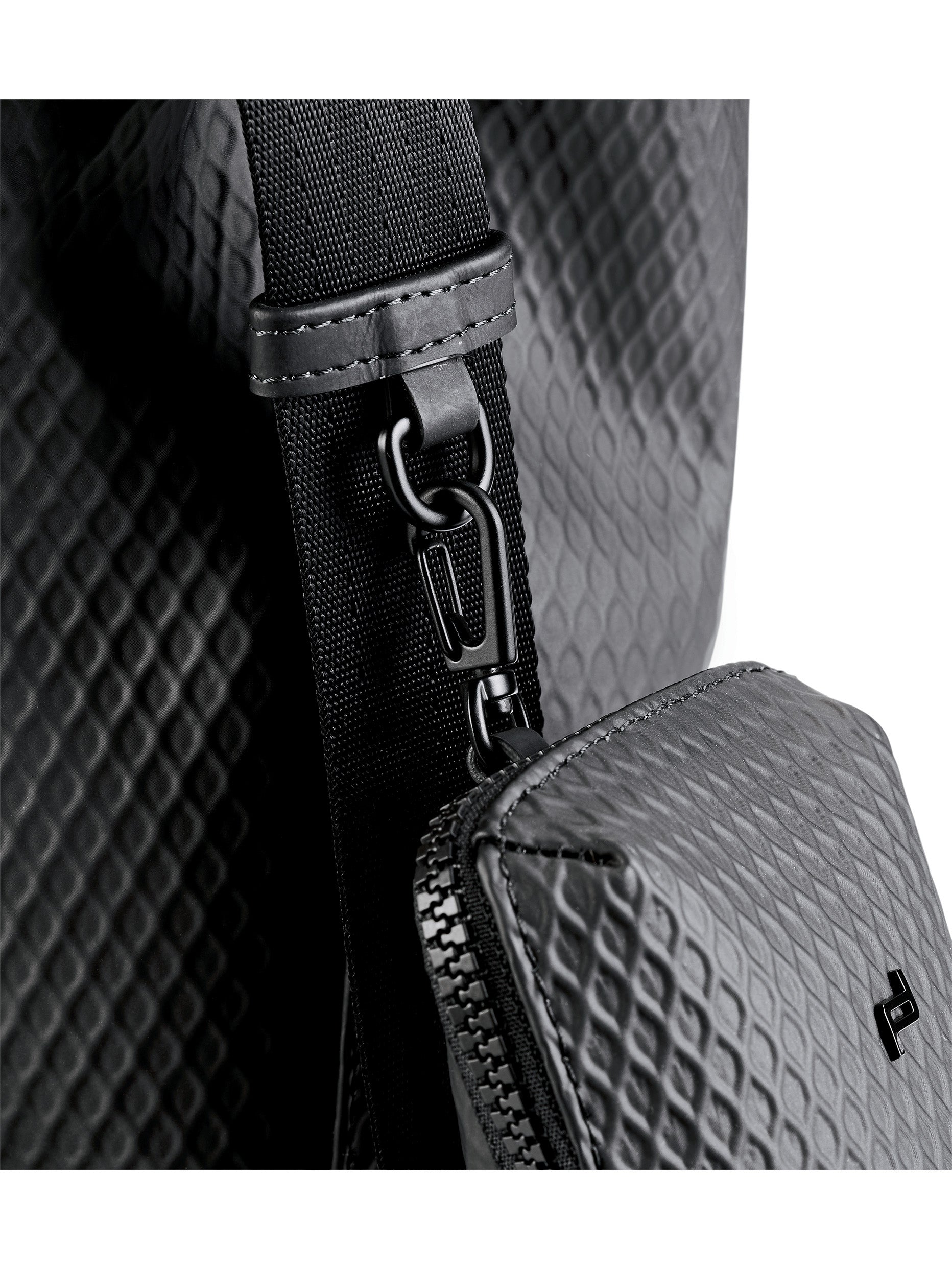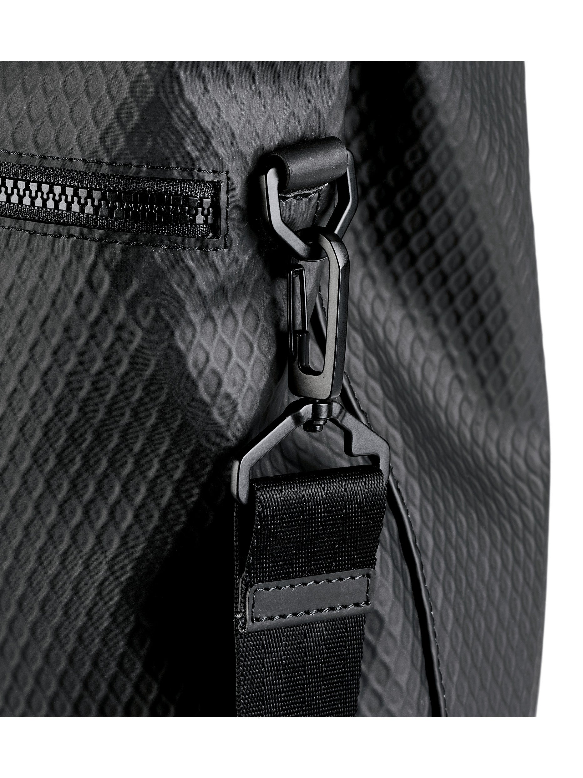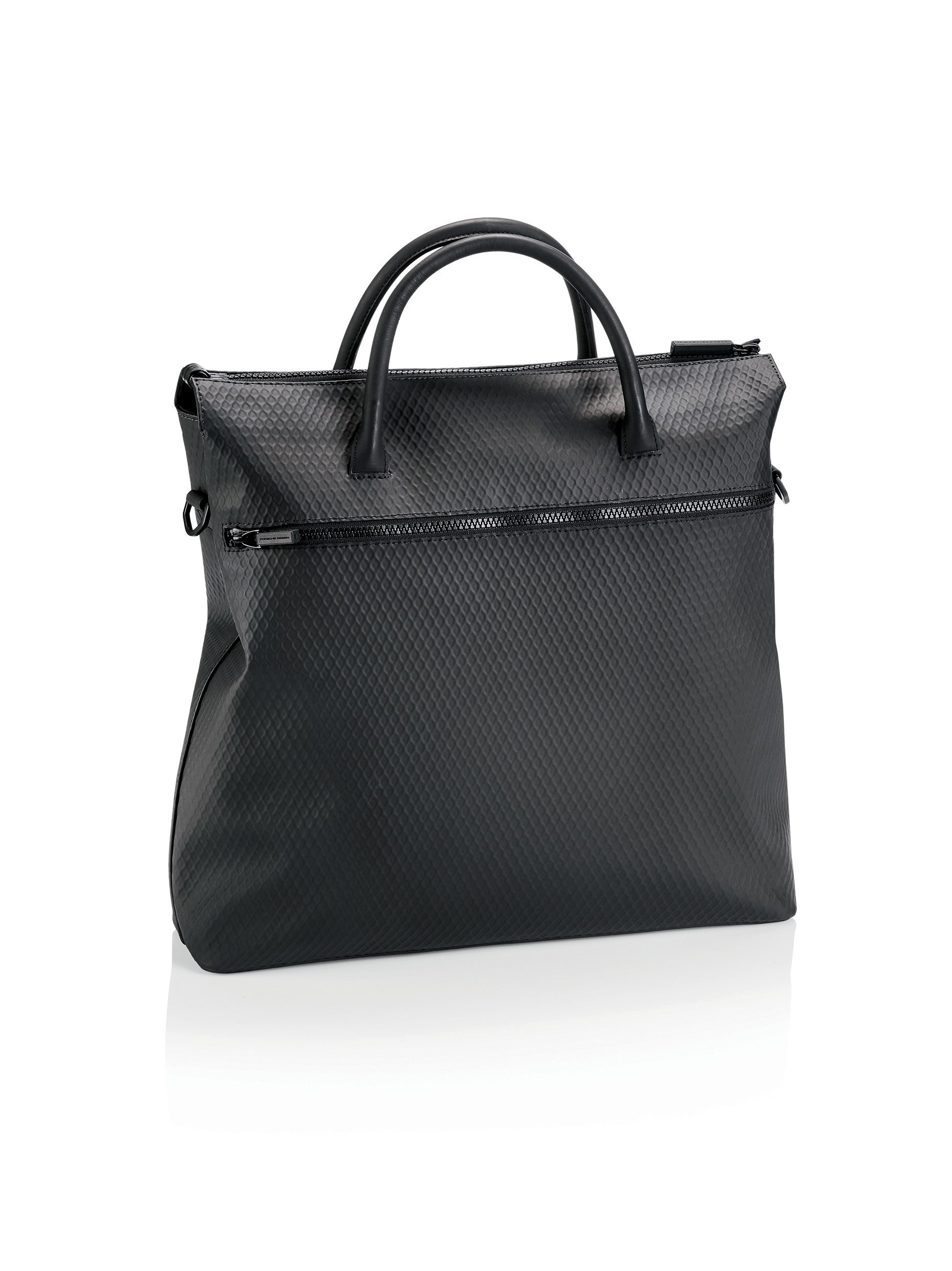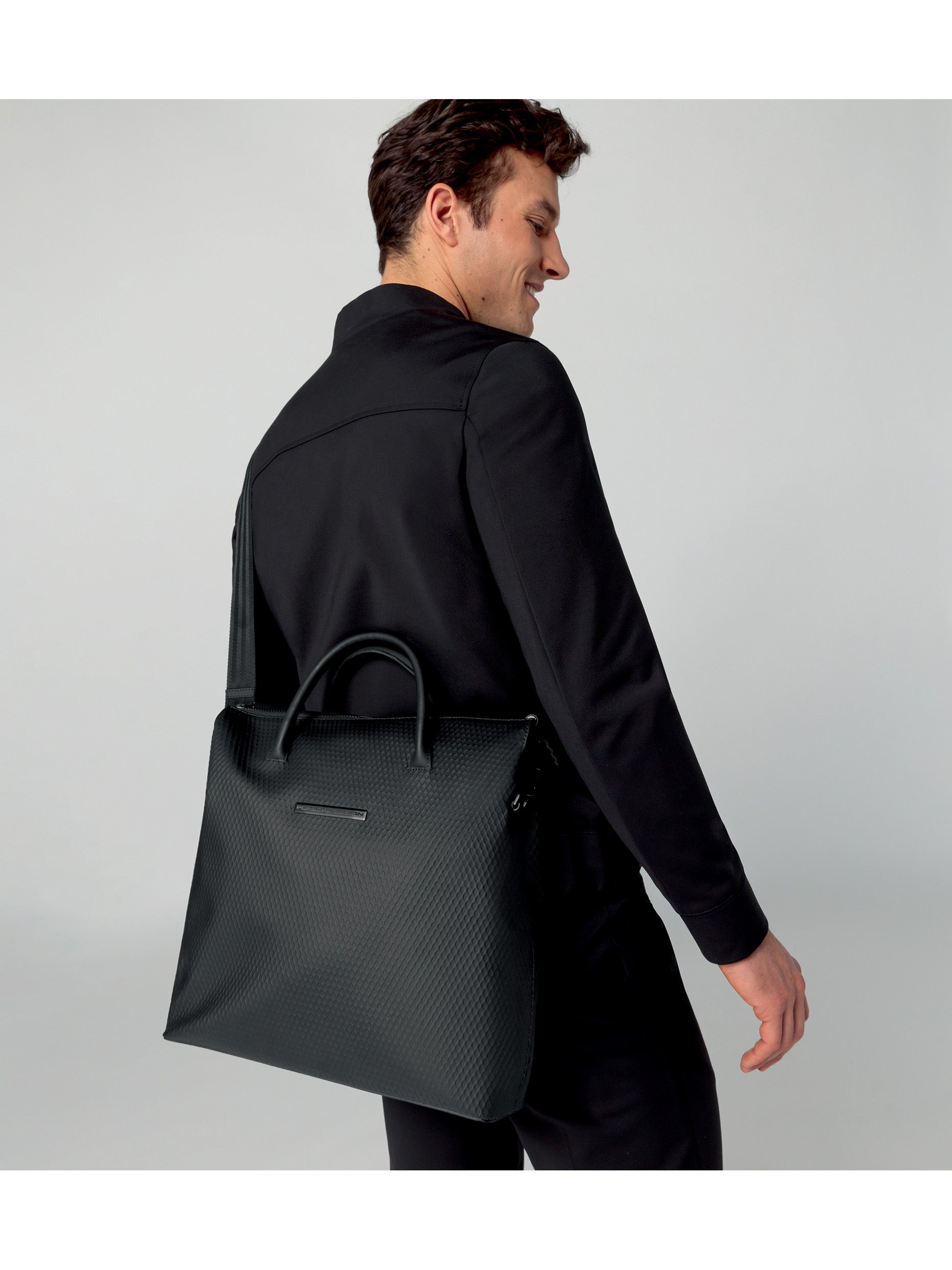 With its minimalist, stylish fully Black design and the high-quality honeycomb material, the Studio series makes a clear statement. The tote bag is perfect for business and leisure. Its easily accessible main compartment with a zipped divider, a padded laptop compartment and an additional zipped pocket on the back all provide plenty of storage space. There is also a separate small pouch that can be attached to a ring on the shoulder strap in no time at all – ideal for storing valuables such as smartphones or keys.