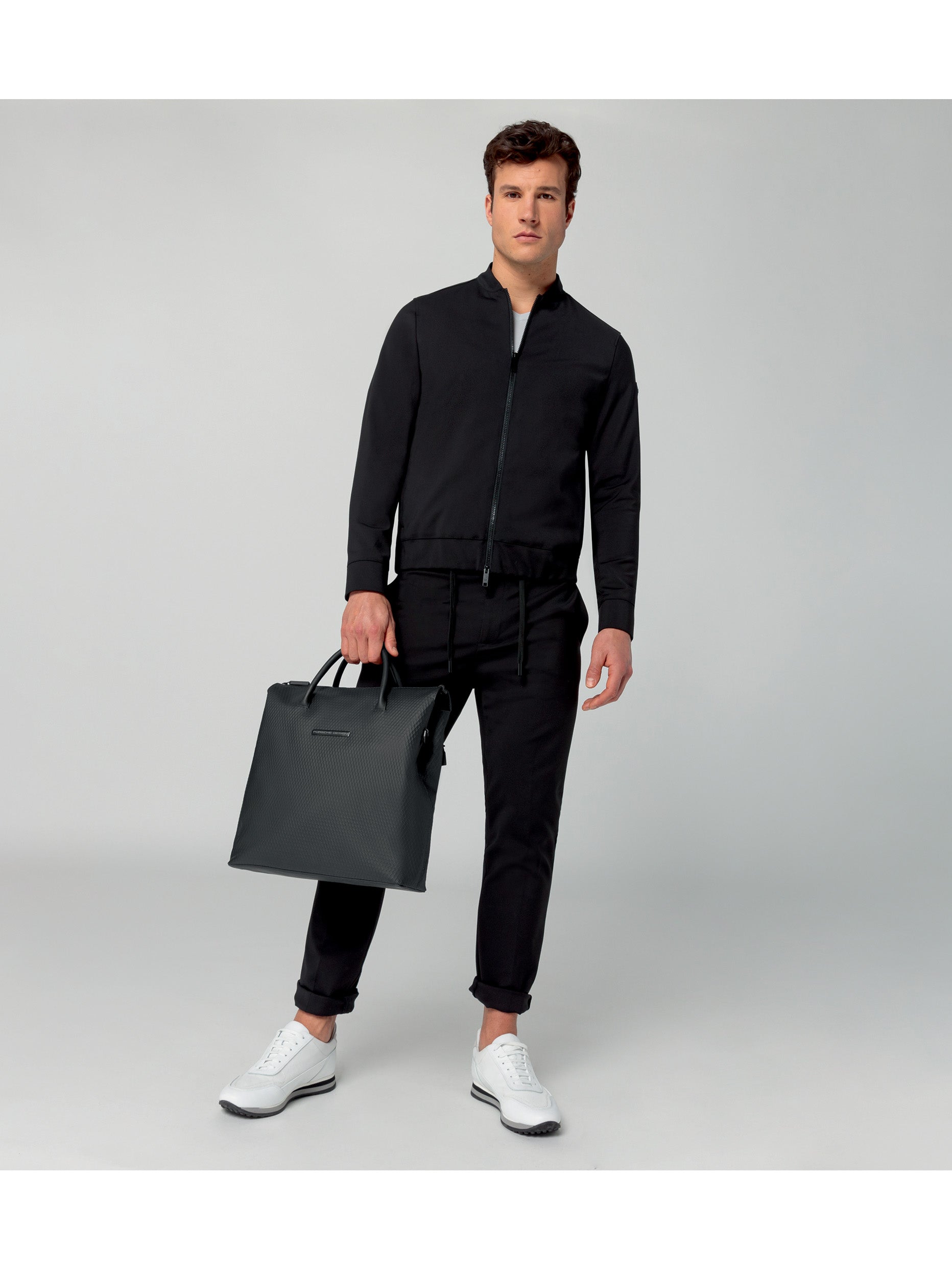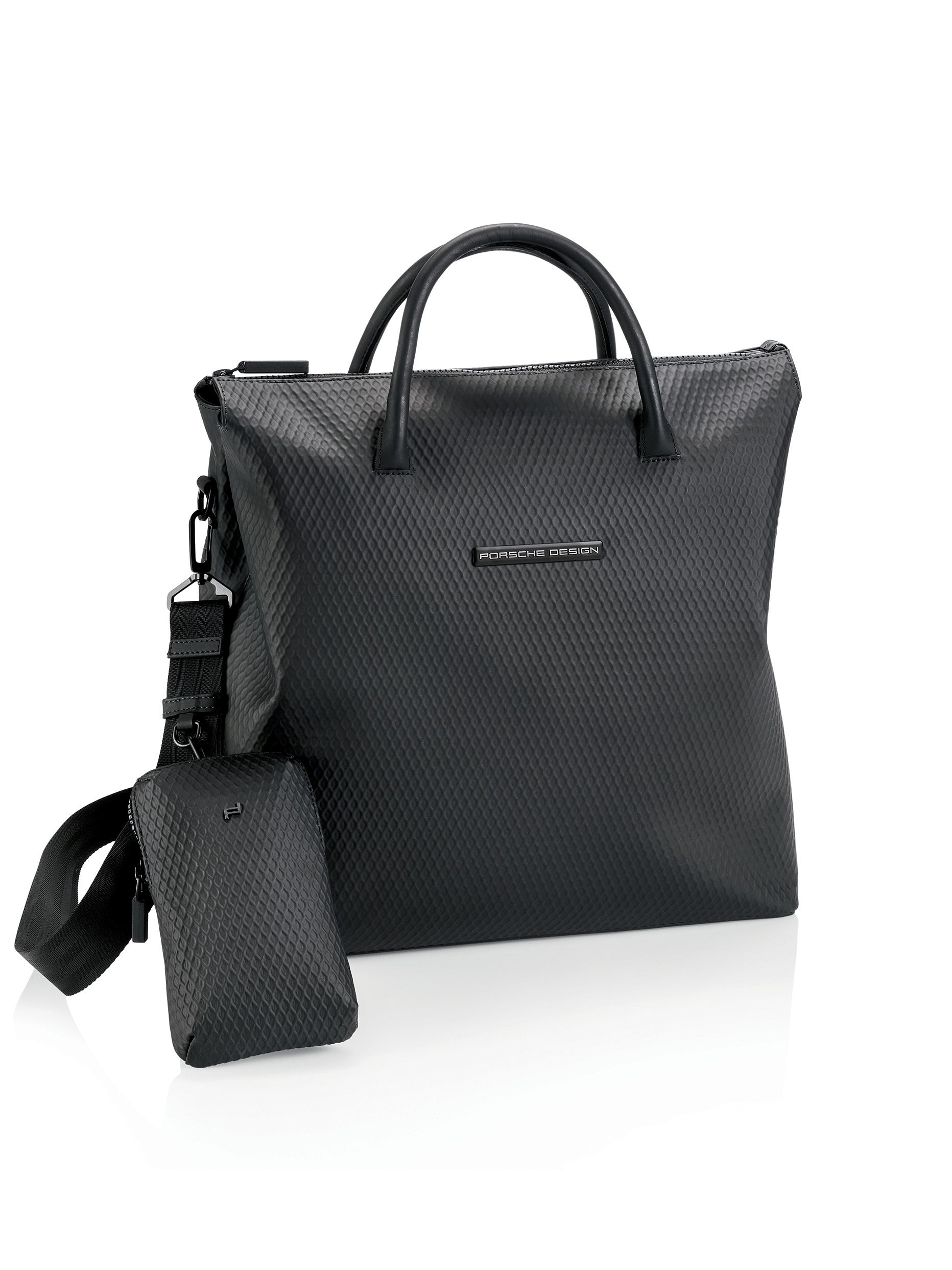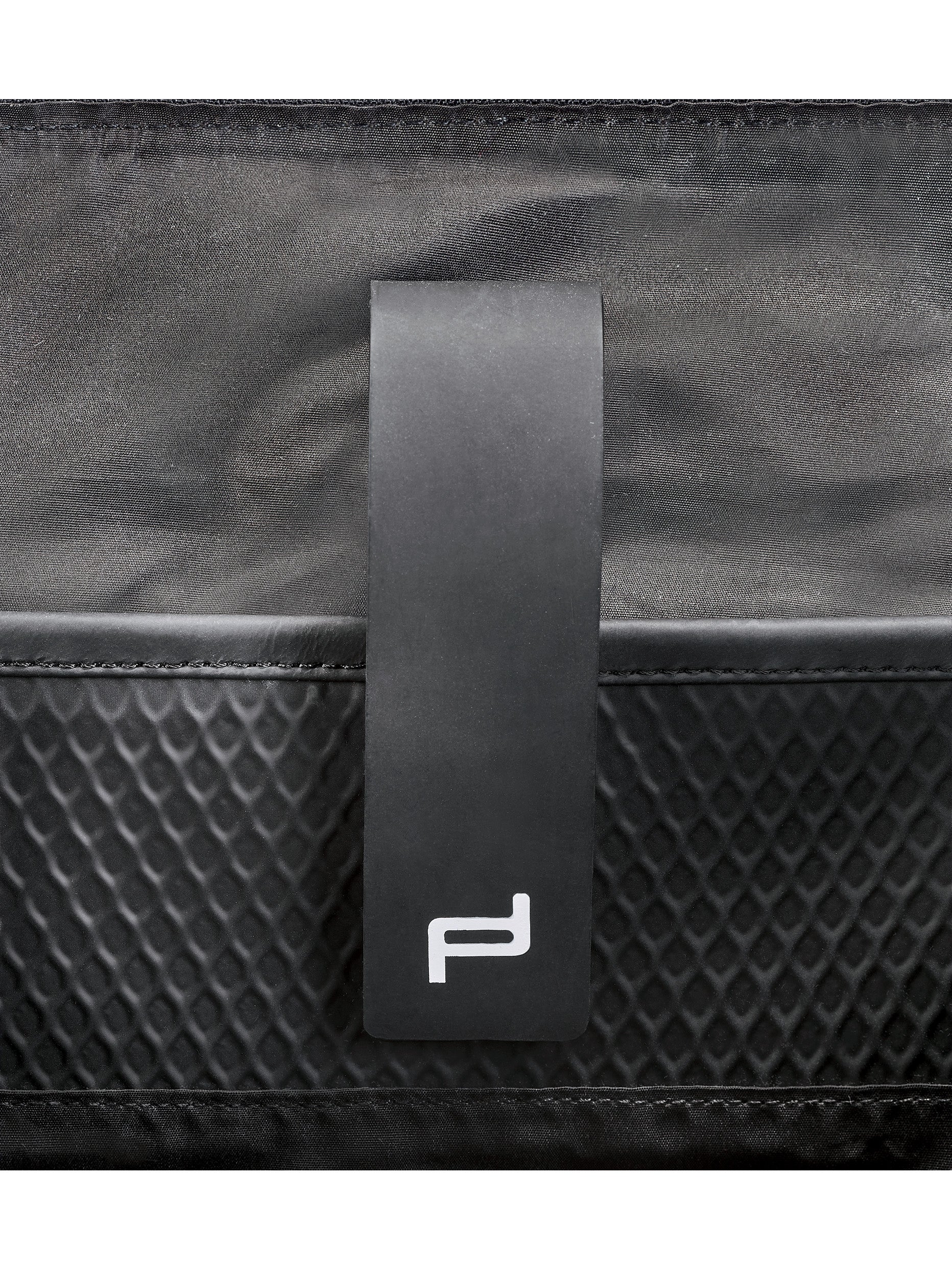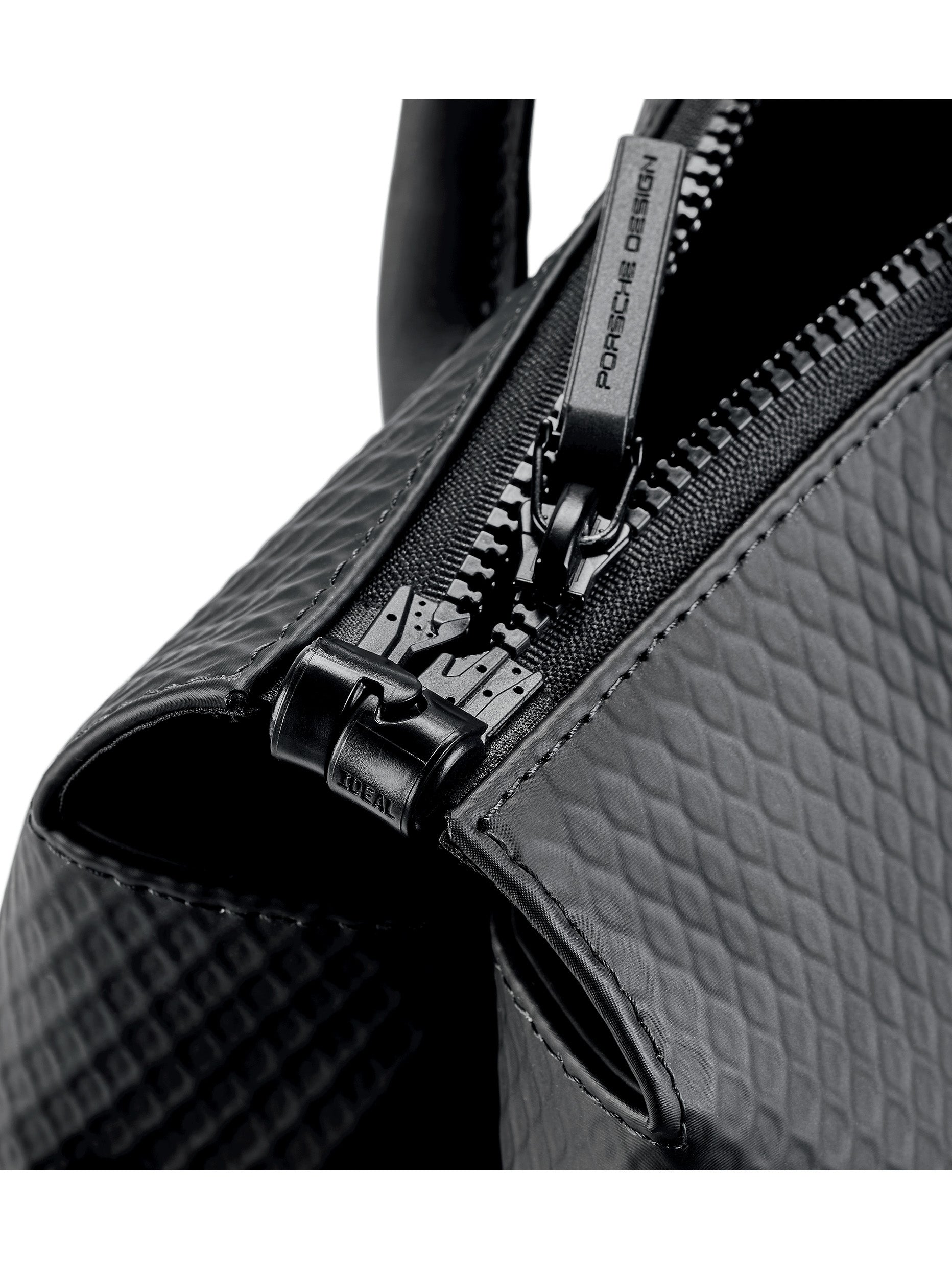 The tote bag is closed using a particularly smooth-running, eye-catching Porsche Design zip. The front is adorned with the Porsche Design emblem. The adjustable shoulder strap and two handles mean that the bag can also