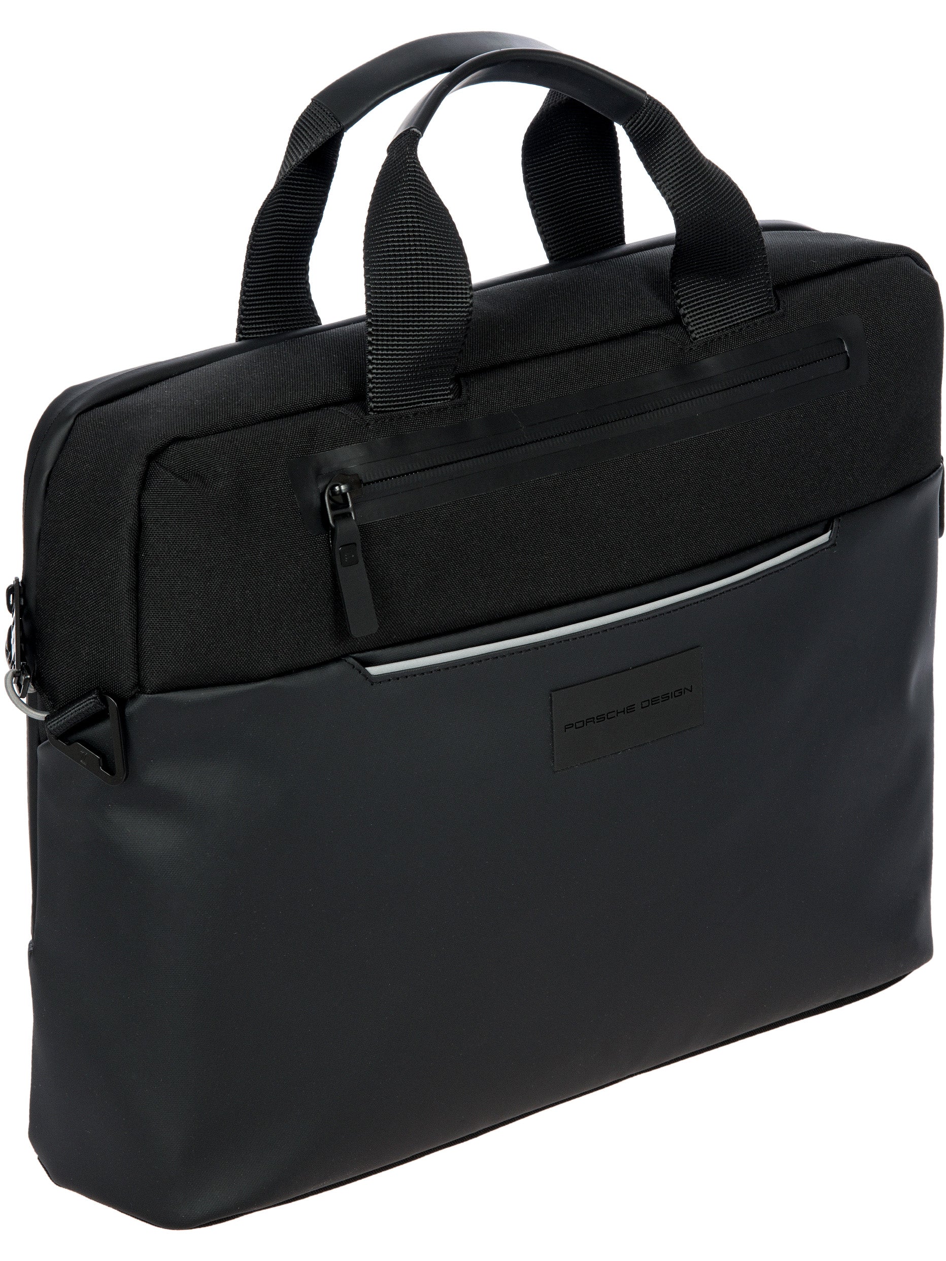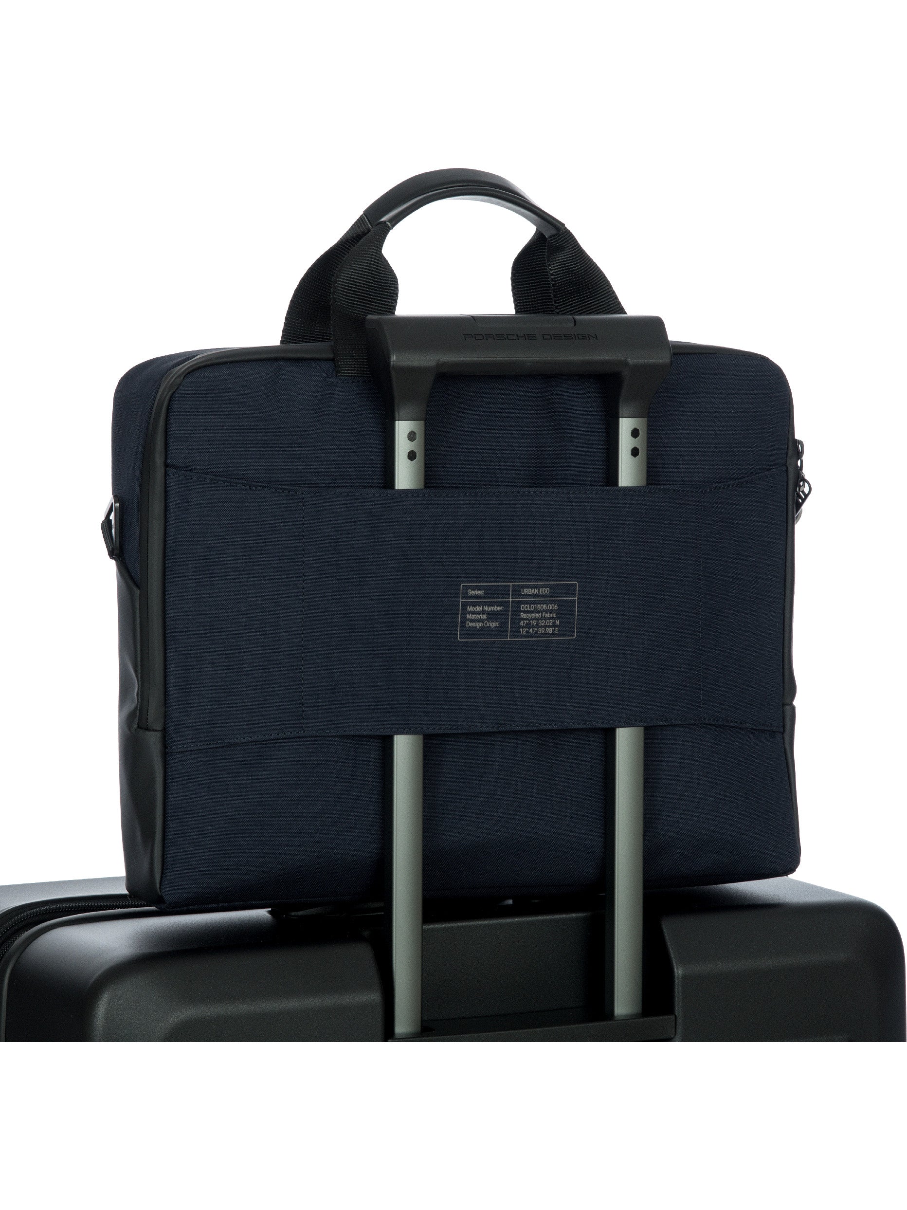 The Porsche Design Urban Eco series doesn't stay in the drawer - it’s perfect for modern everyday life: stylish and sustainable, functional and flexible. The Porsche Design Urban Eco Briefcase M is attractive at first sight with its extraordinary design: The material combination of water-repellent polyester and coated abrasion-resistant fabric looks exciting and sporty, while laminated zippers, a reflective piped welt pocket and black metal hardware maximize the clean look. Not immediately visible, but unmistakably exclusive: details like the PD icon lining with hexagon pattern and the Porsche model badge-inspired back print with the Zell am See map coordinates, the home of Studio F. A. Porsche. The features are in no way inferior to the smart design. The 2-way zippered main compartment includes a padded notebook compartment for sizes up to 13" and a slip pocket for tablets, plus an additional zippered pocket and business organizer. Another zippered pocket in the front, a trolley link in the back and the adjustable shoulder strap with shoulder pad make the bag the perfect companion for business and leisure.