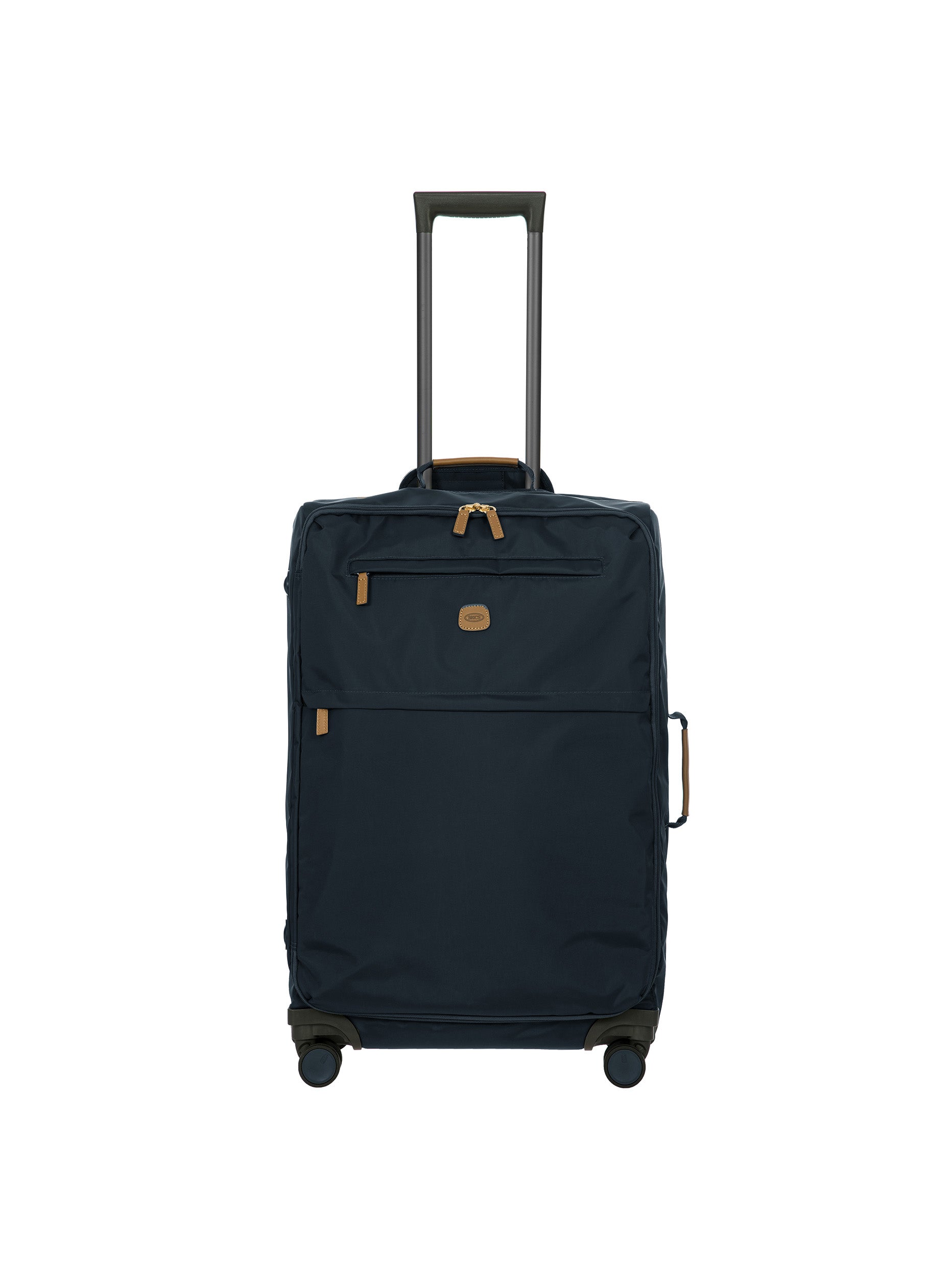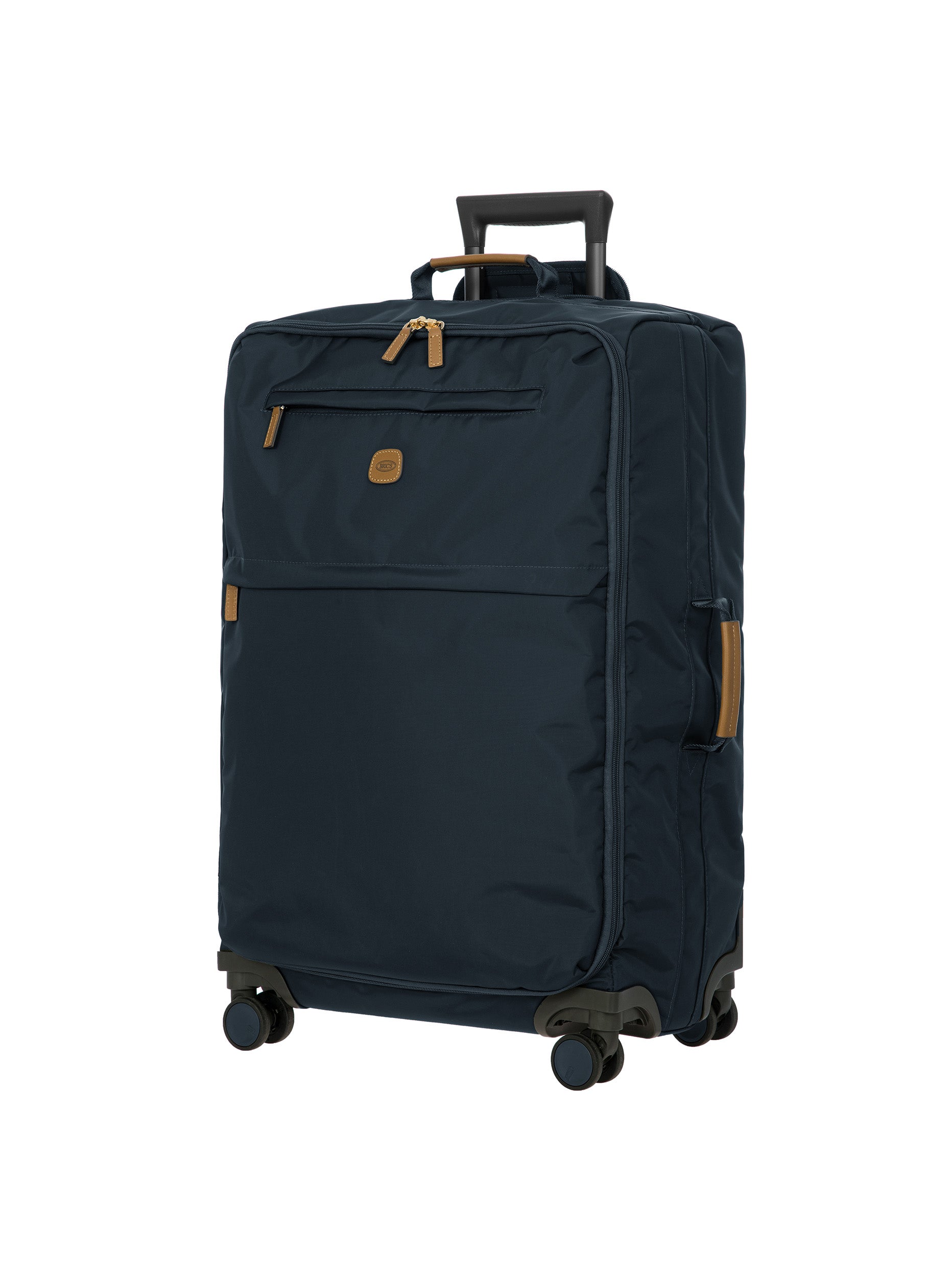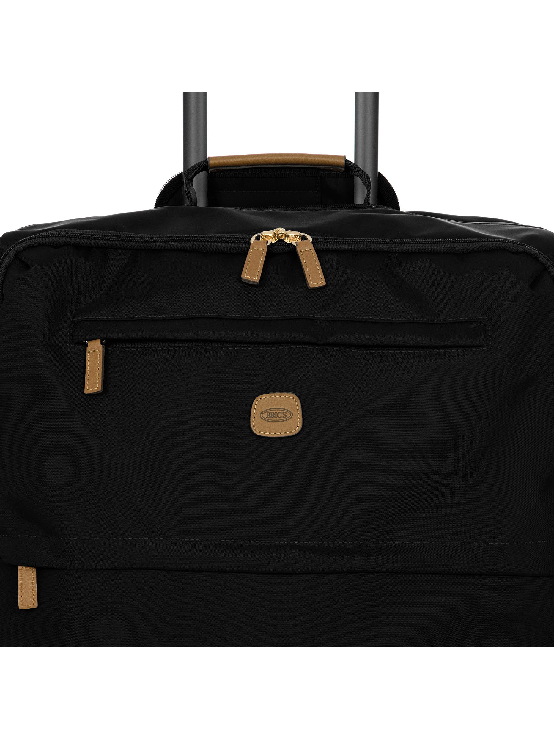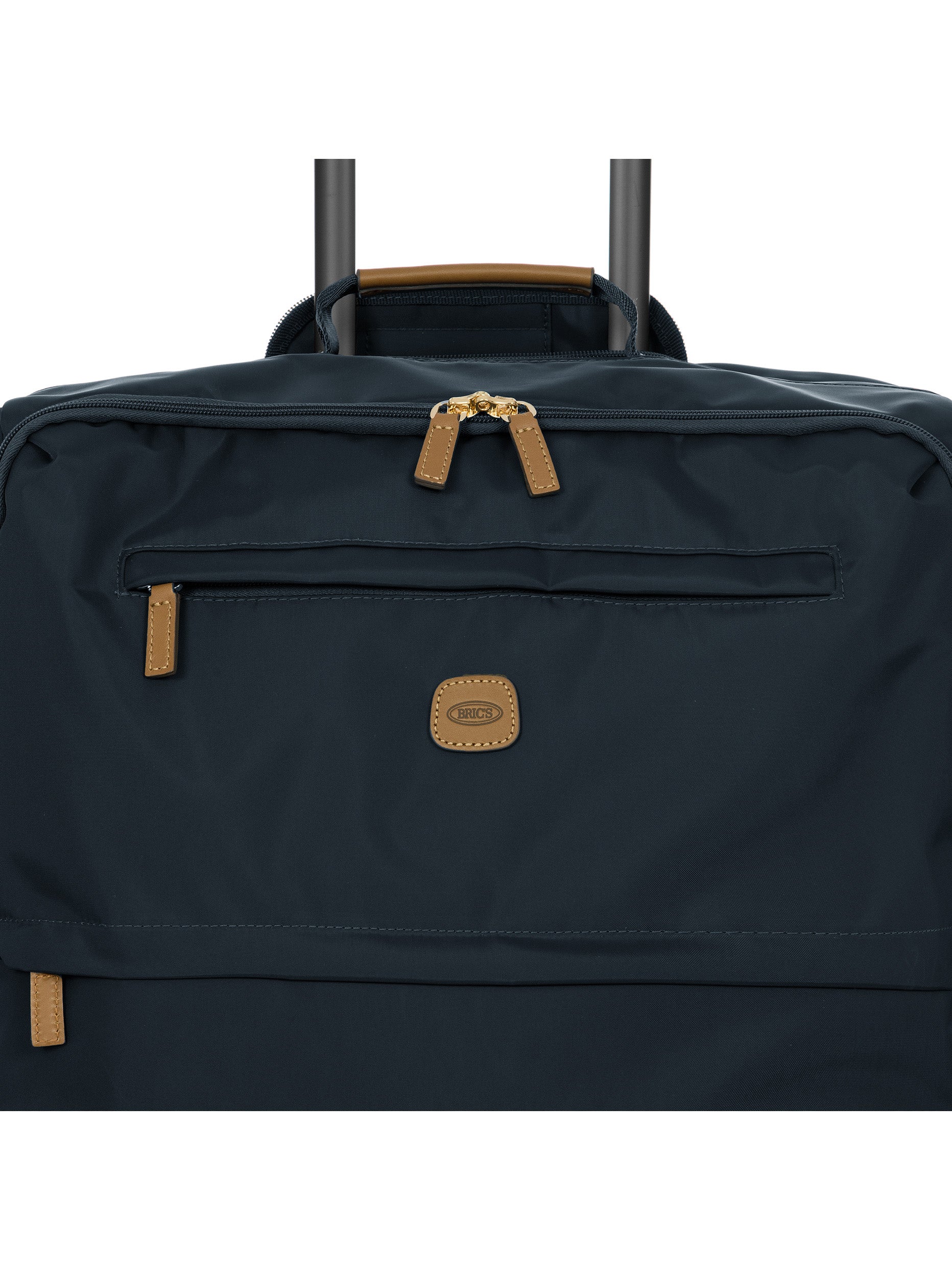 Part of the X-Collection, this mid-size (71 cm) trolley suitcase is made of durable recycled fabric, with a rigid, lightweight structure. The main compartment is opened by a double-slide zip. Two front zip pockets, inner pockets and compression straps ensure optimised organisation. The silent 360° spinner wheels guarantee smooth motion in every direction, and are recessed to maximise the packing capacity of the suitcase. The padded carry handles, the robust, sturdy aluminium tubes and the ergonomic retractable handle ensure comfort. It comes with an integrated ID tag carrier and rings for closure with a luggage lock (sold separately). Bric’s distinguished real leather trim and logo details enrich the suitcase.