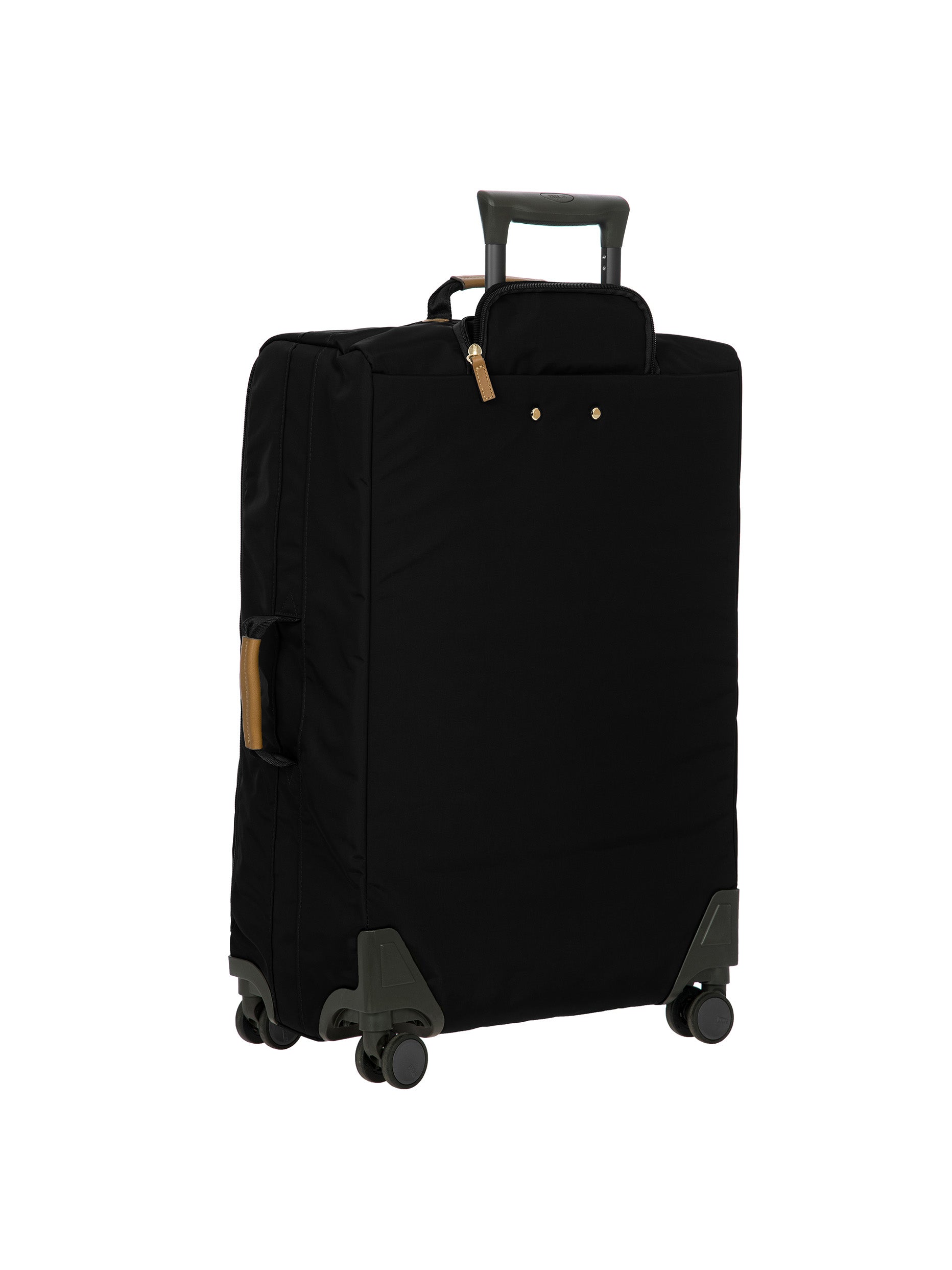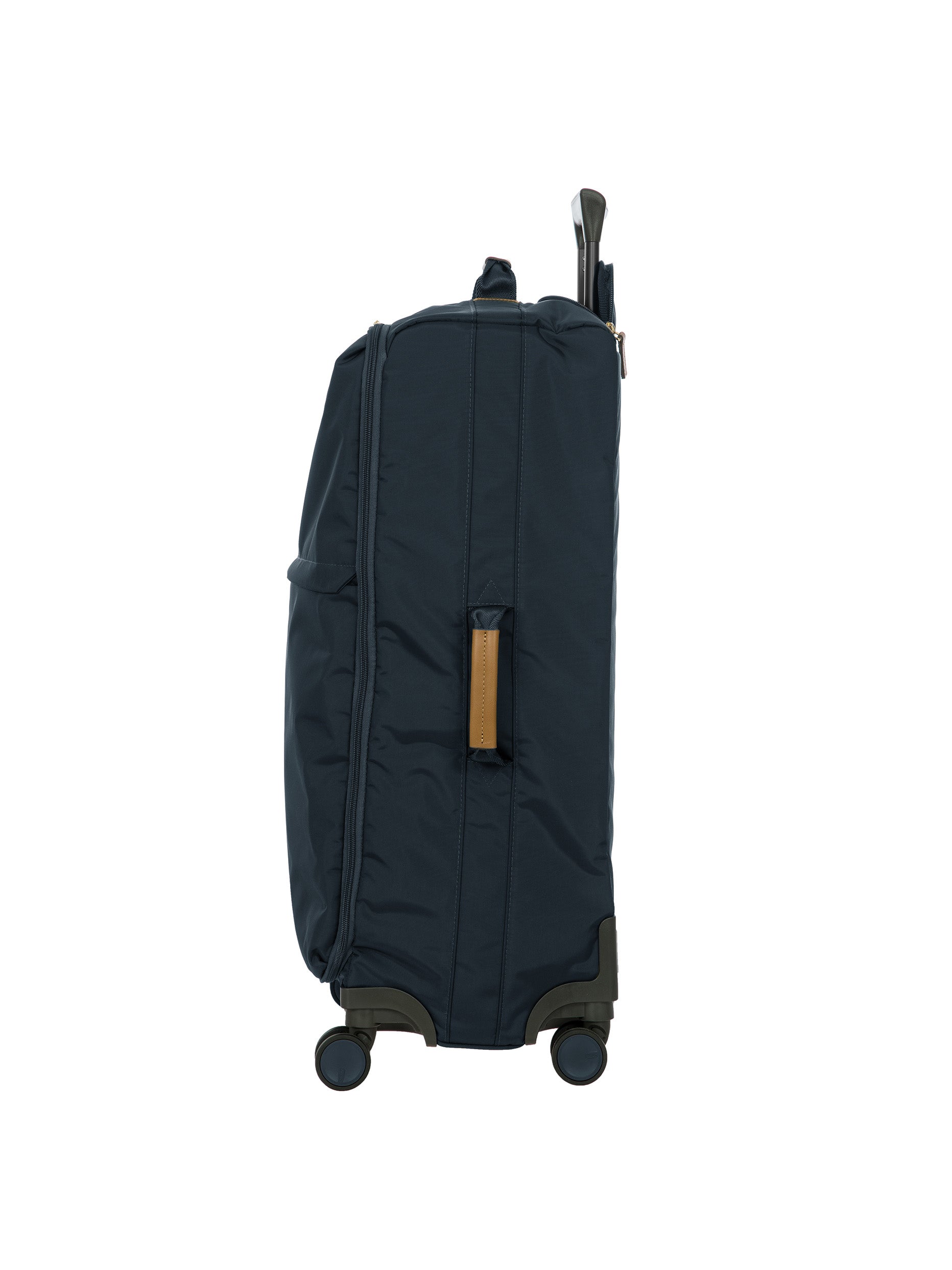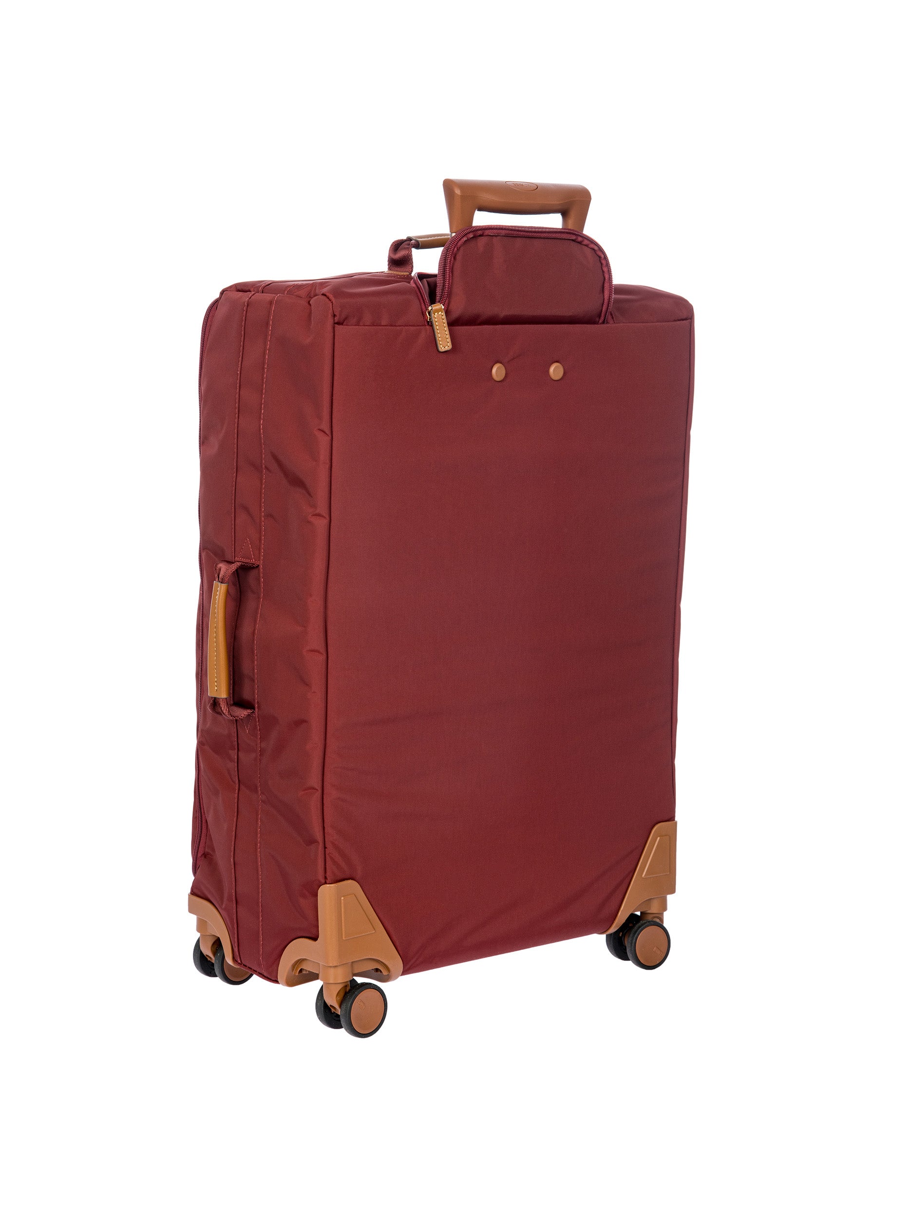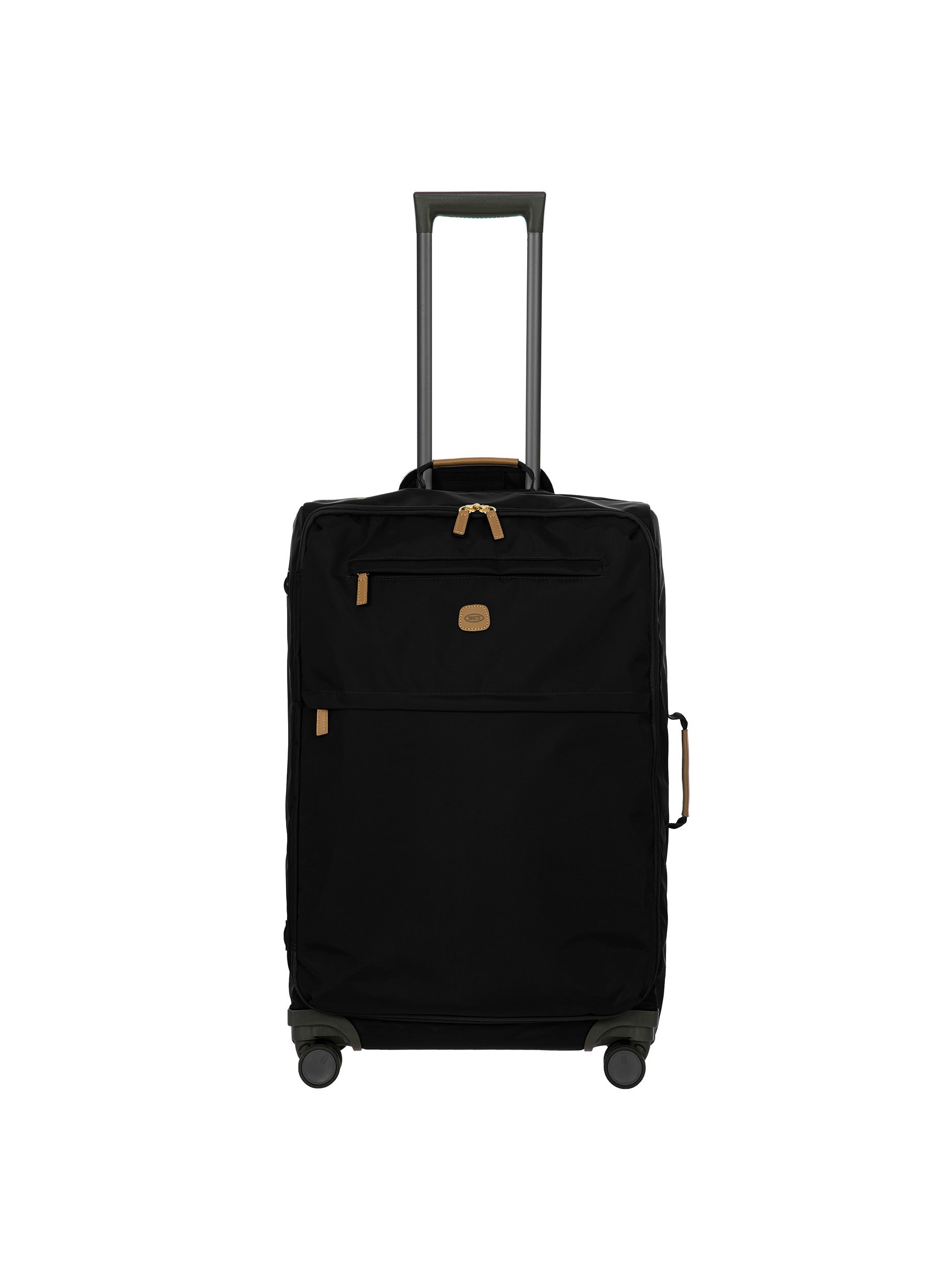 Part of the X-Collection, this mid-size (71 cm) trolley suitcase is made of durable recycled fabric, with a rigid, lightweight structure. The main compartment is opened by a double-slide zip. Two front zip pockets, inner pockets and compression straps ensure optimised organisation. The silent 360° spinner wheels guarantee smooth motion in every direction, and are recessed to maximise the packing capacity of the suitcase. The padded carry handles, the robust, sturdy aluminium tubes and the ergonomic retractable handle ensure comfort. It comes with an integrated ID tag carrier and rings for closure with a luggage lock (sold separately). Bric’s distinguished real leather trim and logo details enrich the suitcase.