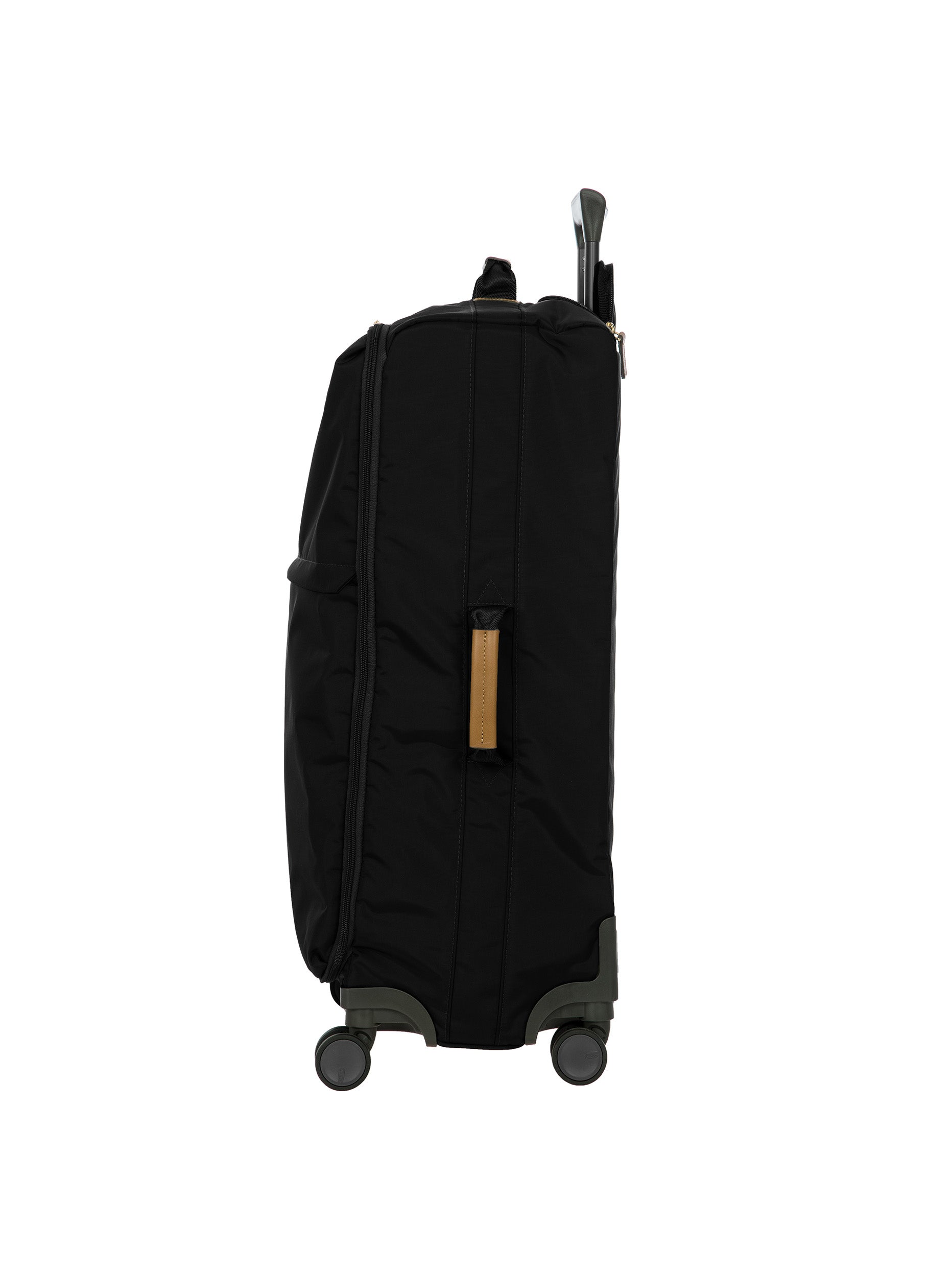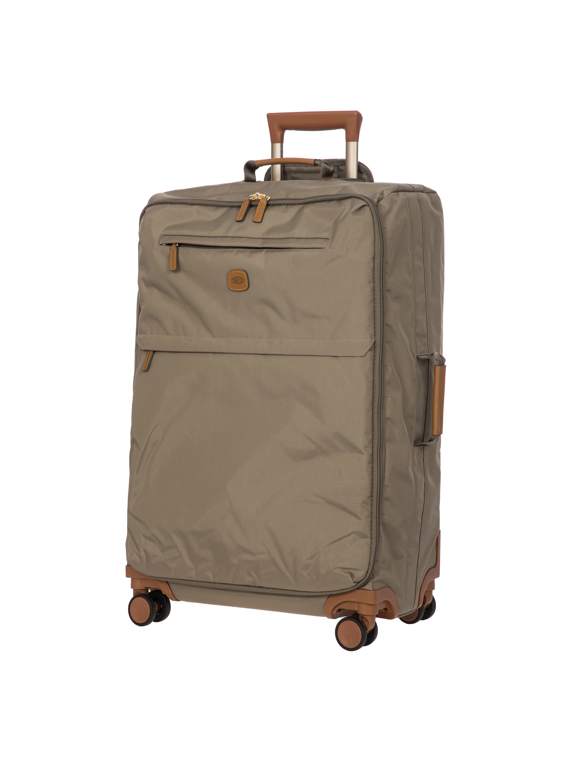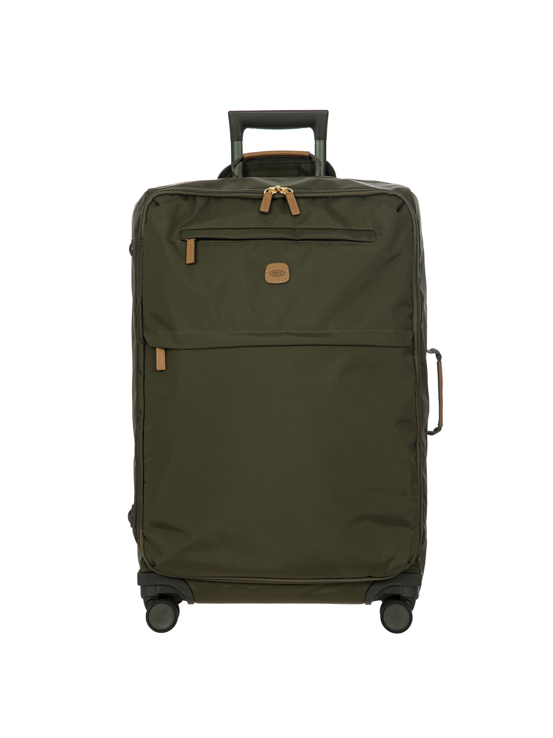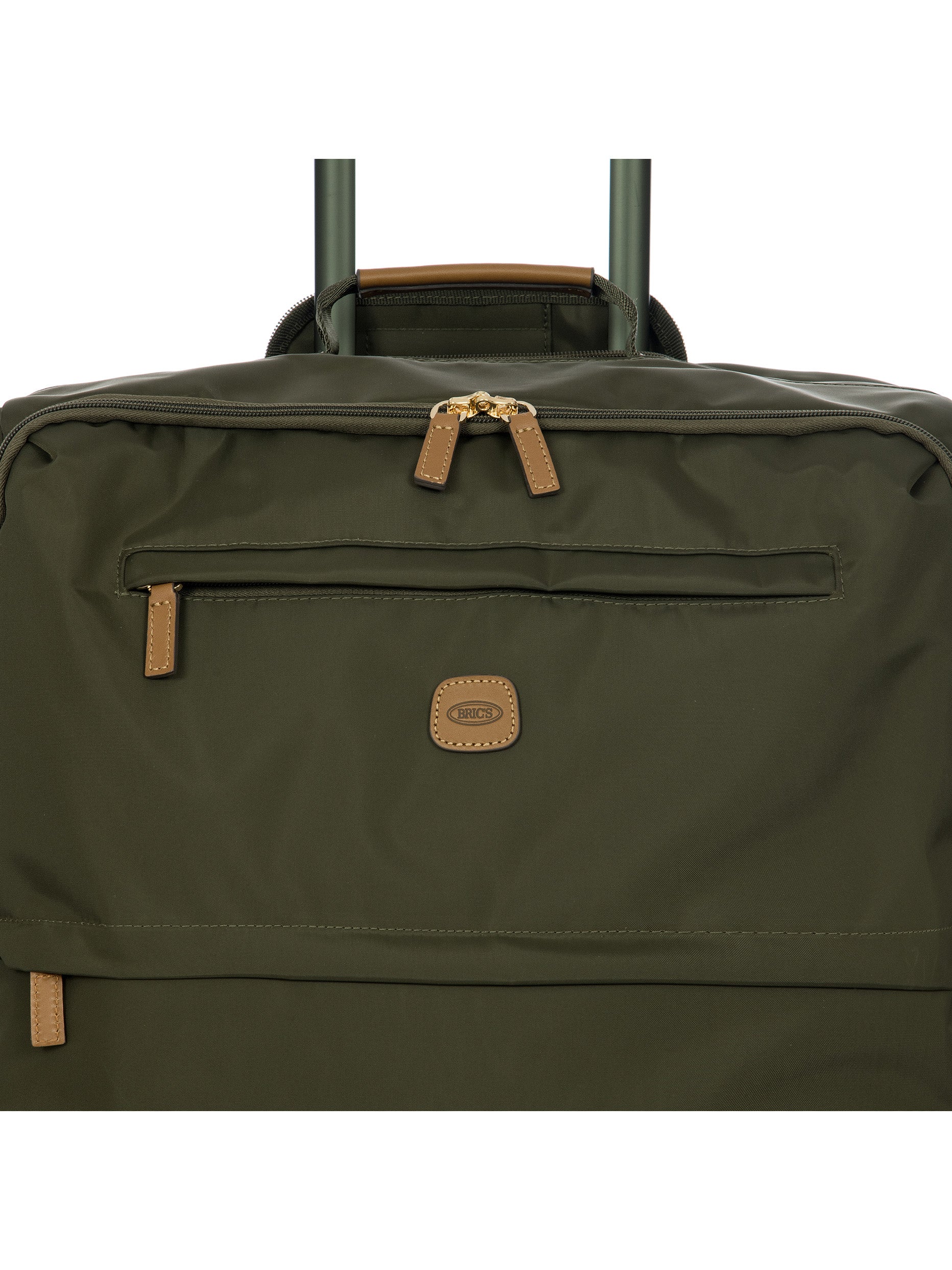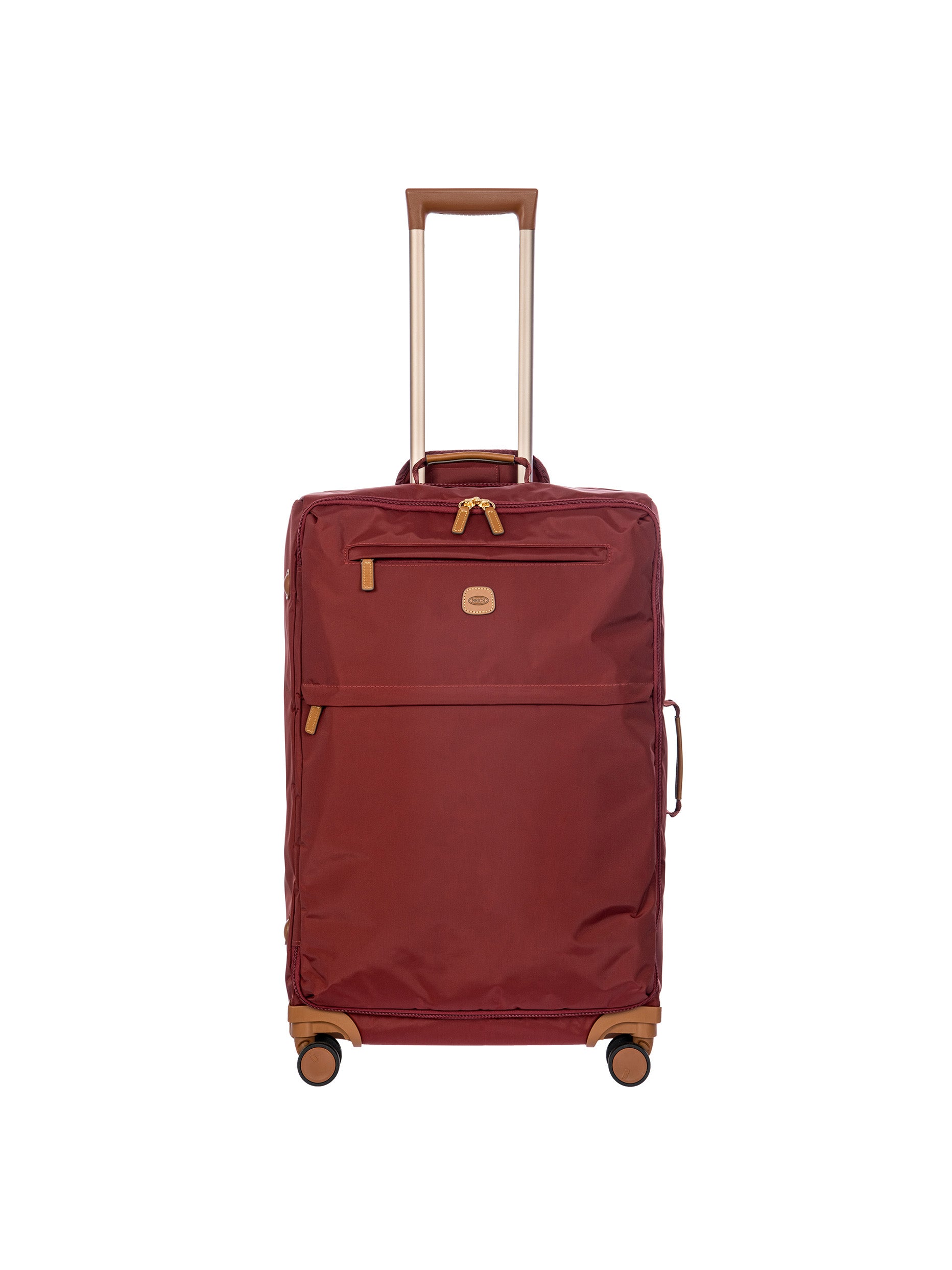 Part of the X-Collection, this mid-size (71 cm) trolley suitcase is made of durable recycled fabric, with a rigid, lightweight structure. The main compartment is opened by a double-slide zip. Two front zip pockets, inner pockets and compression straps ensure optimised organisation. The silent 360° spinner wheels guarantee smooth motion in every direction, and are recessed to maximise the packing capacity of the suitcase. The padded carry handles, the robust, sturdy aluminium tubes and the ergonomic retractable handle ensure comfort. It comes with an integrated ID tag carrier and rings for closure with a luggage lock (sold separately). Bric’s distinguished real leather trim and logo details enrich the suitcase.