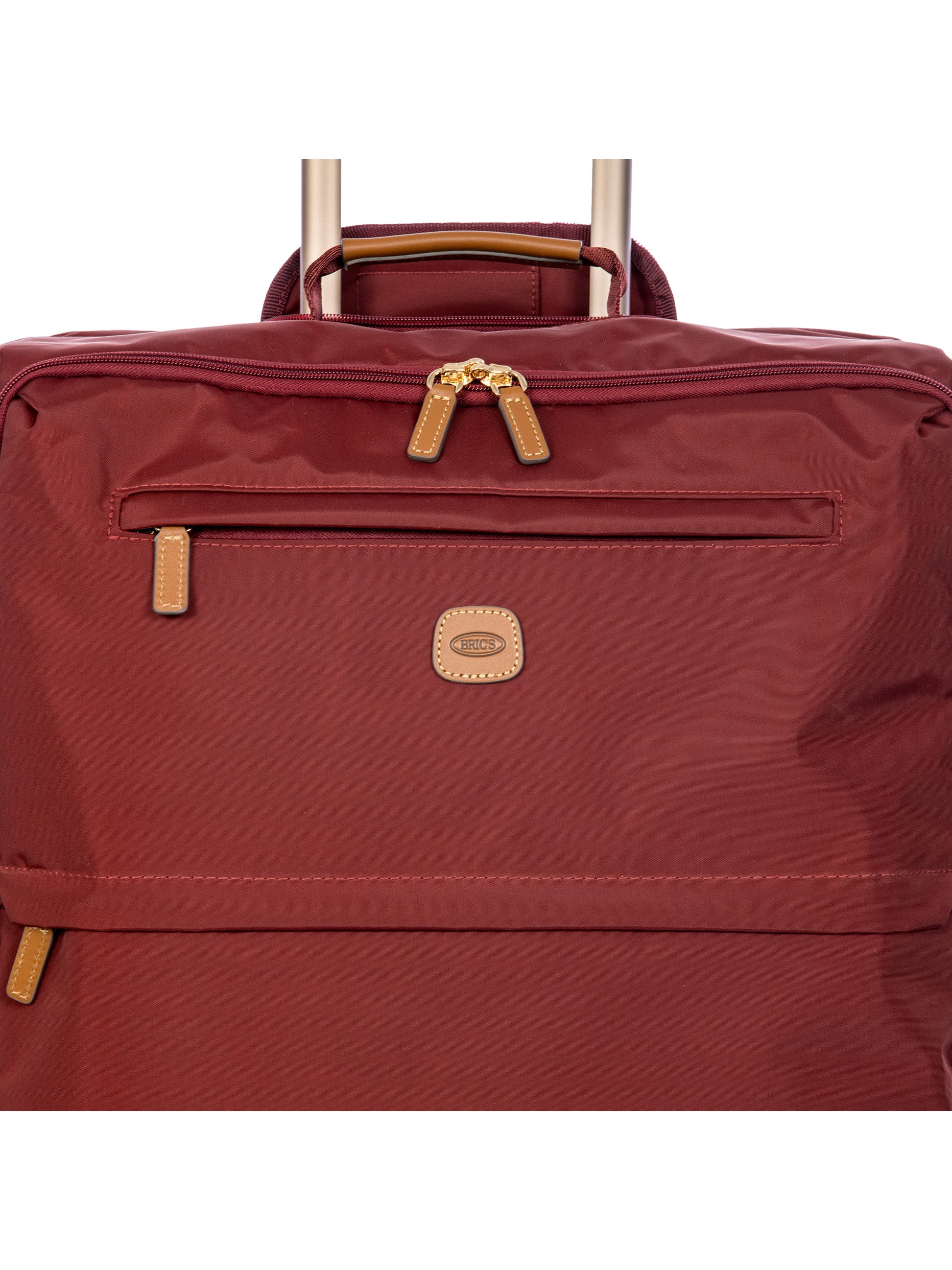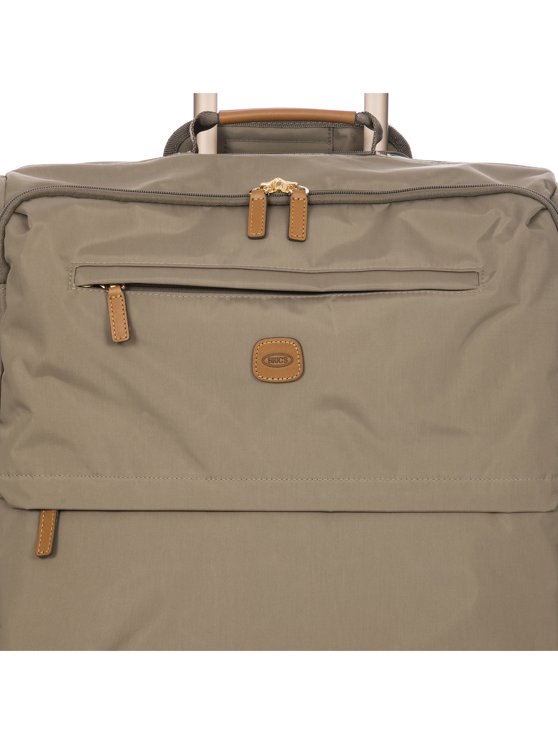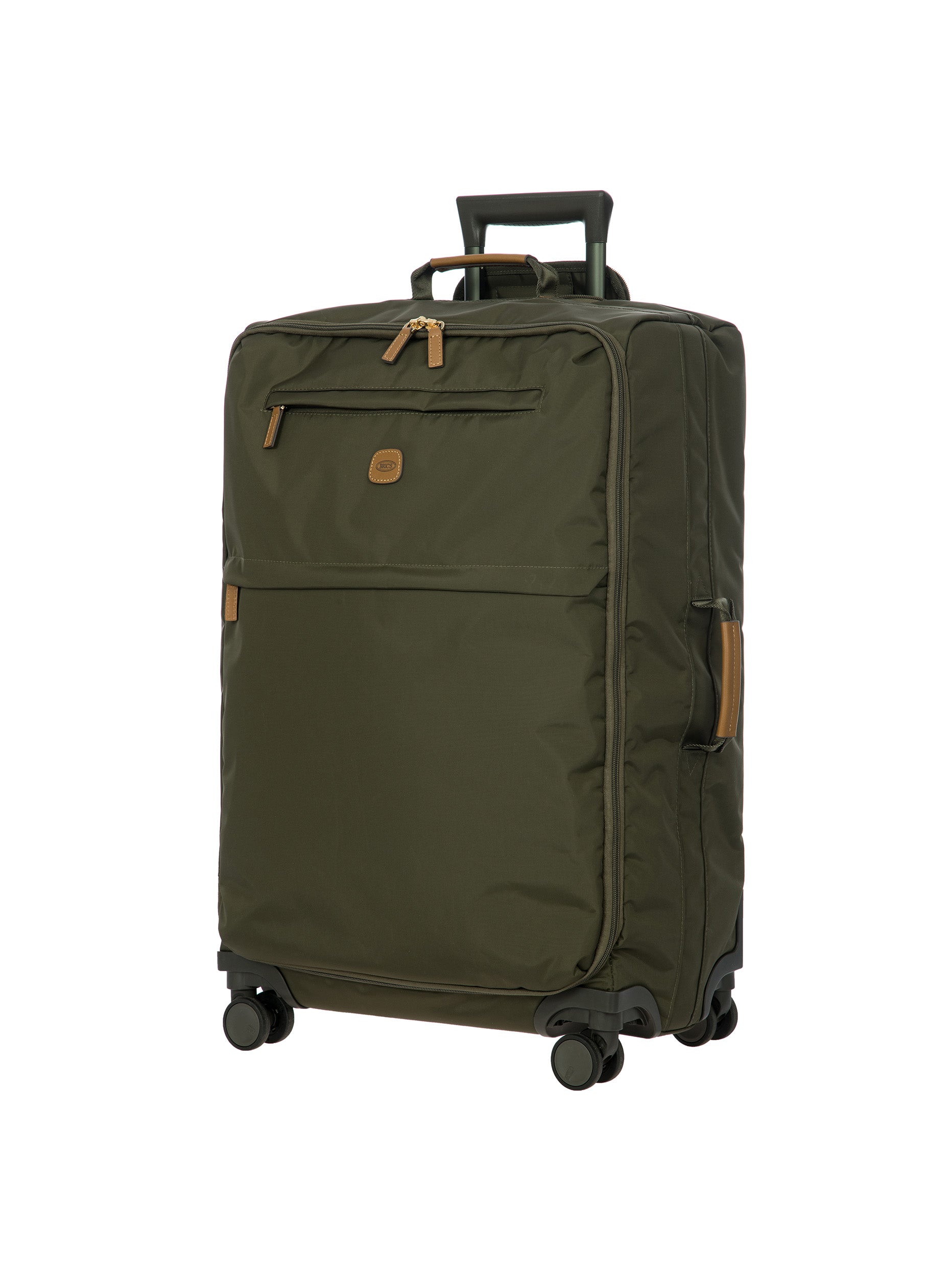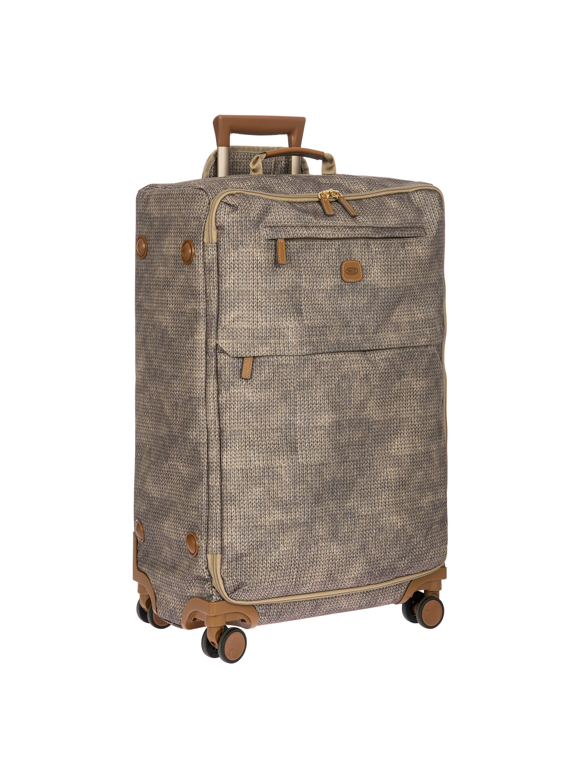 Part of the X-Collection, this mid-size (71 cm) trolley suitcase is made of durable recycled fabric, with a rigid, lightweight structure. The main compartment is opened by a double-slide zip. Two front zip pockets, inner pockets and compression straps ensure optimised organisation. The silent 360° spinner wheels guarantee smooth motion in every direction, and are recessed to maximise the packing capacity of the suitcase. The padded carry handles, the robust, sturdy aluminium tubes and the ergonomic retractable handle ensure comfort. It comes with an integrated ID tag carrier and rings for closure with a luggage lock (sold separately). Bric’s distinguished real leather trim and logo details enrich the suitcase.
