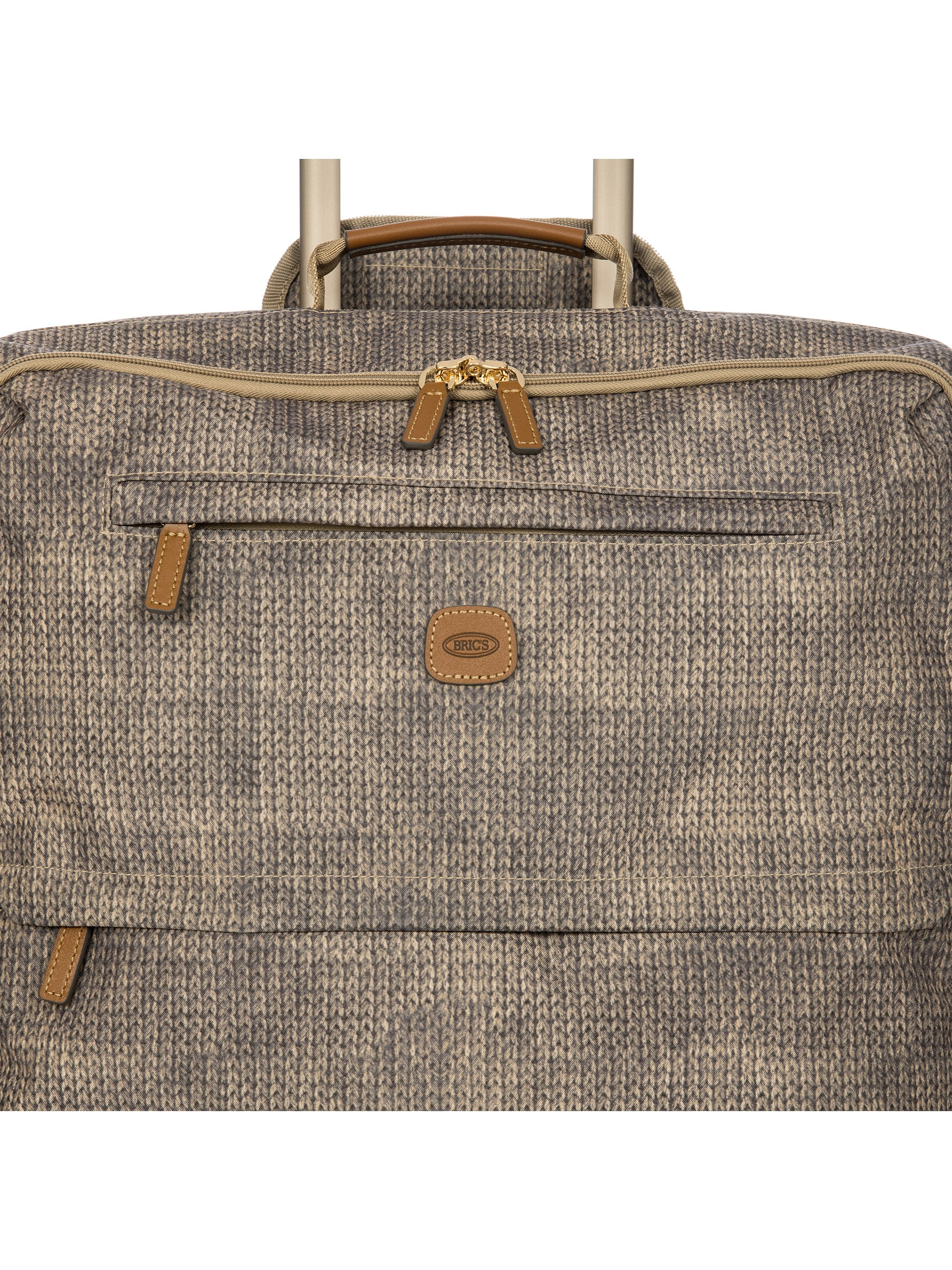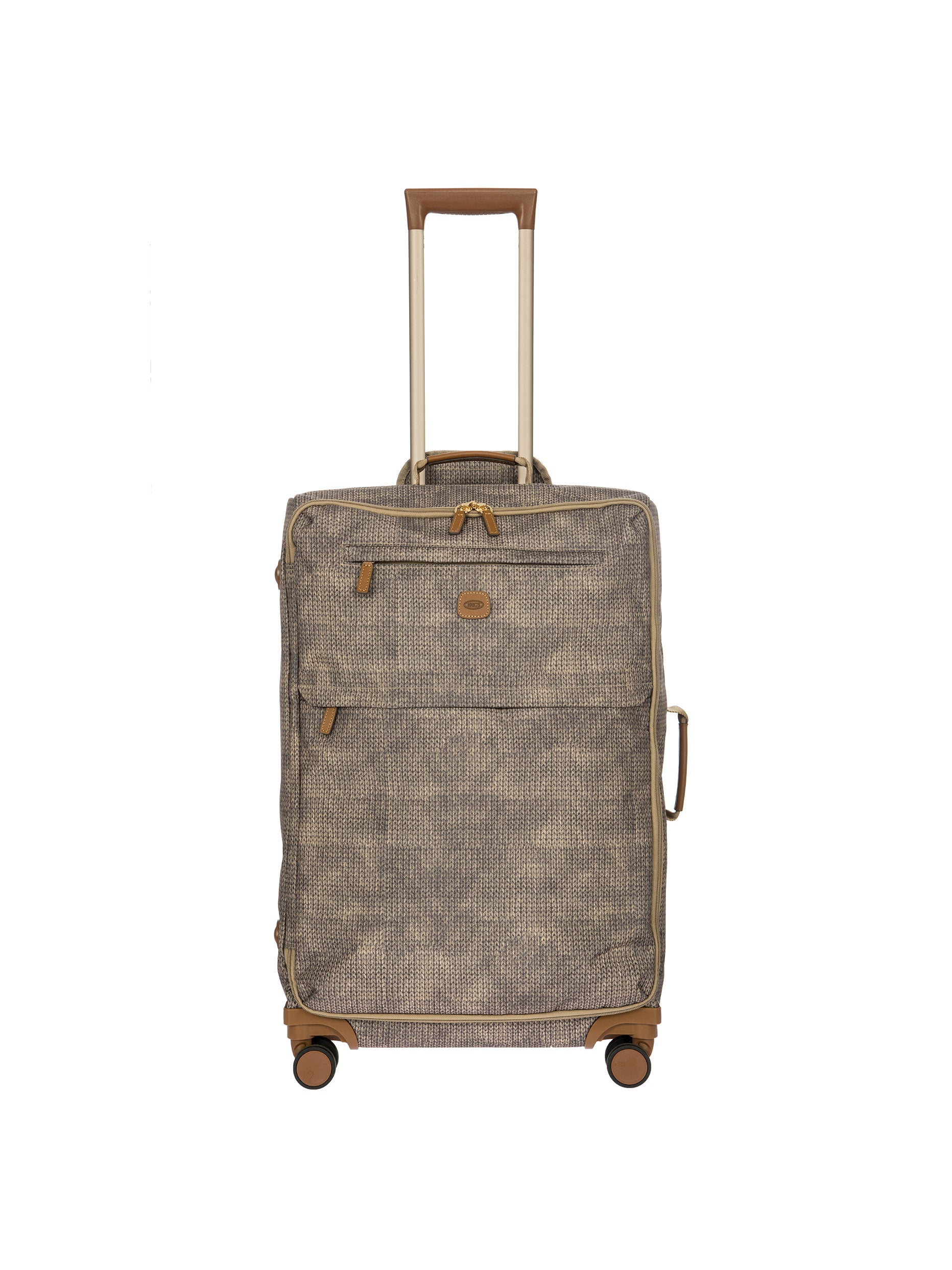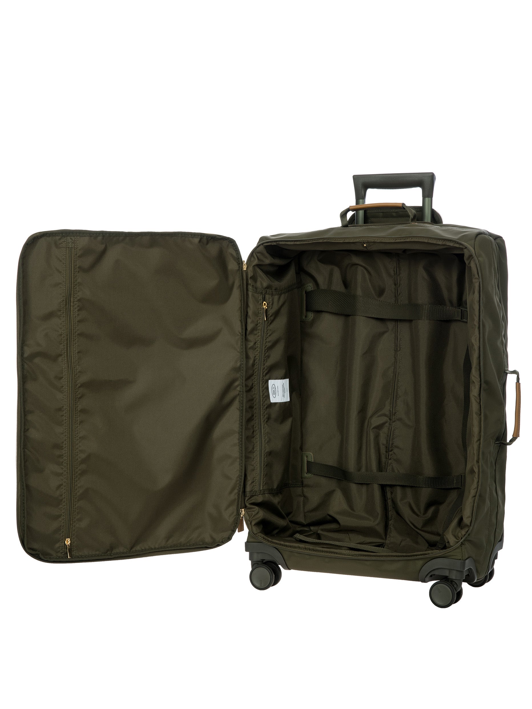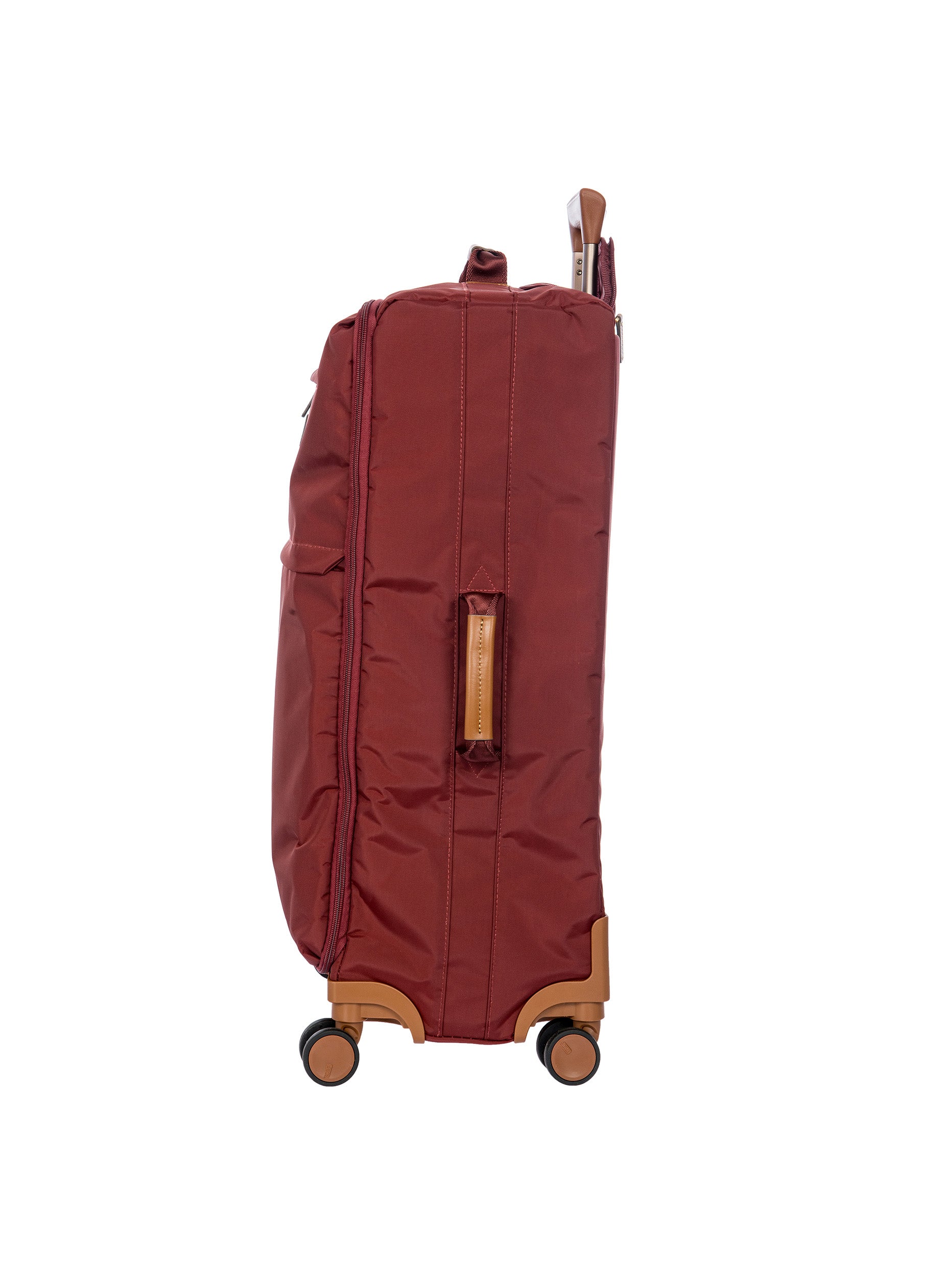 Part of the X-Collection, this mid-size (71 cm) trolley suitcase is made of durable recycled fabric, with a rigid, lightweight structure. The main compartment is opened by a double-slide zip. Two front zip pockets, inner pockets and compression straps ensure optimised organisation. The silent 360° spinner wheels guarantee smooth motion in every direction, and are recessed to maximise the packing capacity of the suitcase. The padded carry handles, the robust, sturdy aluminium tubes and the ergonomic retractable handle ensure comfort. It comes with an integrated ID tag carrier and rings for closure with a luggage lock (sold separately). Bric’s distinguished real leather trim and logo details enrich the suitcase.