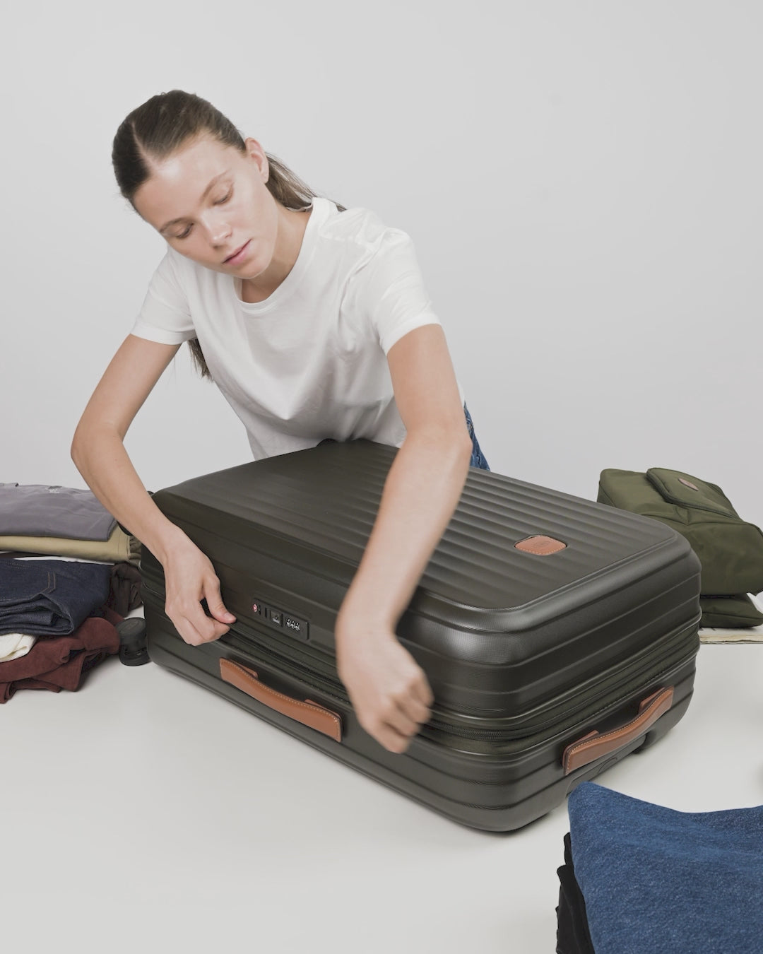 Carcasas de la maleta hechas de policarbonato. Forro de poliéster, Lavar a mano. Limpie el material de policarbonato con un detergente líquido no abrasivo para superficies duras. Los rasguños y el desvanecimiento causados por golpes se pueden eliminar calentando la zona con una fuente de calor. ADVERTENCIA: preste atención a no utiliz